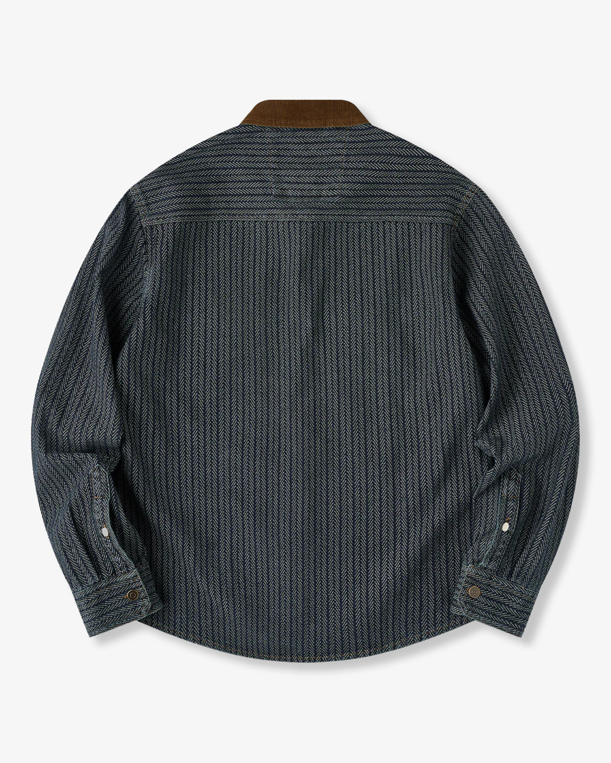It has no collar, giving it a casual look. The large pockets and color-coordinated buttons are also nice touches.