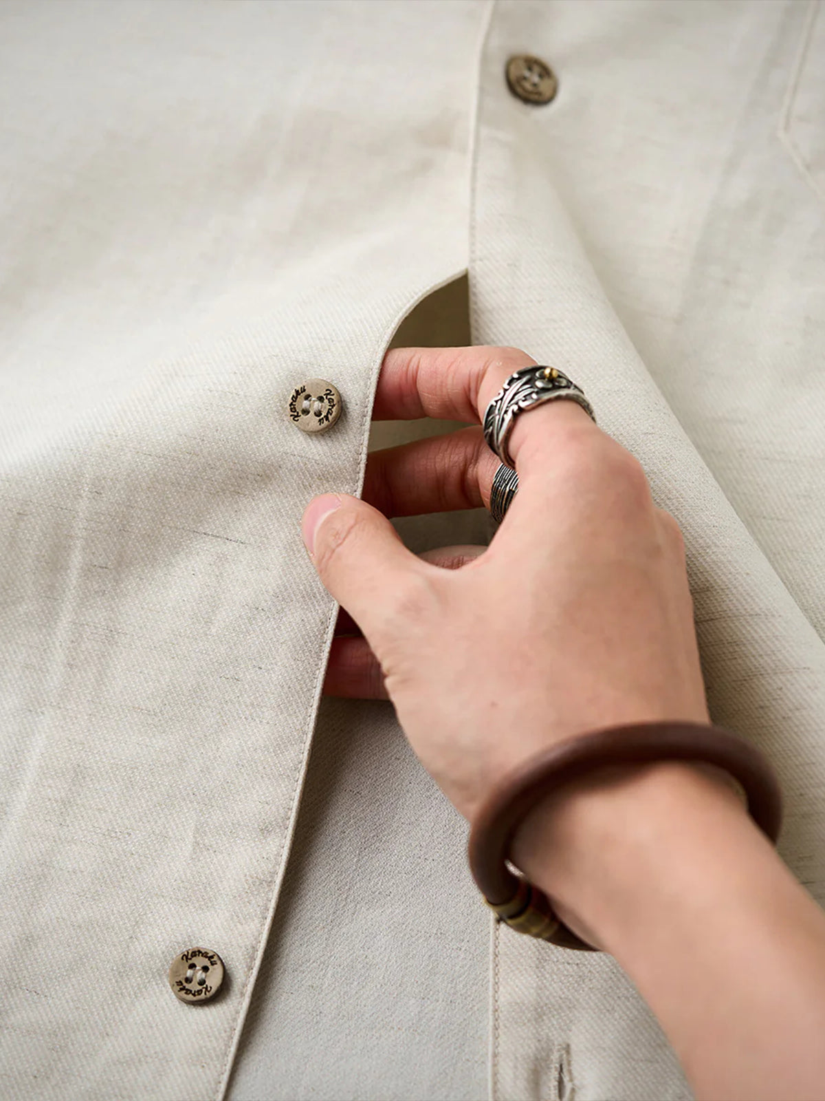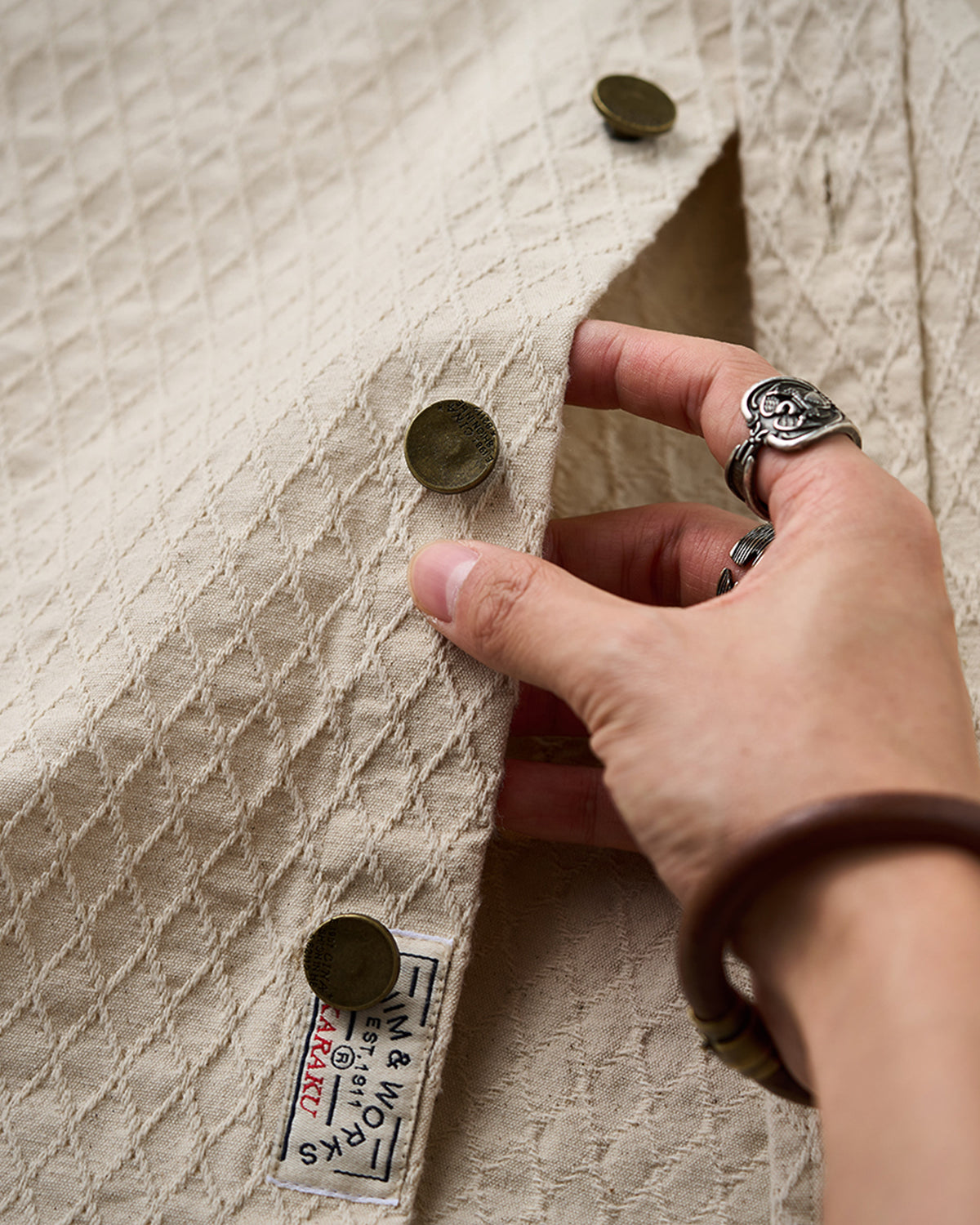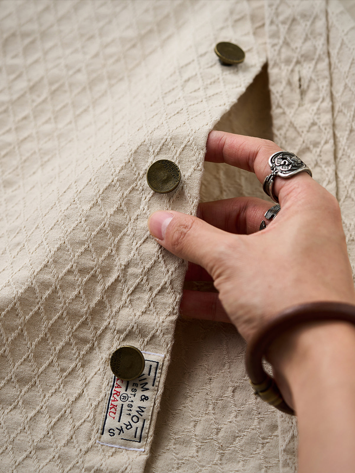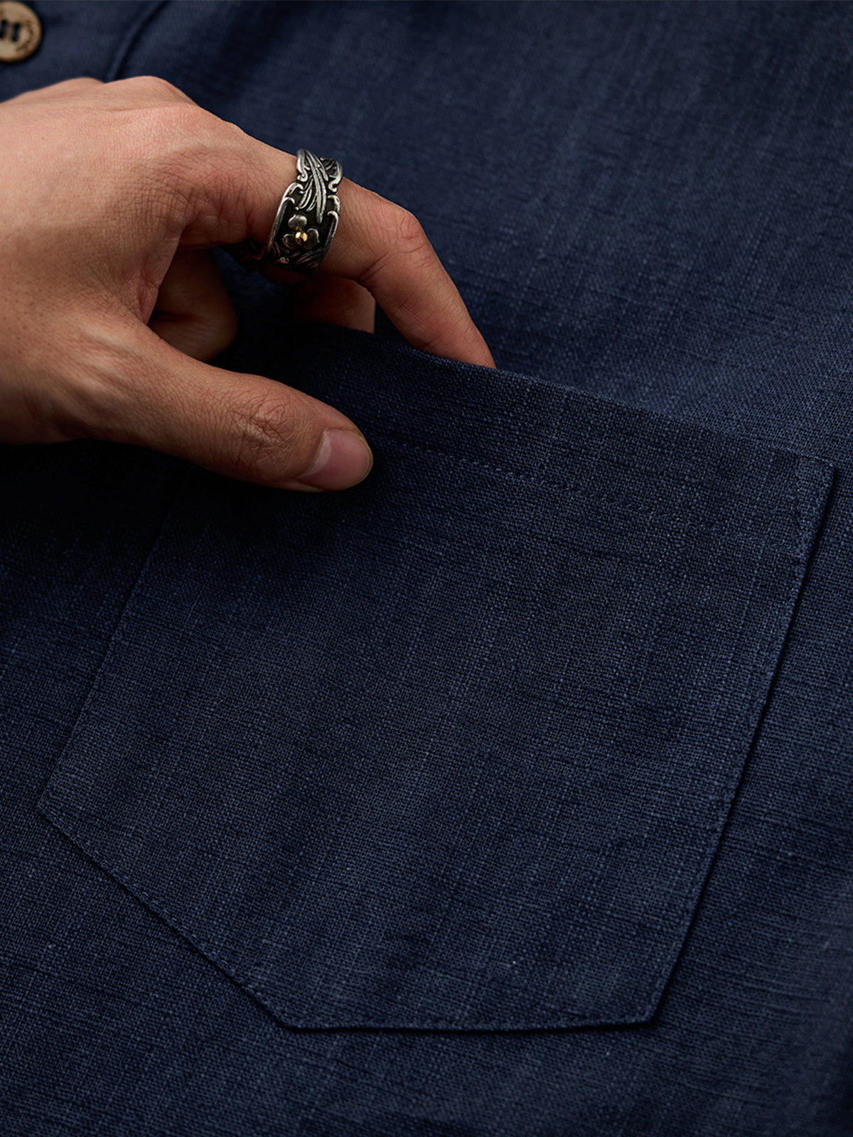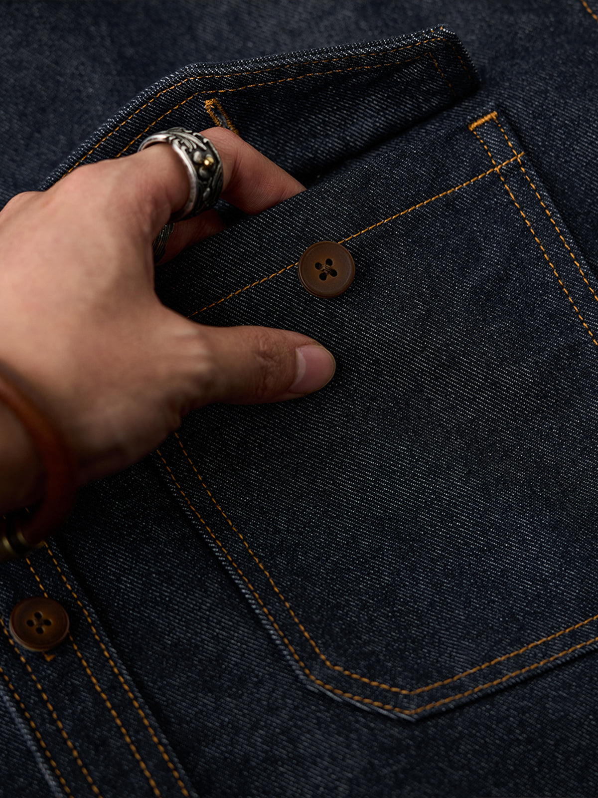 It has no collar, giving it a casual look. The large pockets and color-coordinated buttons are also nice touches.