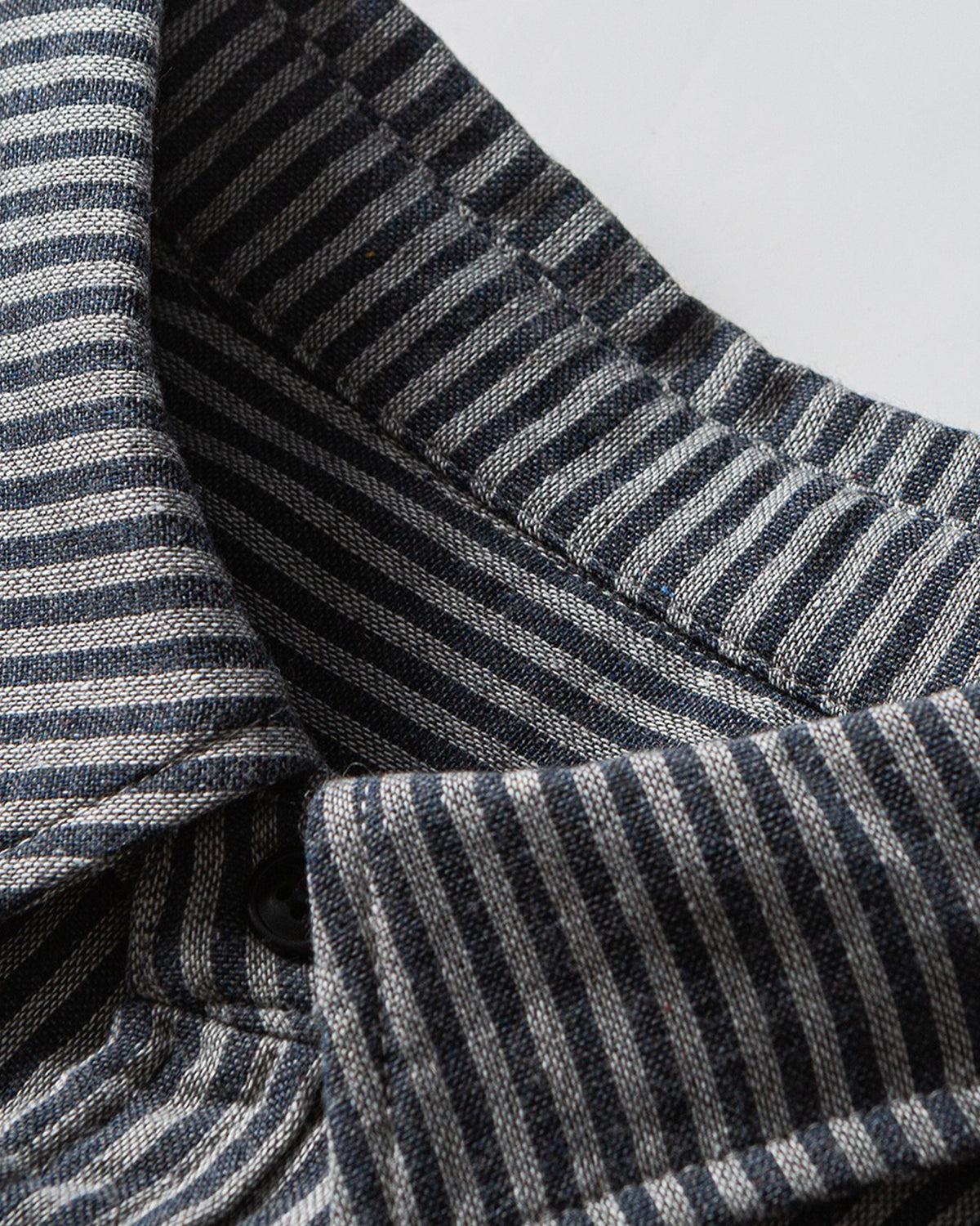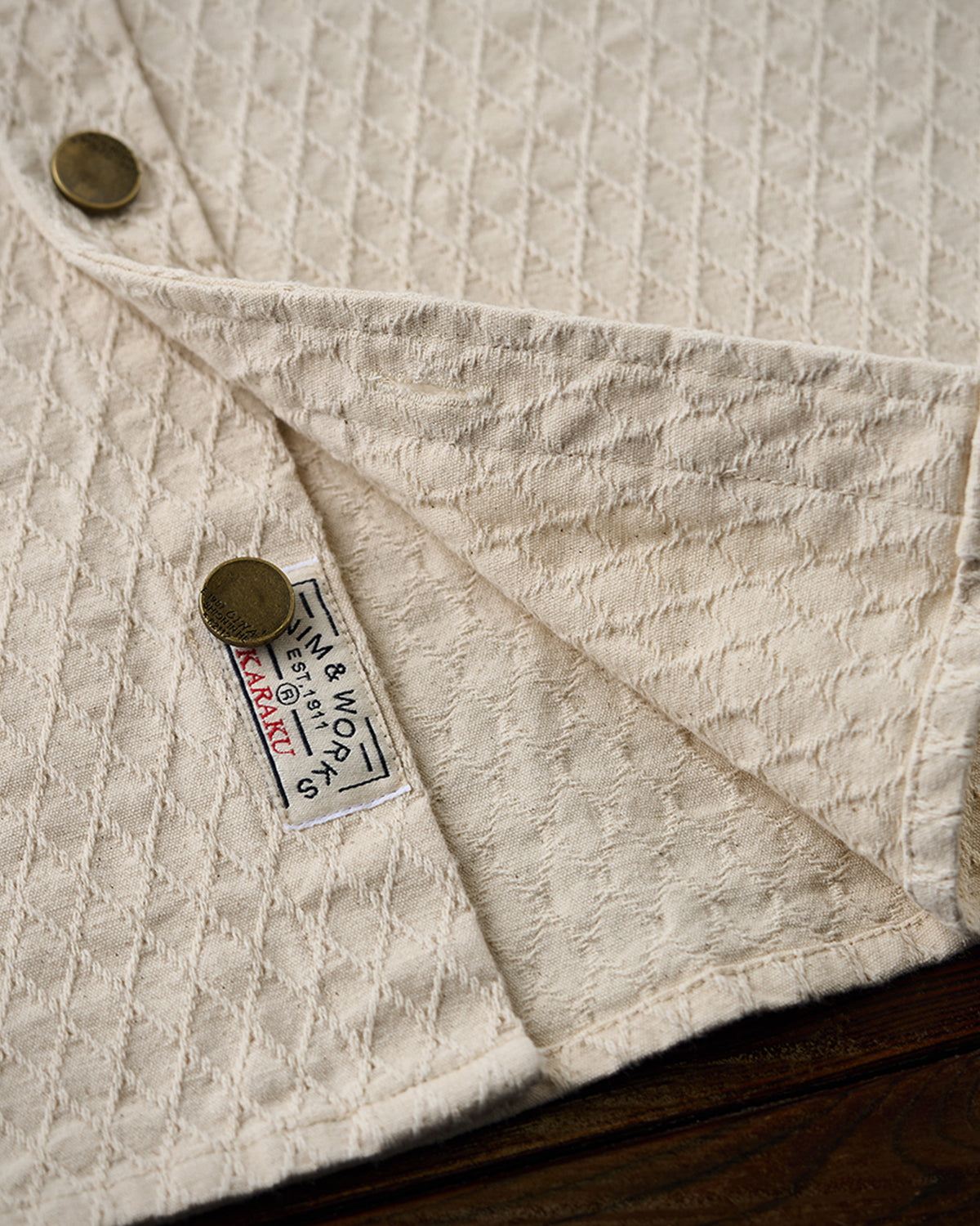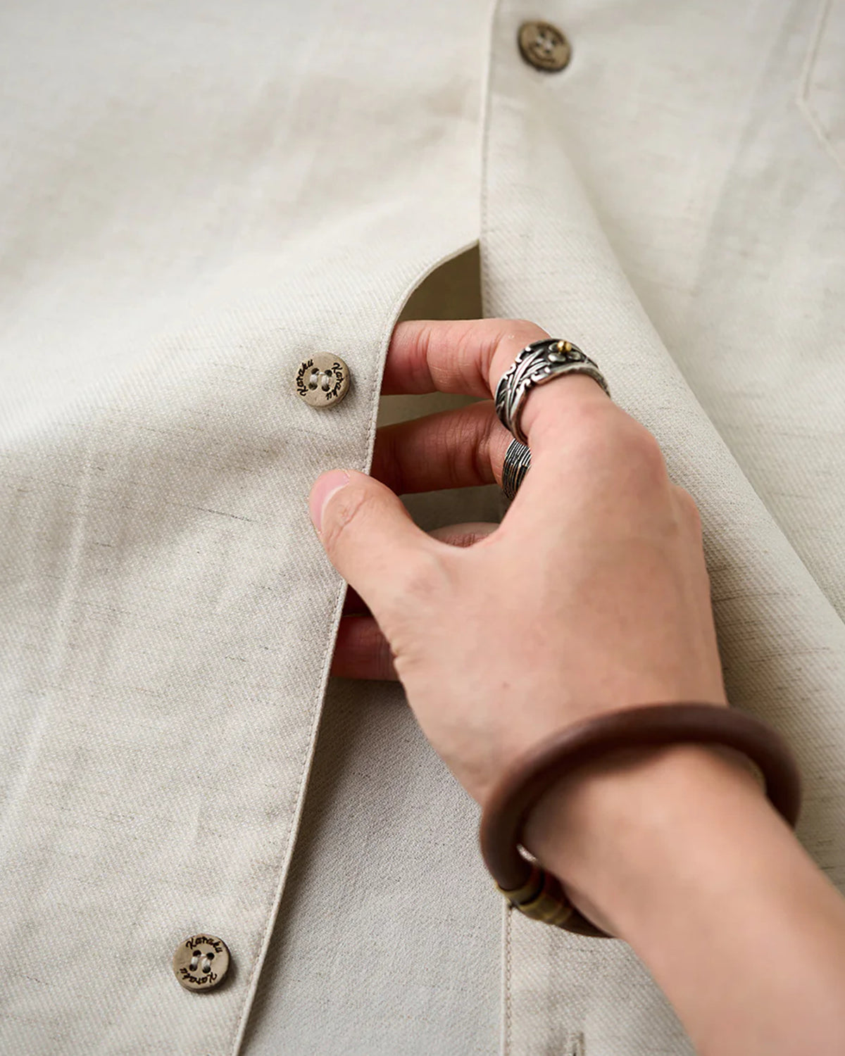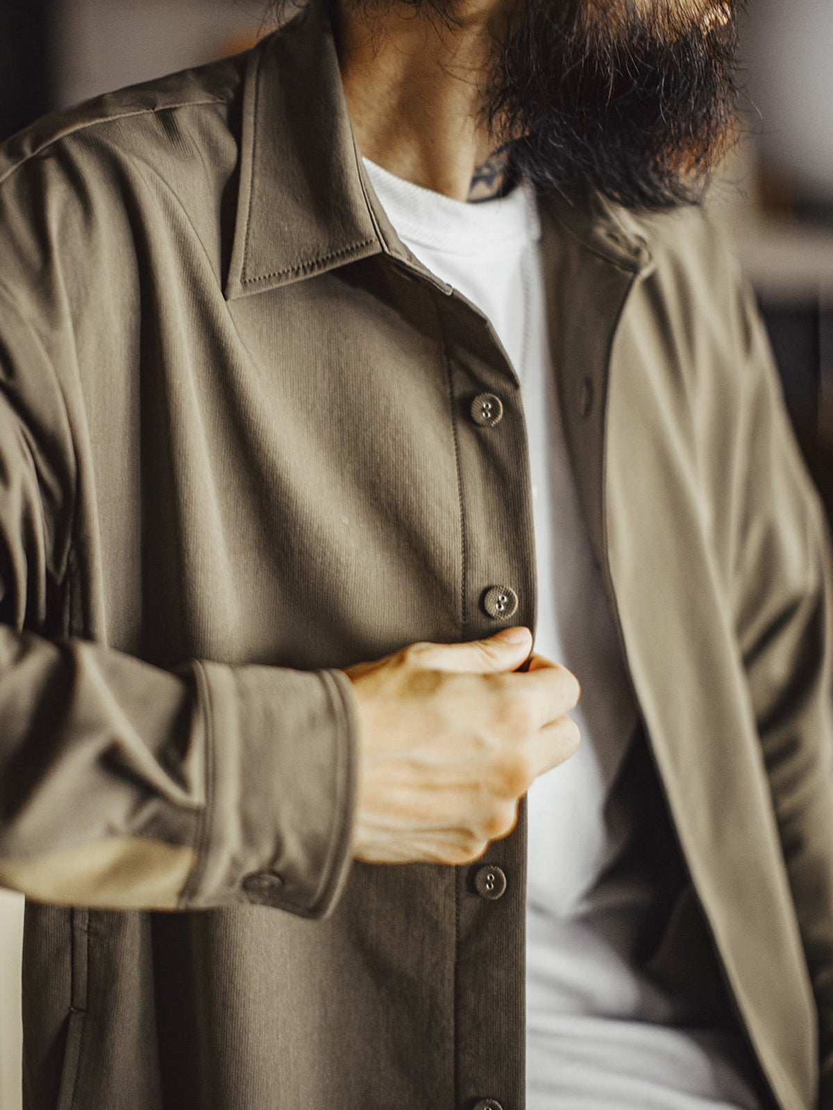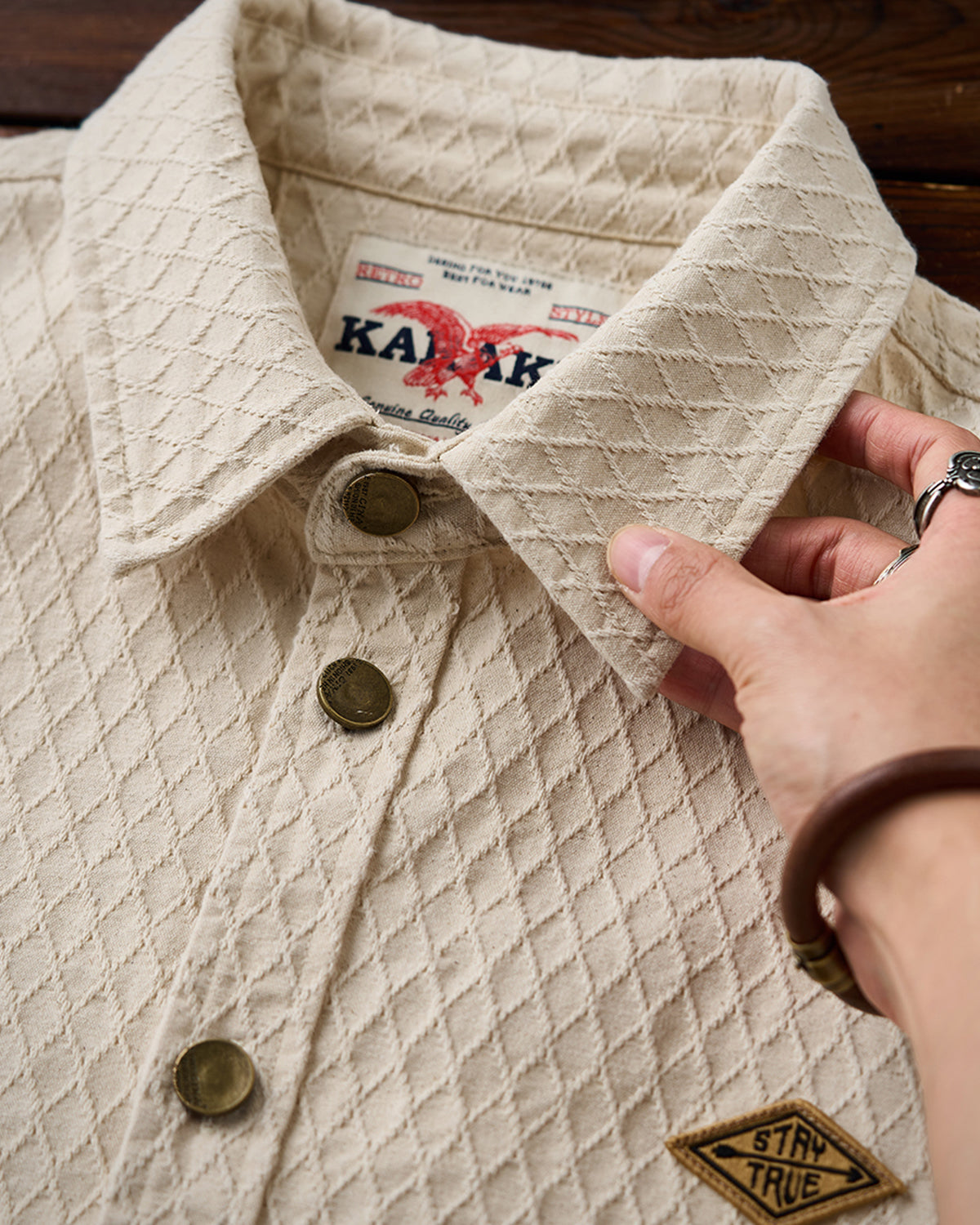 It has no collar, giving it a casual look. The large pockets and color-coordinated buttons are also nice touches.