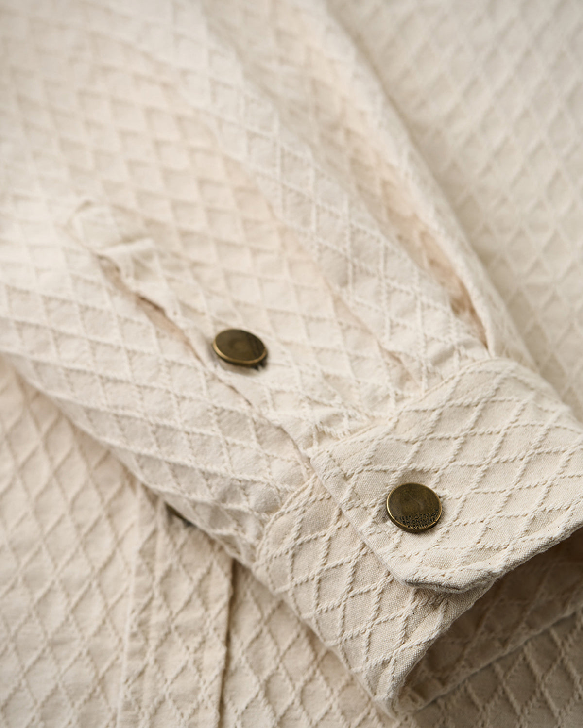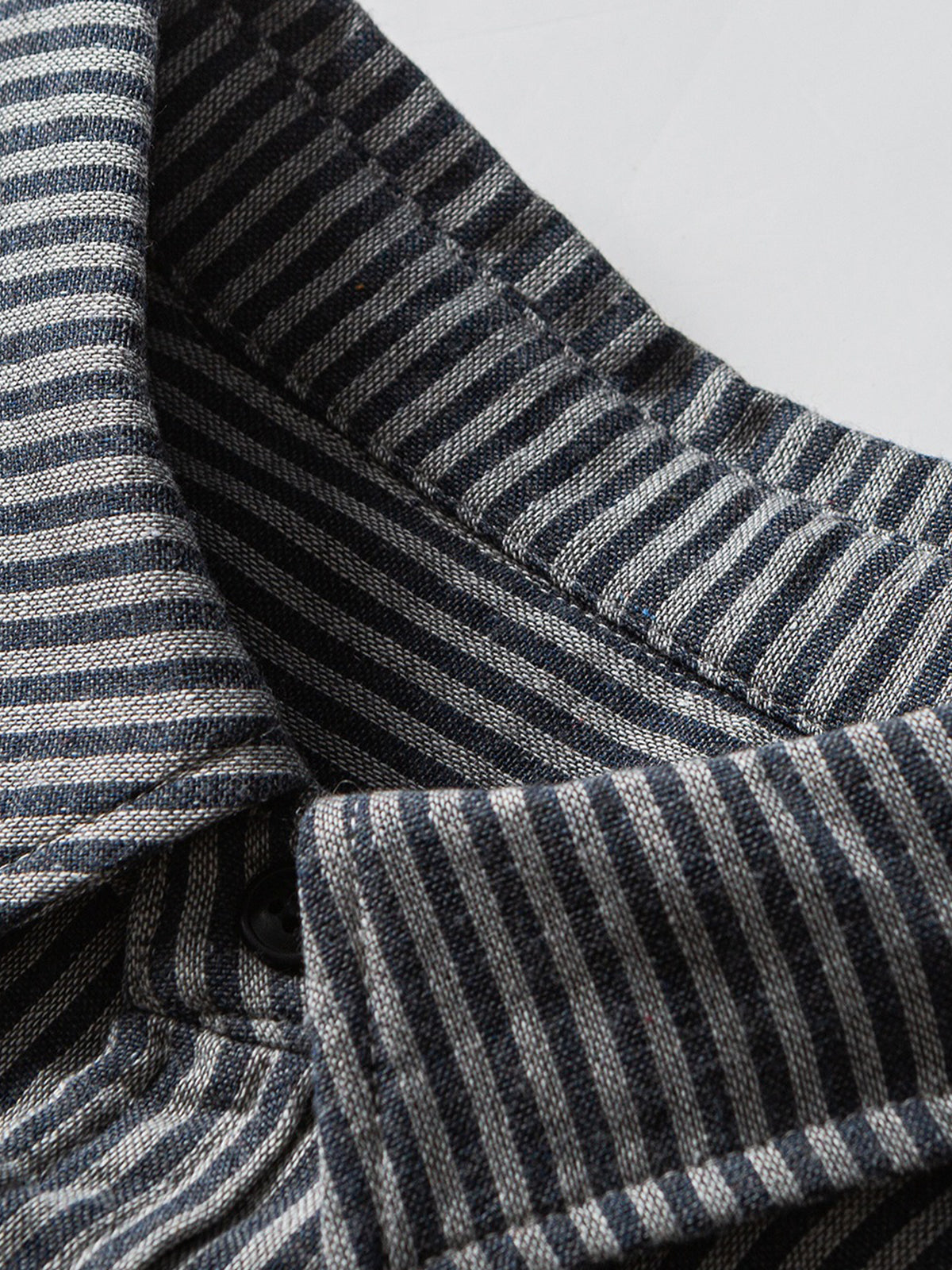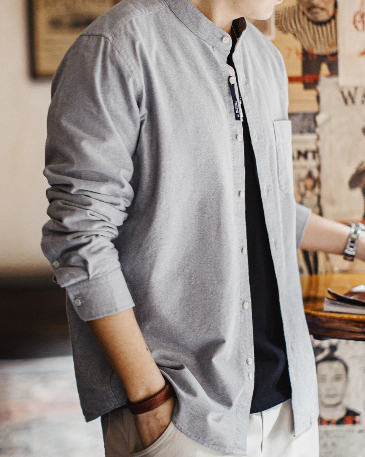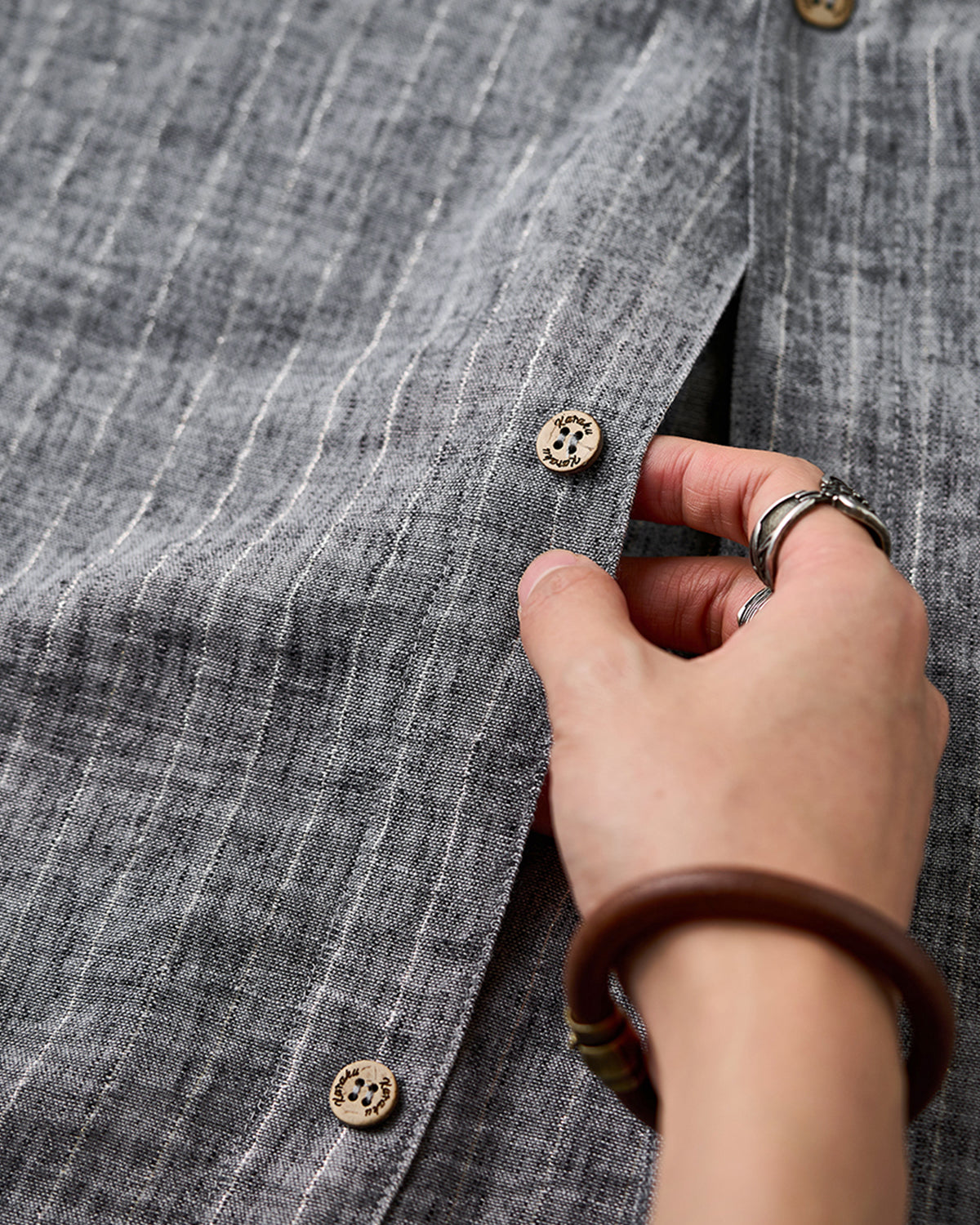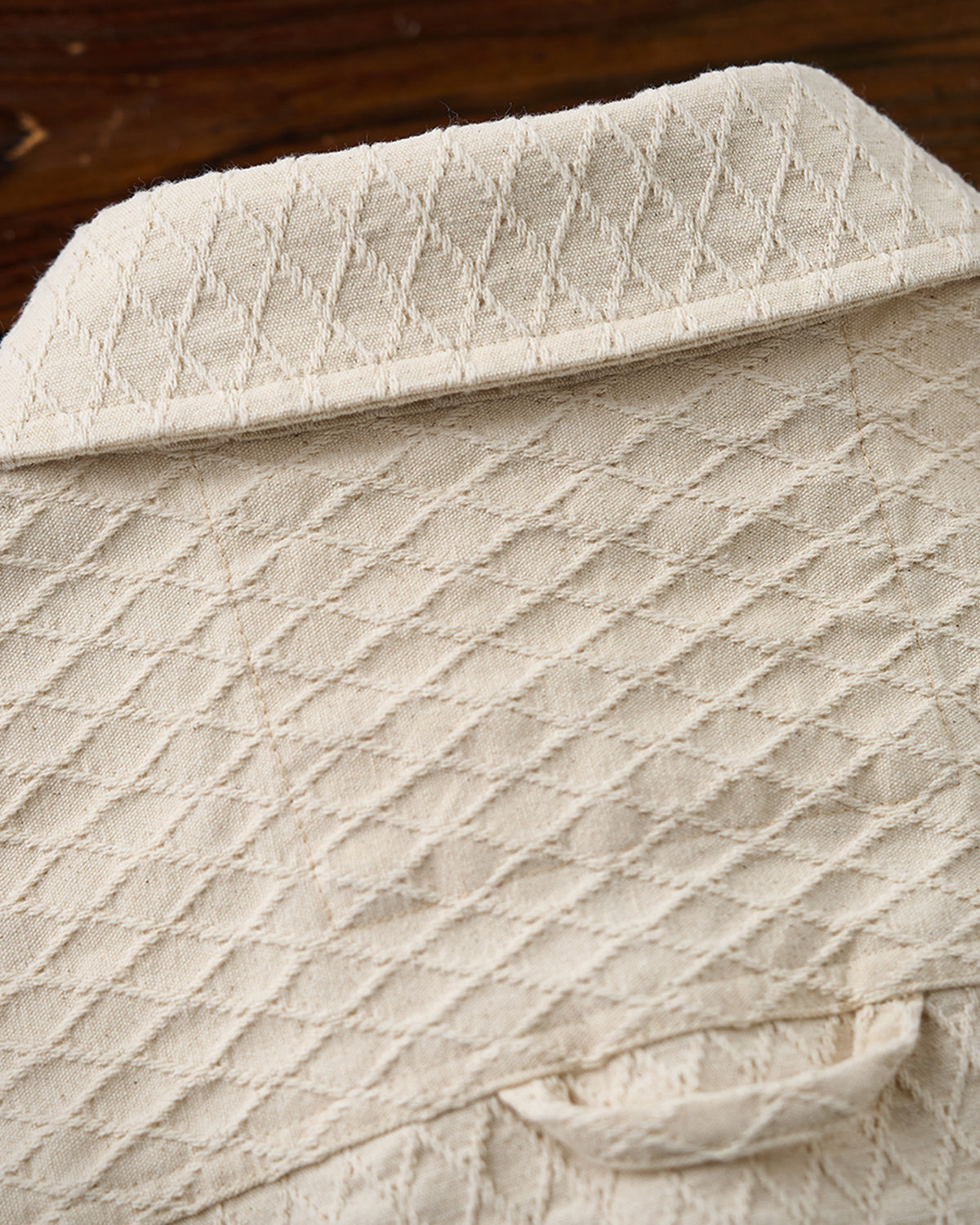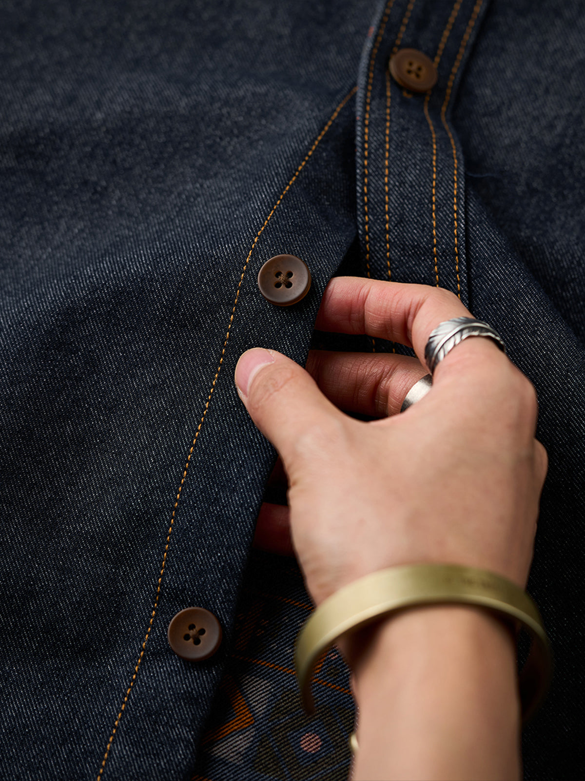 It has no collar, giving it a casual look. The large pockets and color-coordinated buttons are also nice touches.