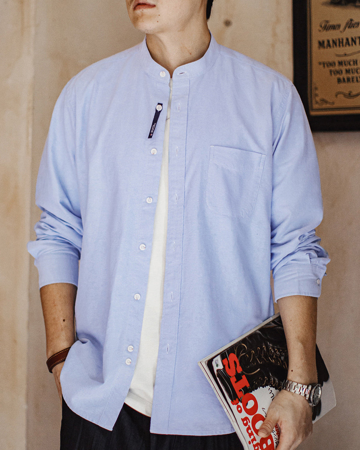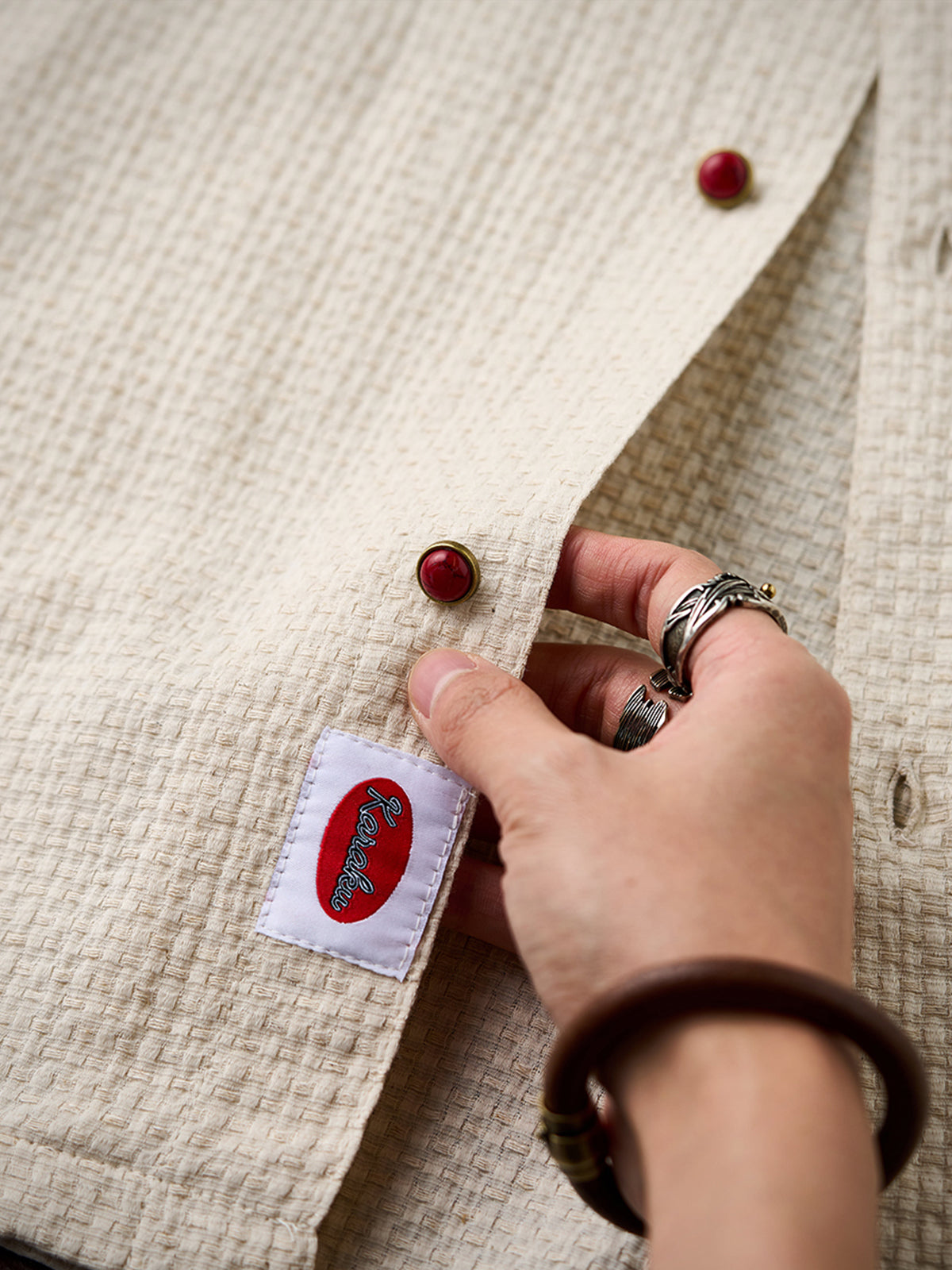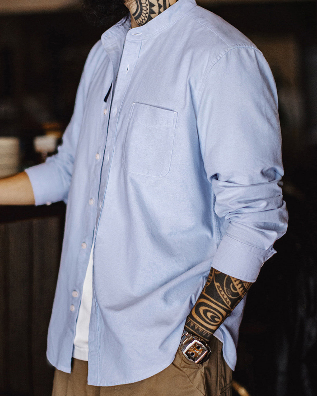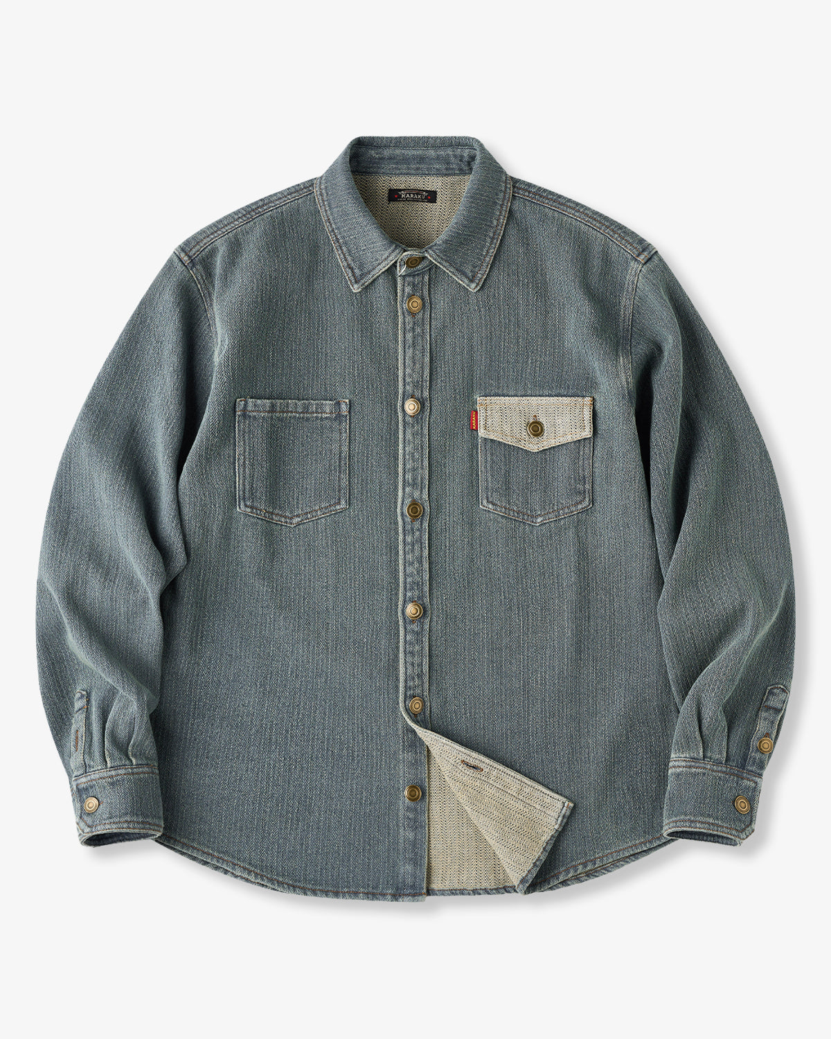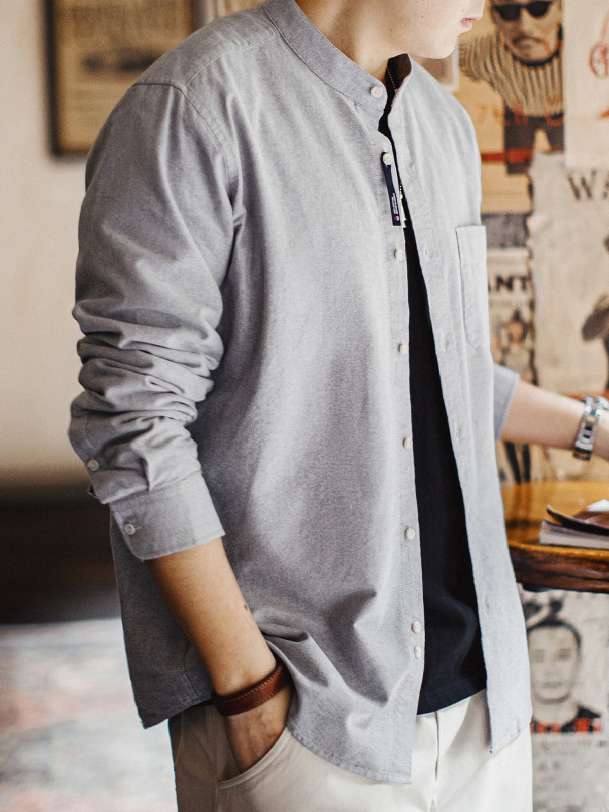 It has no collar, giving it a casual look. The large pockets and color-coordinated buttons are also nice touches.