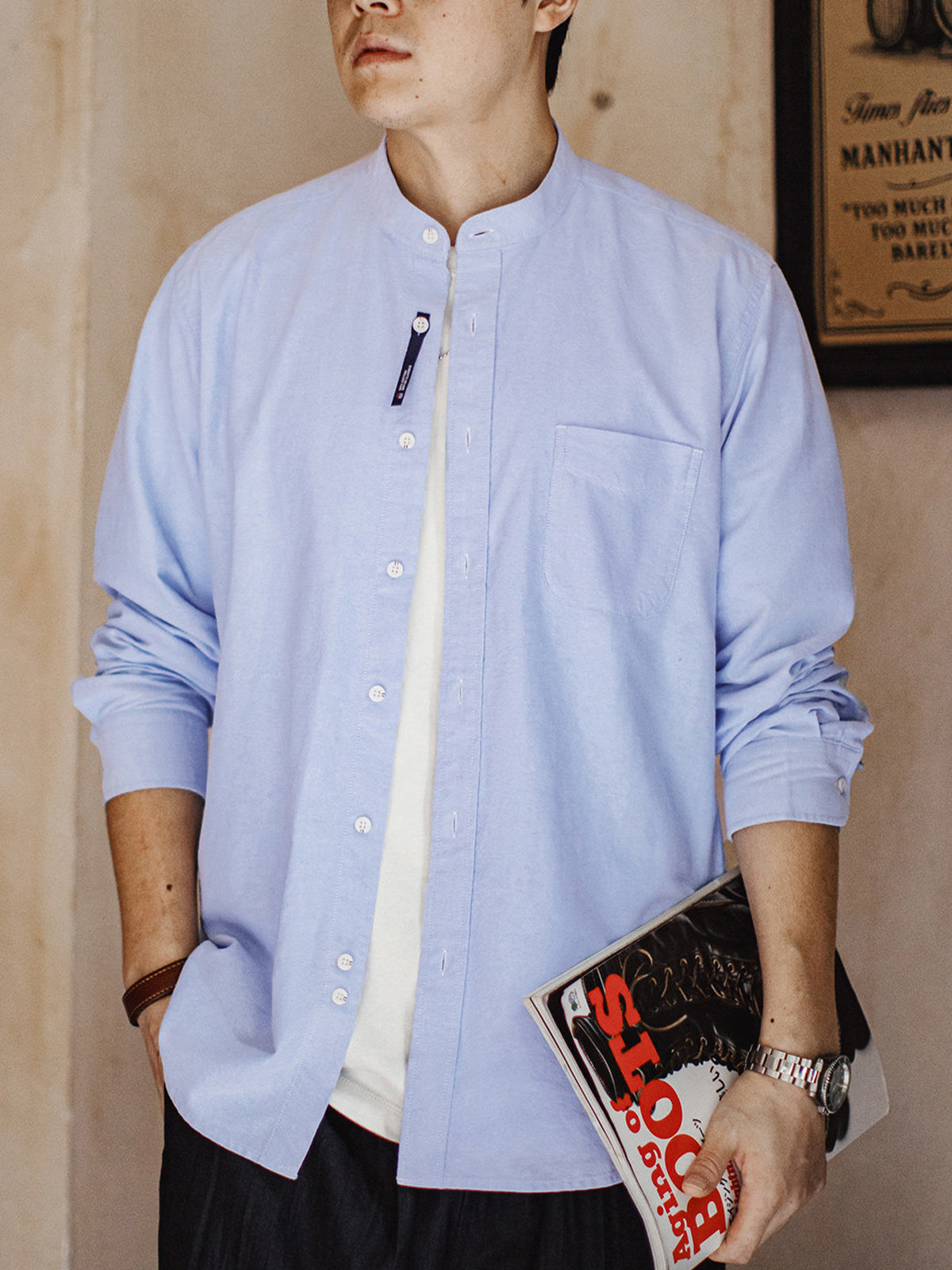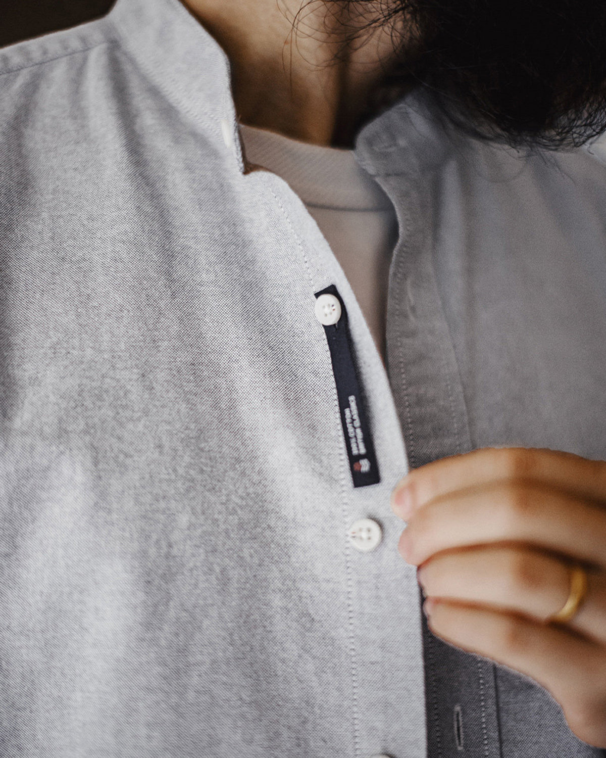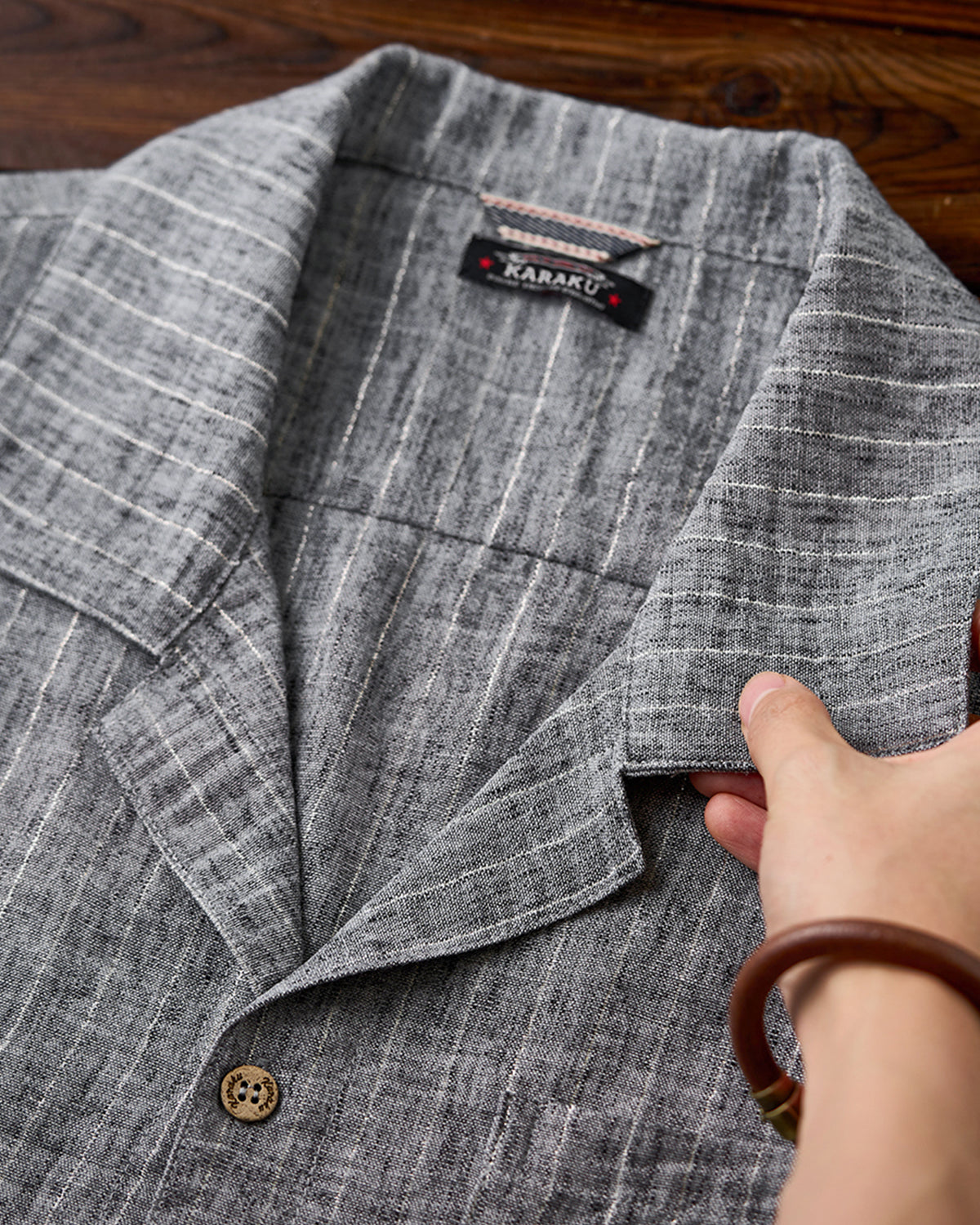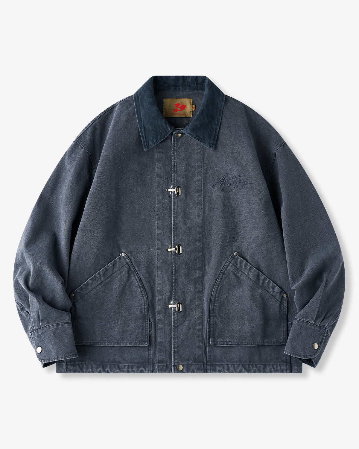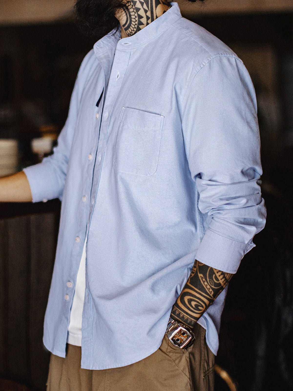 It has no collar, giving it a casual look. The large pockets and color-coordinated buttons are also nice touches.