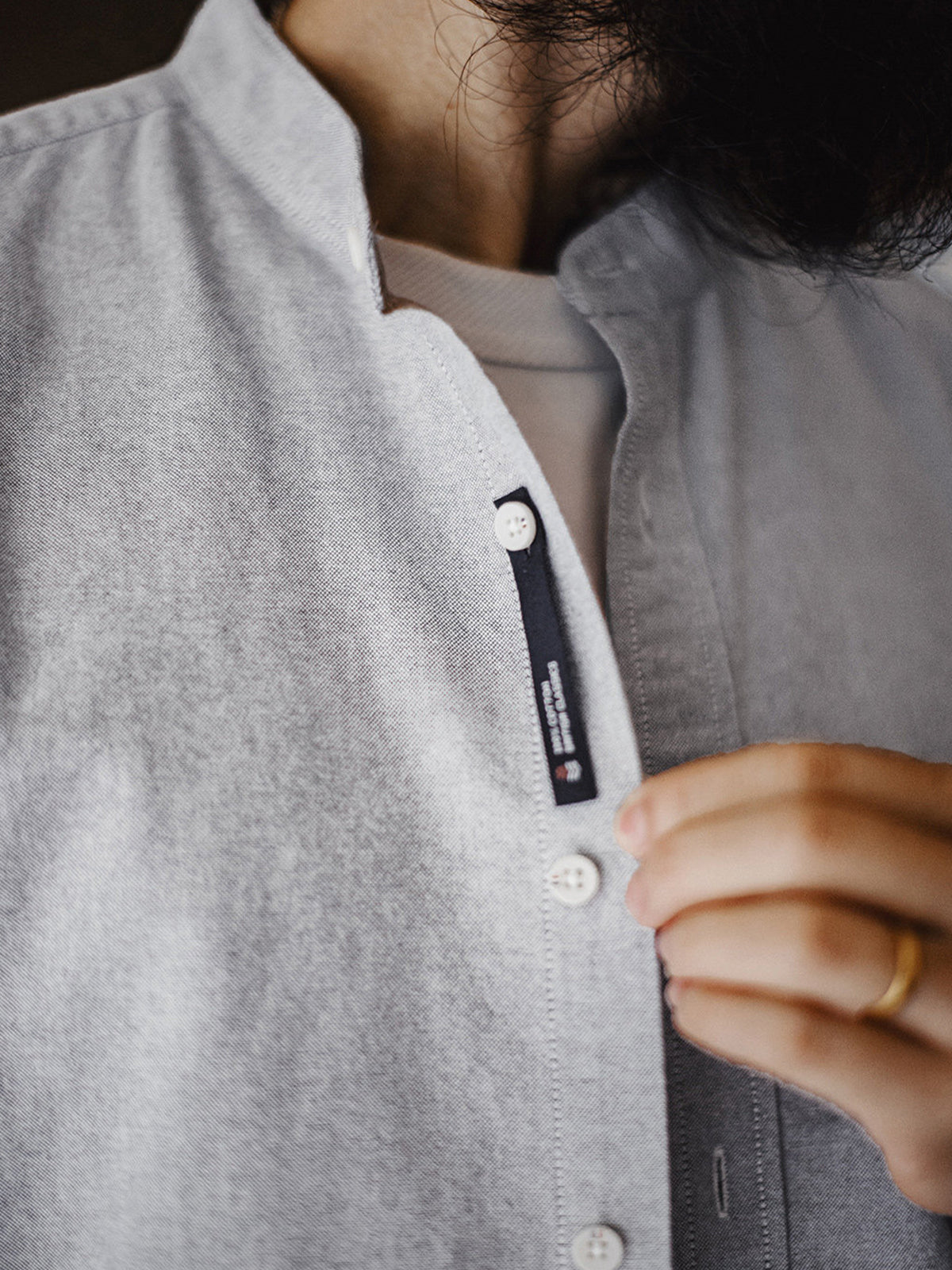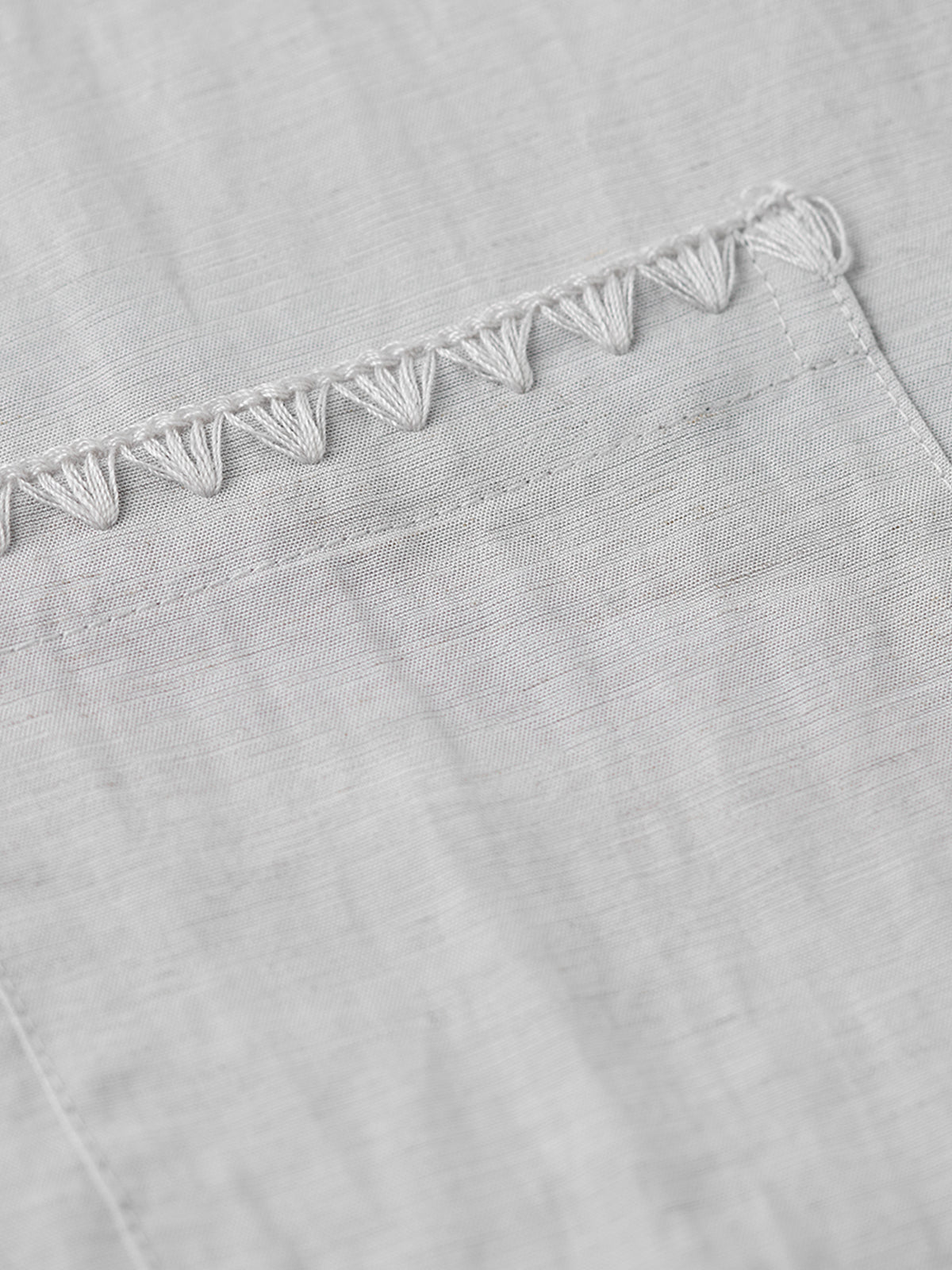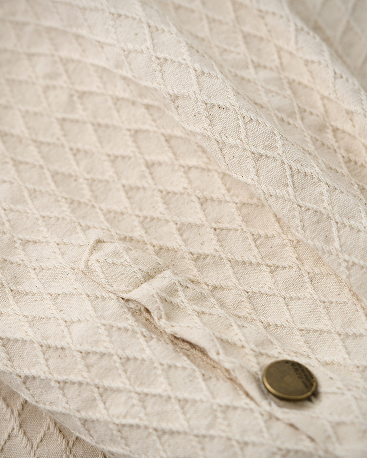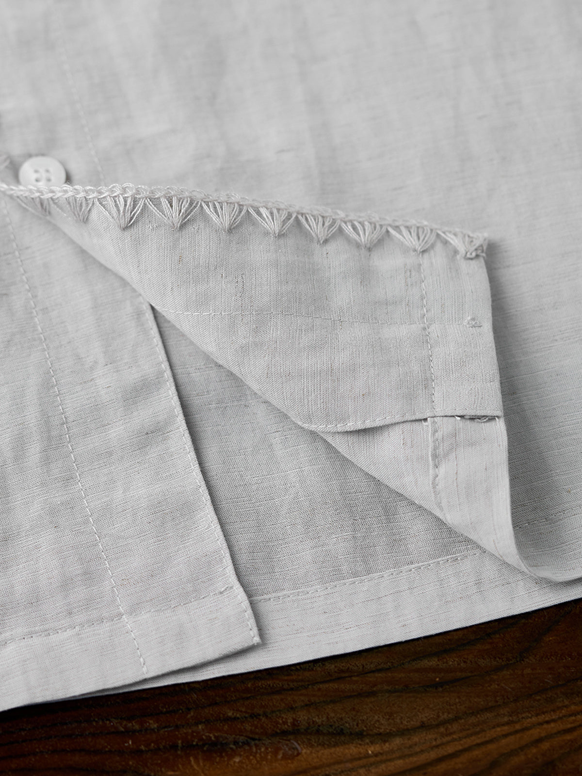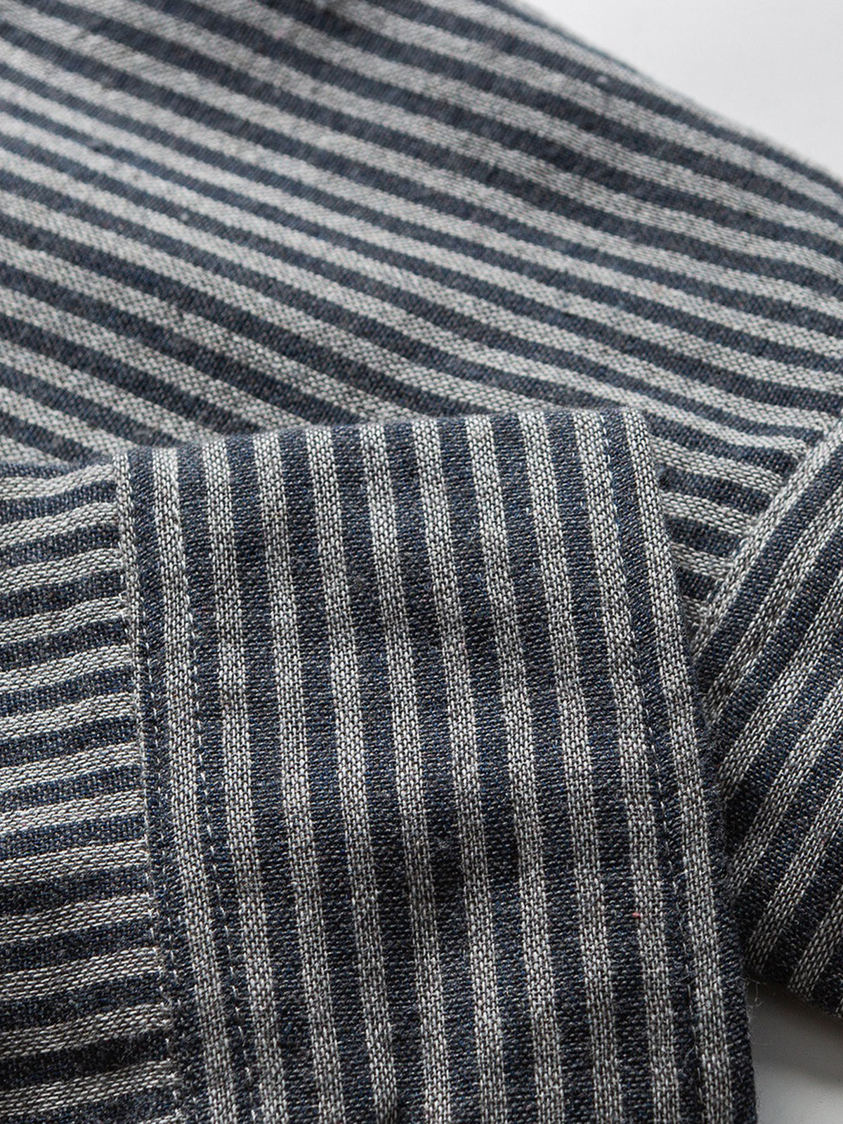It has no collar, giving it a casual look. The large pockets and color-coordinated buttons are also nice touches.