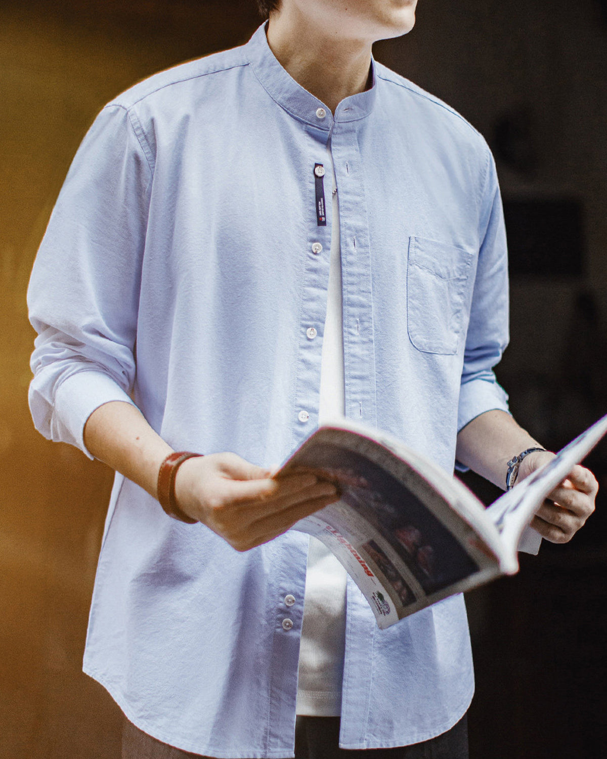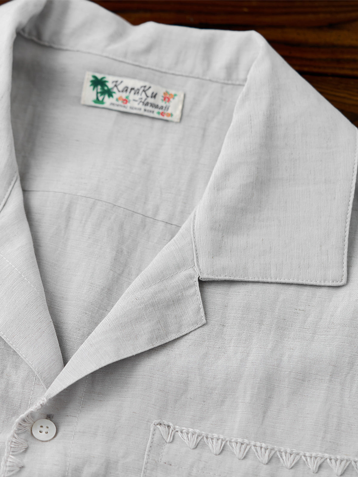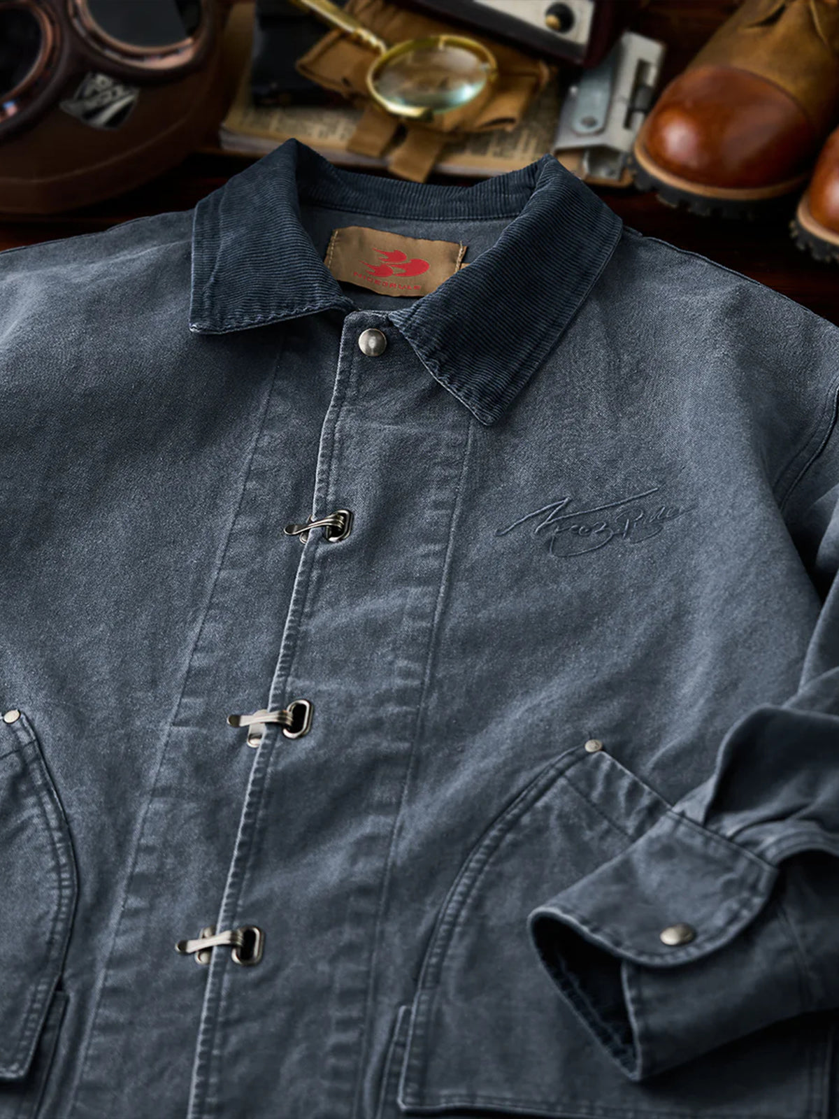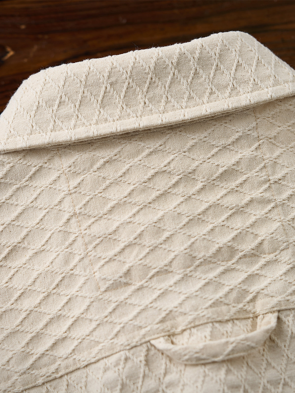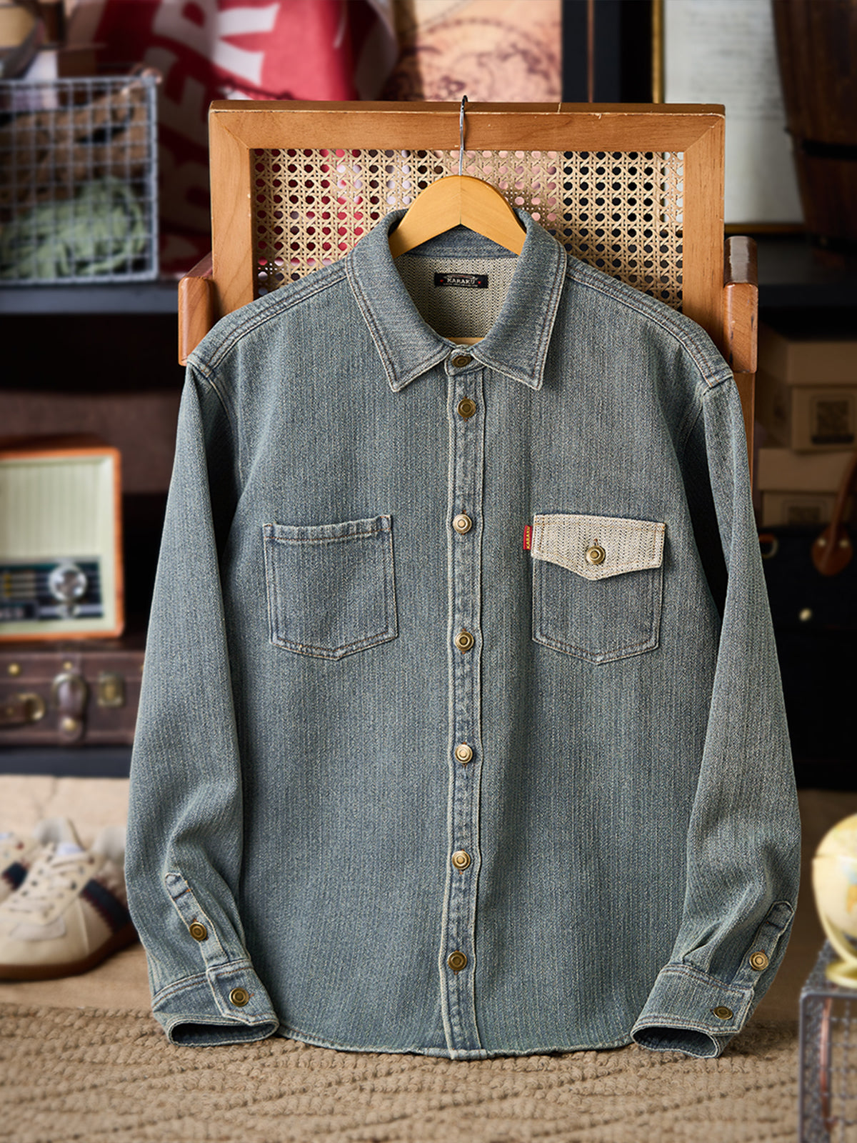 It has no collar, giving it a casual look. The large pockets and color-coordinated buttons are also nice touches.