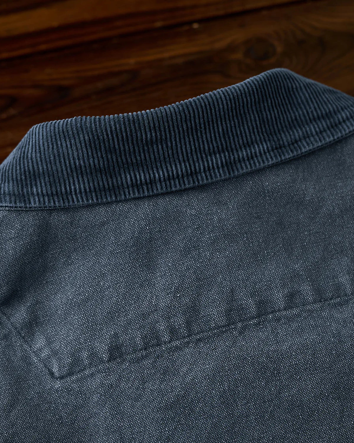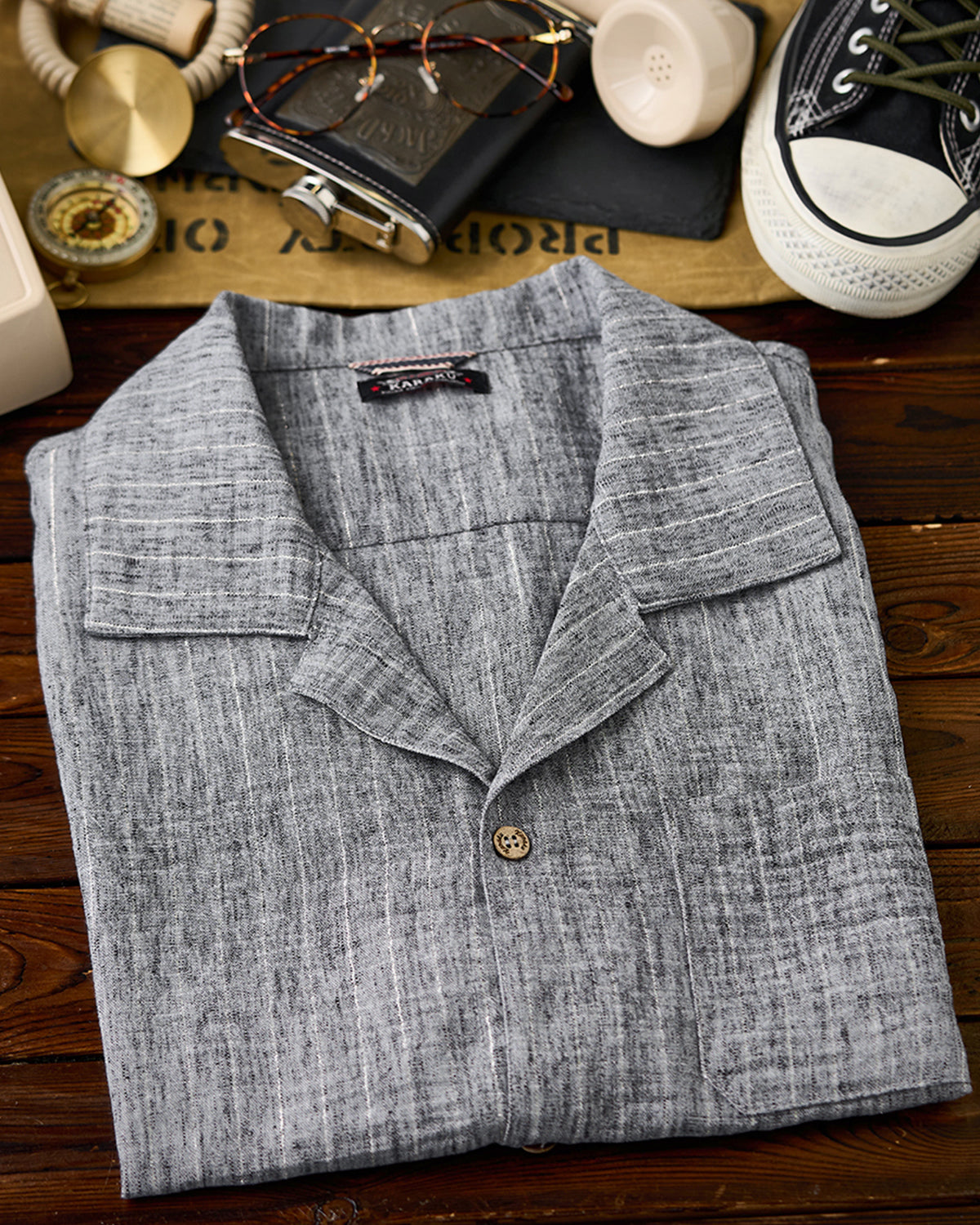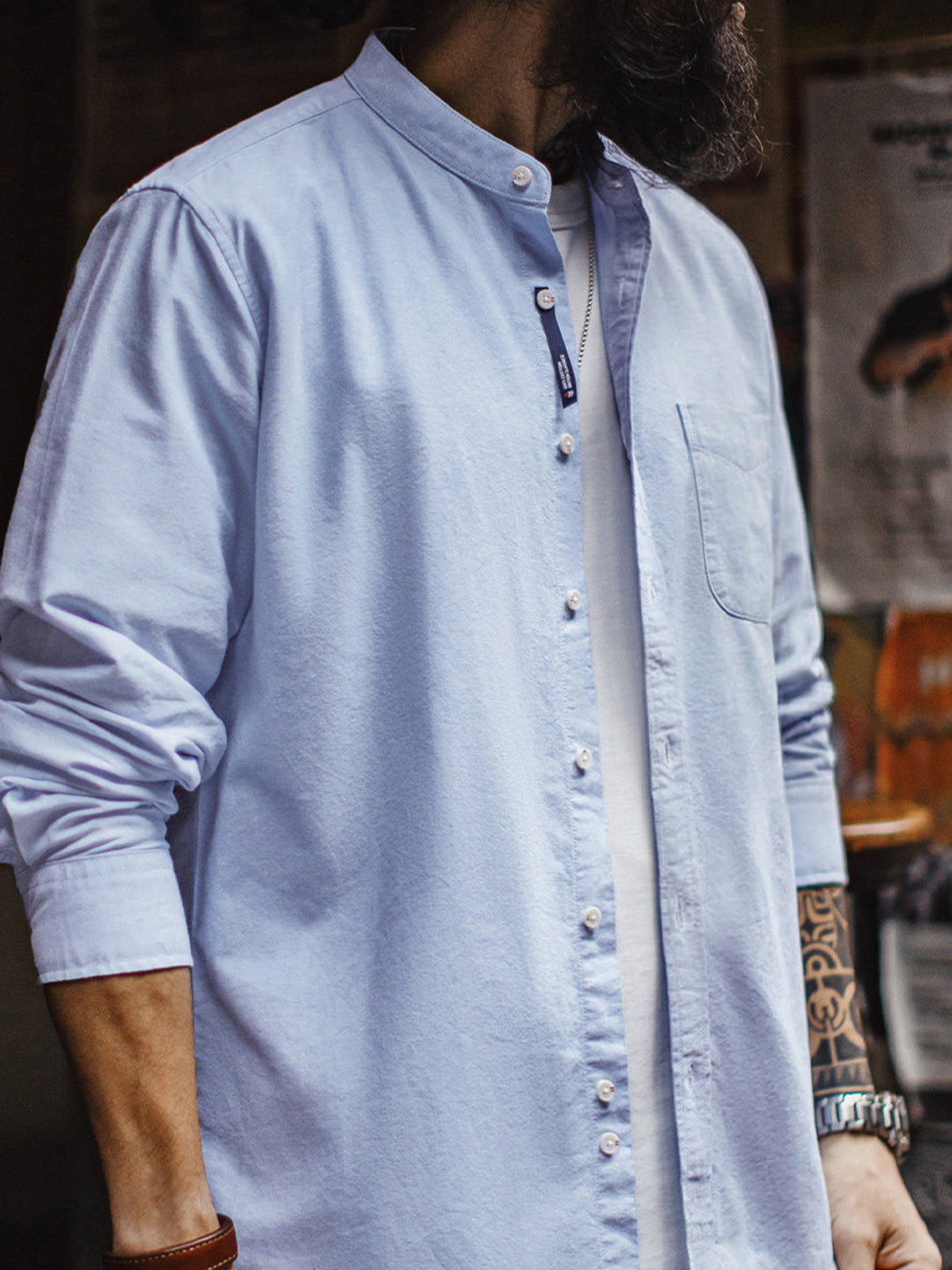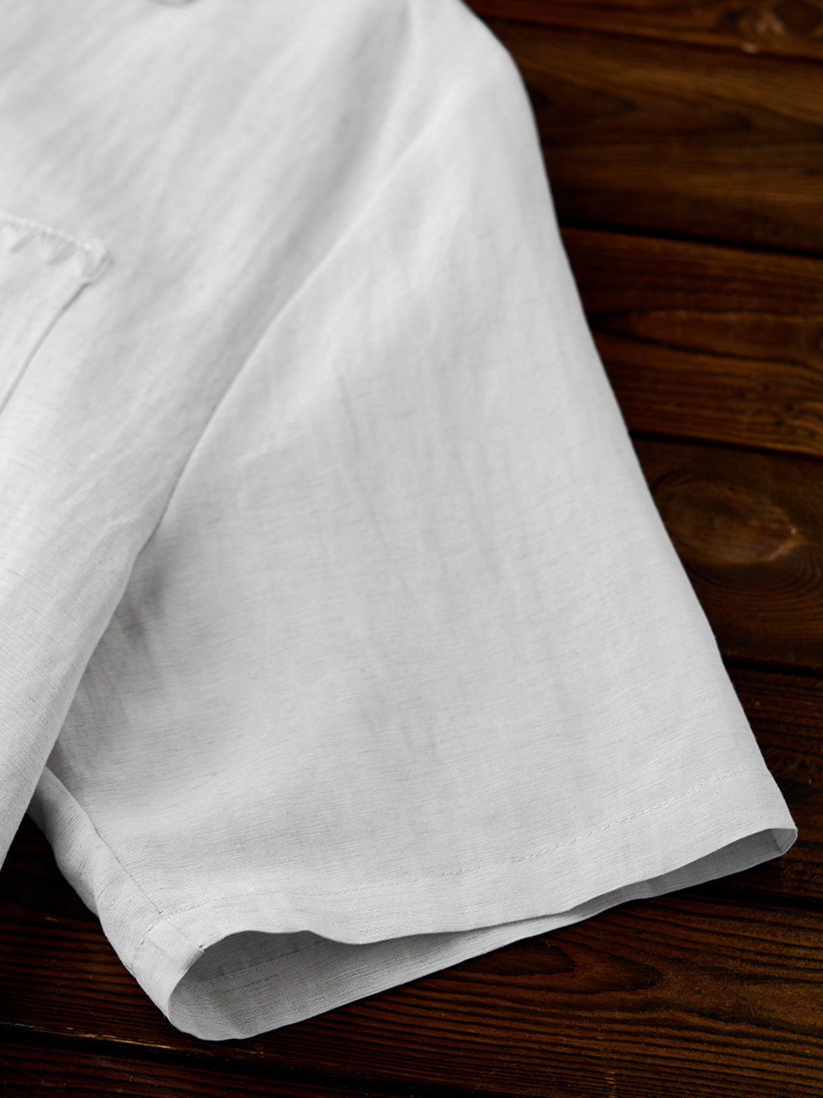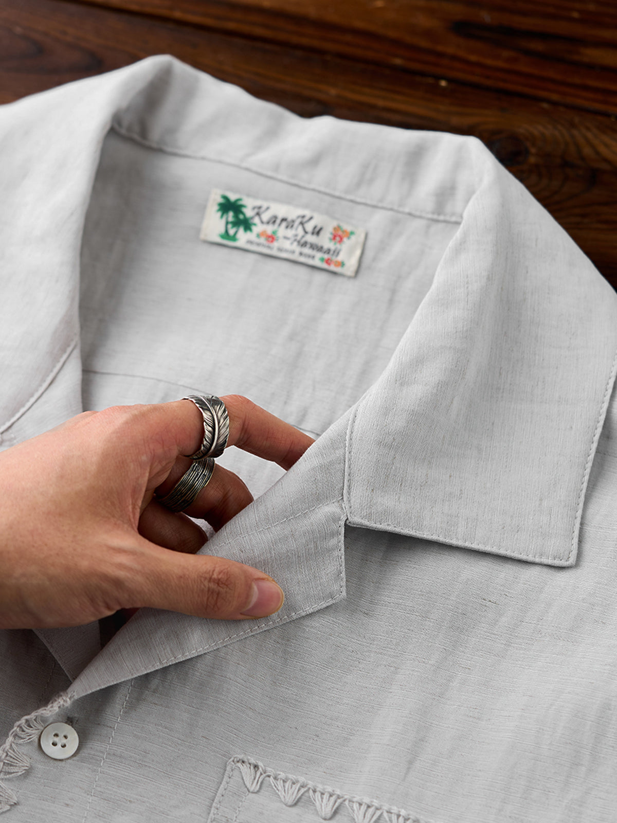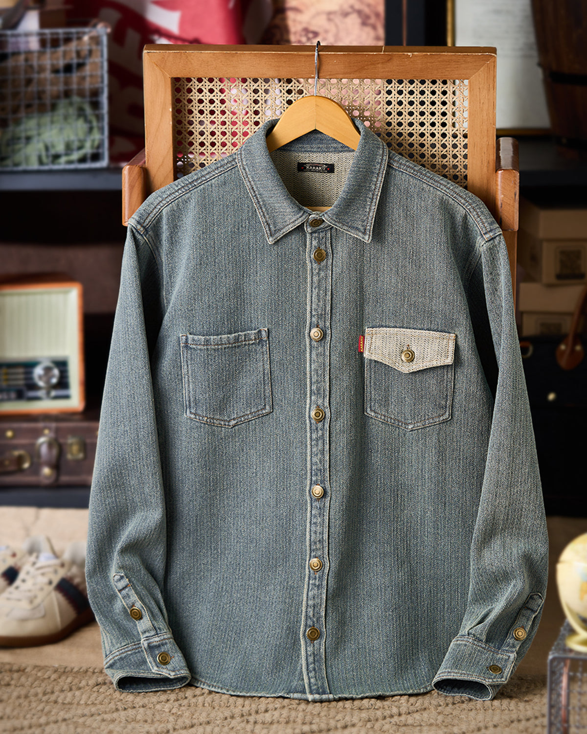 It has no collar, giving it a casual look. The large pockets and color-coordinated buttons are also nice touches.