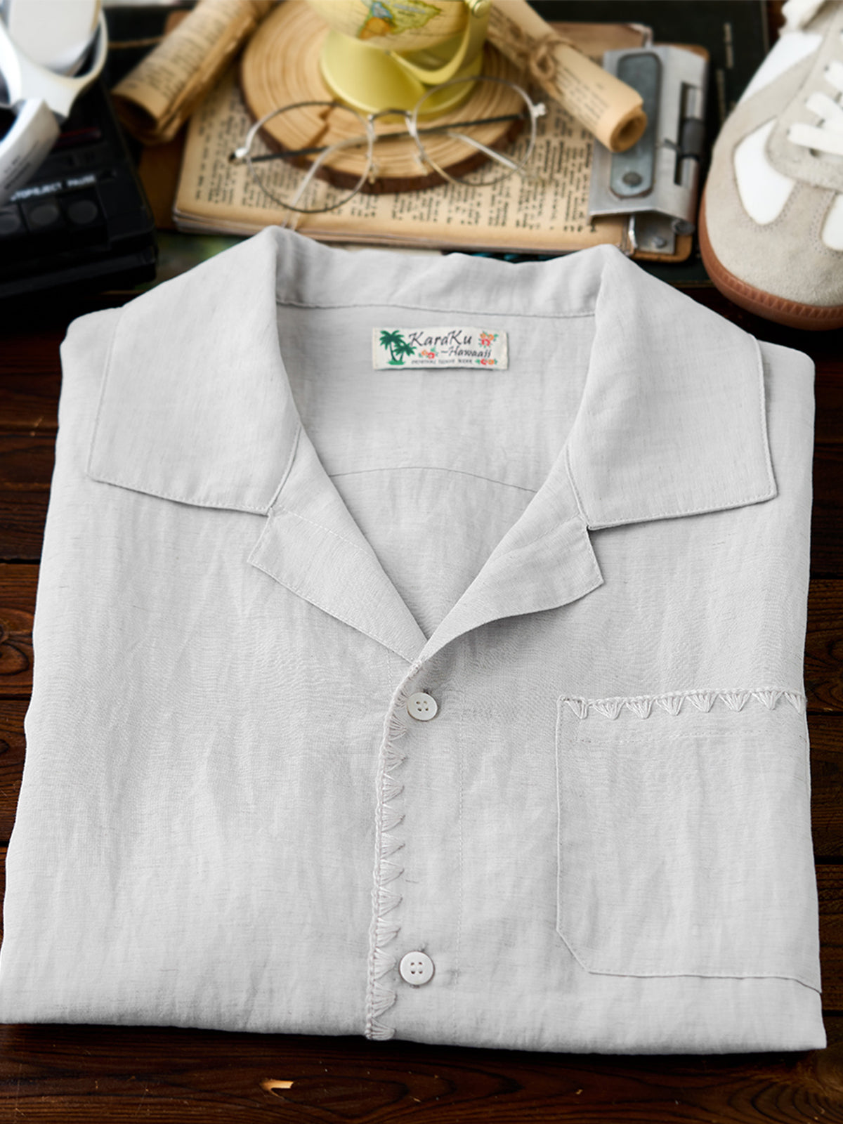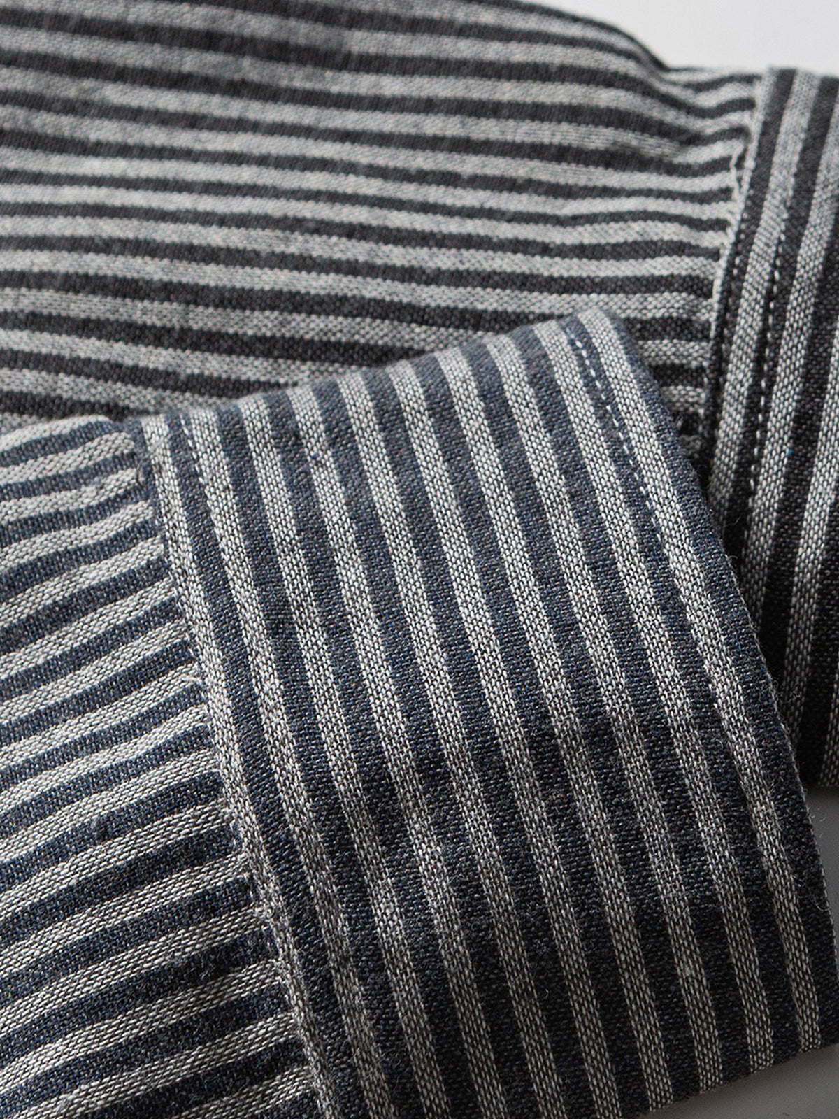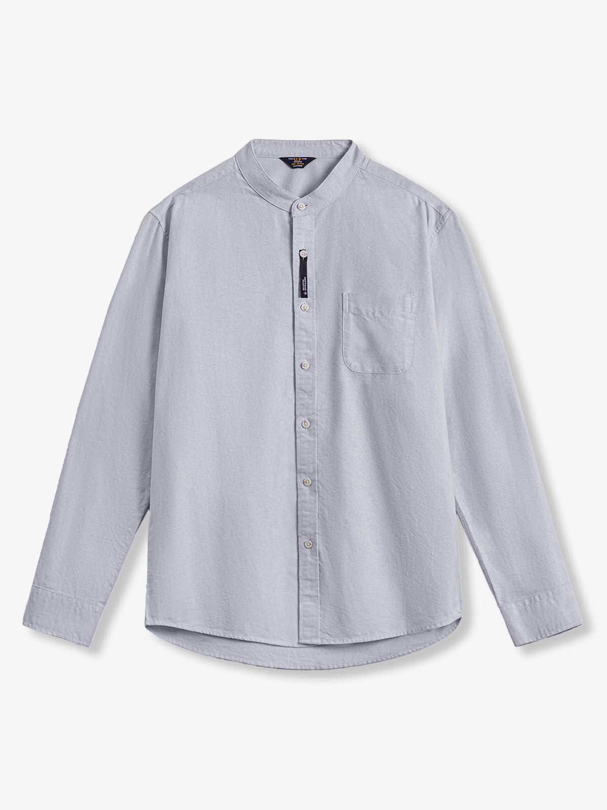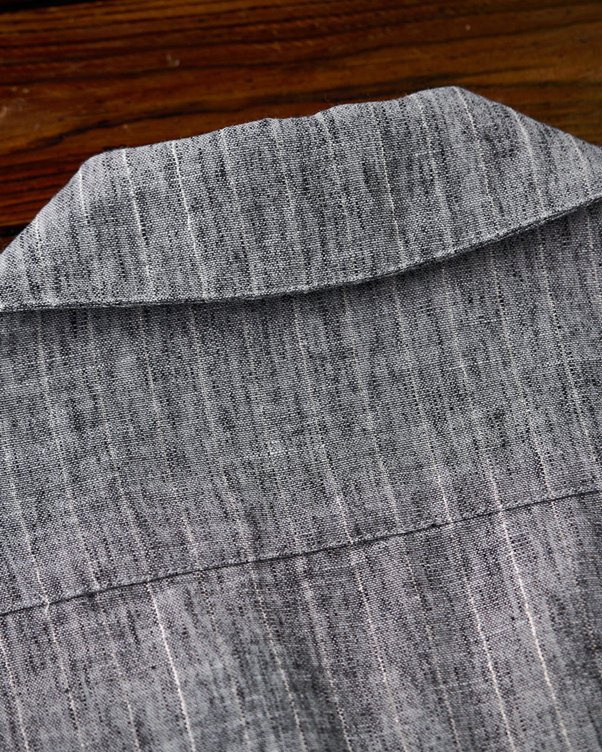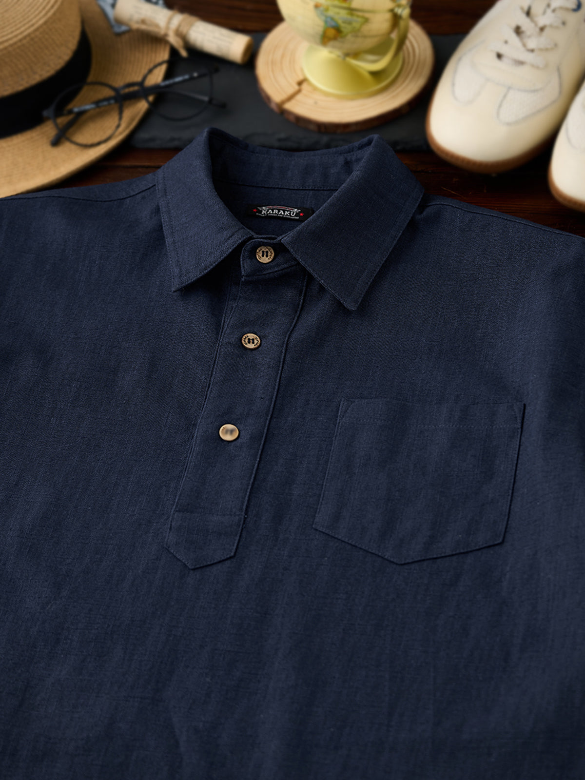 It has no collar, giving it a casual look. The large pockets and color-coordinated buttons are also nice touches.