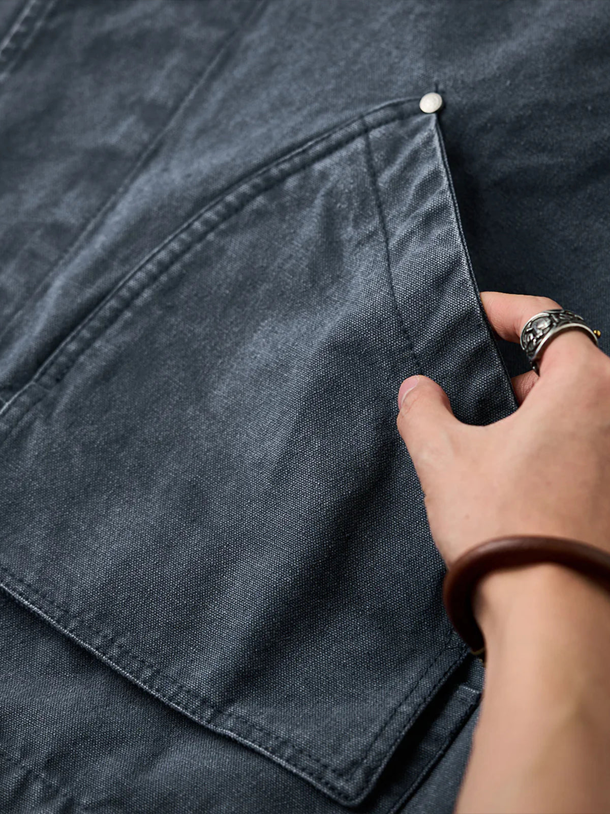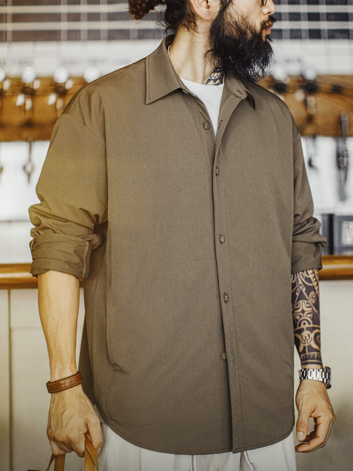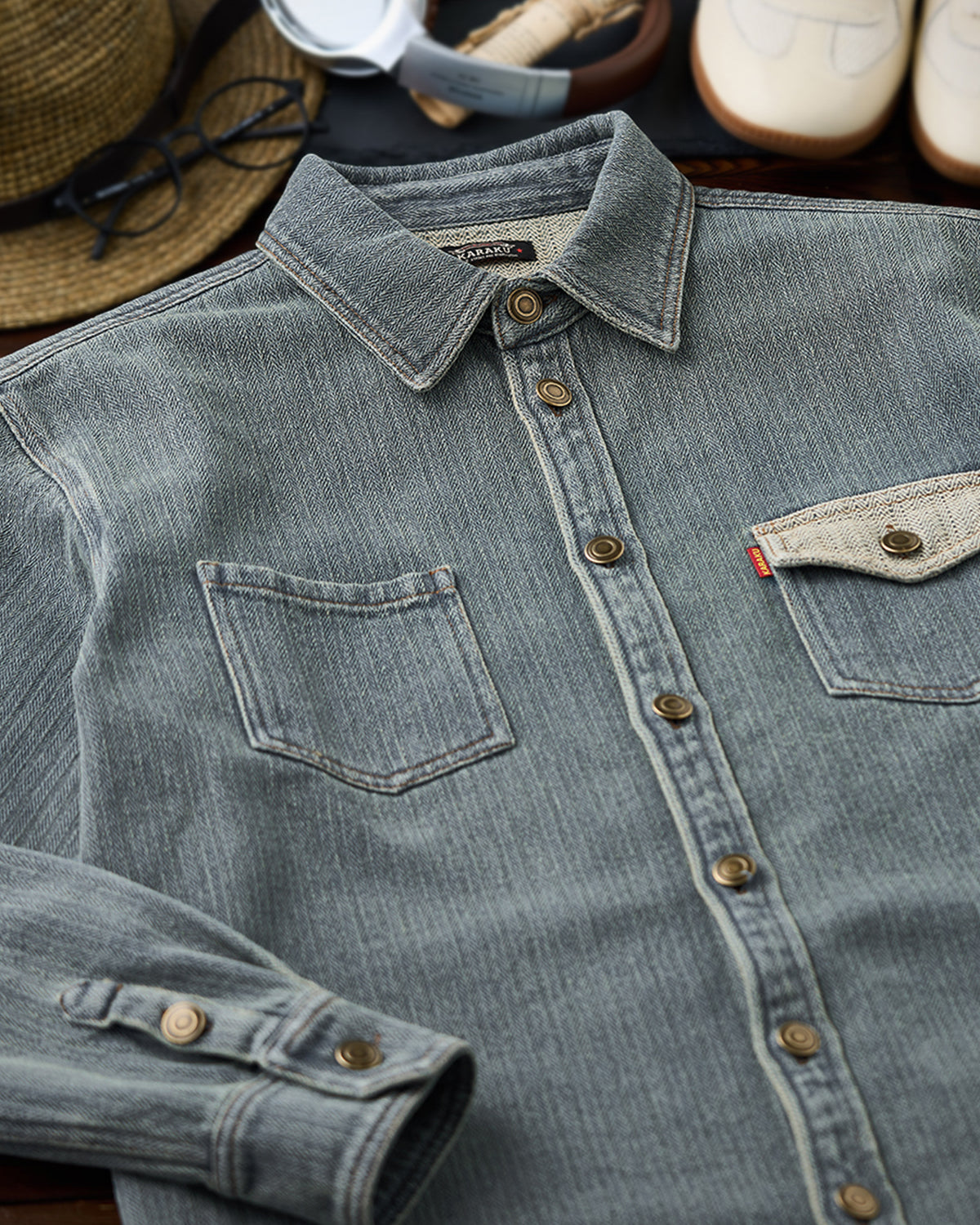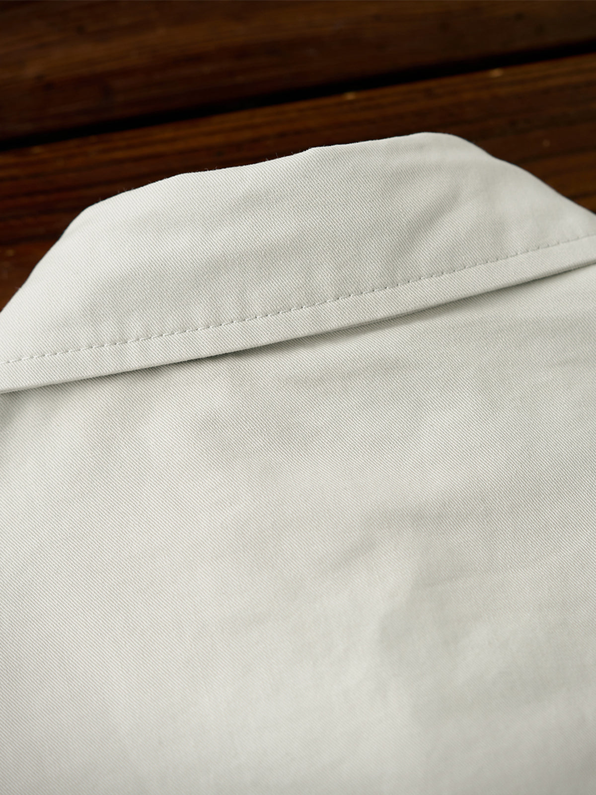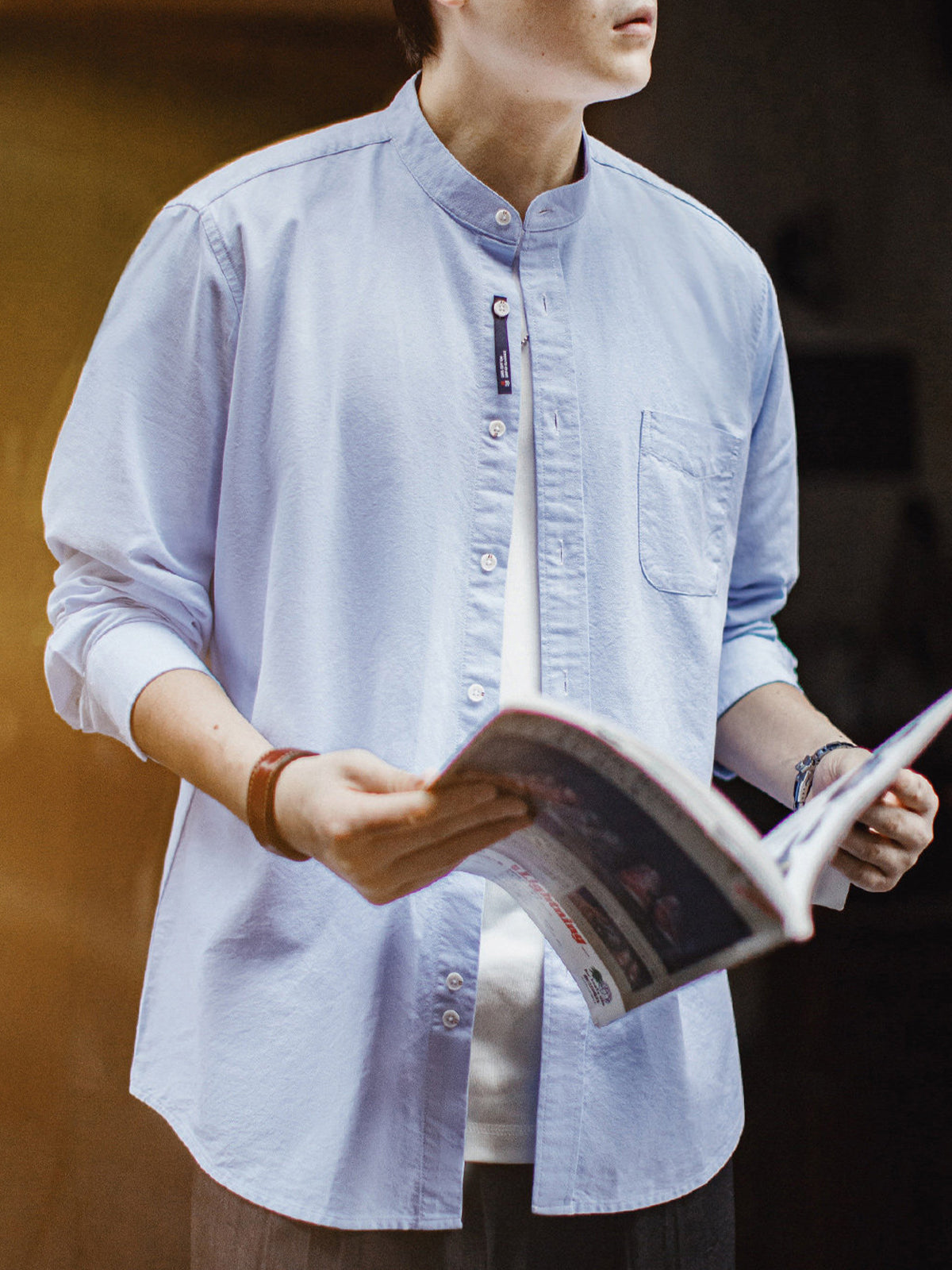 It has no collar, giving it a casual look. The large pockets and color-coordinated buttons are also nice touches.