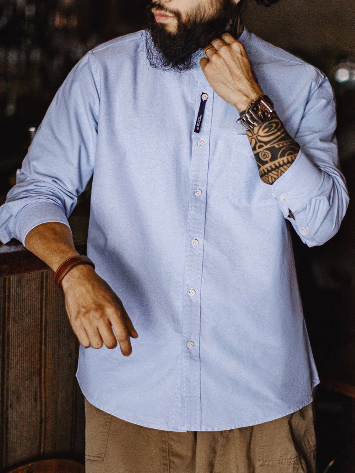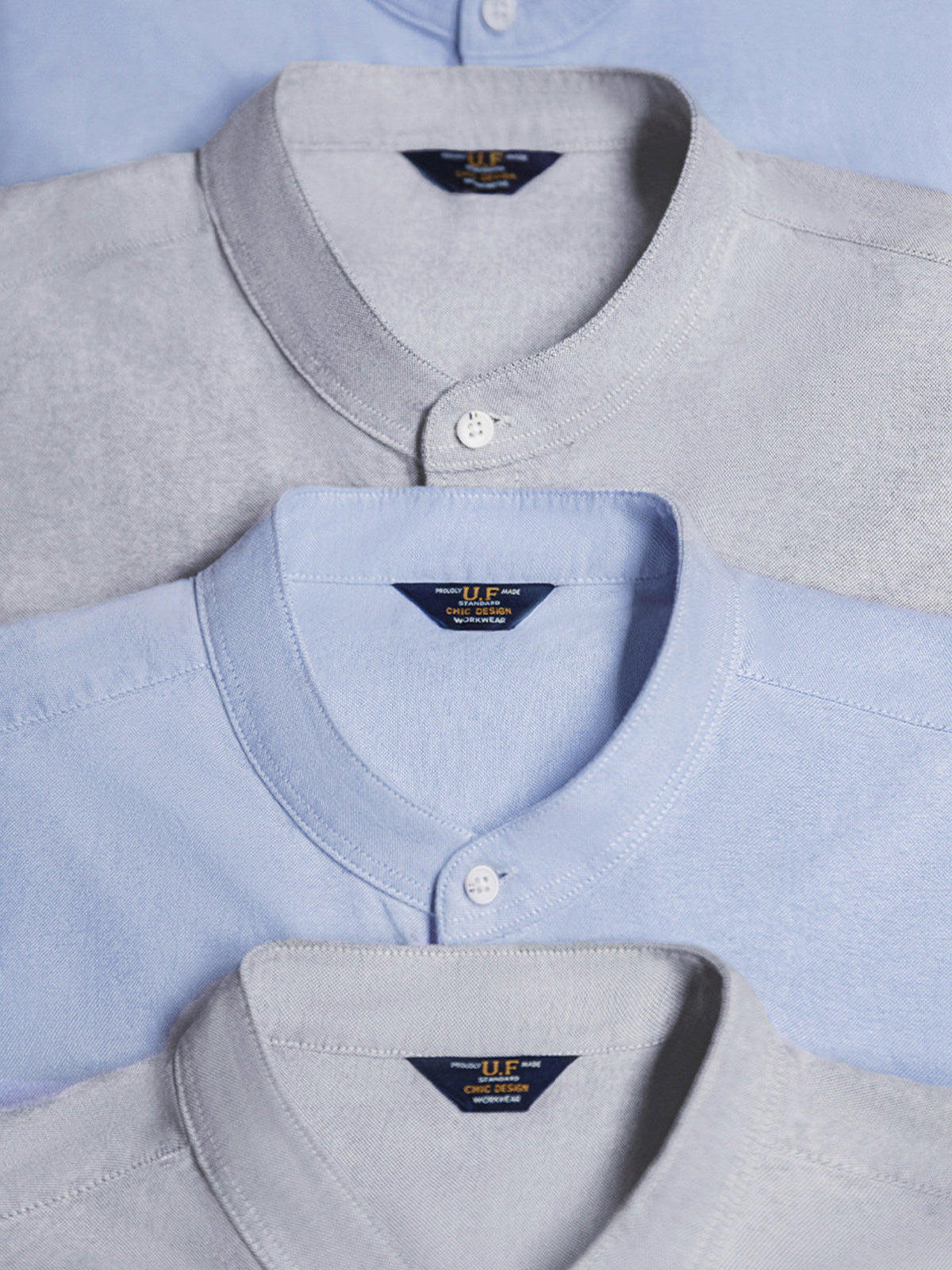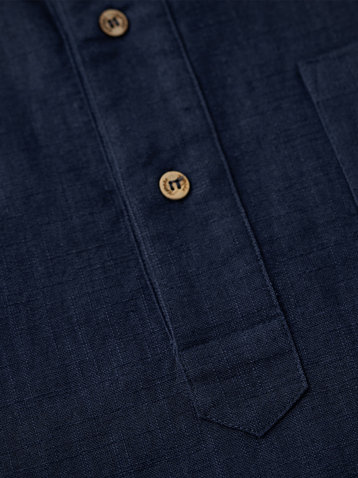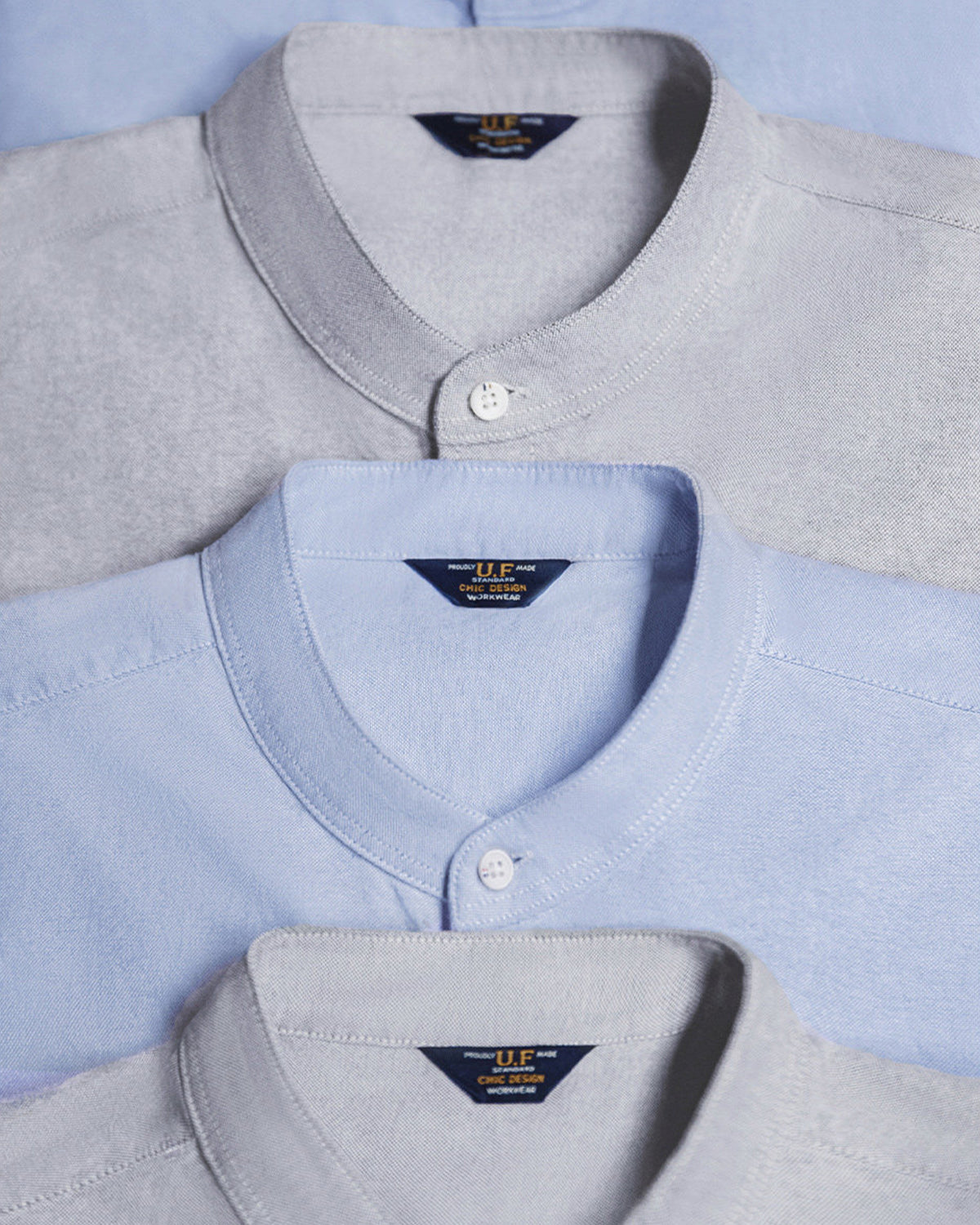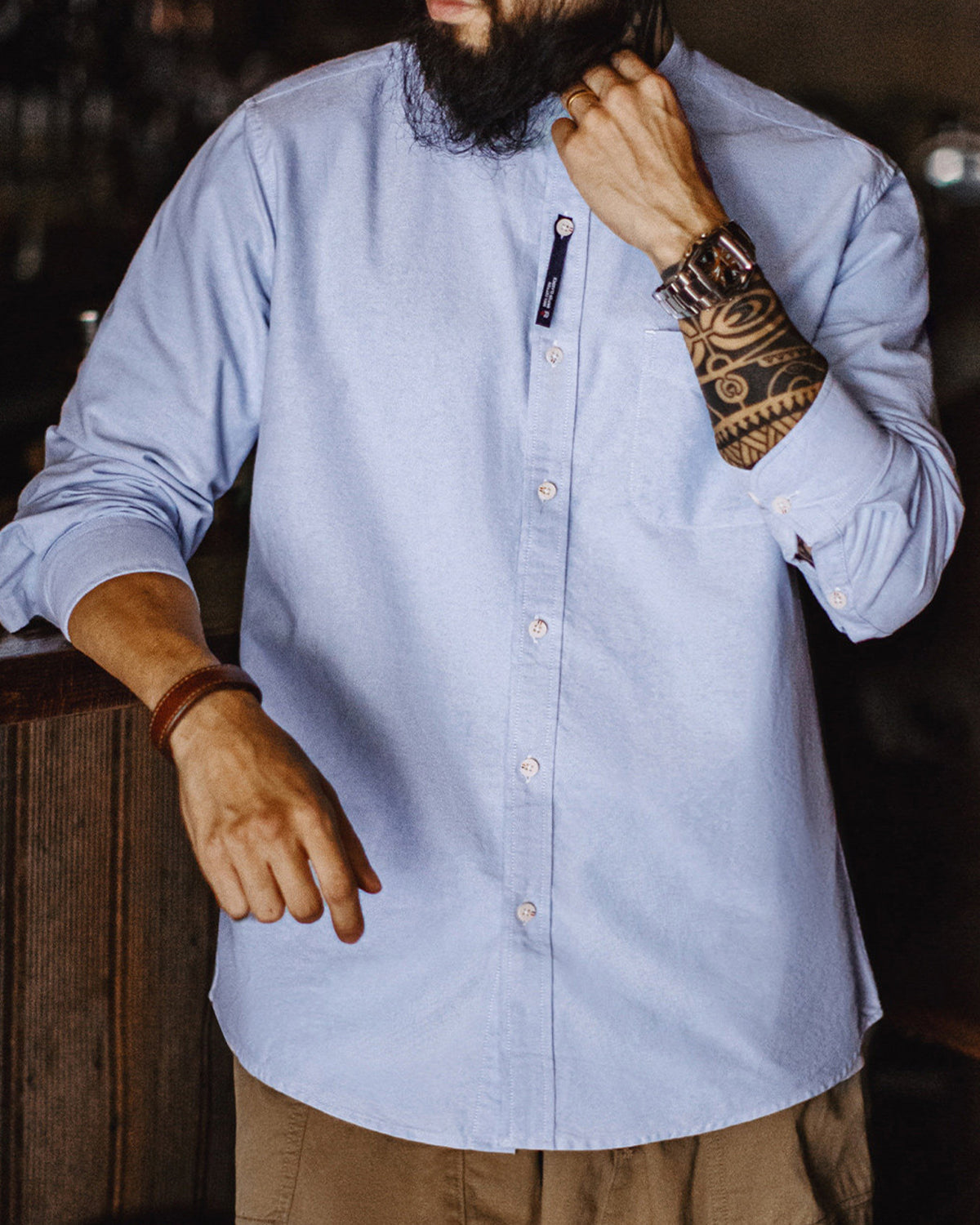 It has no collar, giving it a casual look. The large pockets and color-coordinated buttons are also nice touches.