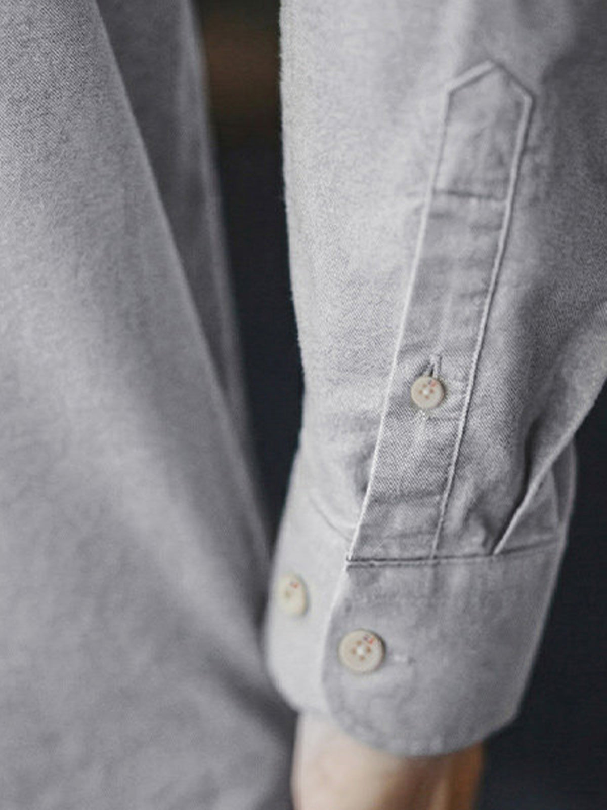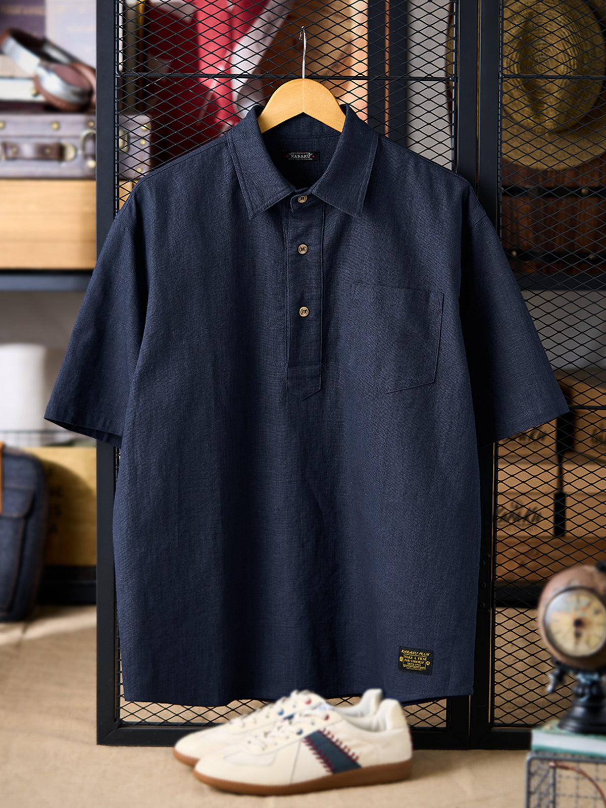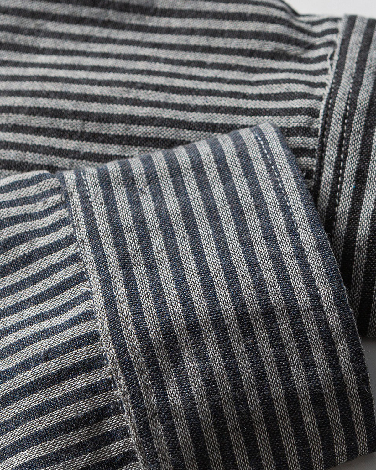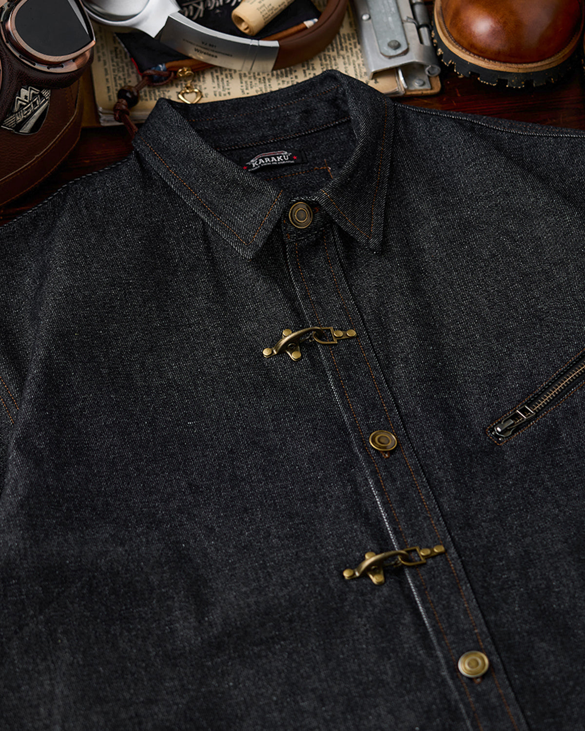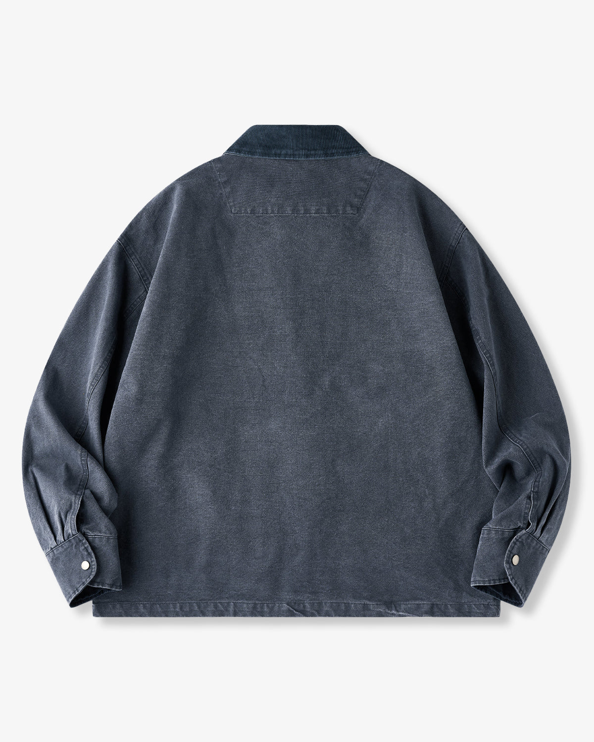 It has no collar, giving it a casual look. The large pockets and color-coordinated buttons are also nice touches.
