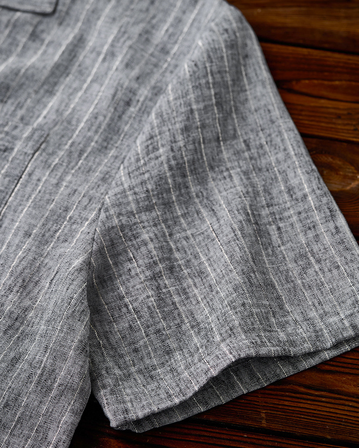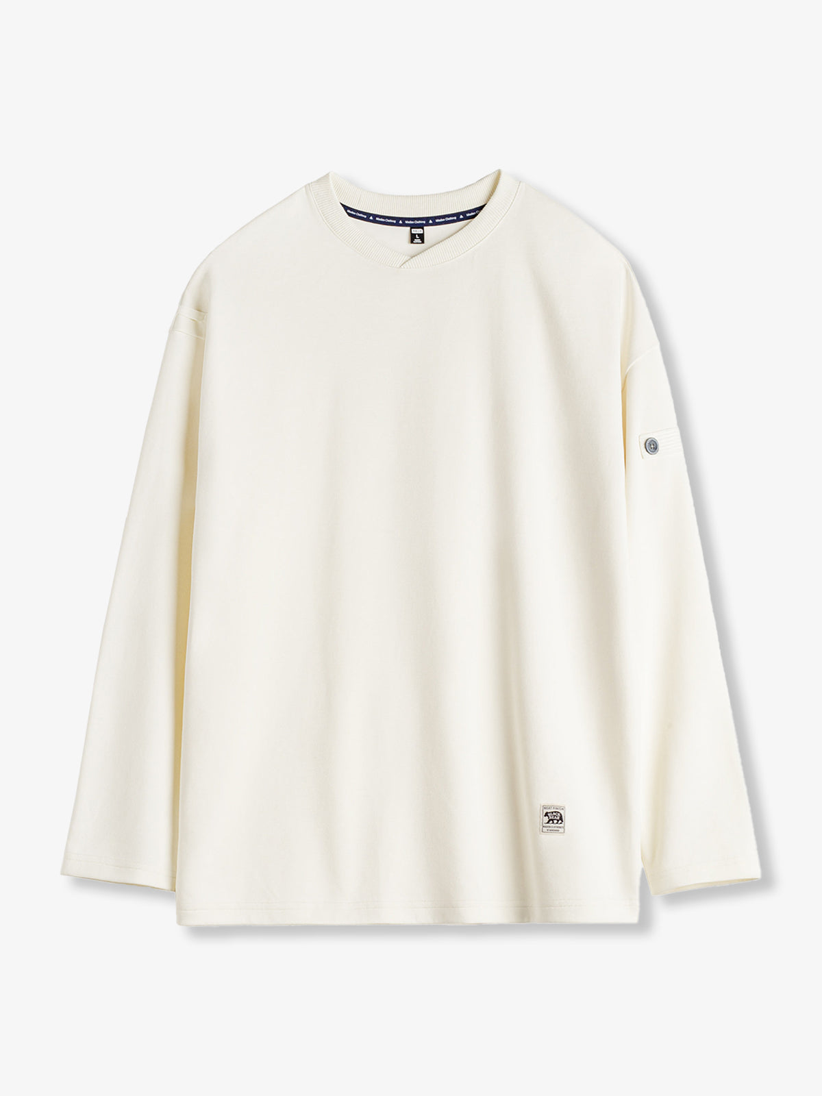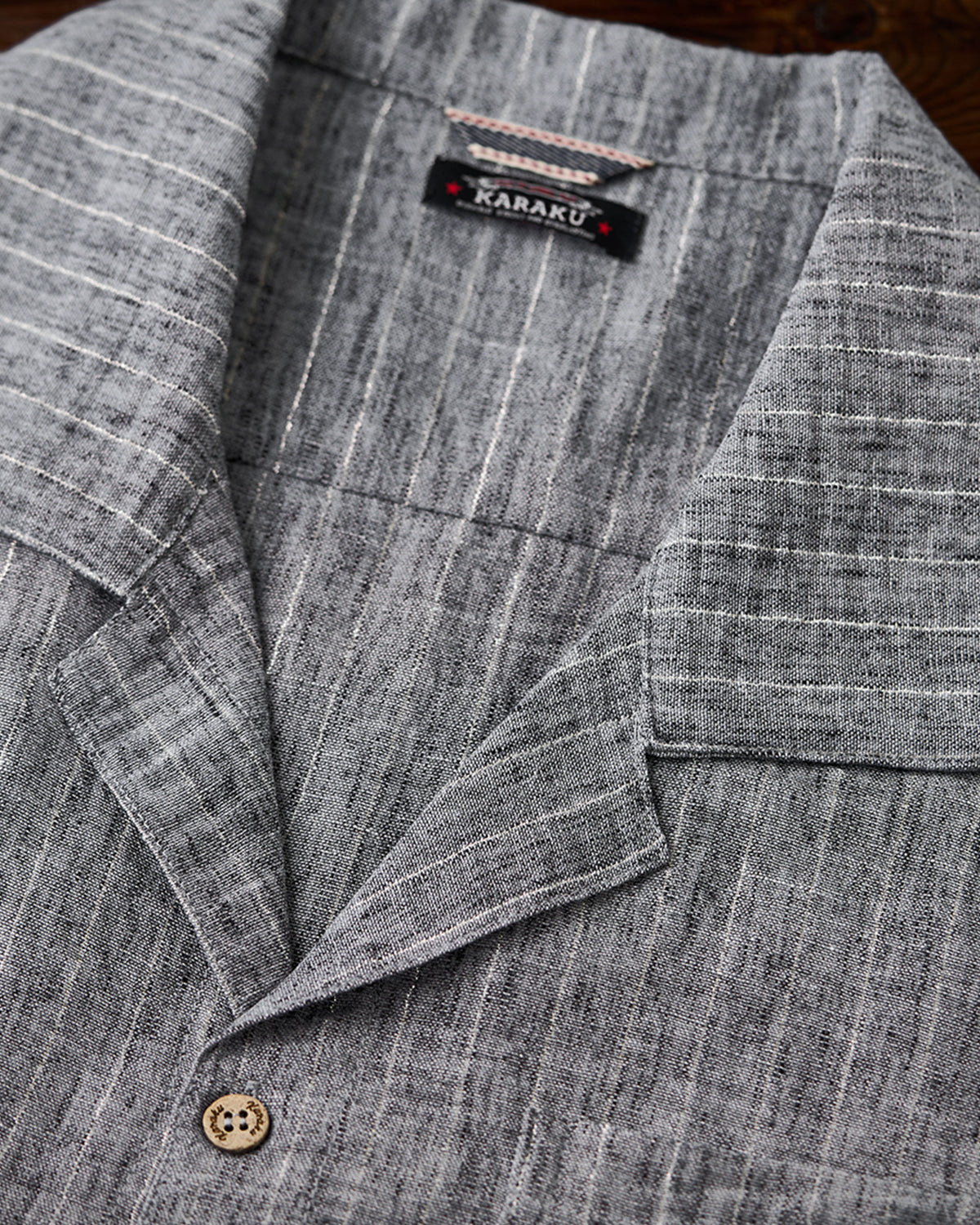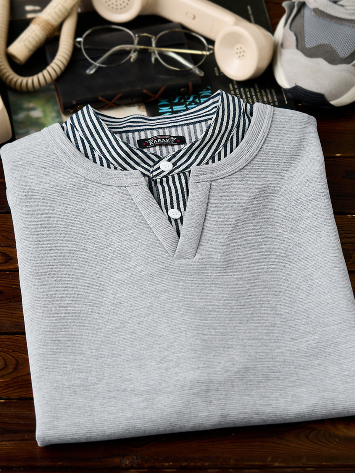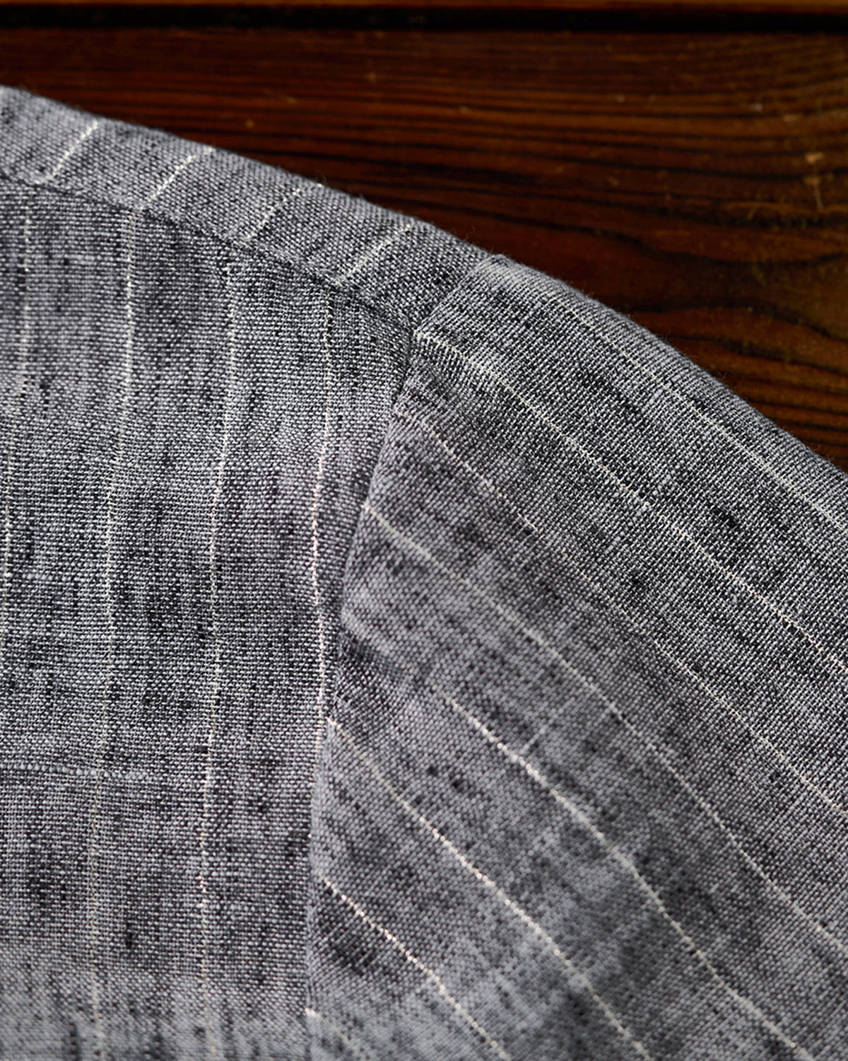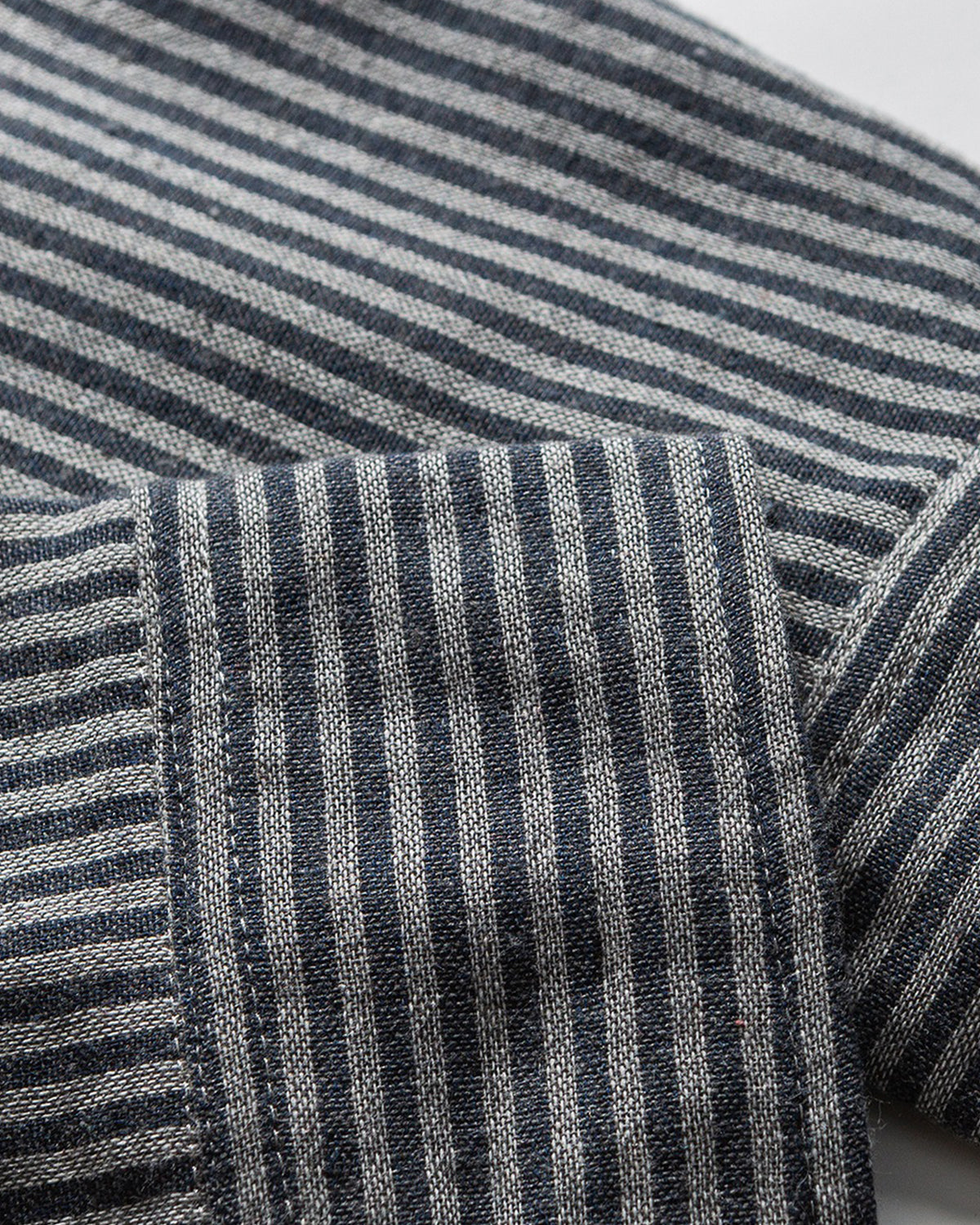It has no collar, giving it a casual look. The large pockets and color-coordinated buttons are also nice touches.