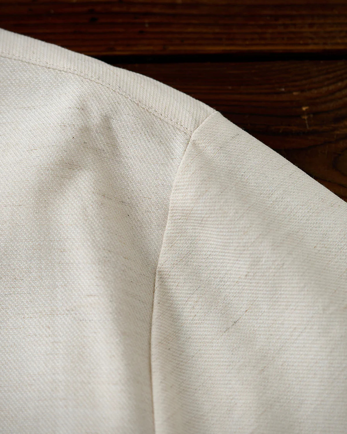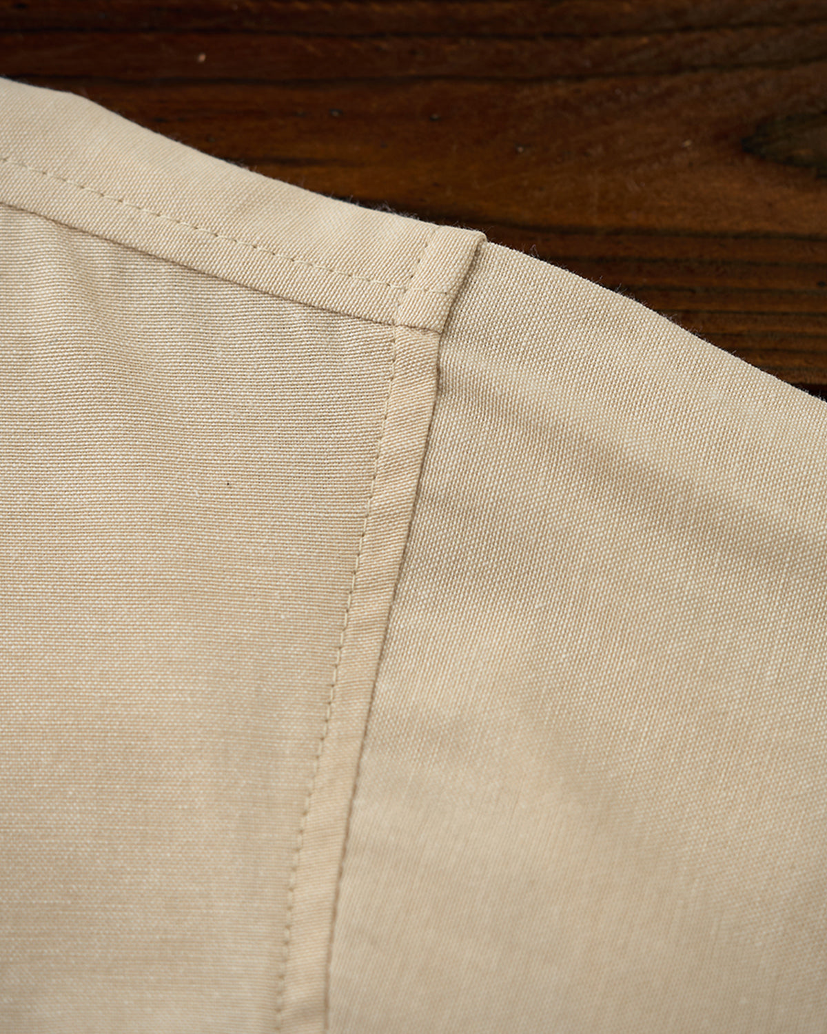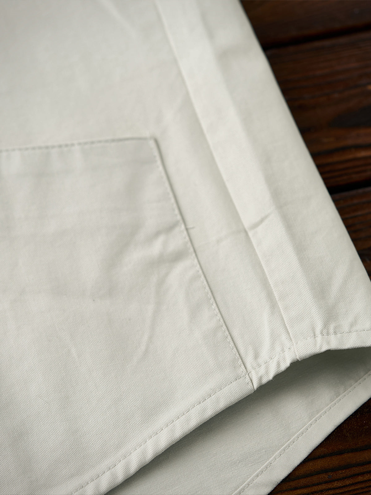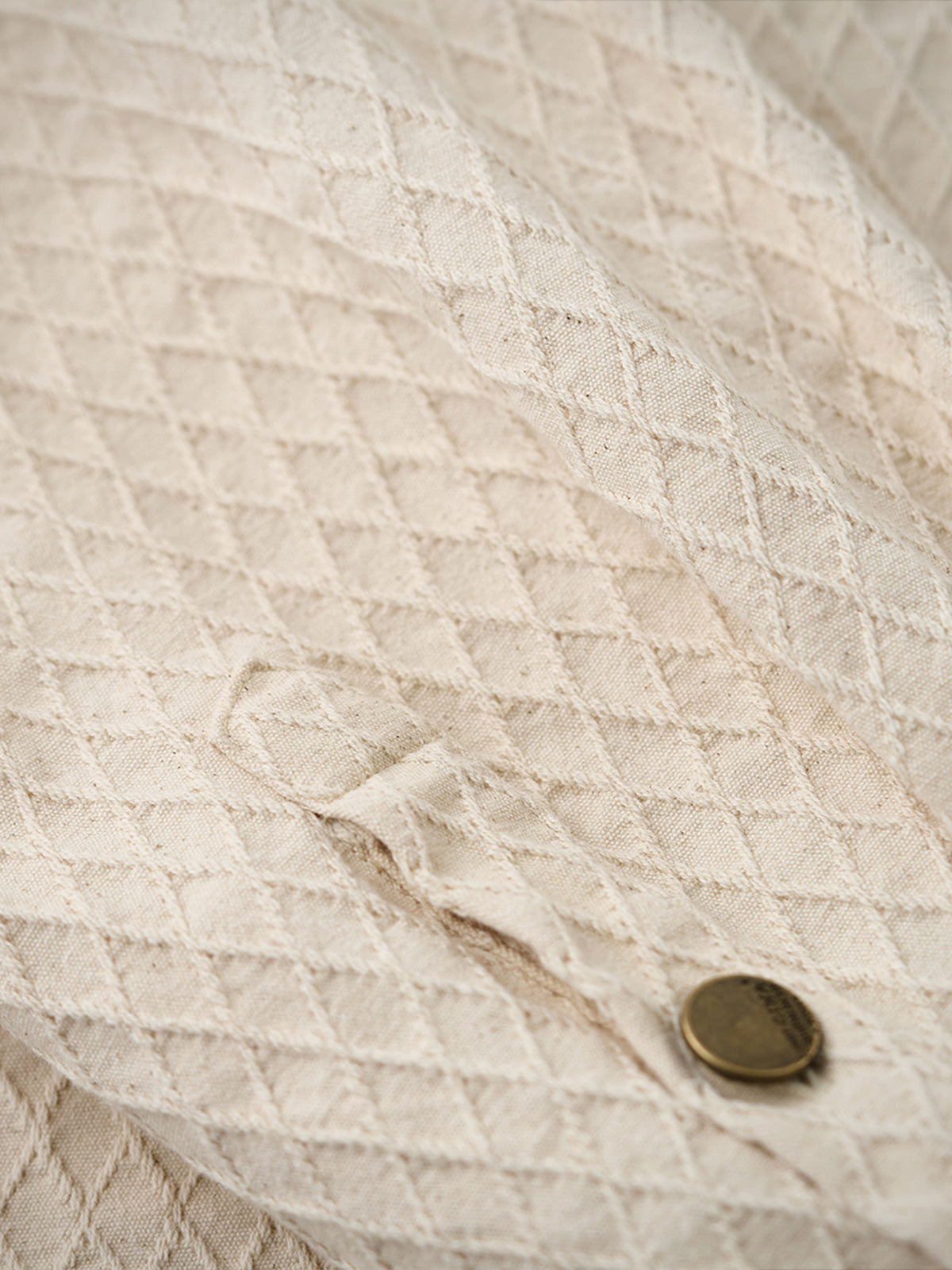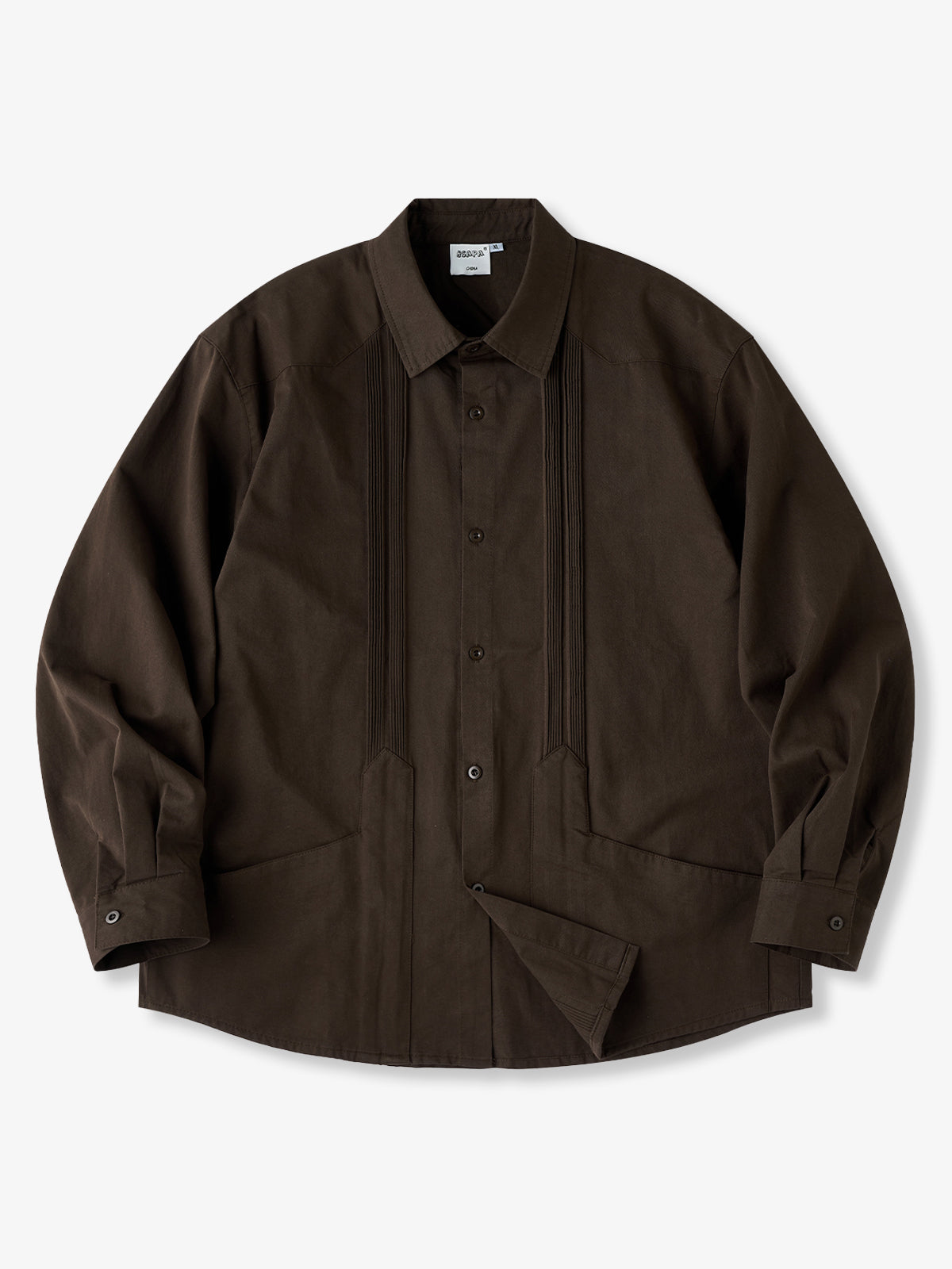 It has no collar, giving it a casual look. The large pockets and color-coordinated buttons are also nice touches.