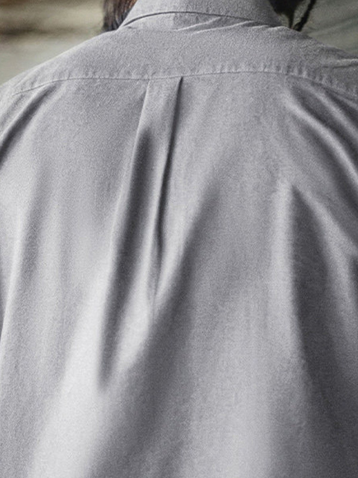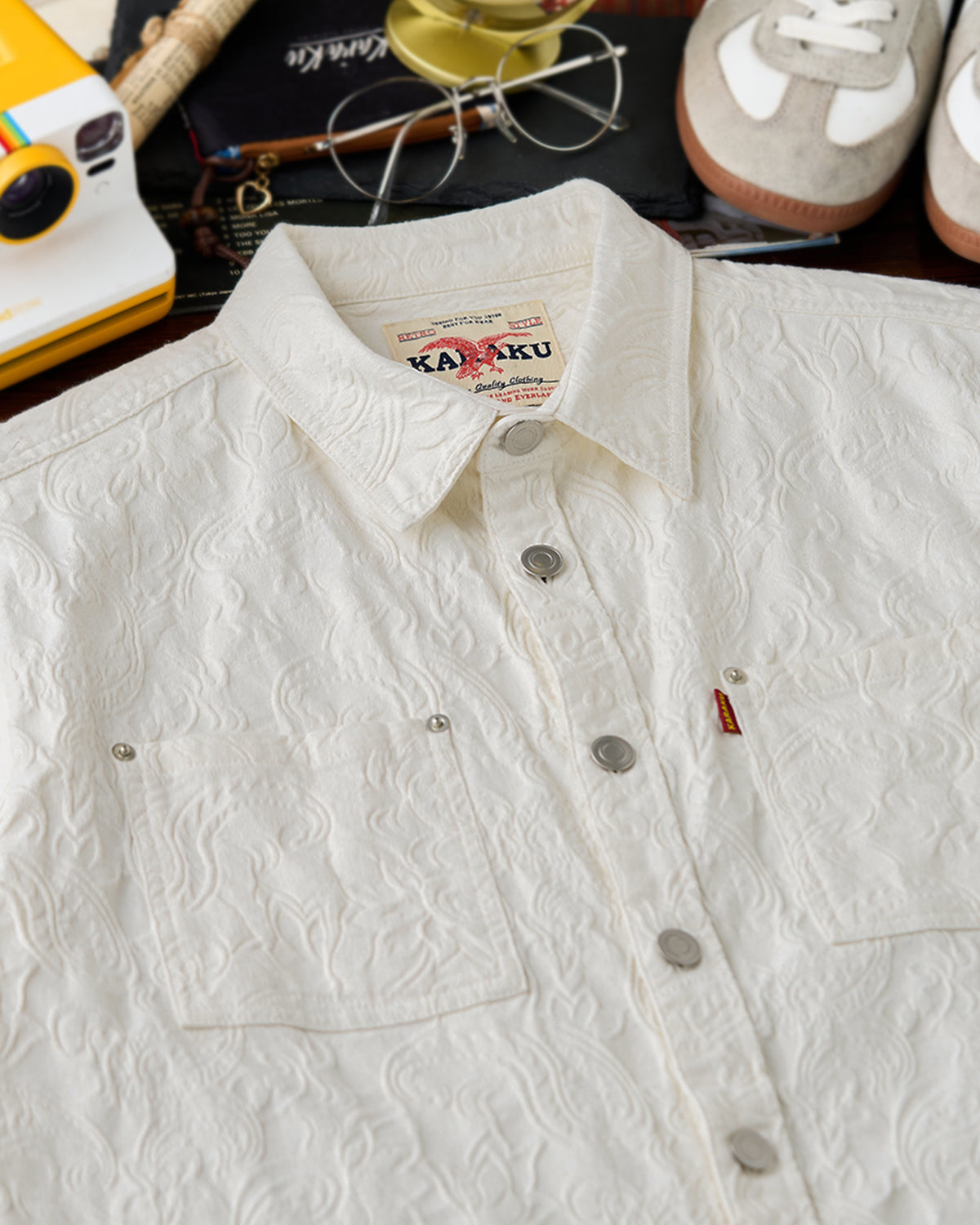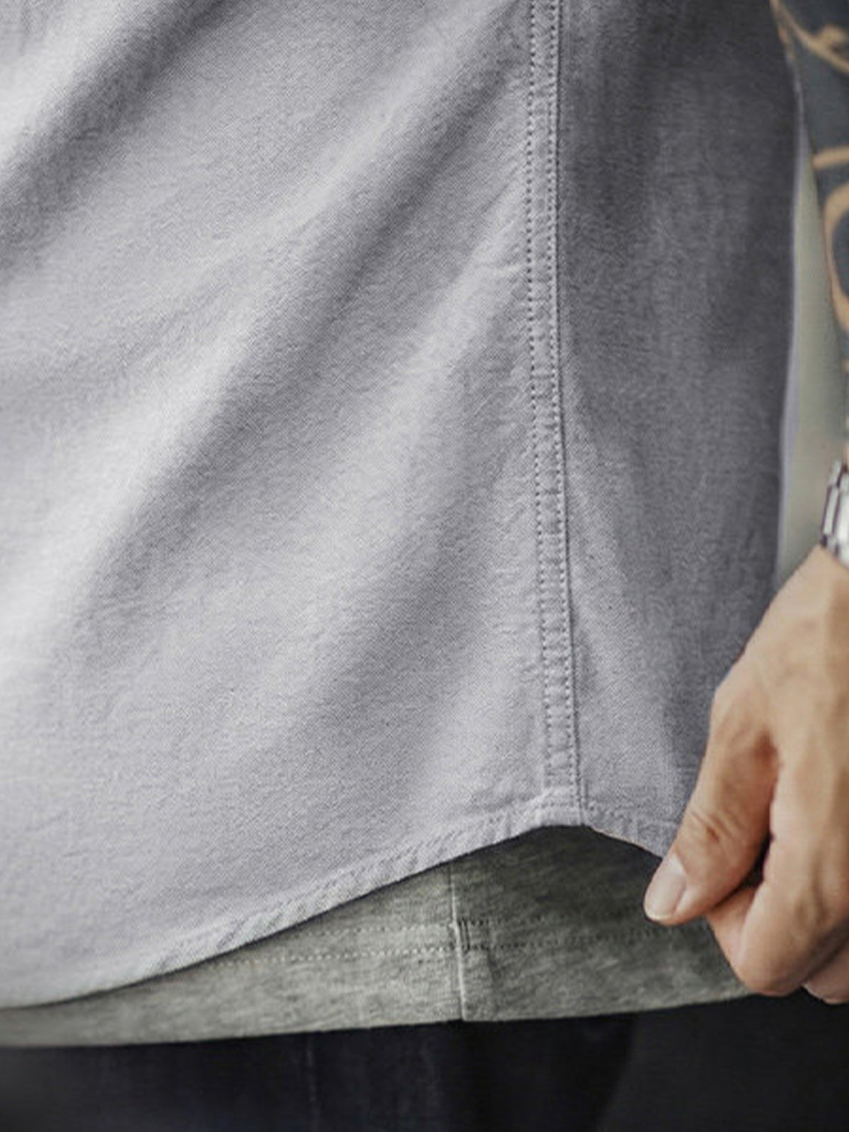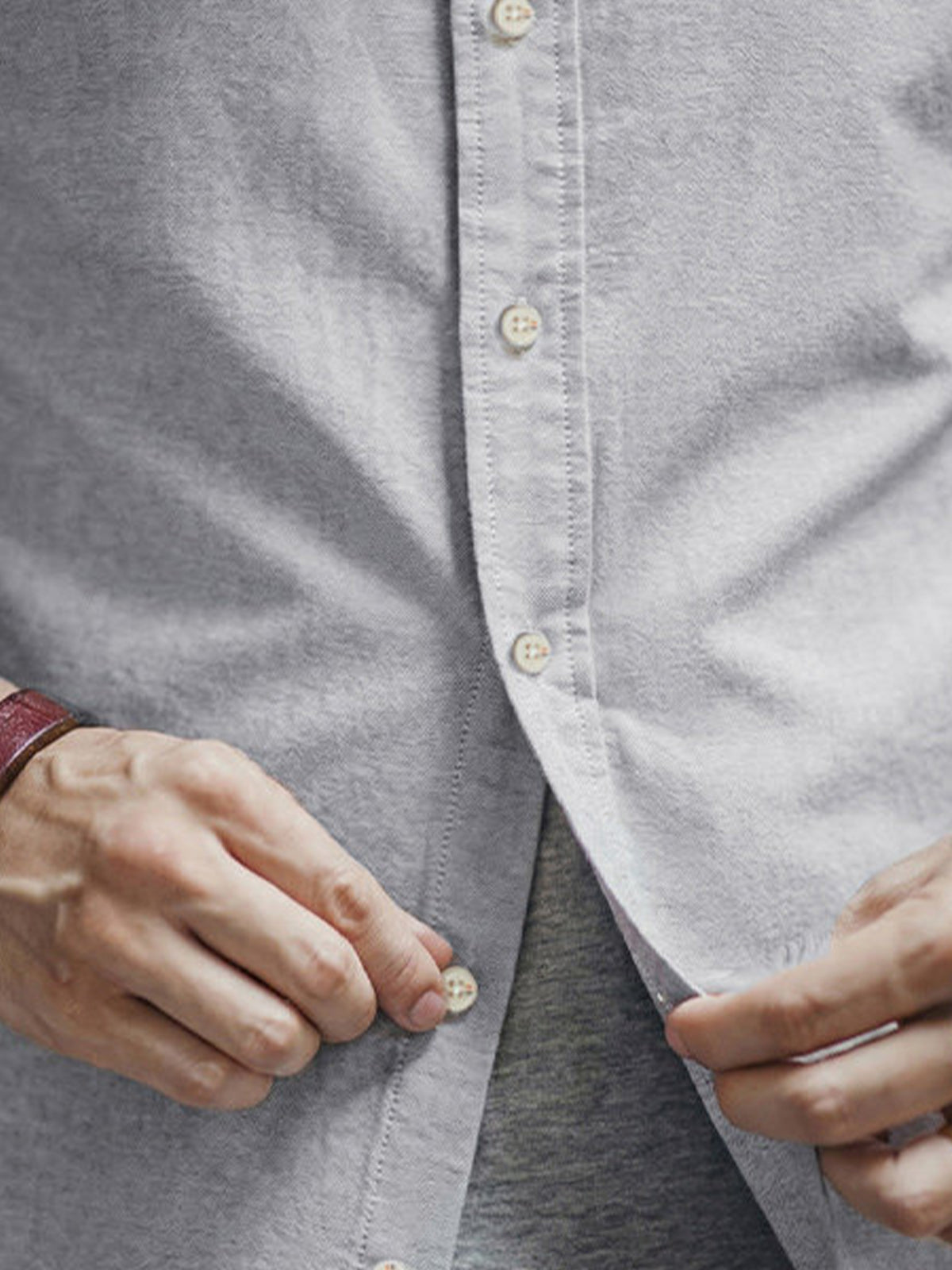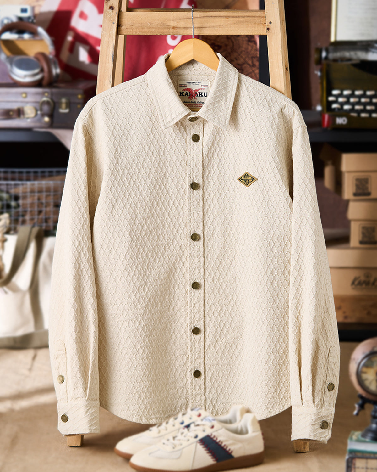 It has no collar, giving it a casual look. The large pockets and color-coordinated buttons are also nice touches.