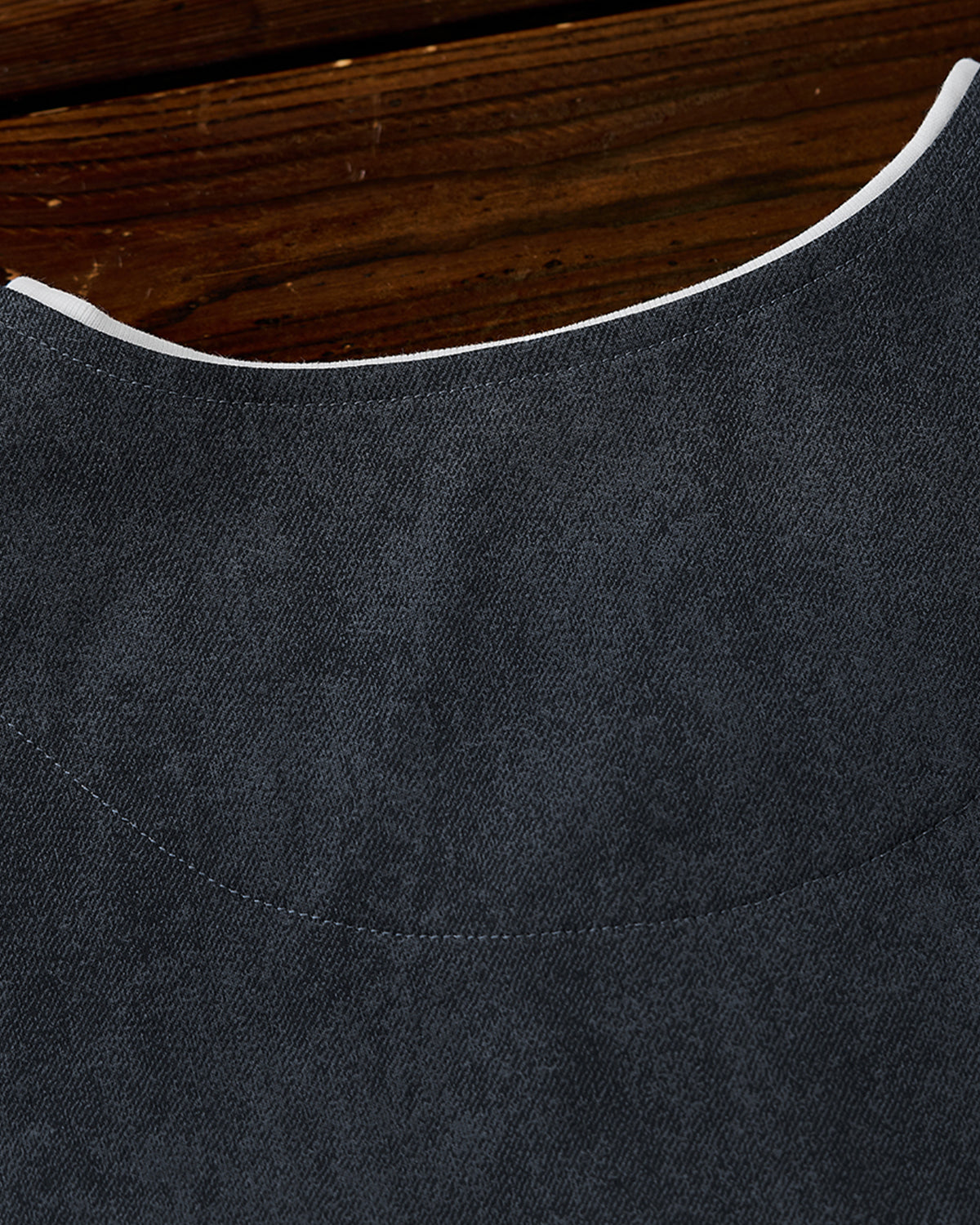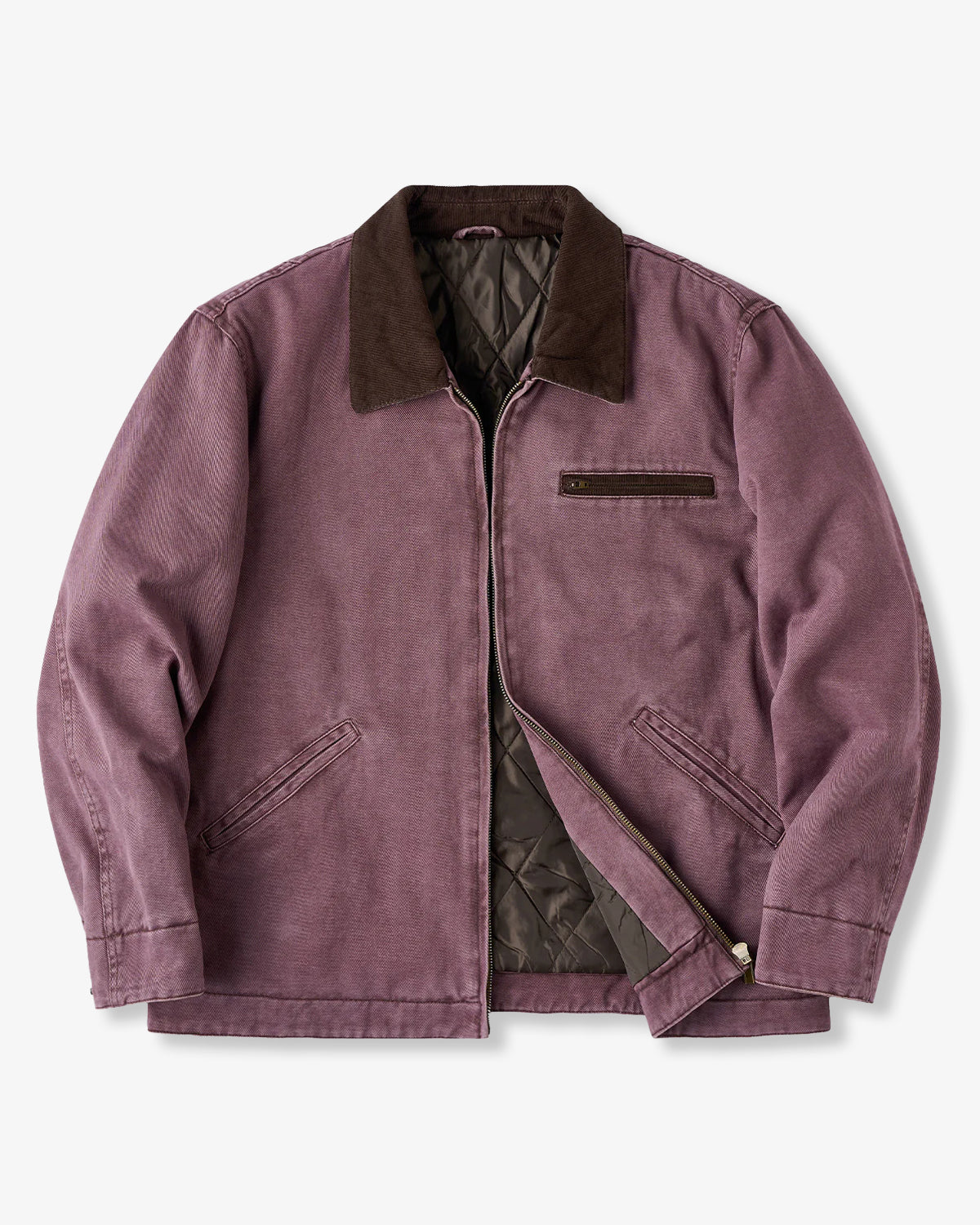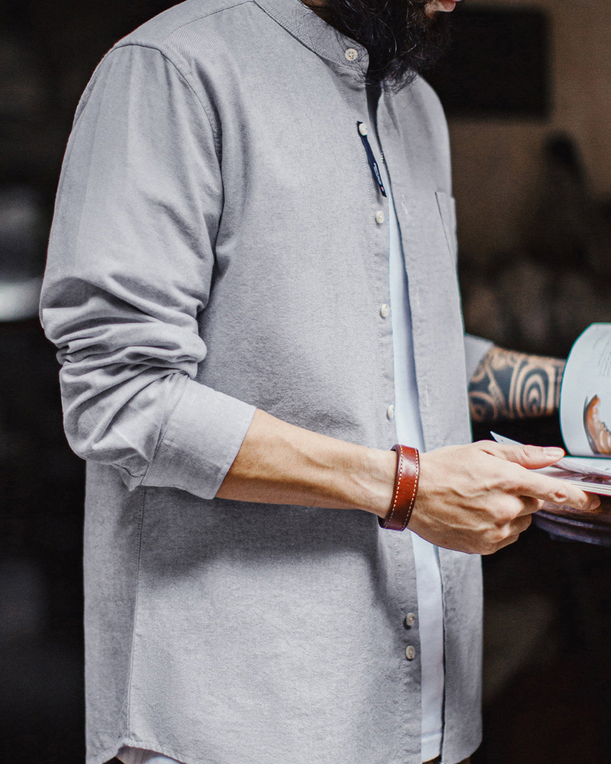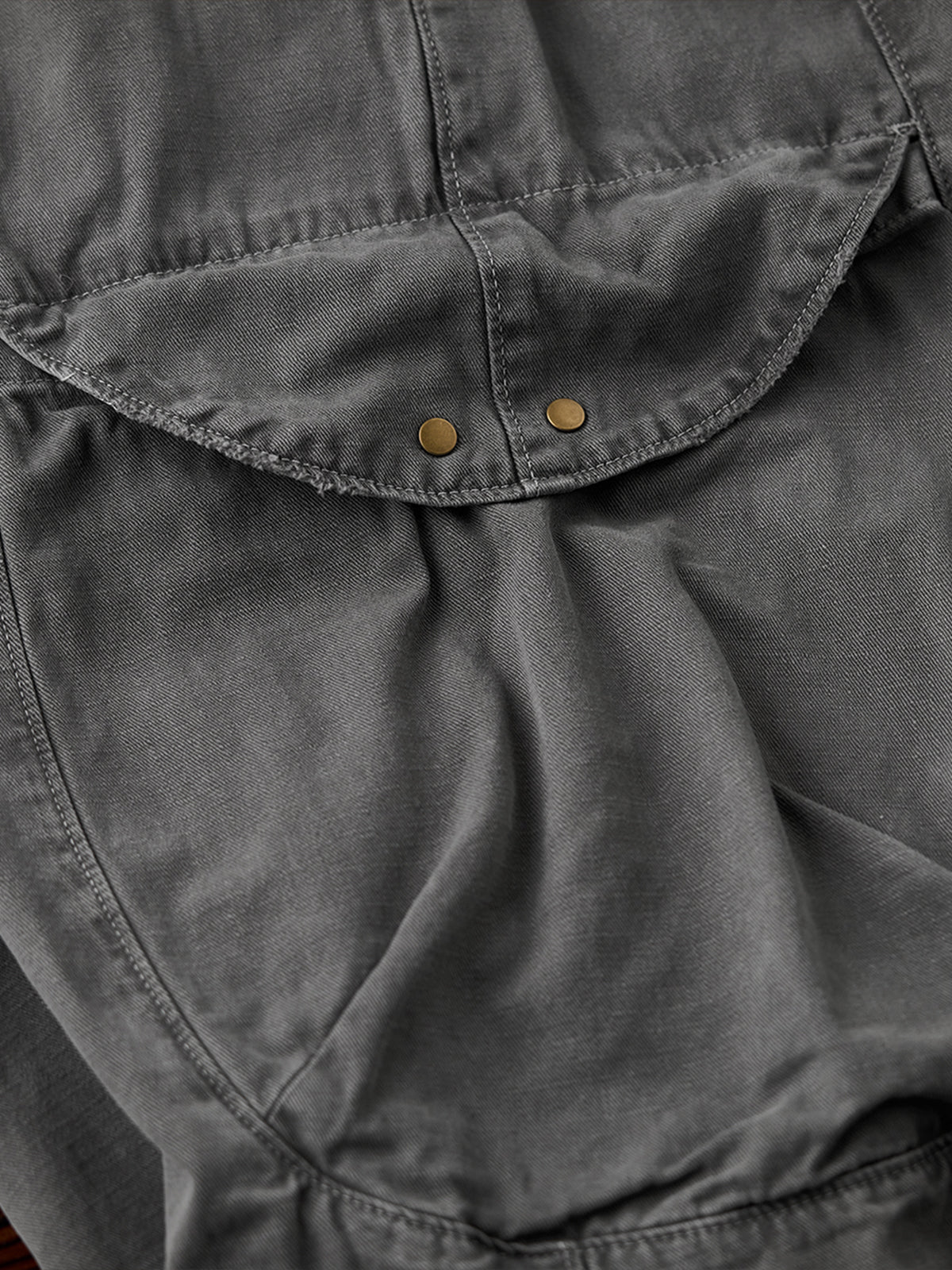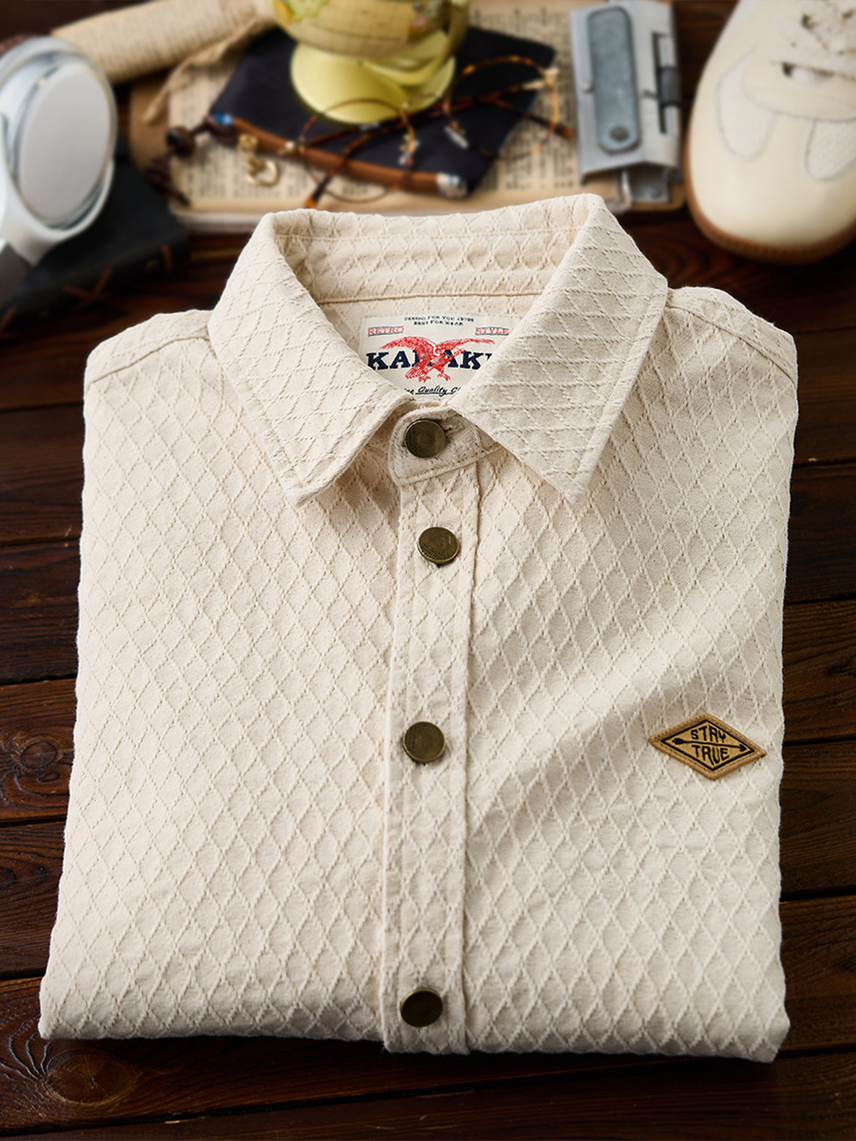 It has no collar, giving it a casual look. The large pockets and color-coordinated buttons are also nice touches.