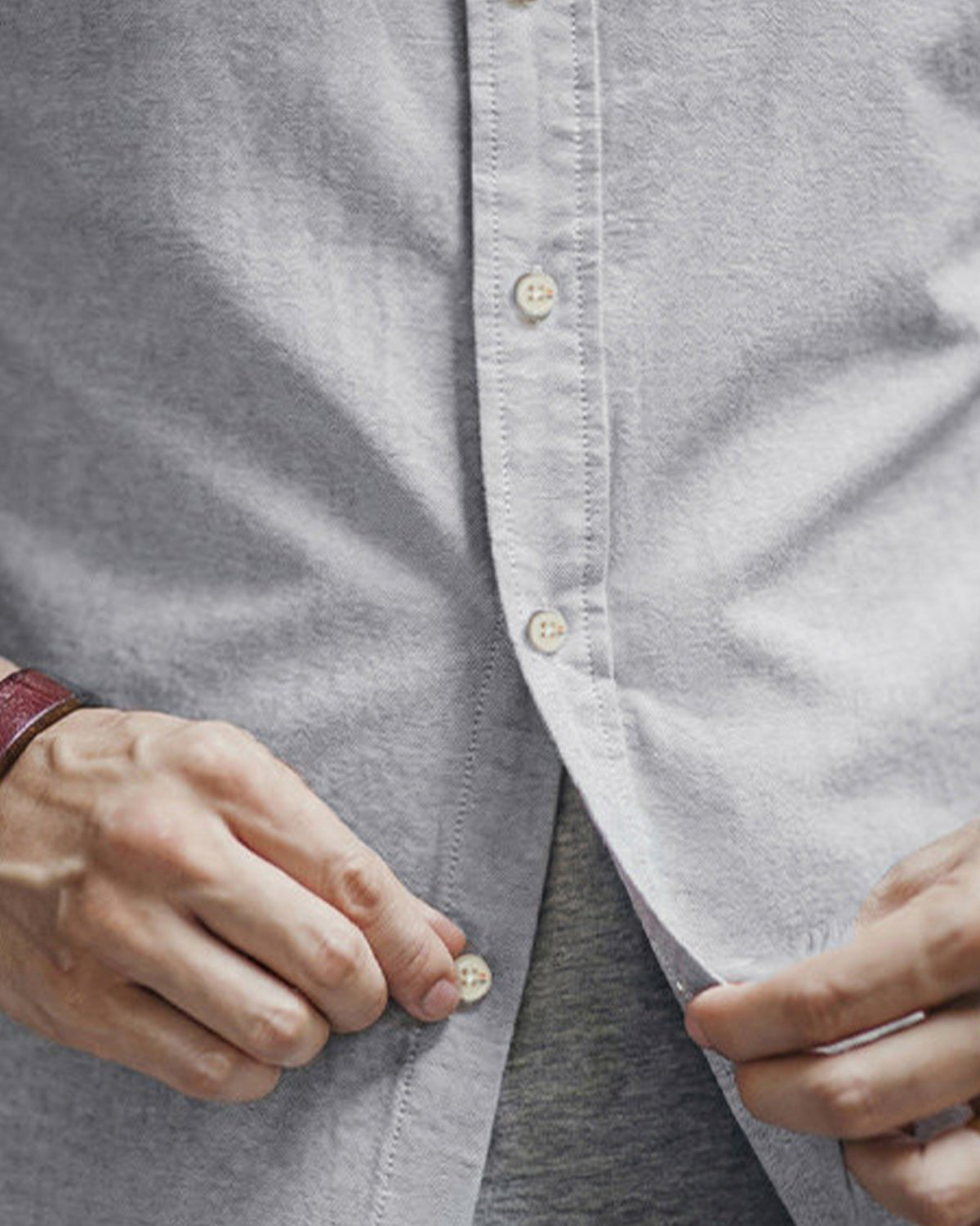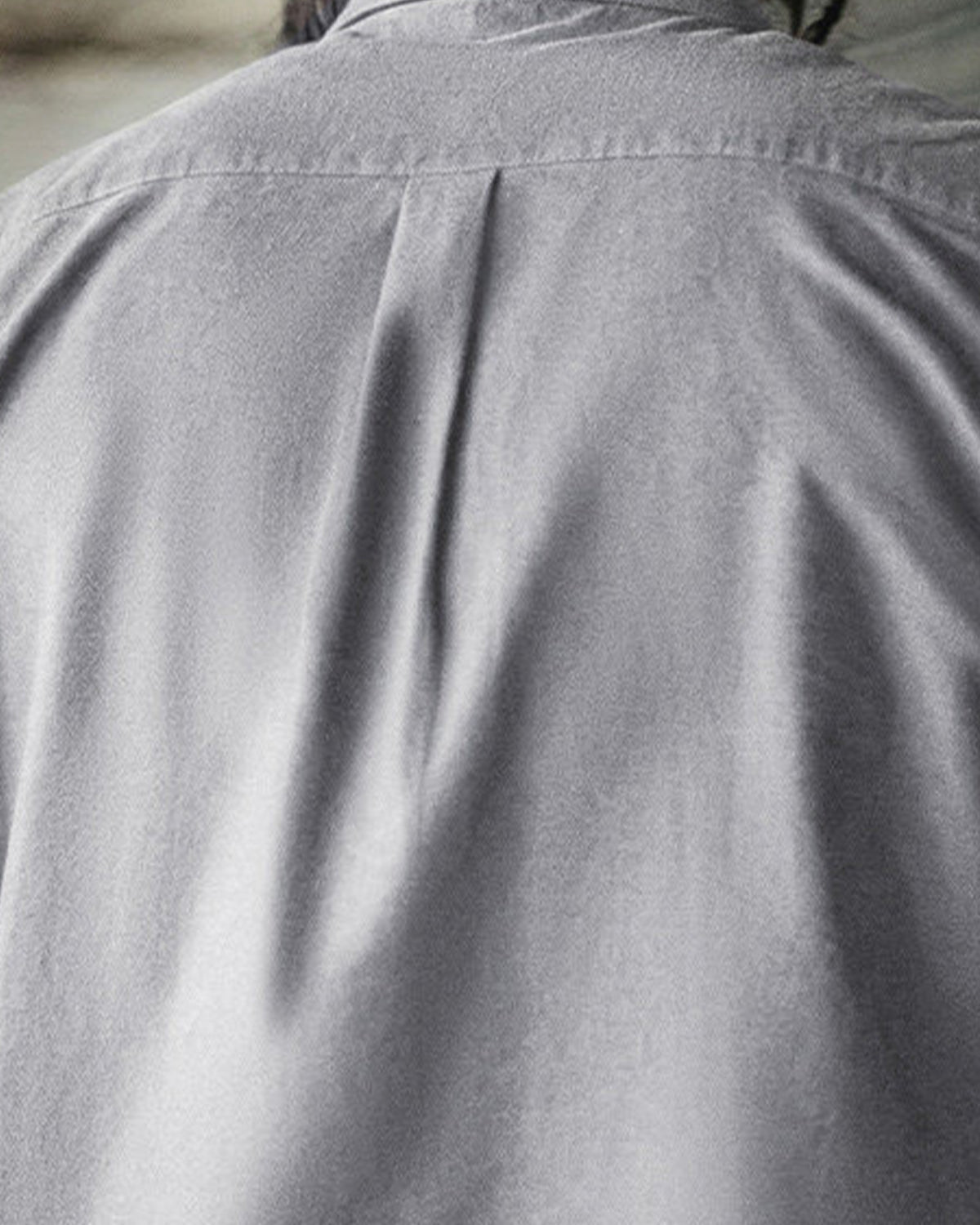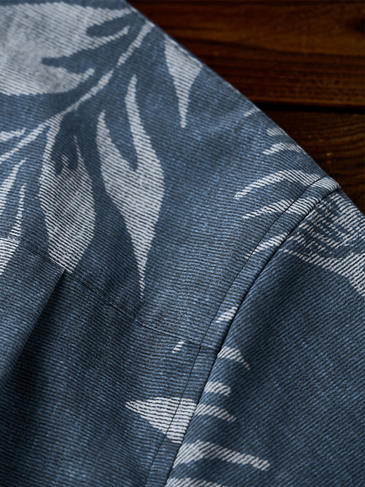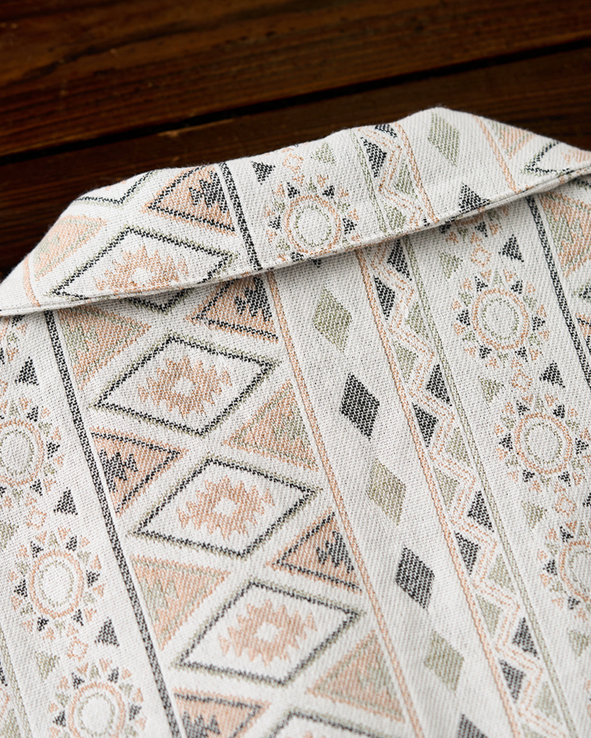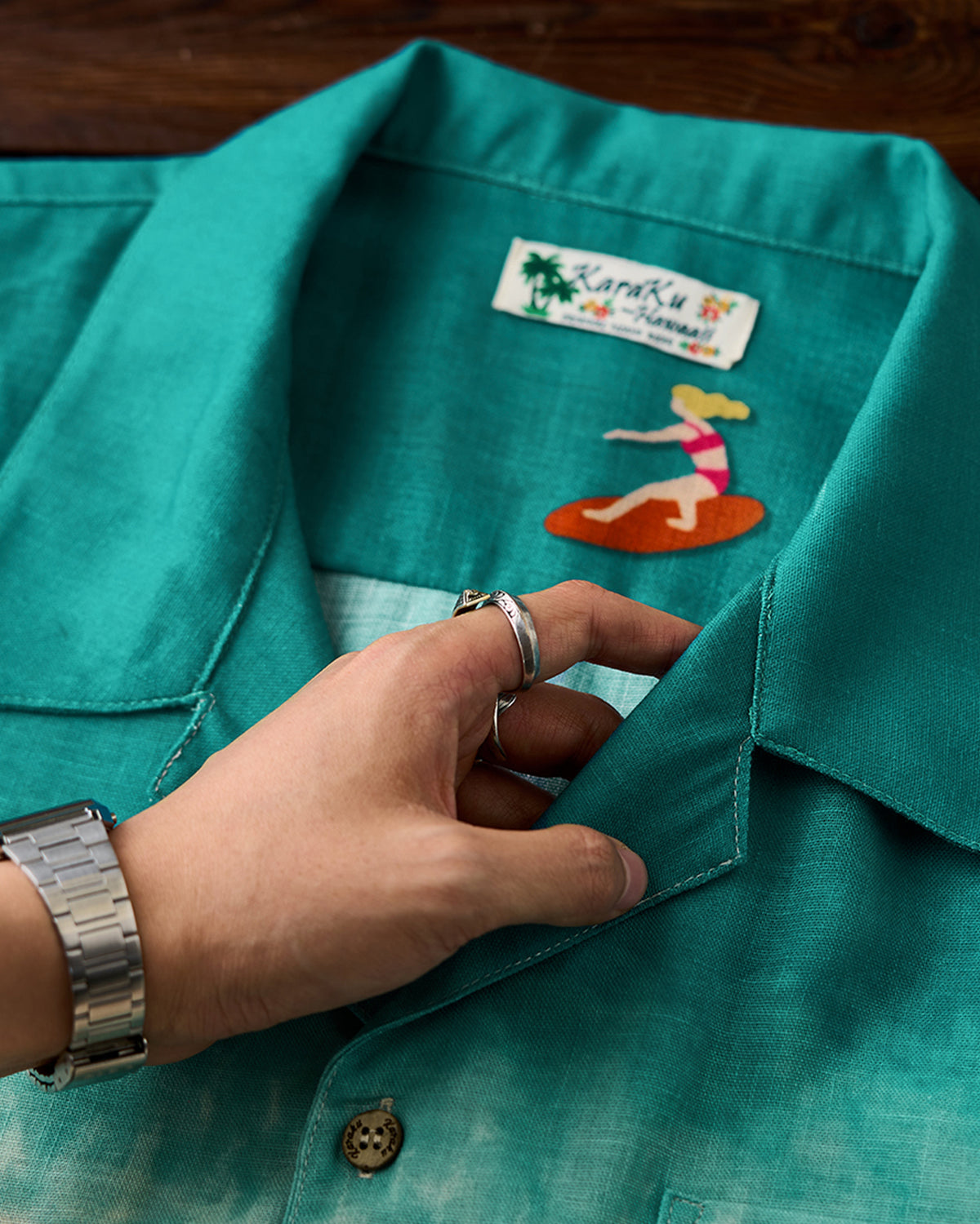 It has no collar, giving it a casual look. The large pockets and color-coordinated buttons are also nice touches.