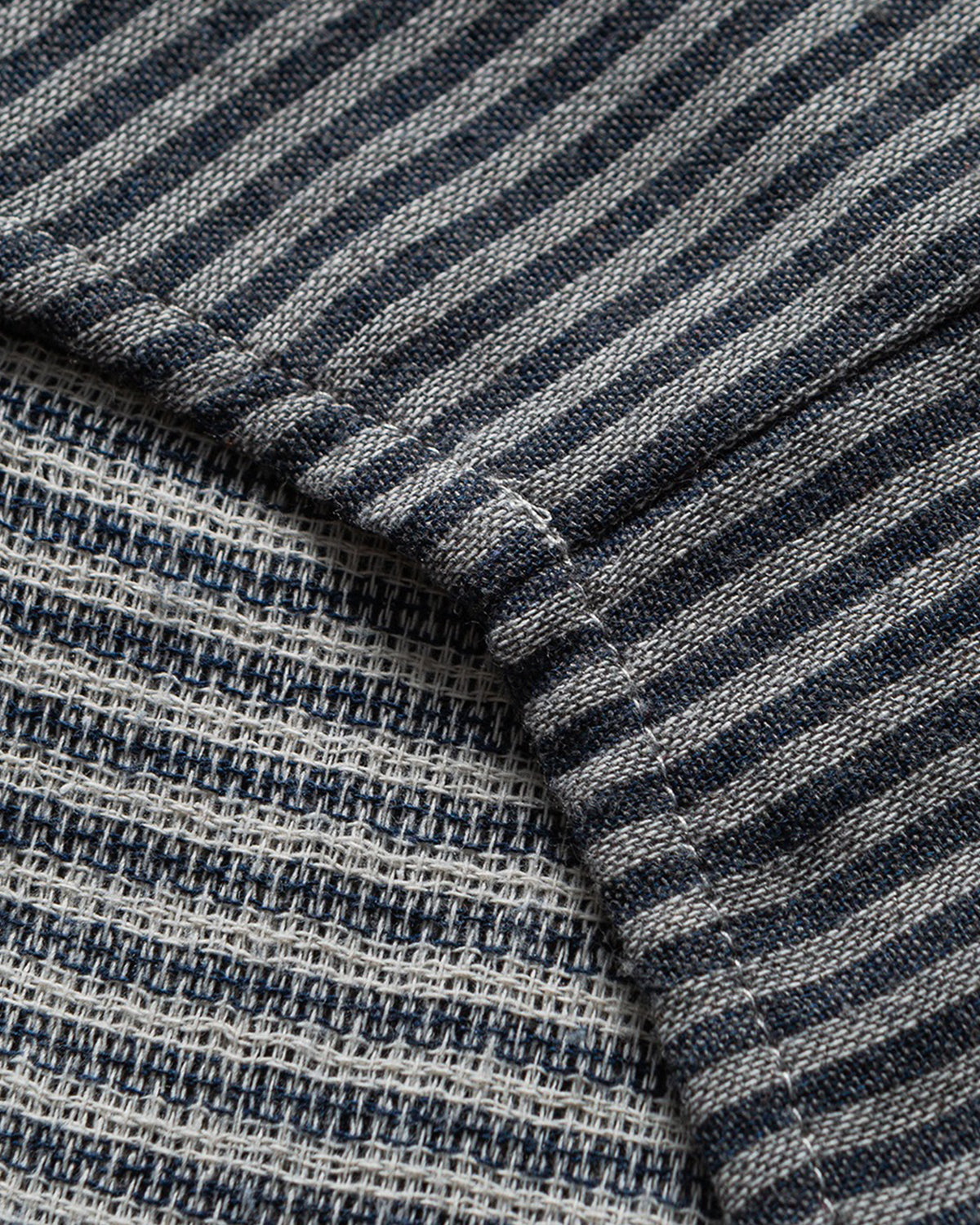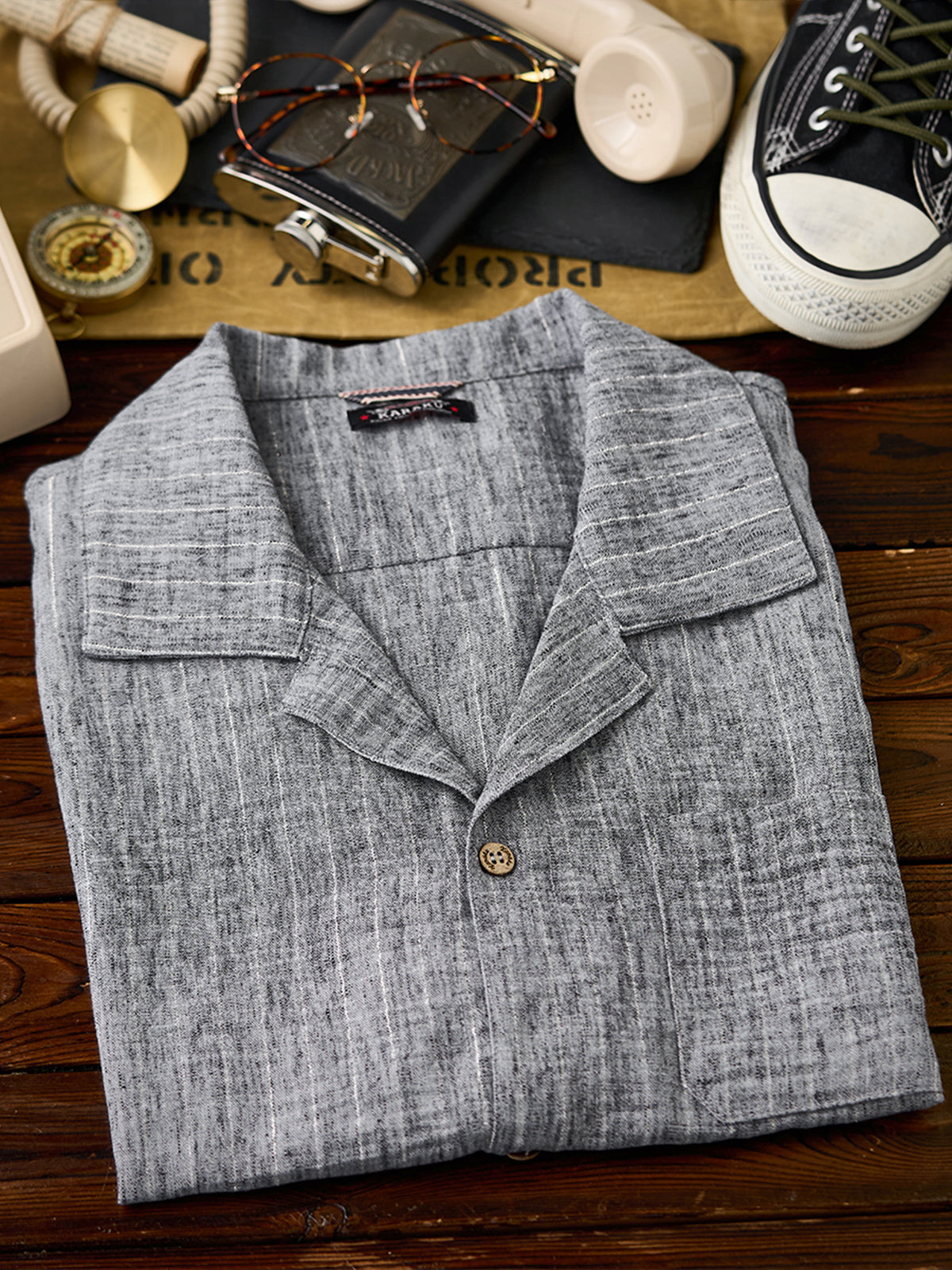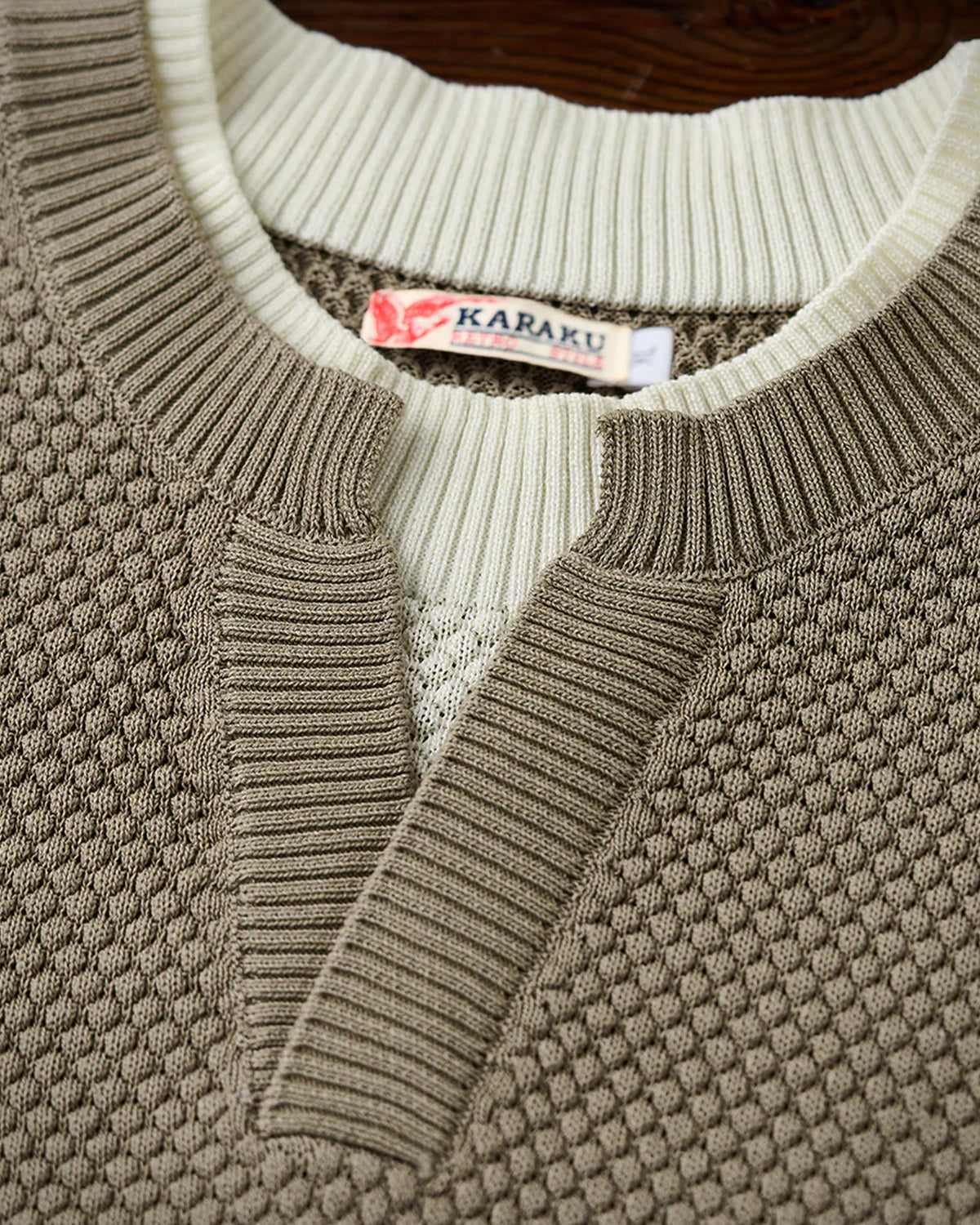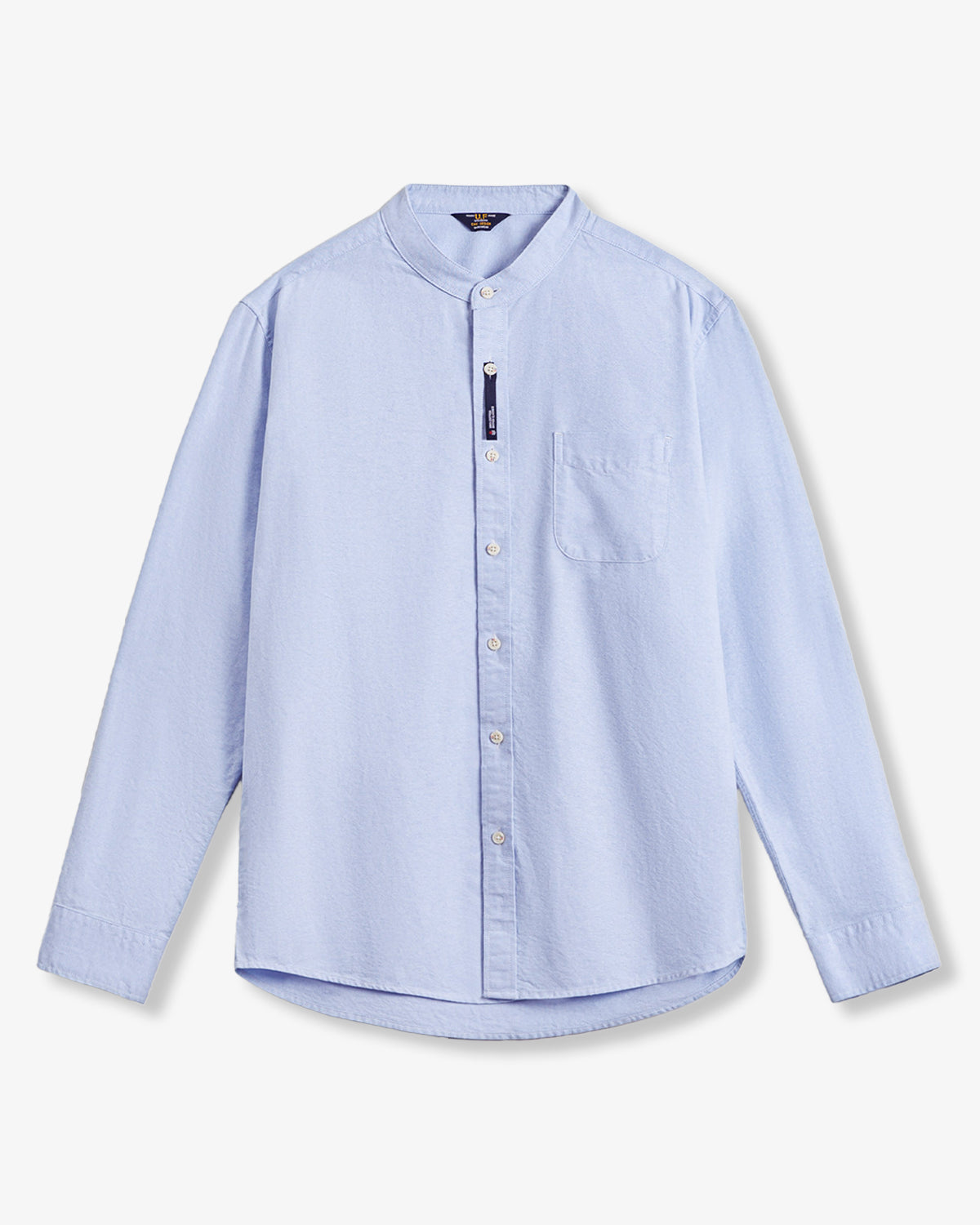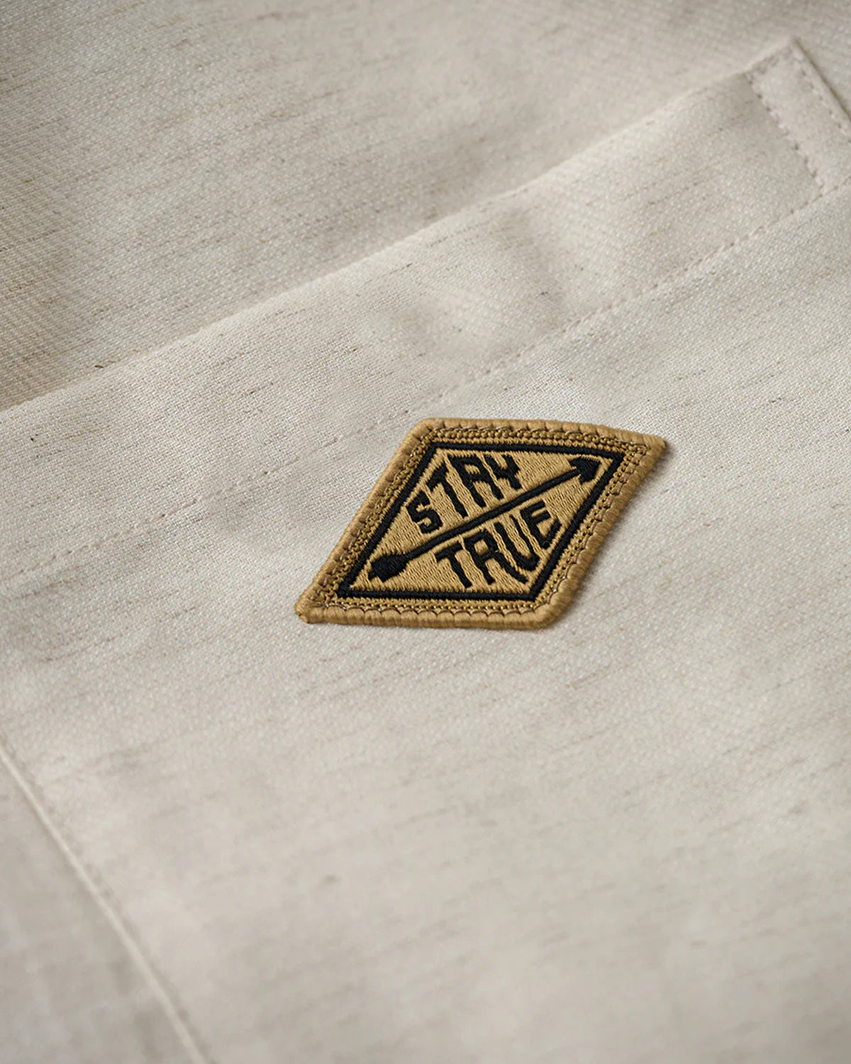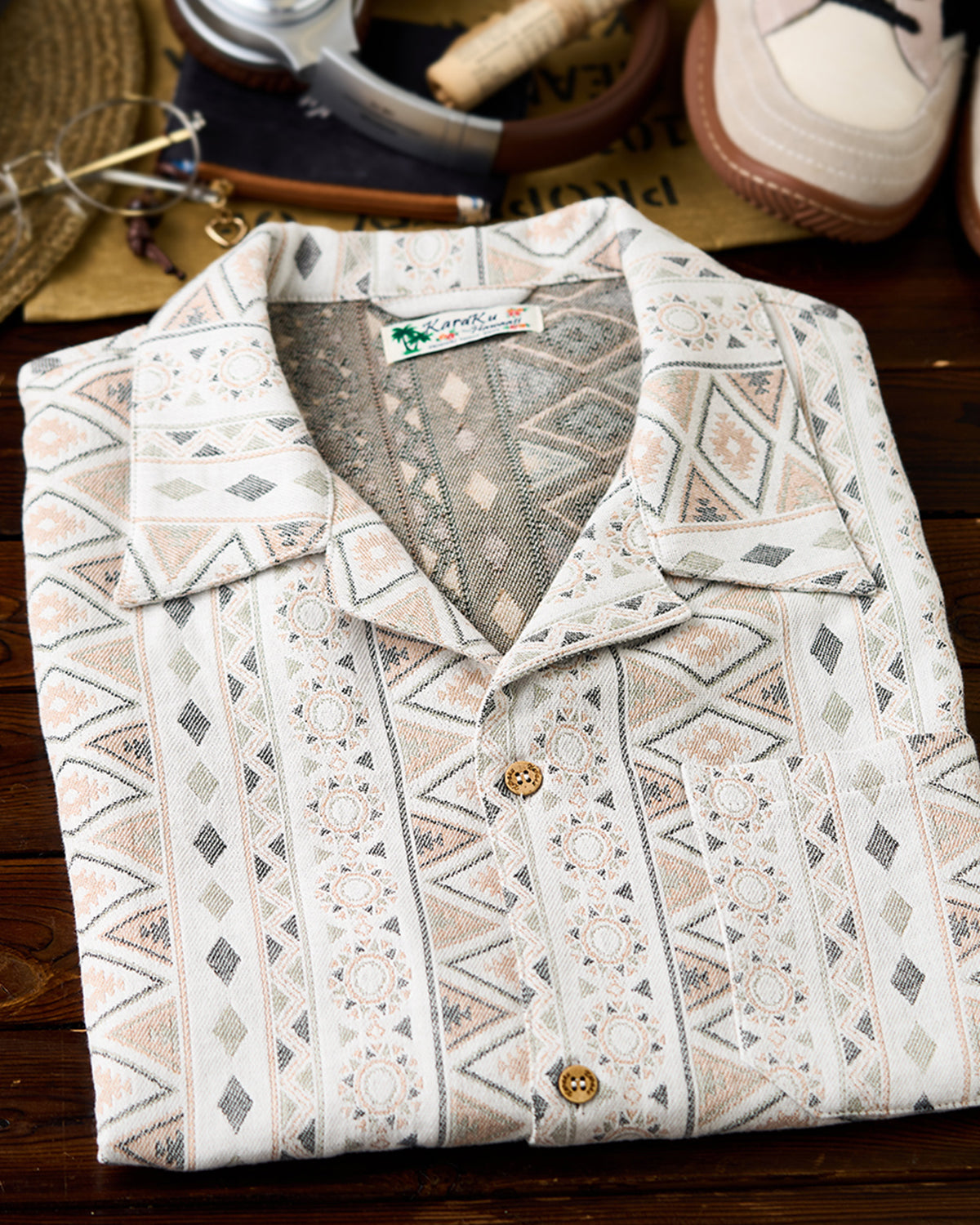 It has no collar, giving it a casual look. The large pockets and color-coordinated buttons are also nice touches.