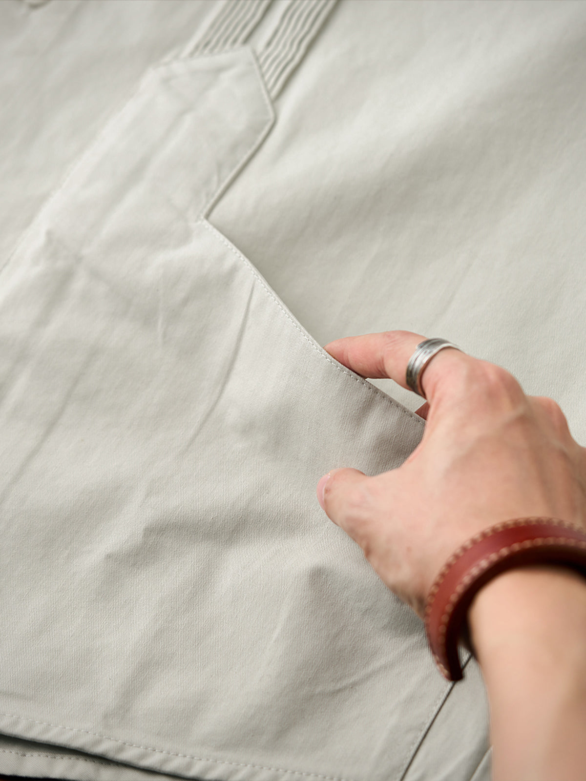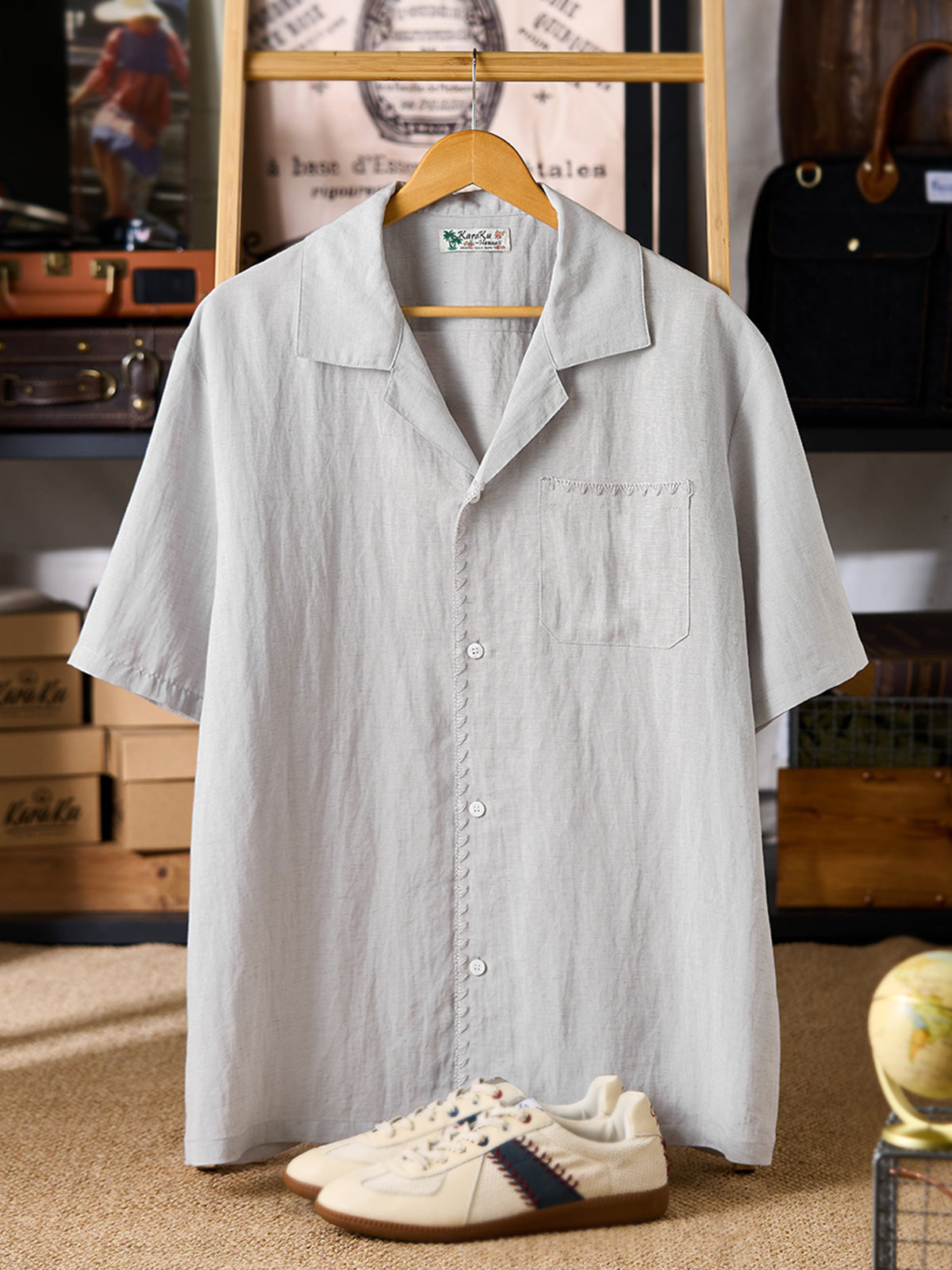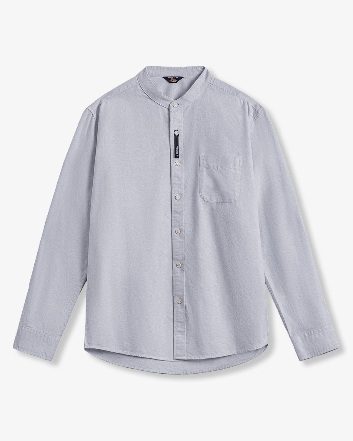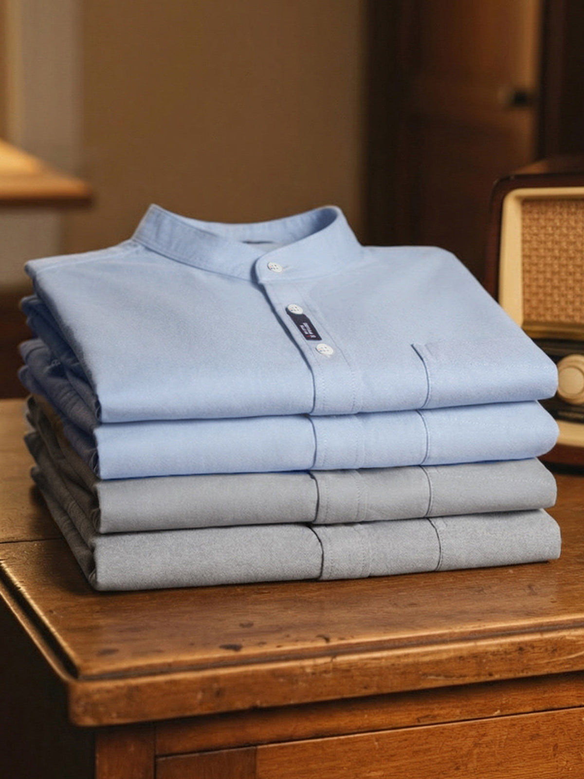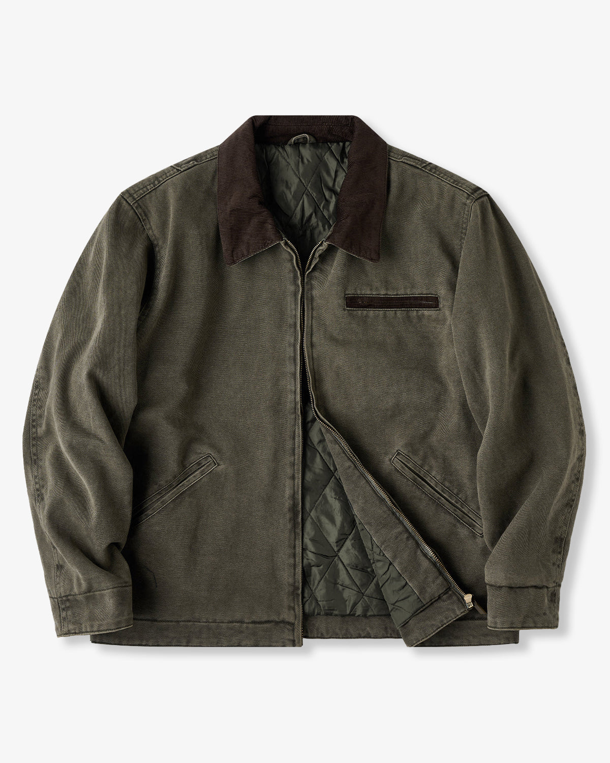 It has no collar, giving it a casual look. The large pockets and color-coordinated buttons are also nice touches.