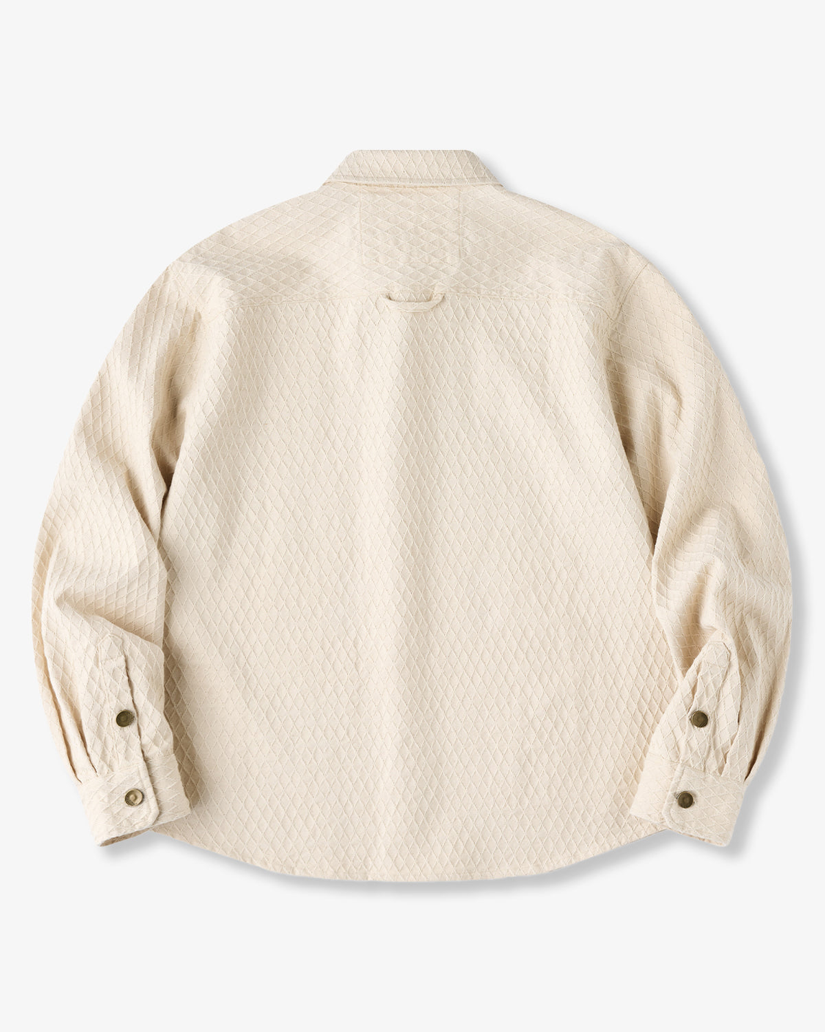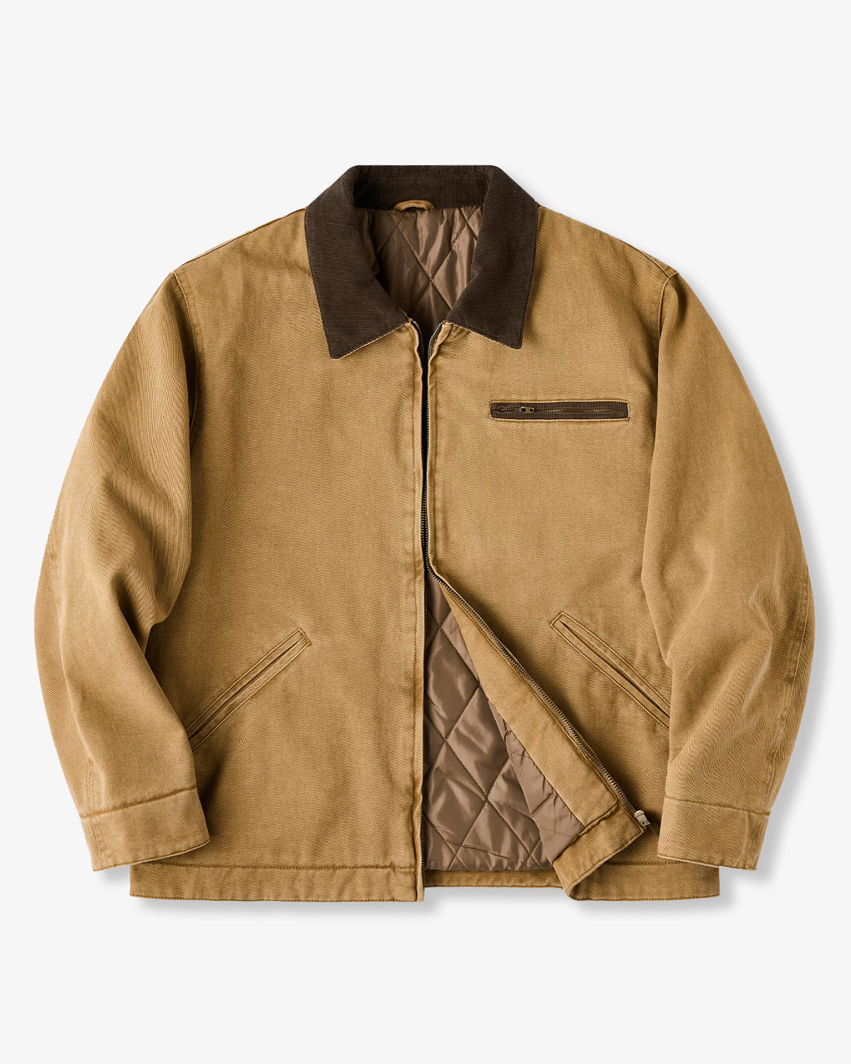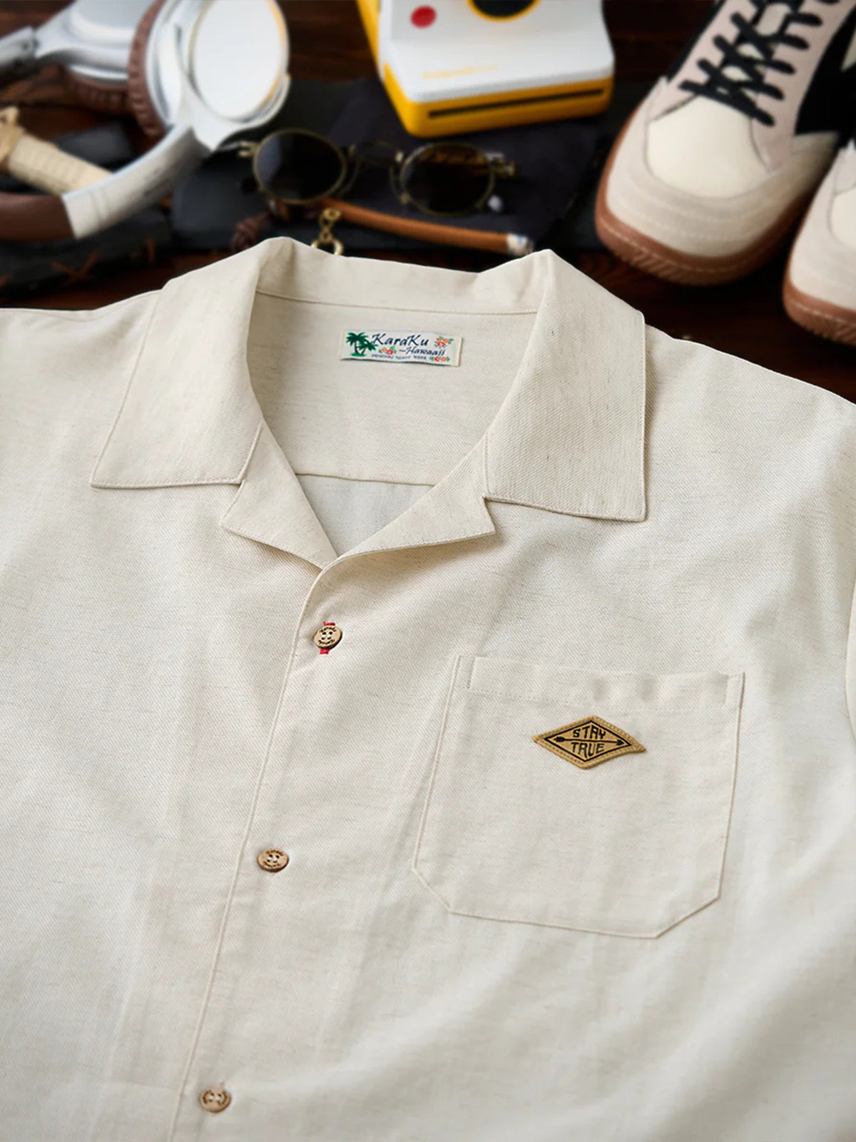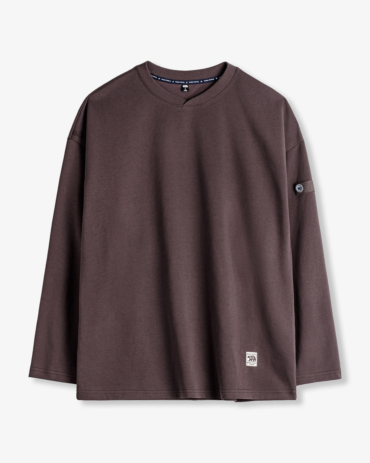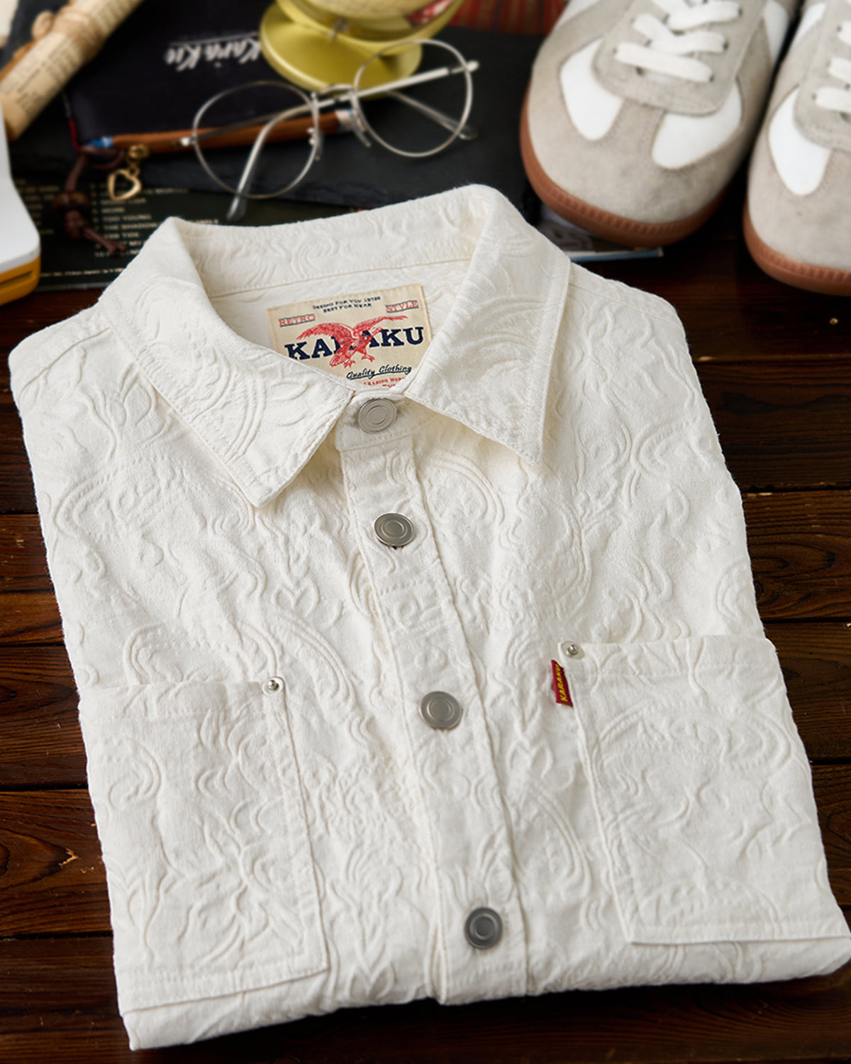 It has no collar, giving it a casual look. The large pockets and color-coordinated buttons are also nice touches.