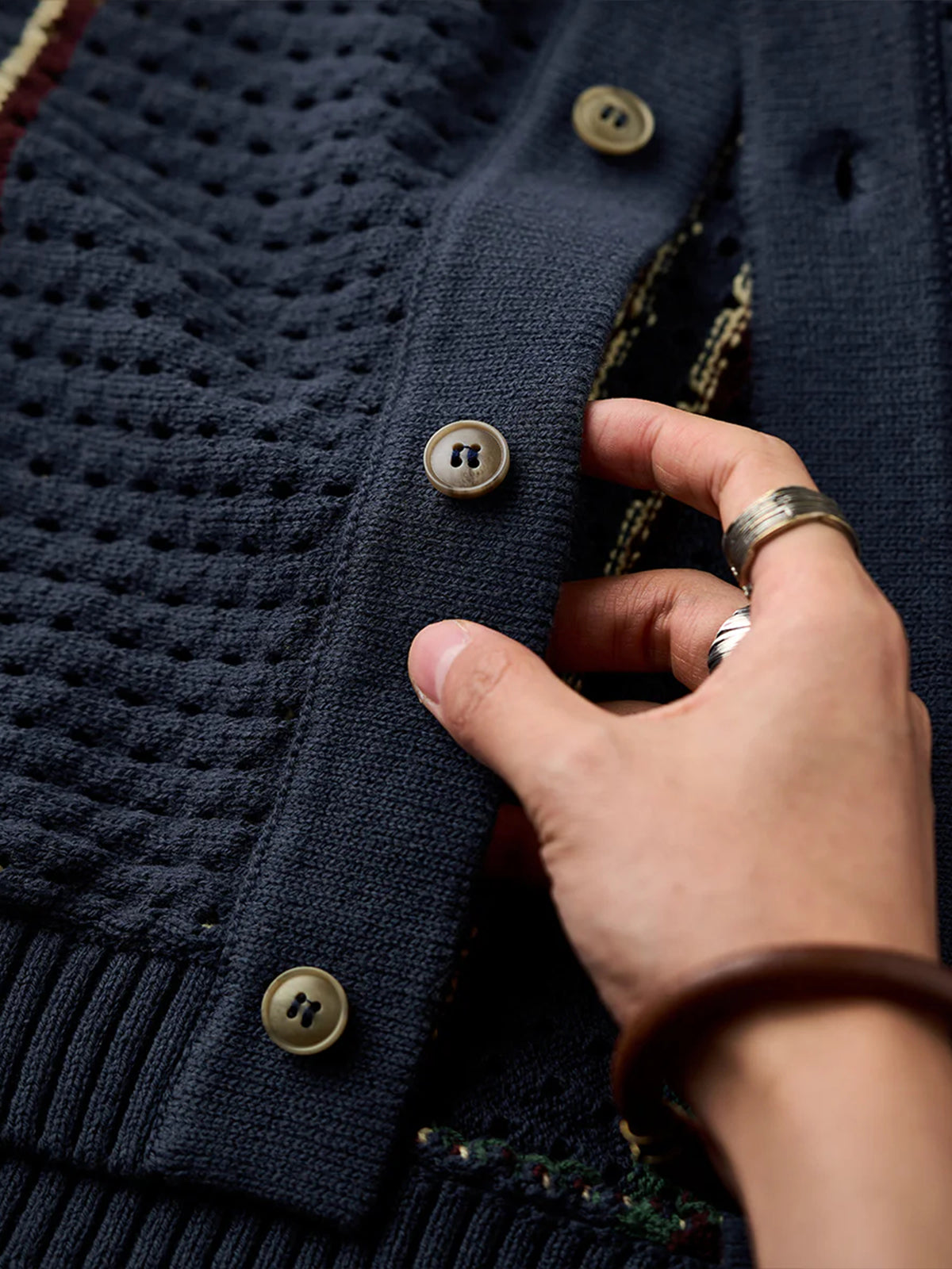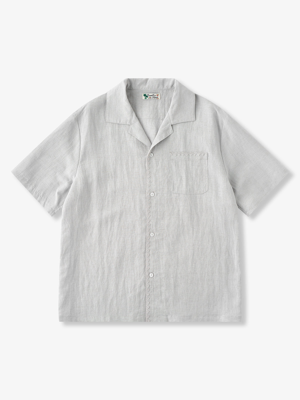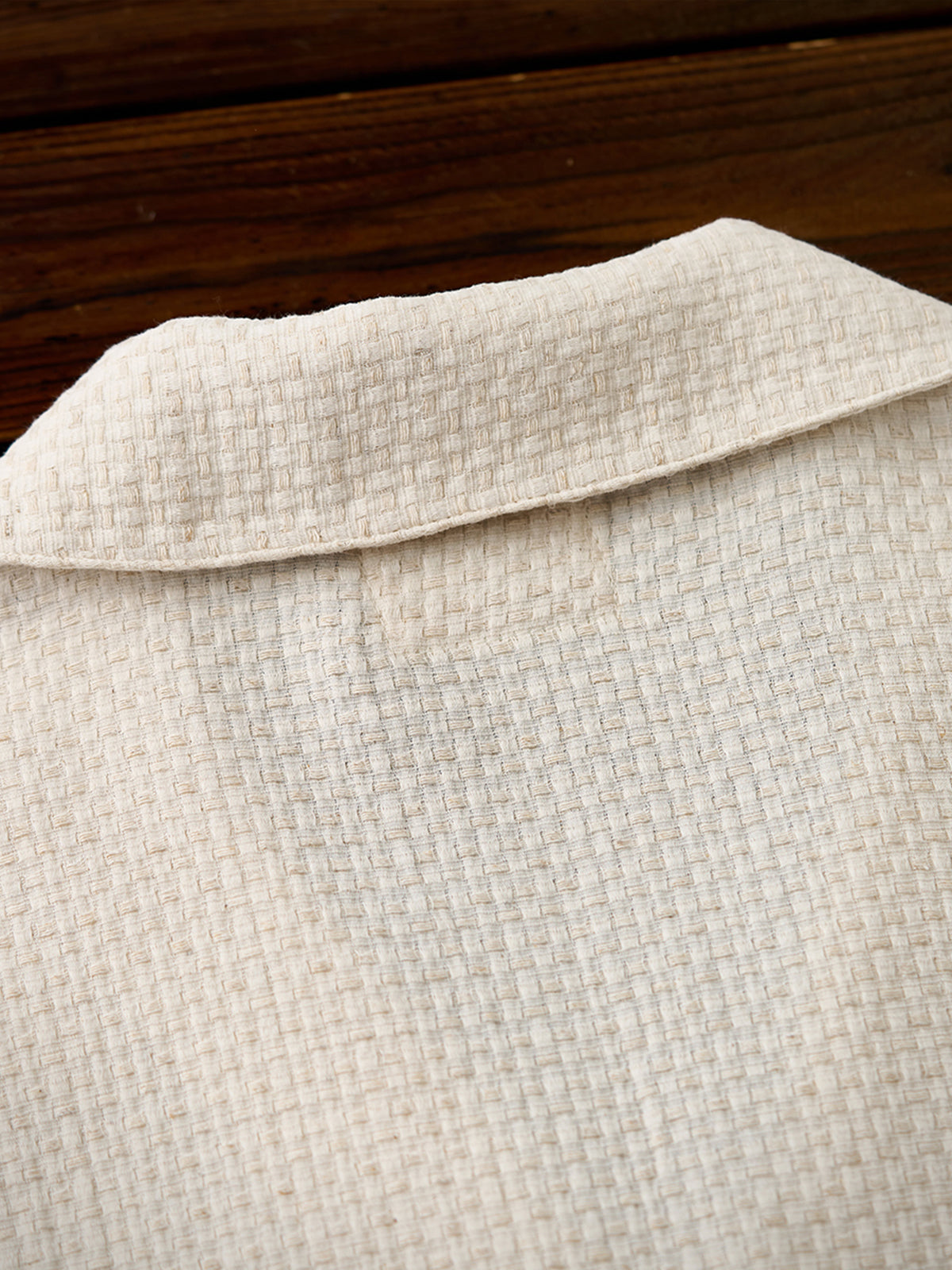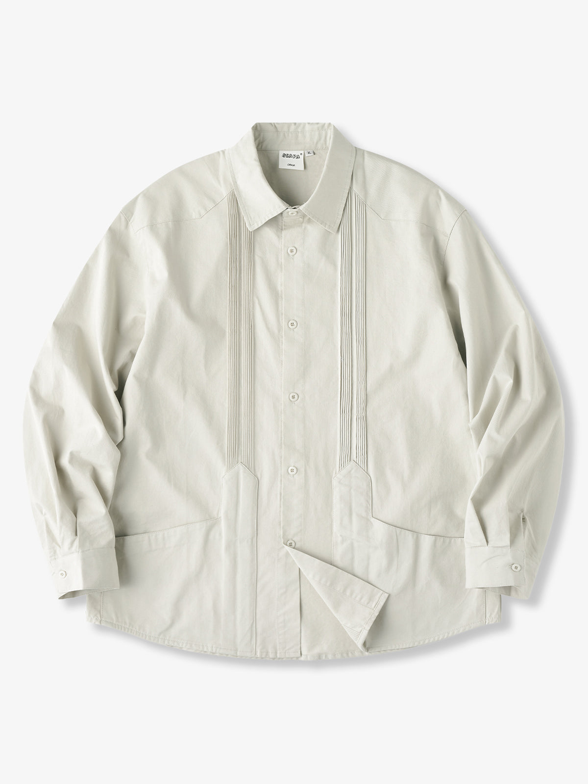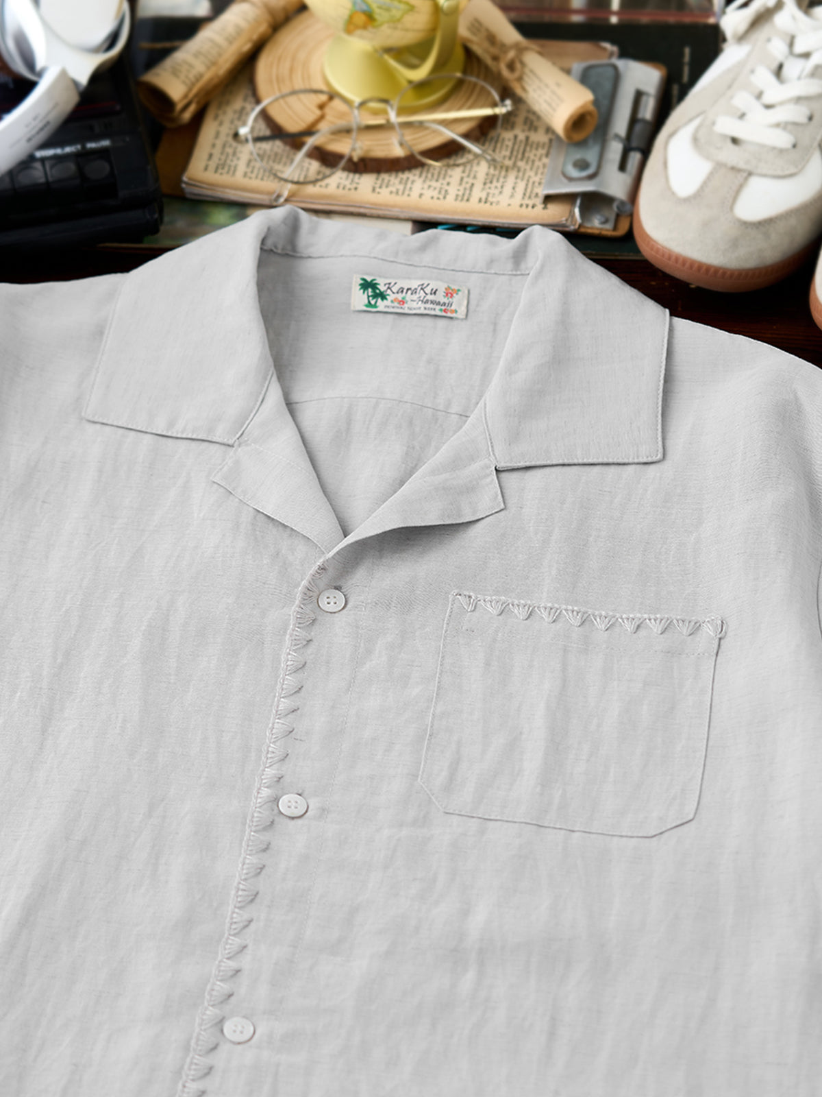 It has no collar, giving it a casual look. The large pockets and color-coordinated buttons are also nice touches.
