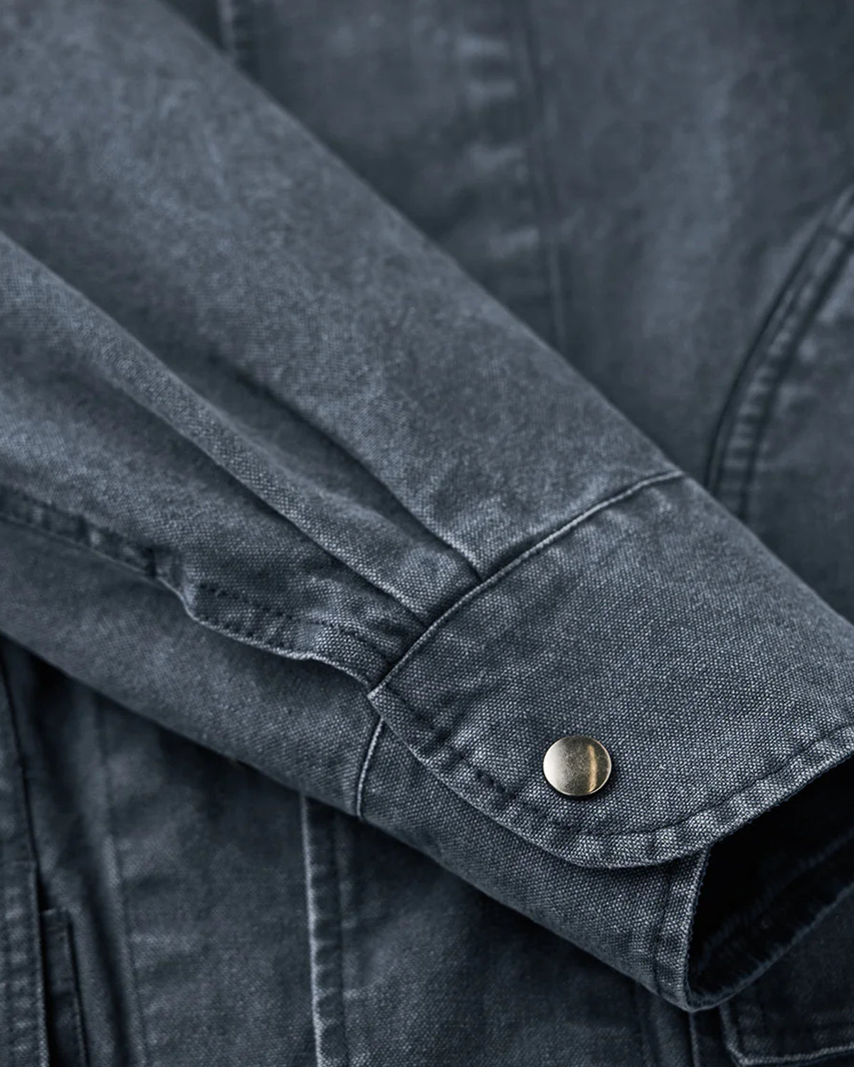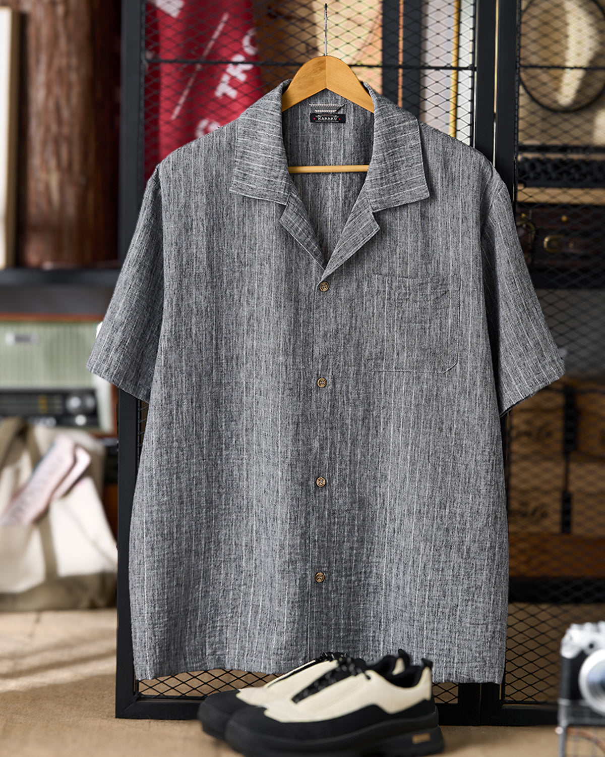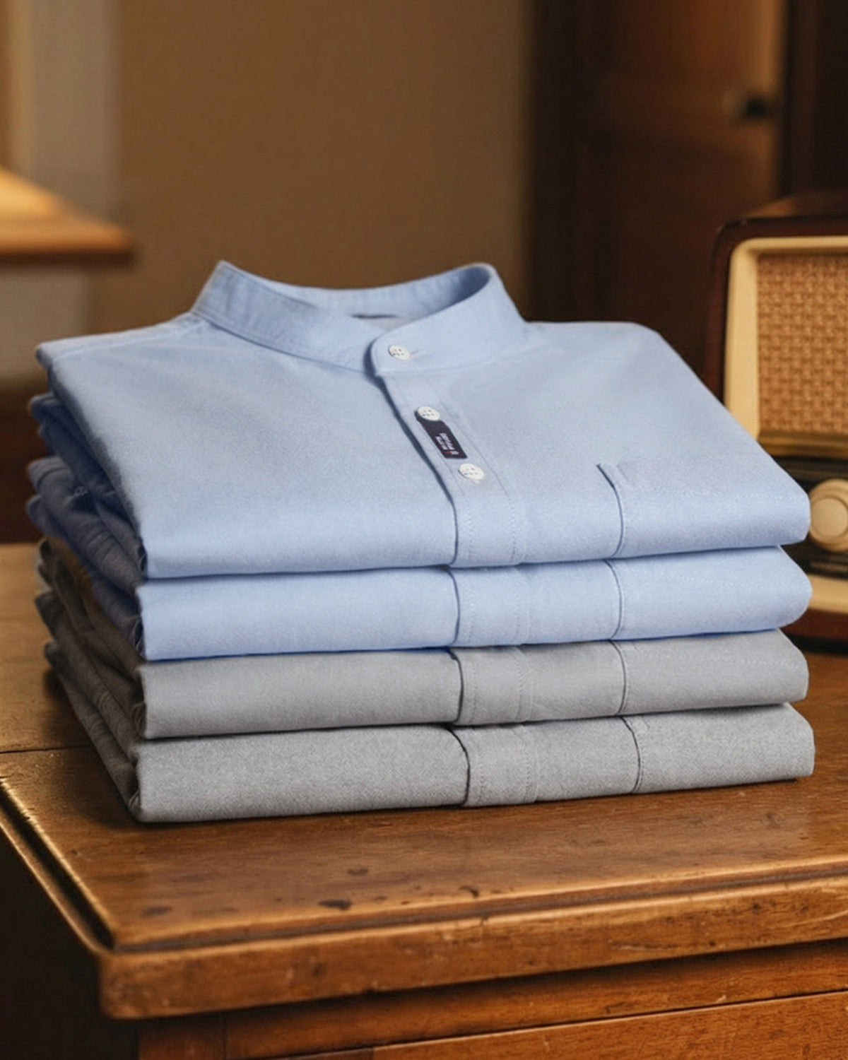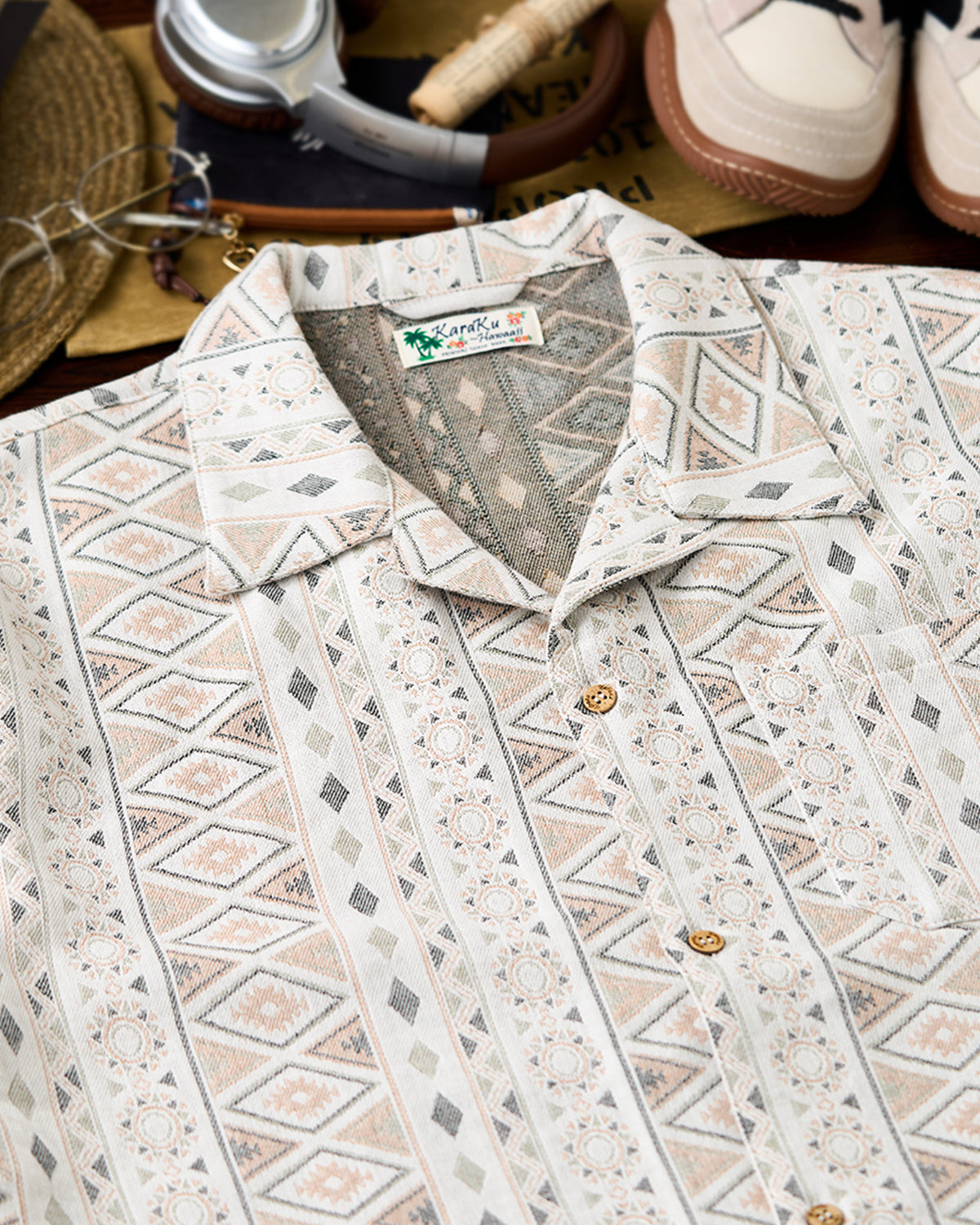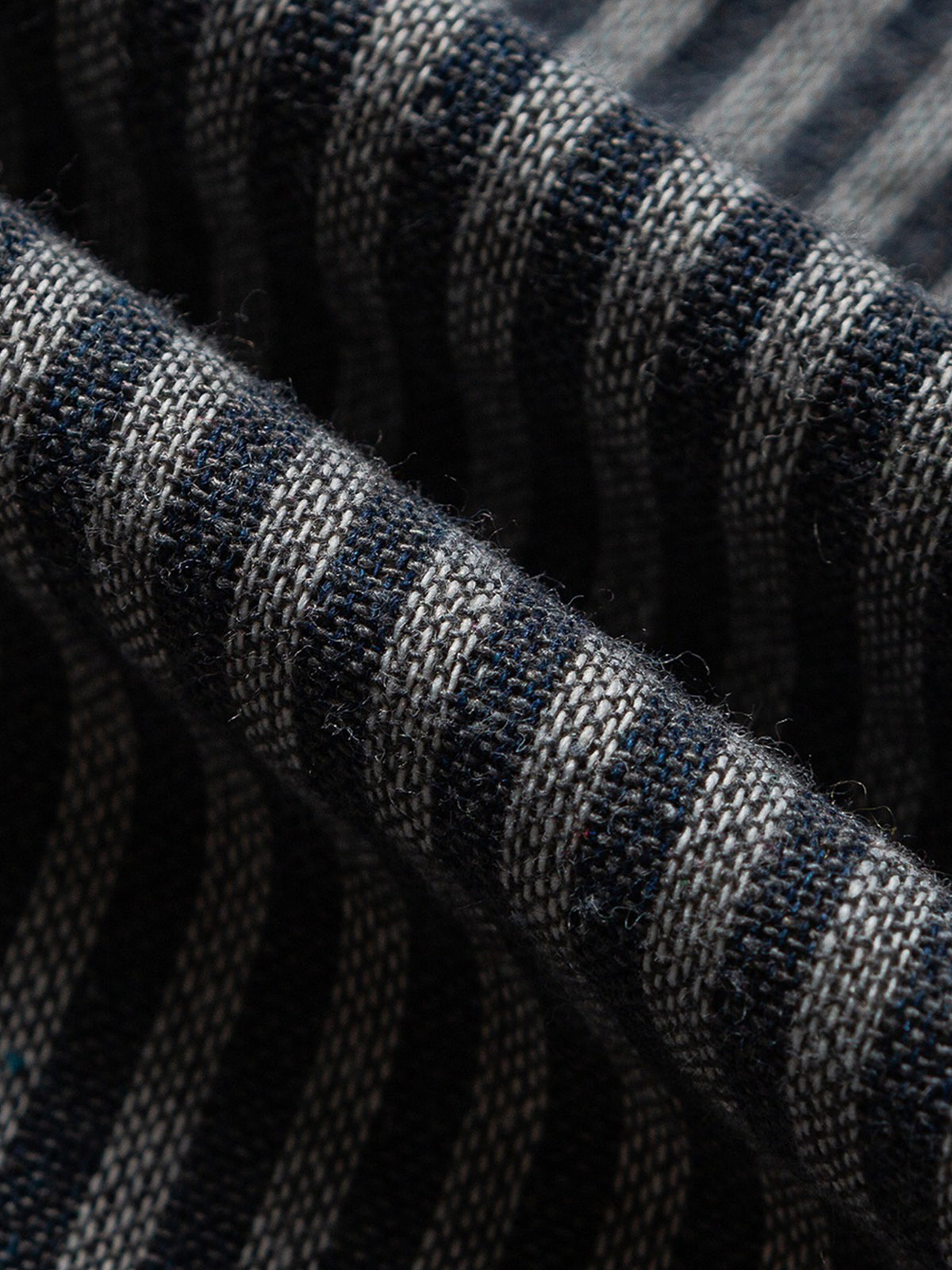 It has no collar, giving it a casual look. The large pockets and color-coordinated buttons are also nice touches.