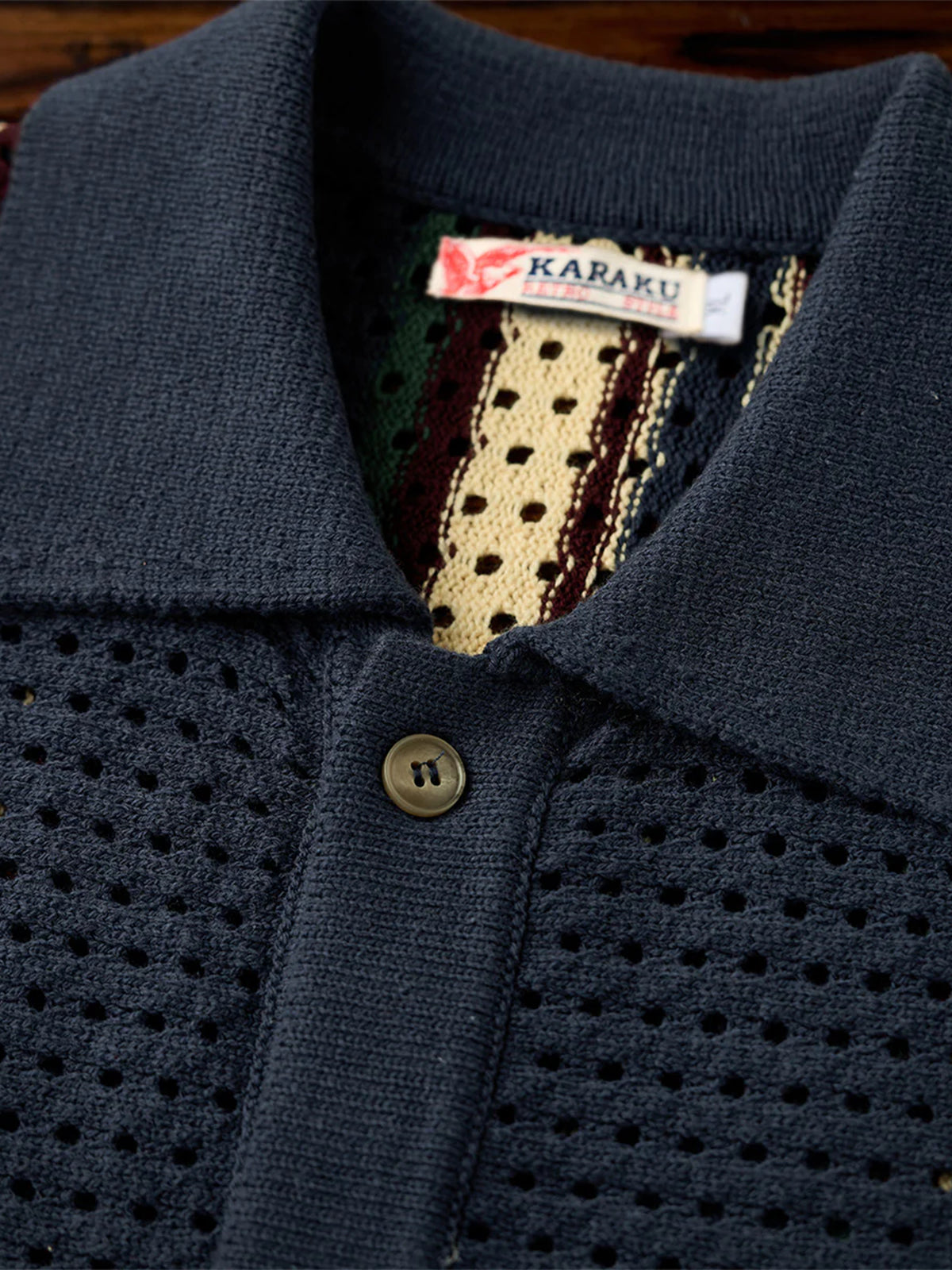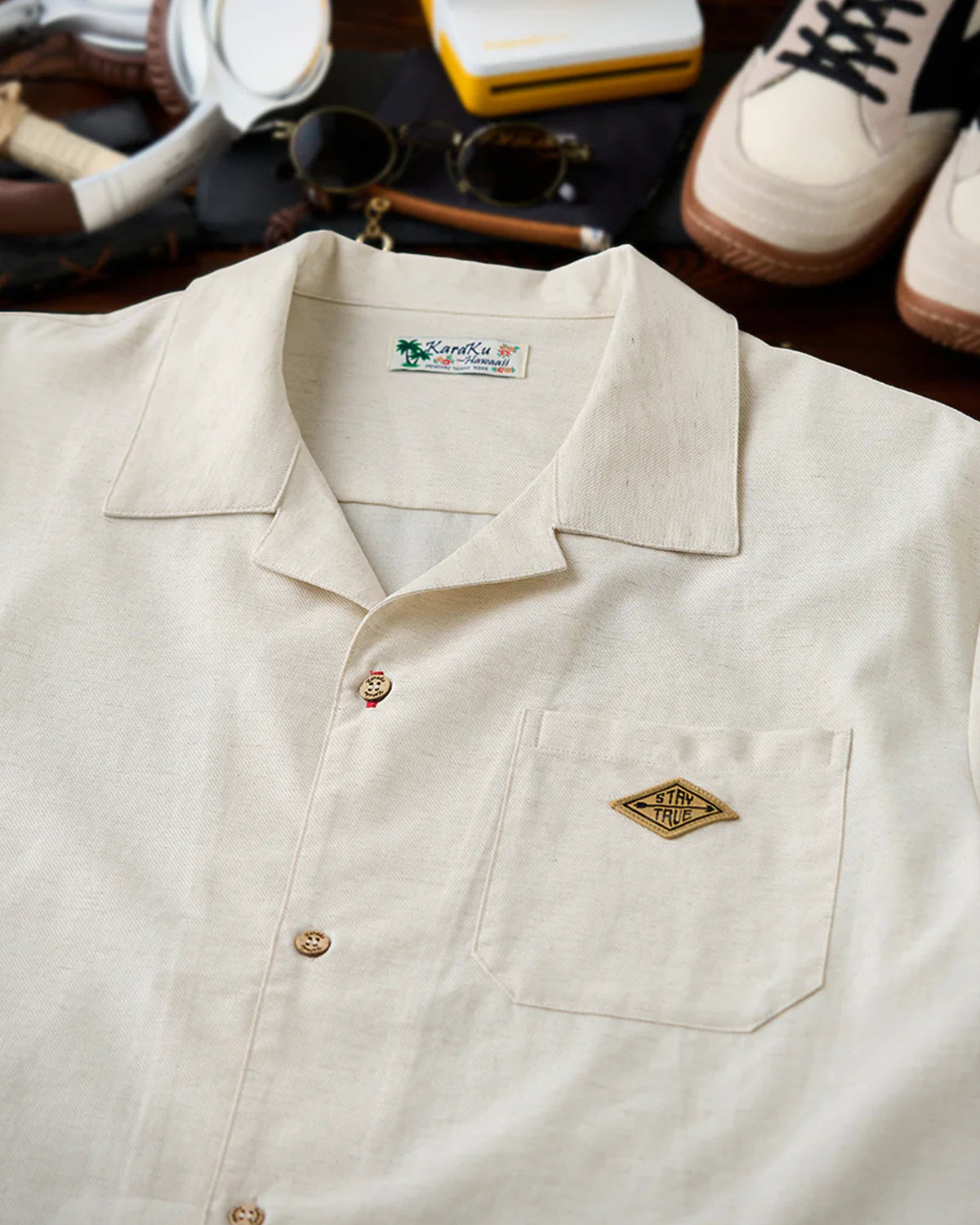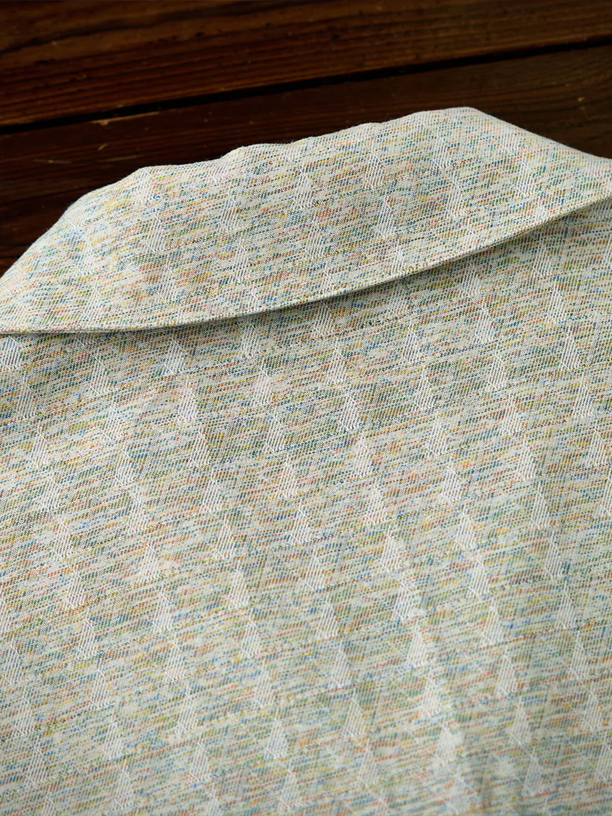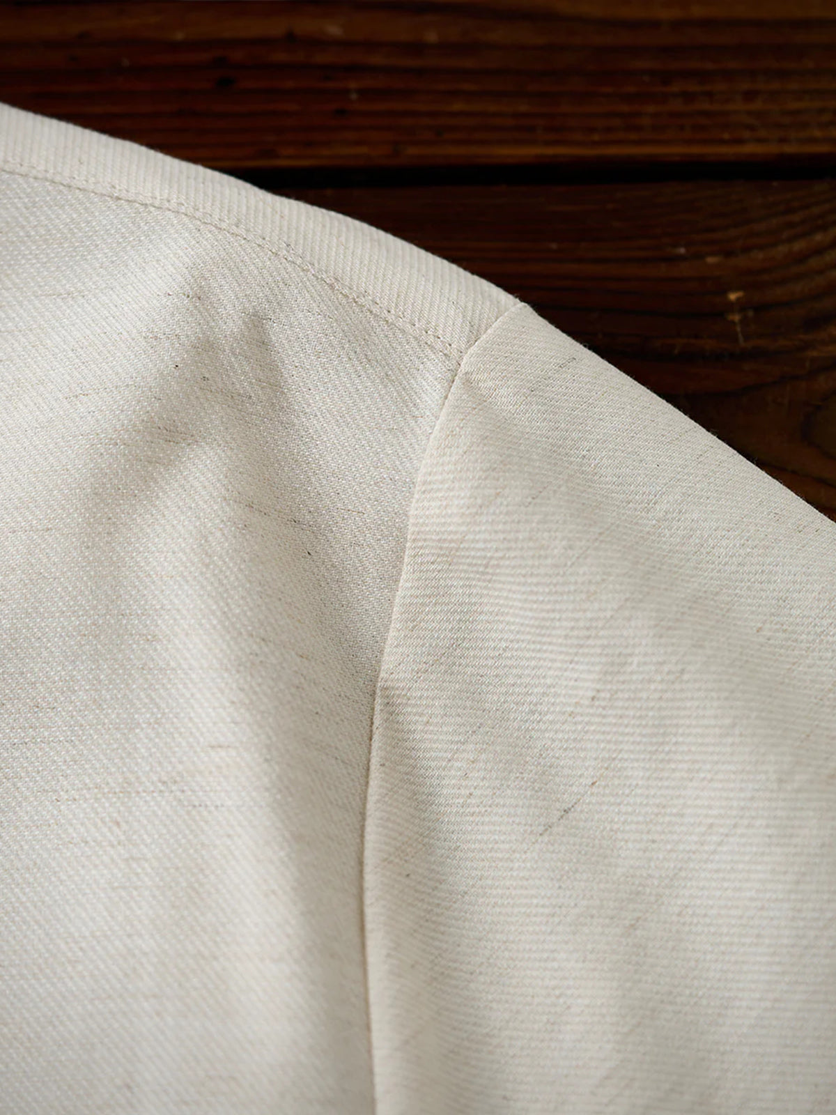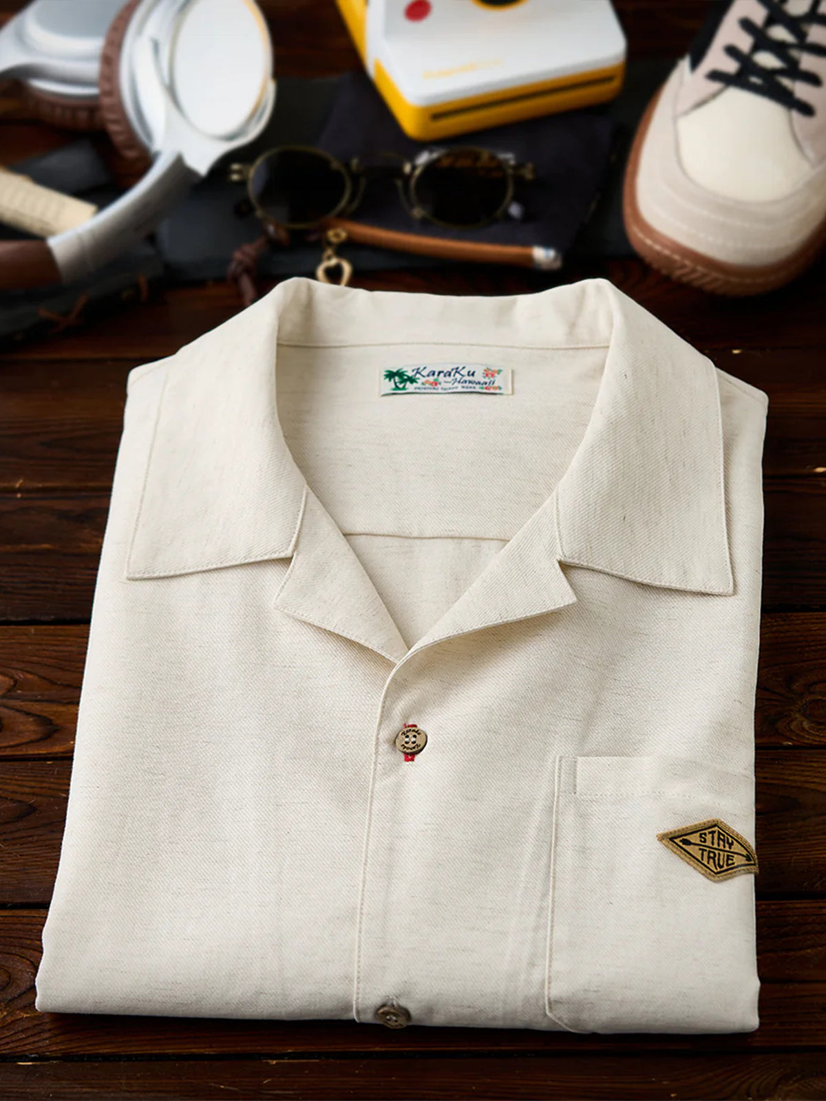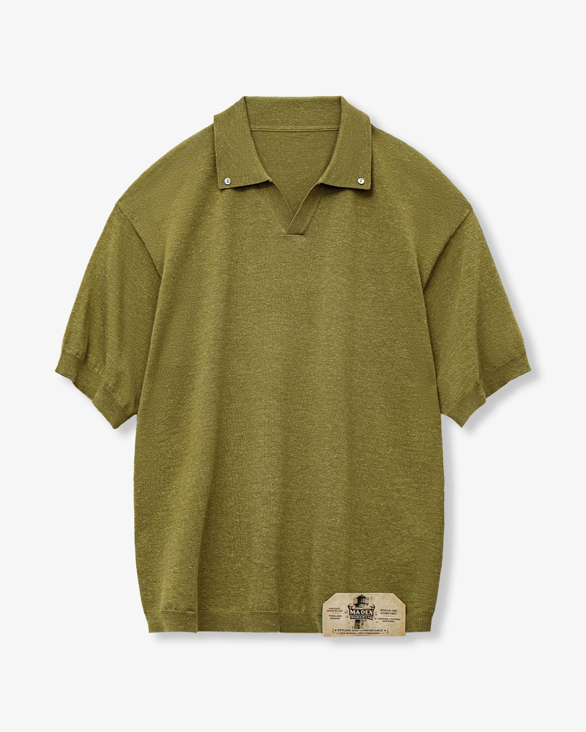 It has no collar, giving it a casual look. The large pockets and color-coordinated buttons are also nice touches.