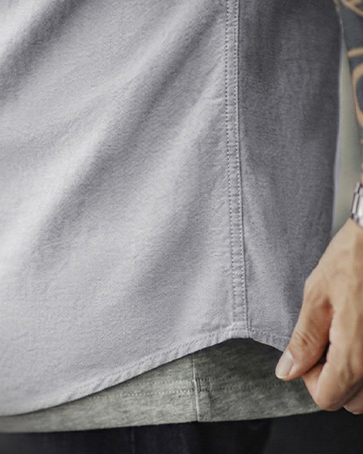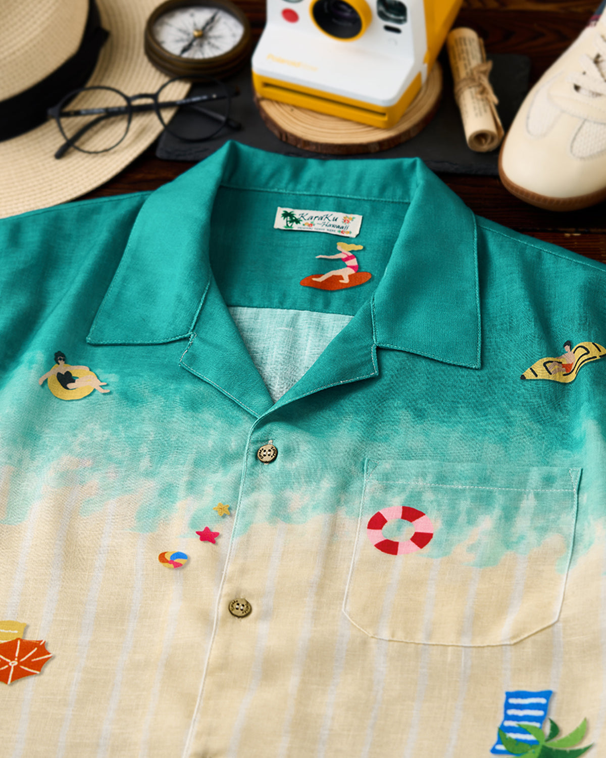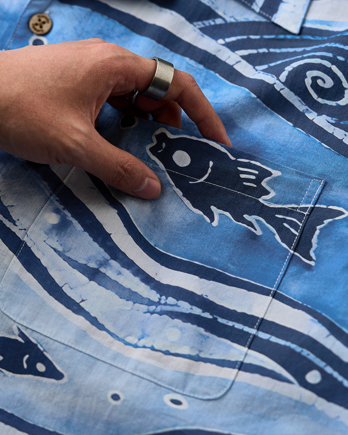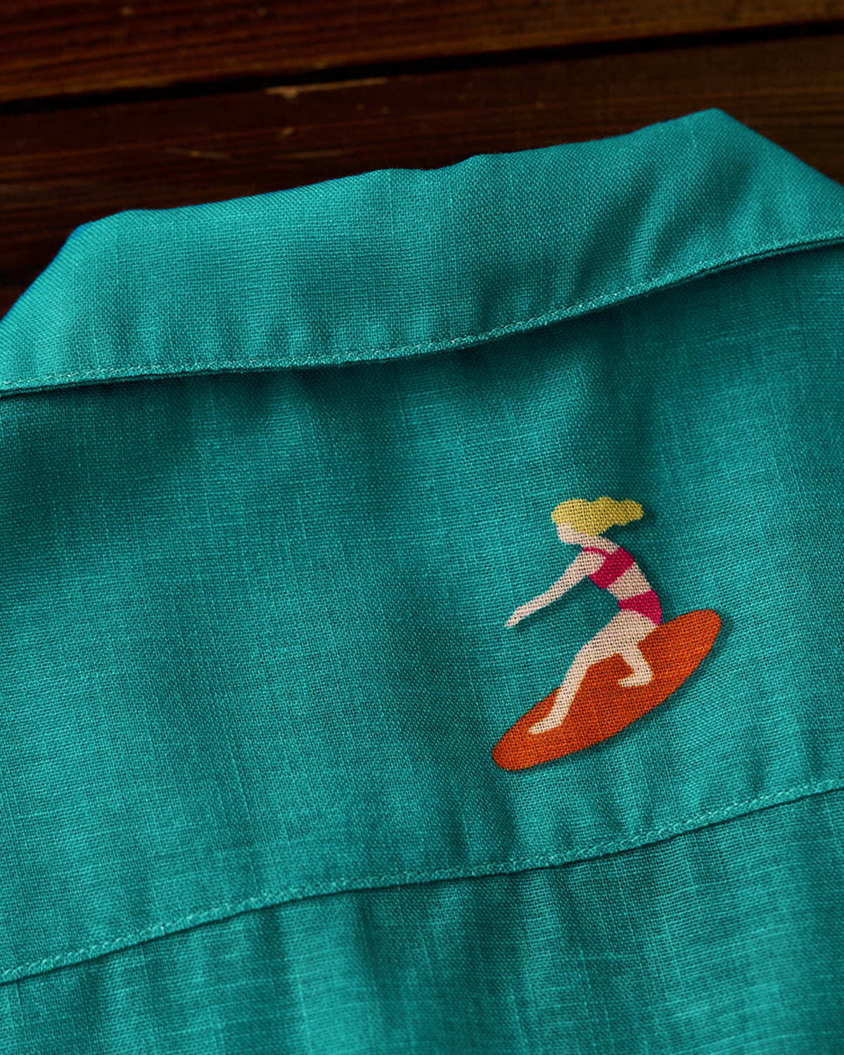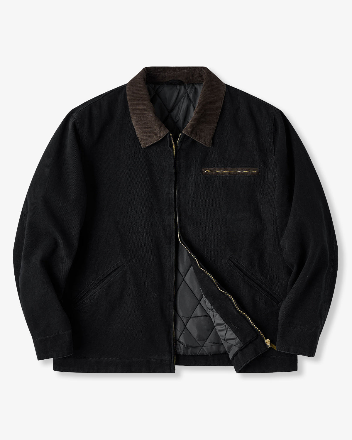 It has no collar, giving it a casual look. The large pockets and color-coordinated buttons are also nice touches.