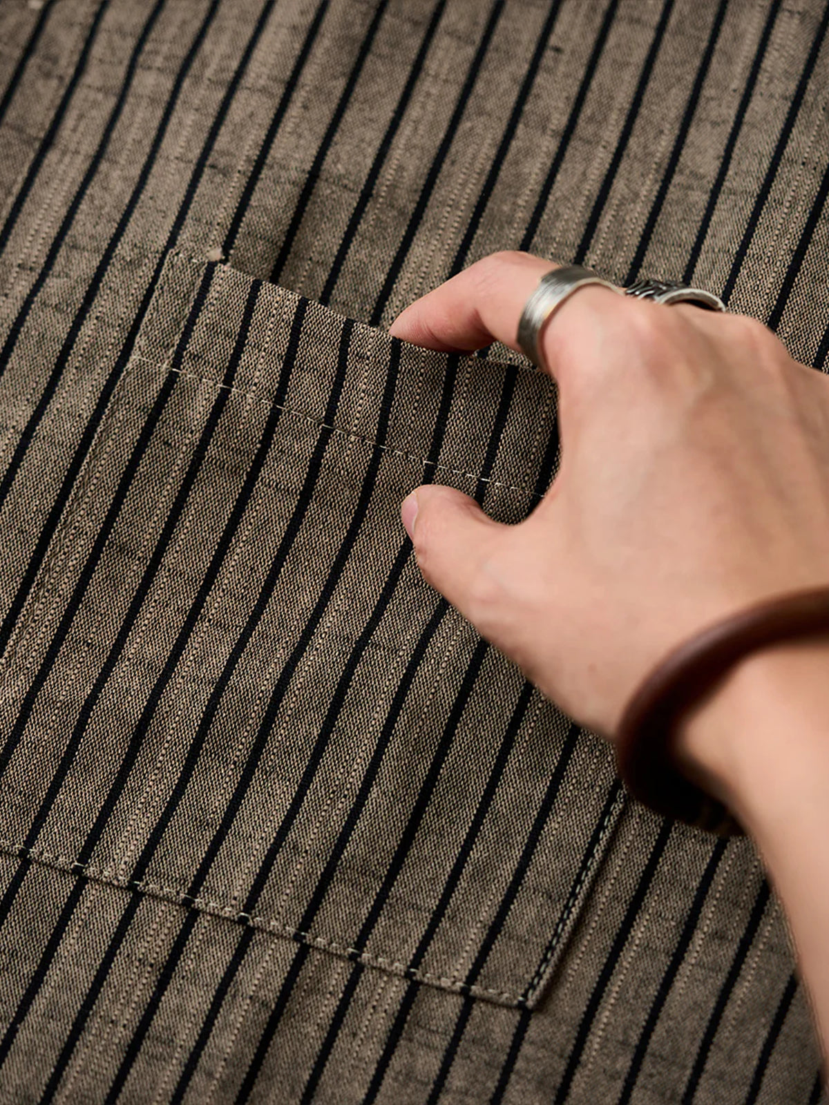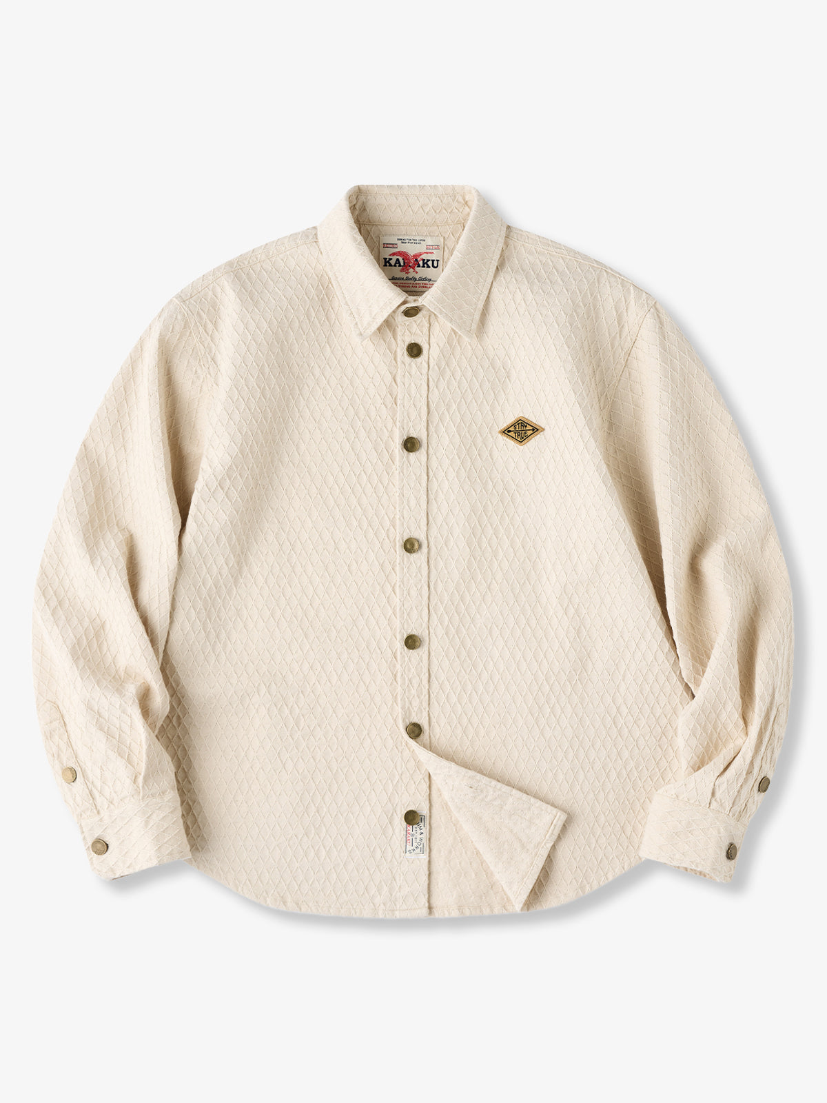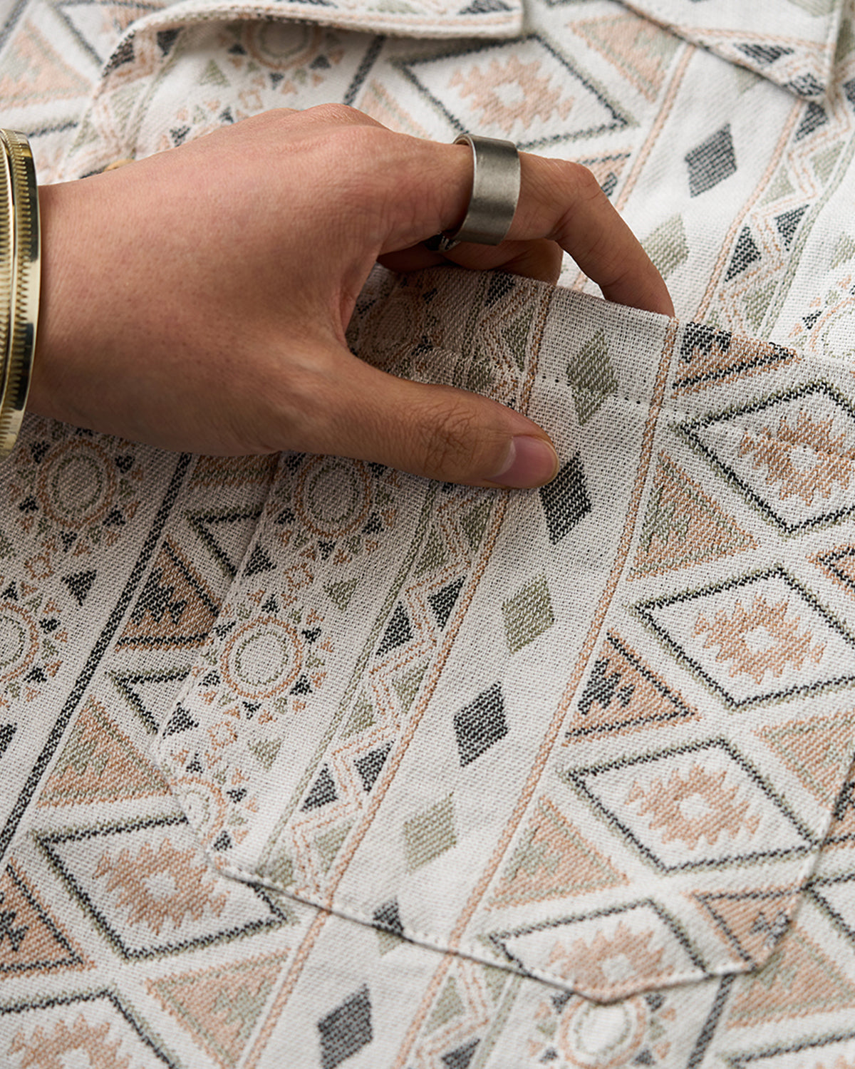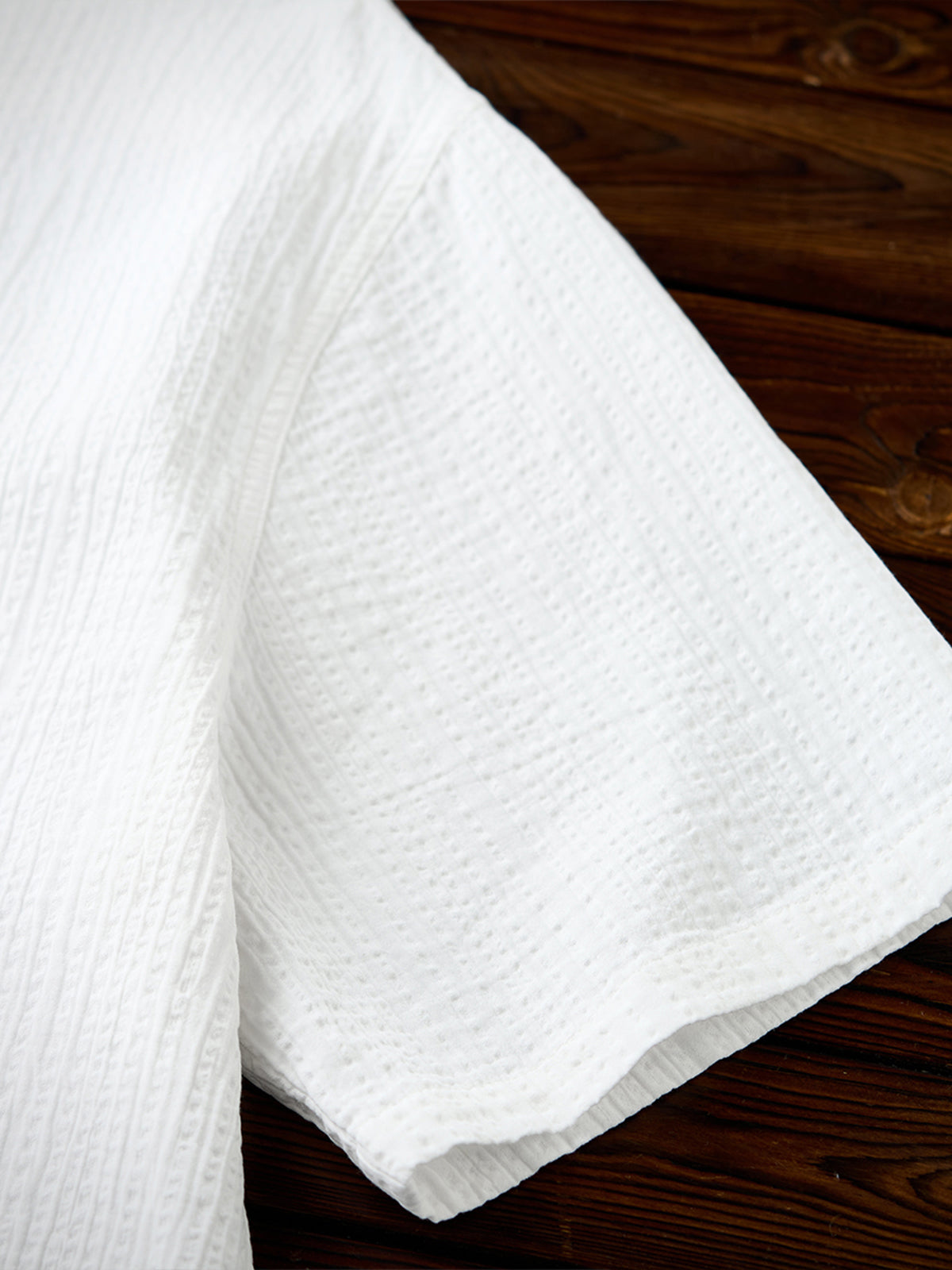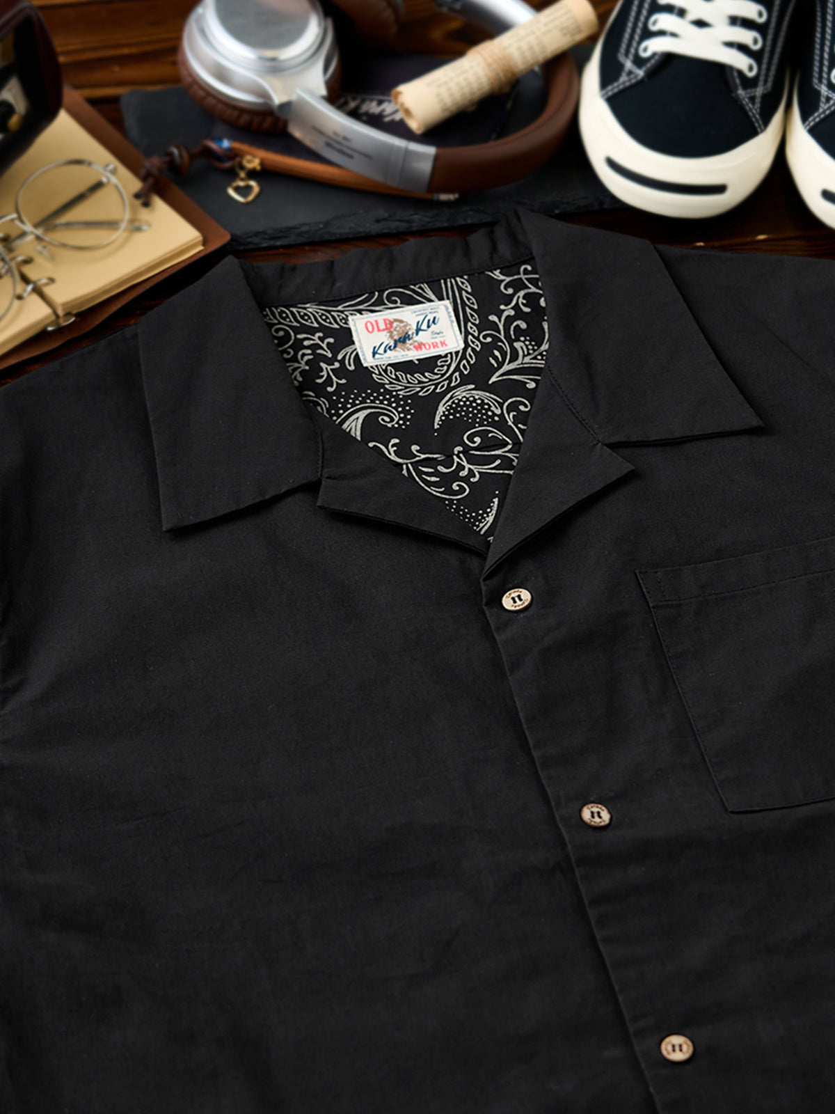 It has no collar, giving it a casual look. The large pockets and color-coordinated buttons are also nice touches.