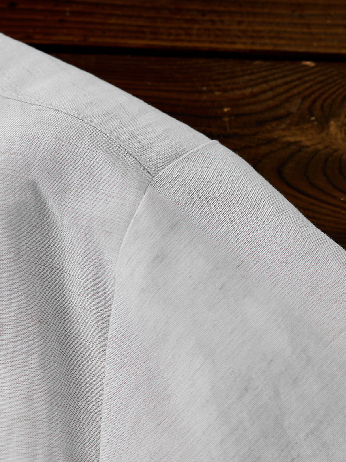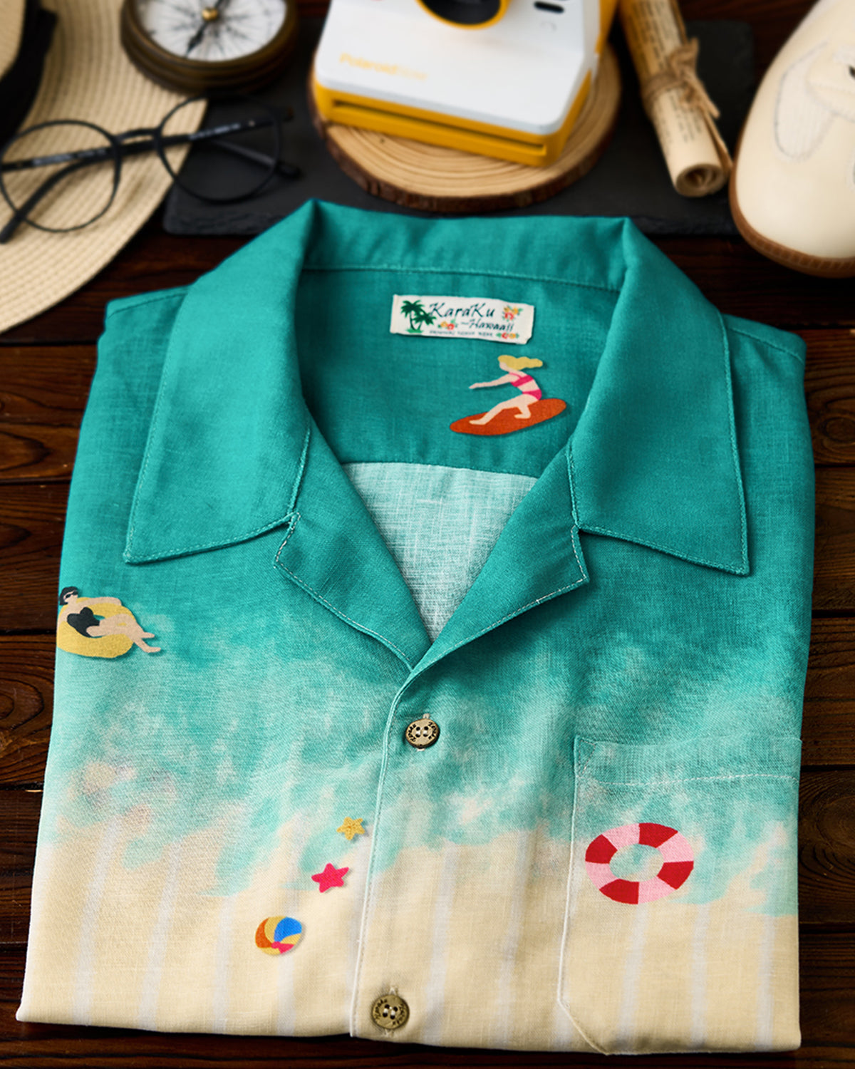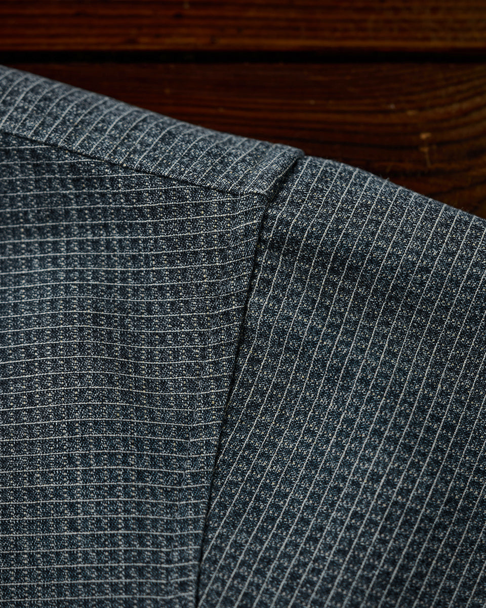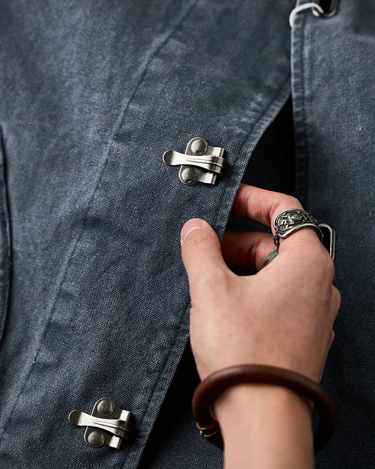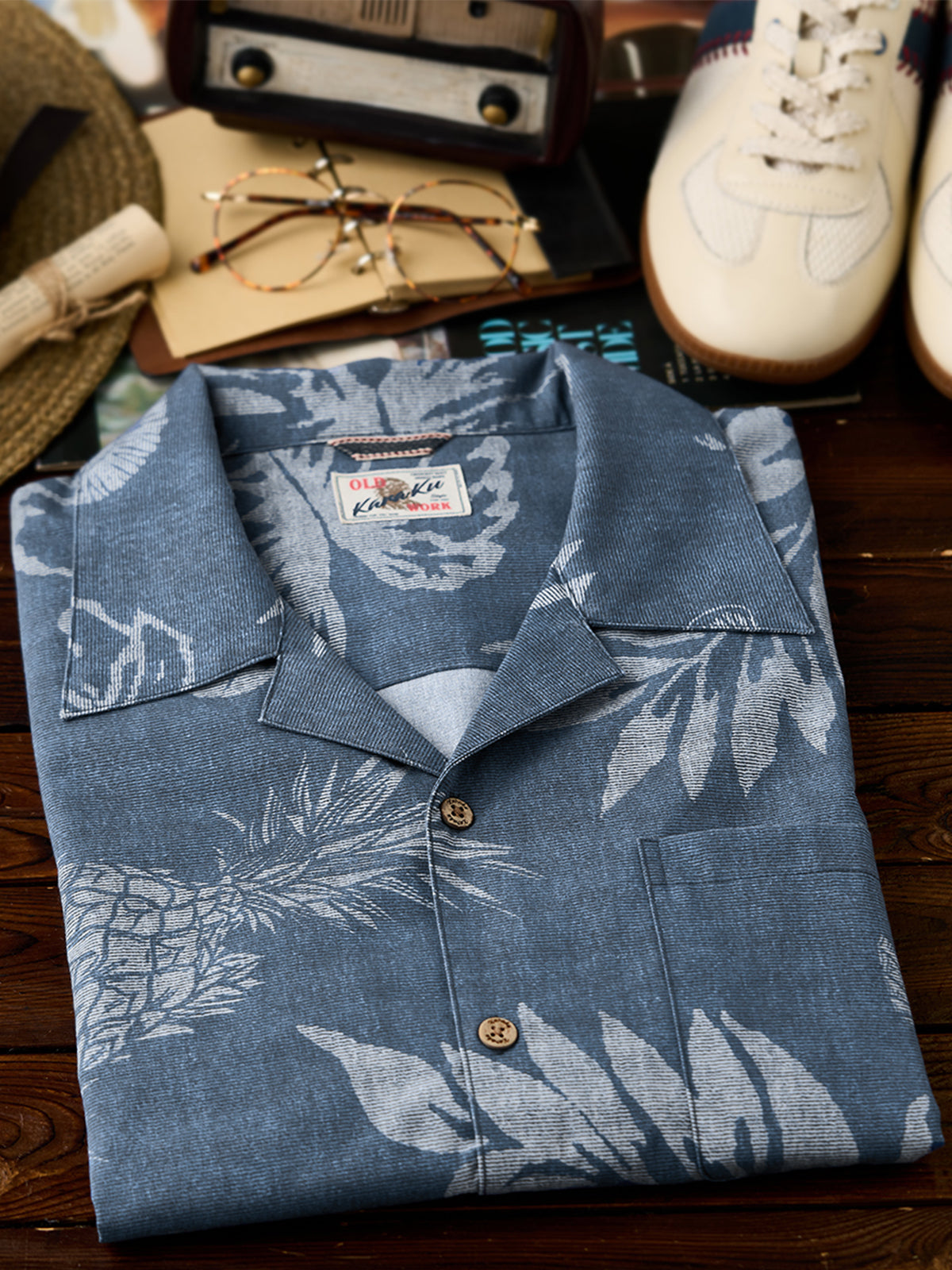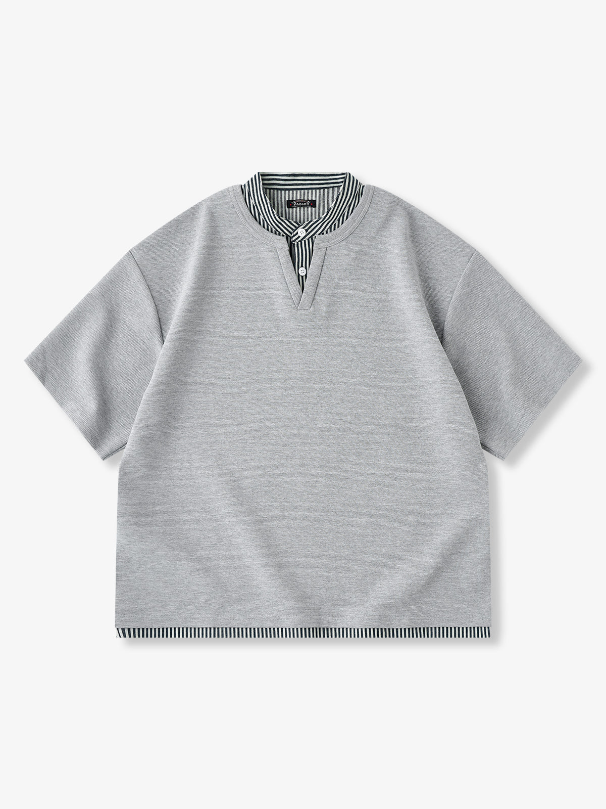 It has no collar, giving it a casual look. The large pockets and color-coordinated buttons are also nice touches.