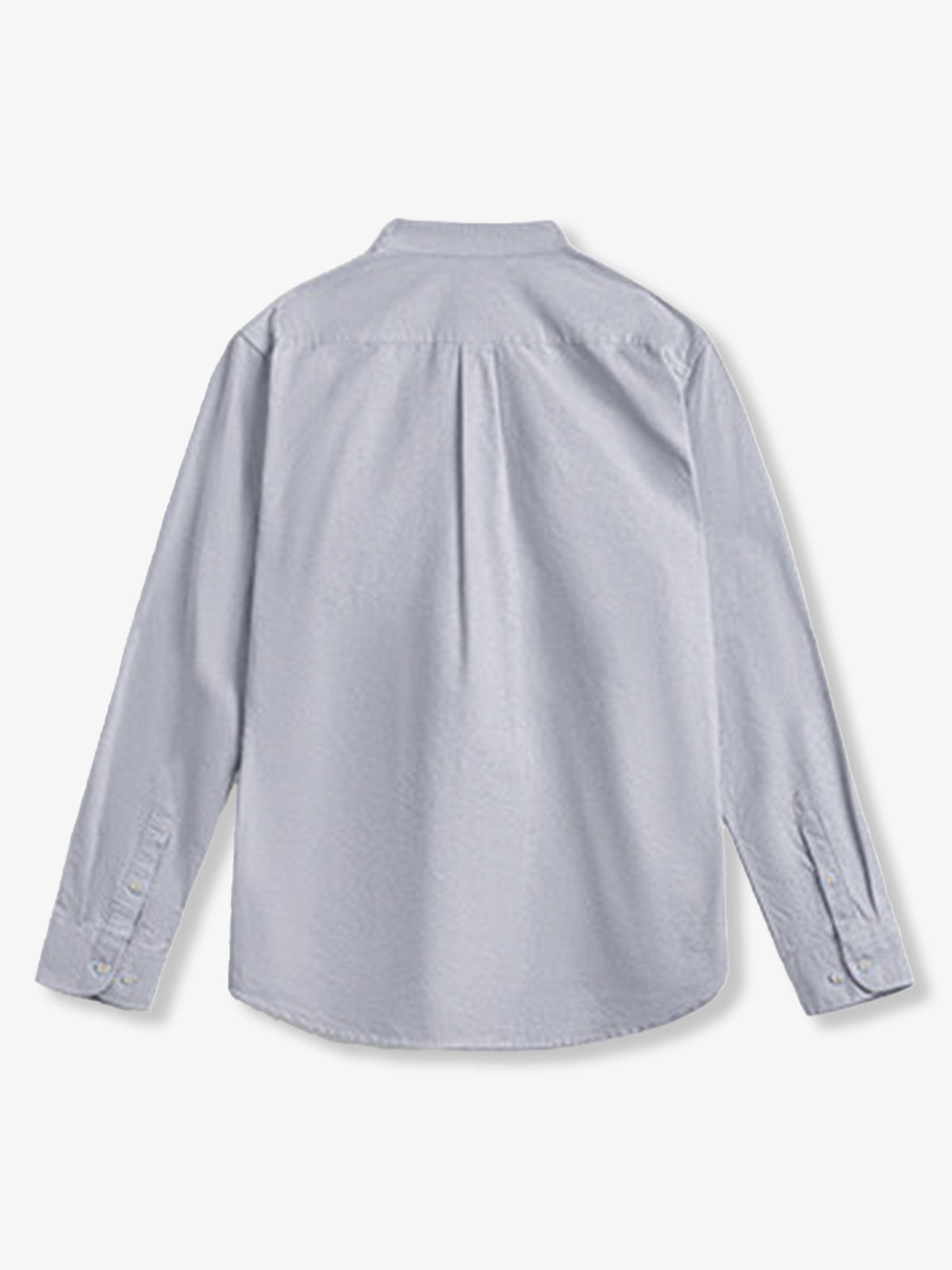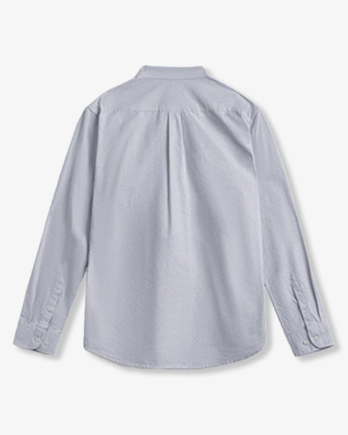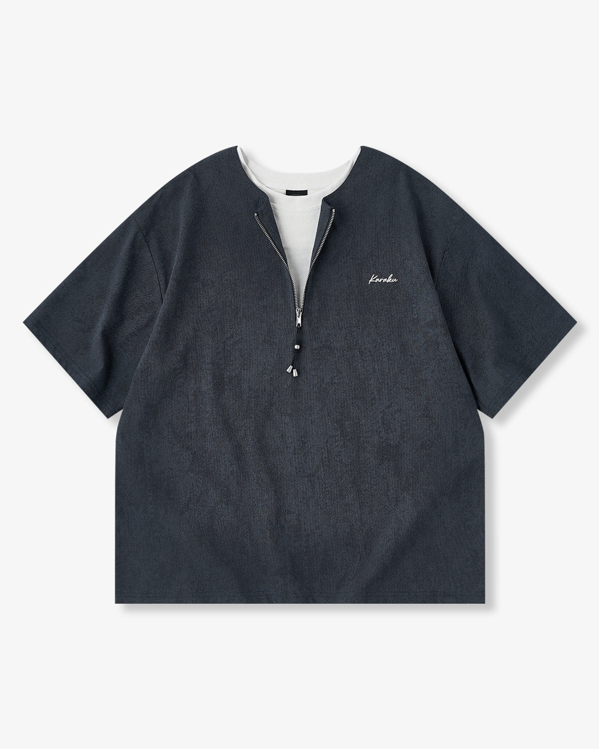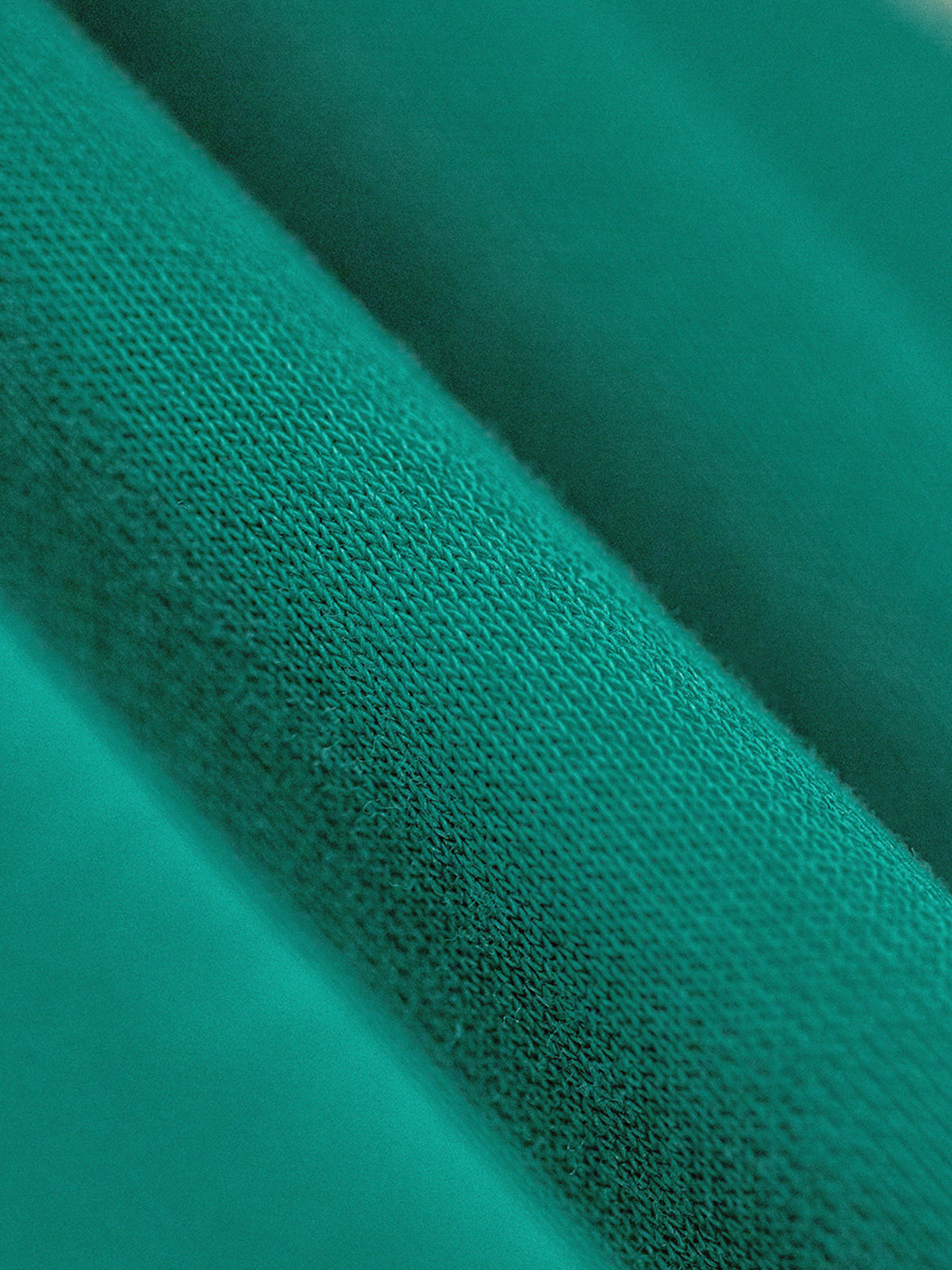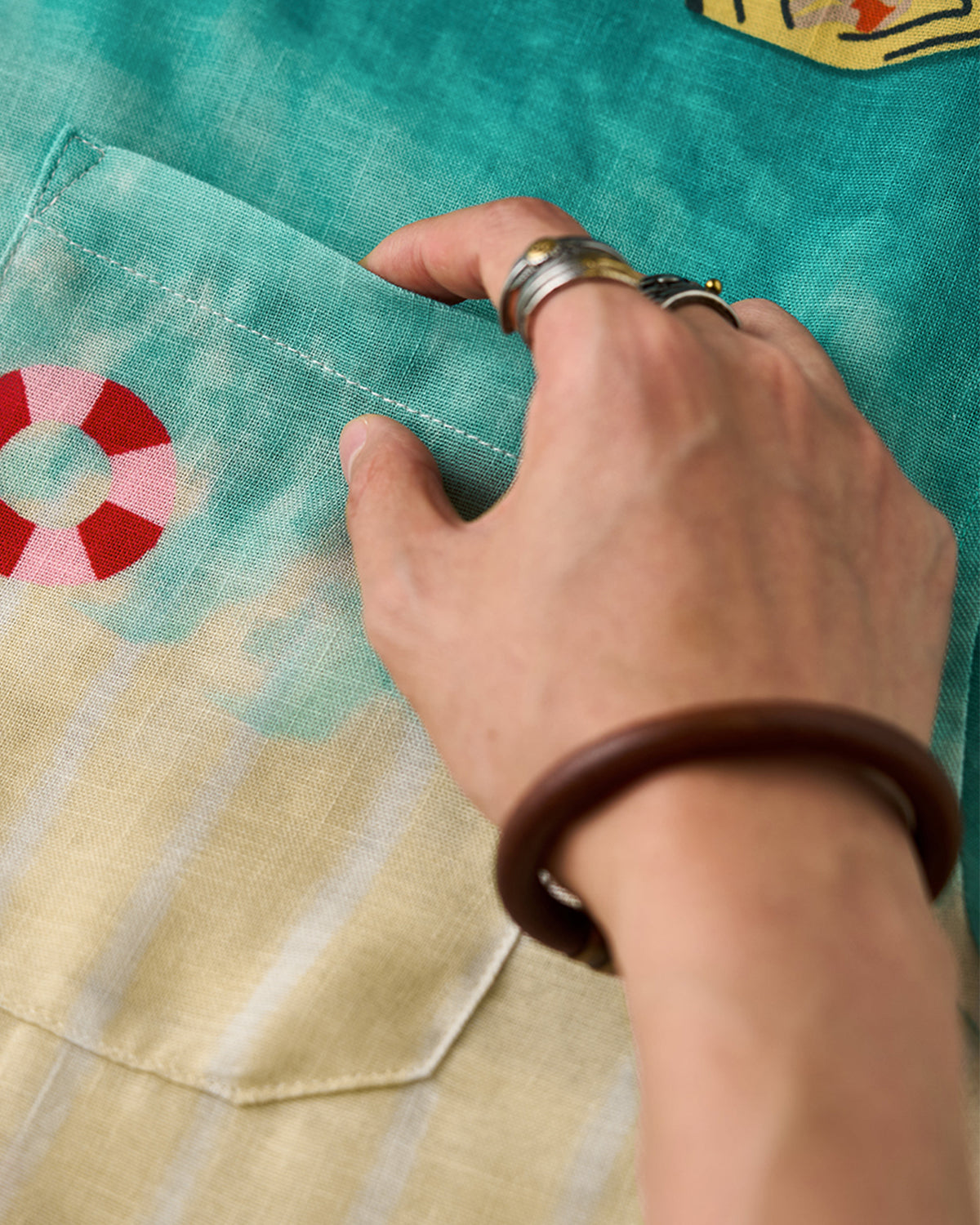 It has no collar, giving it a casual look. The large pockets and color-coordinated buttons are also nice touches.