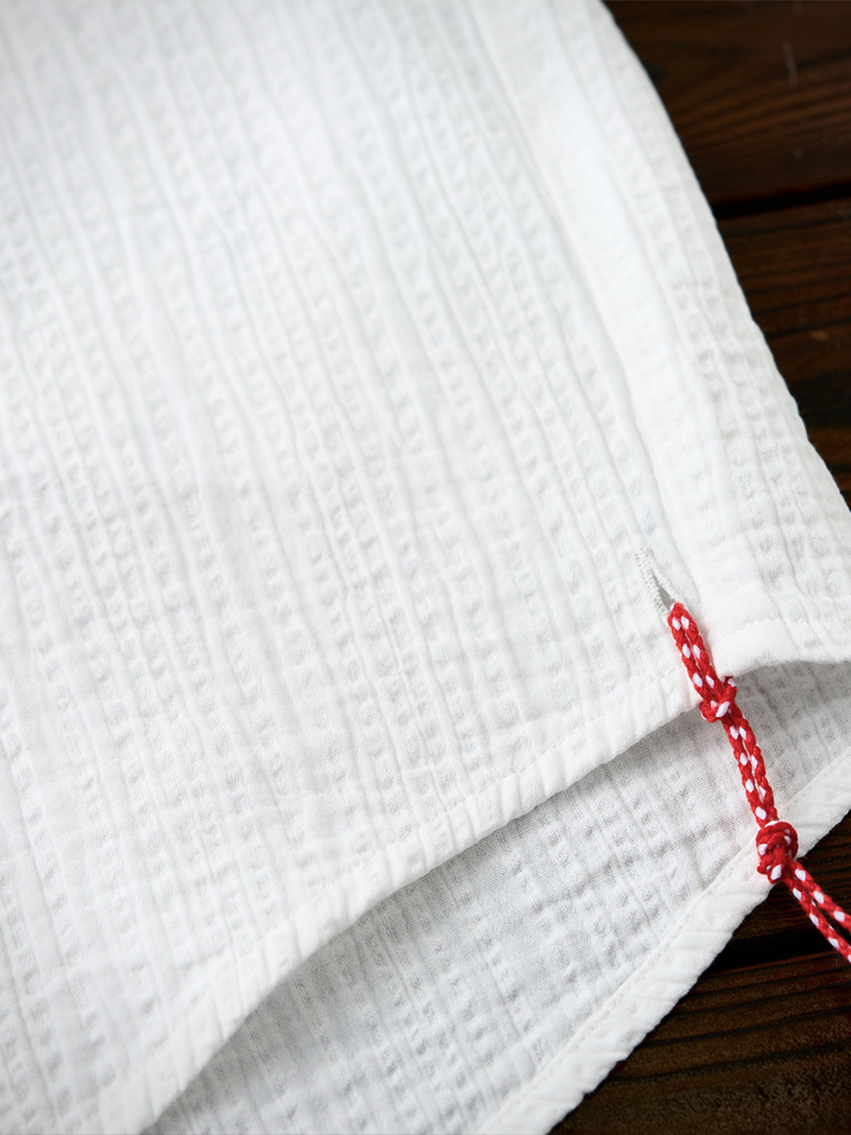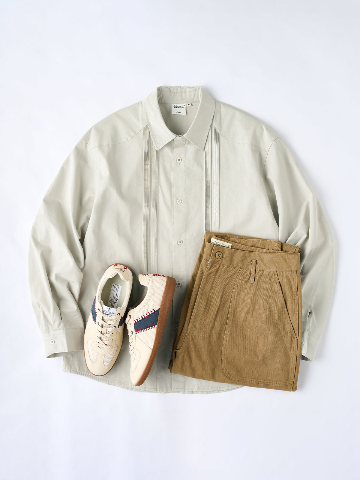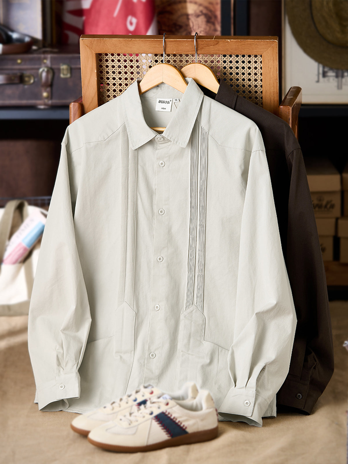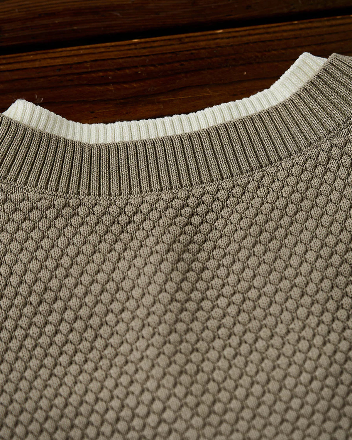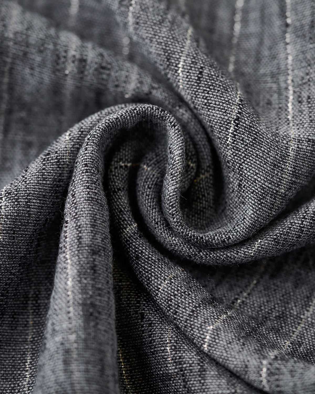 It has no collar, giving it a casual look. The large pockets and color-coordinated buttons are also nice touches.