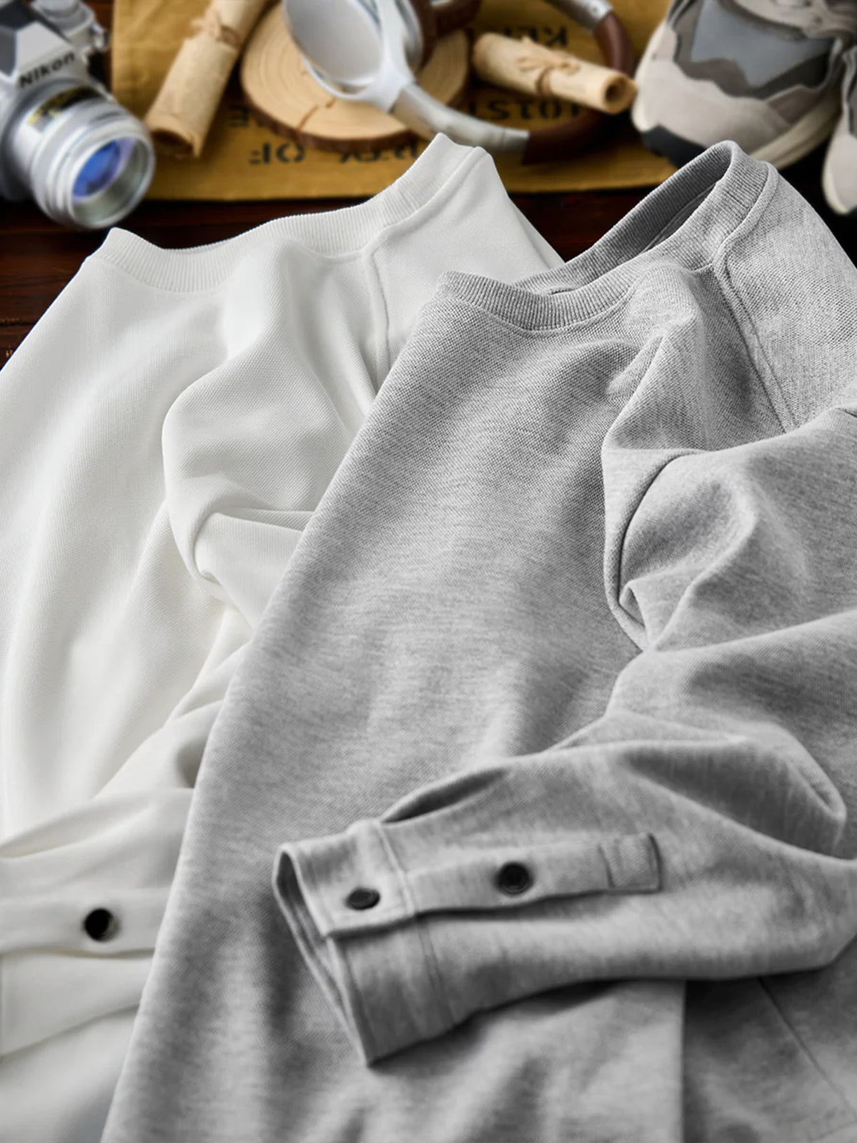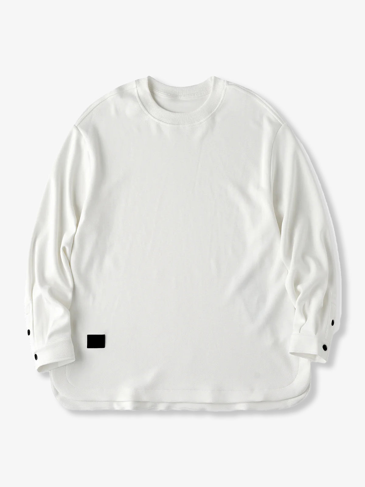 The crew neck is simple and easy to style, ensuring it doesn’t interfere with the overall design. The drop-shoulder design creates a relaxed silhouette with extra room around the shoulders, incorporating a modern trend. Two buttons are placed on the cuffs, functioning not only as a practical feature to secure rolled-up sleeves but also as a design accent. The hem draws a curved line, and the distinctive hemline design is crafted with ease of movement and comfort in mind.