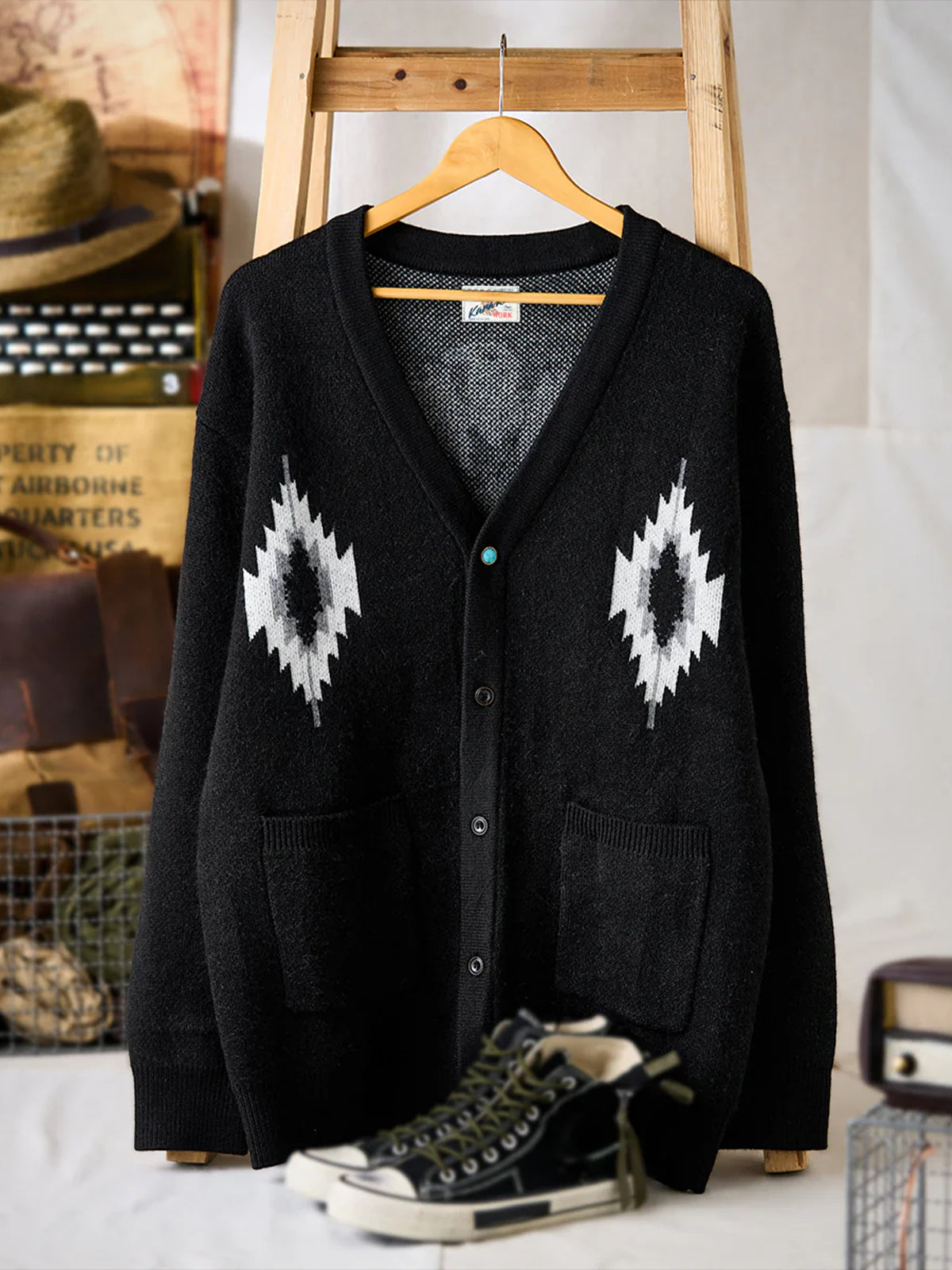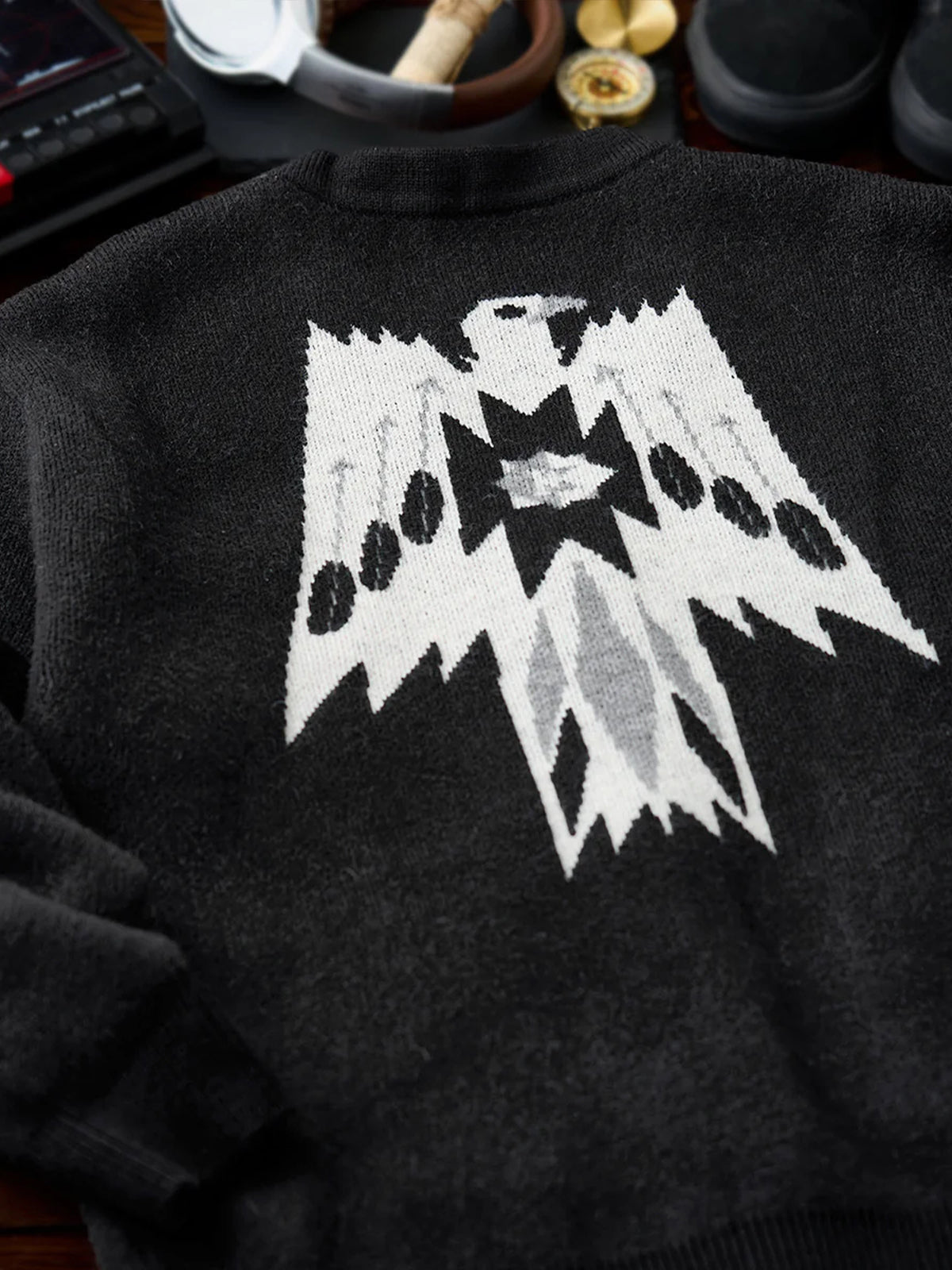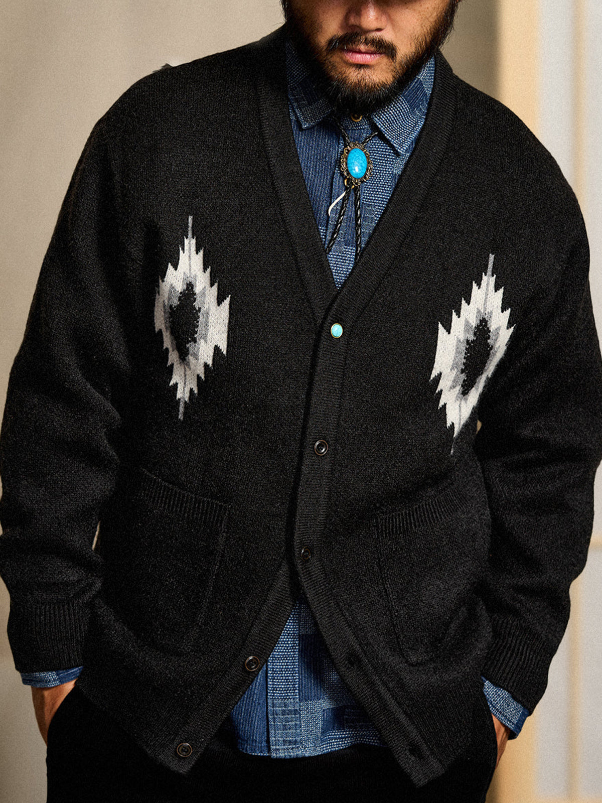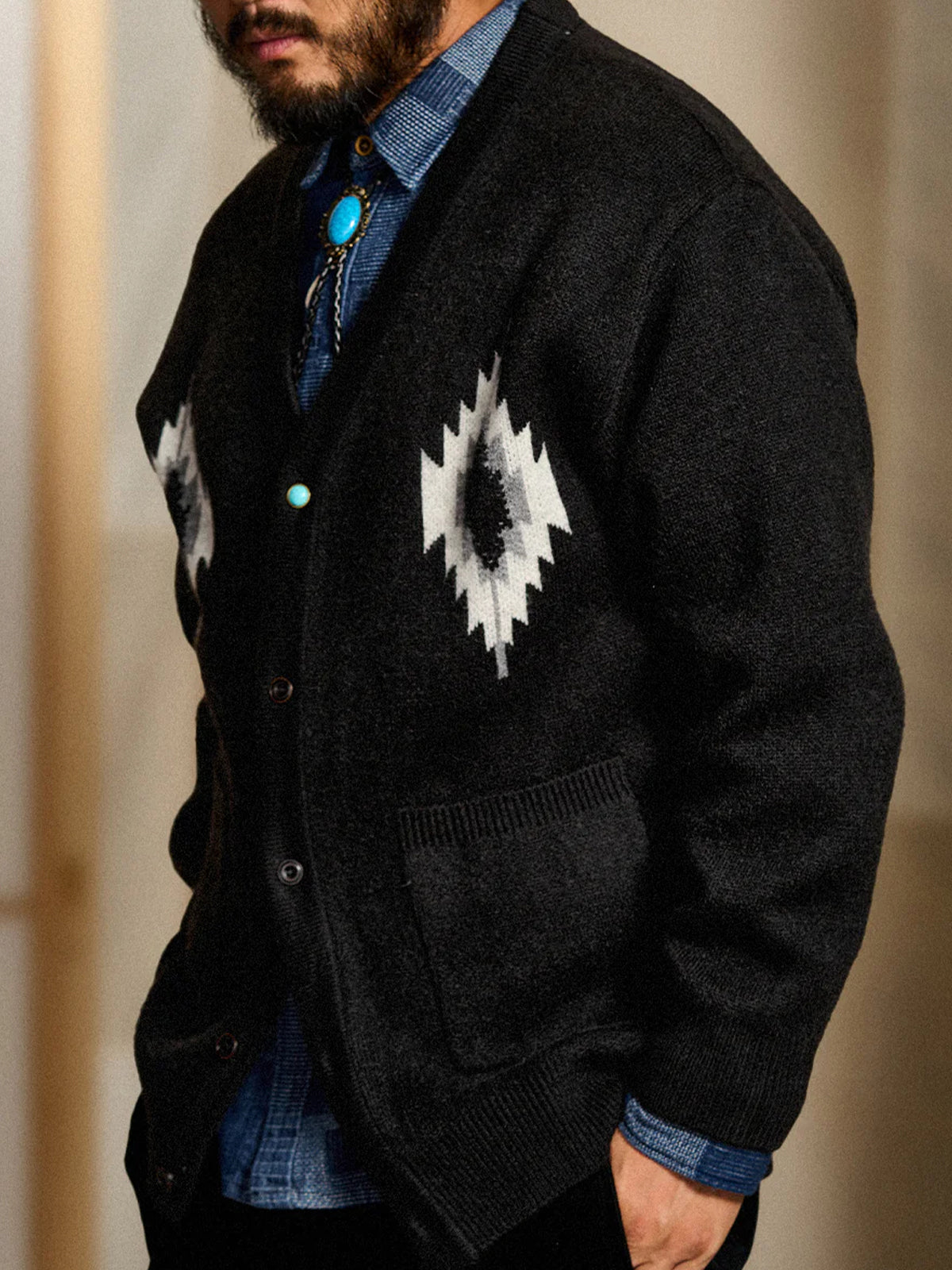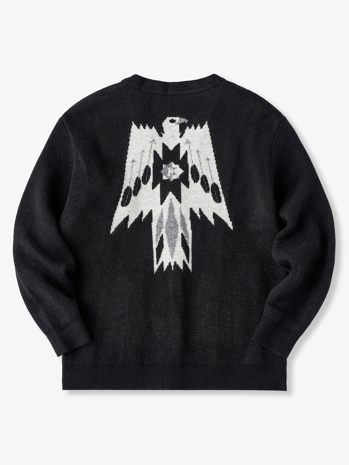 Jacquard Knit V-Neck Cardigan with Navajo & Thunderbird Motifs