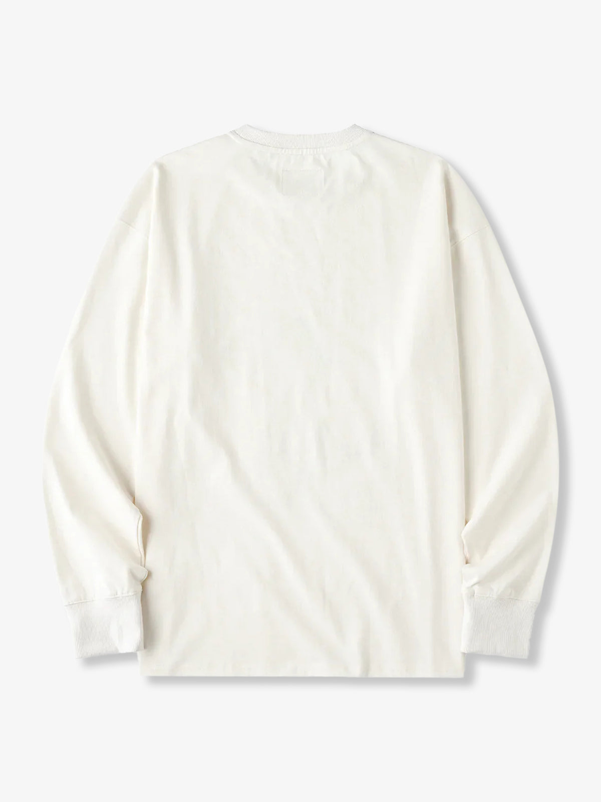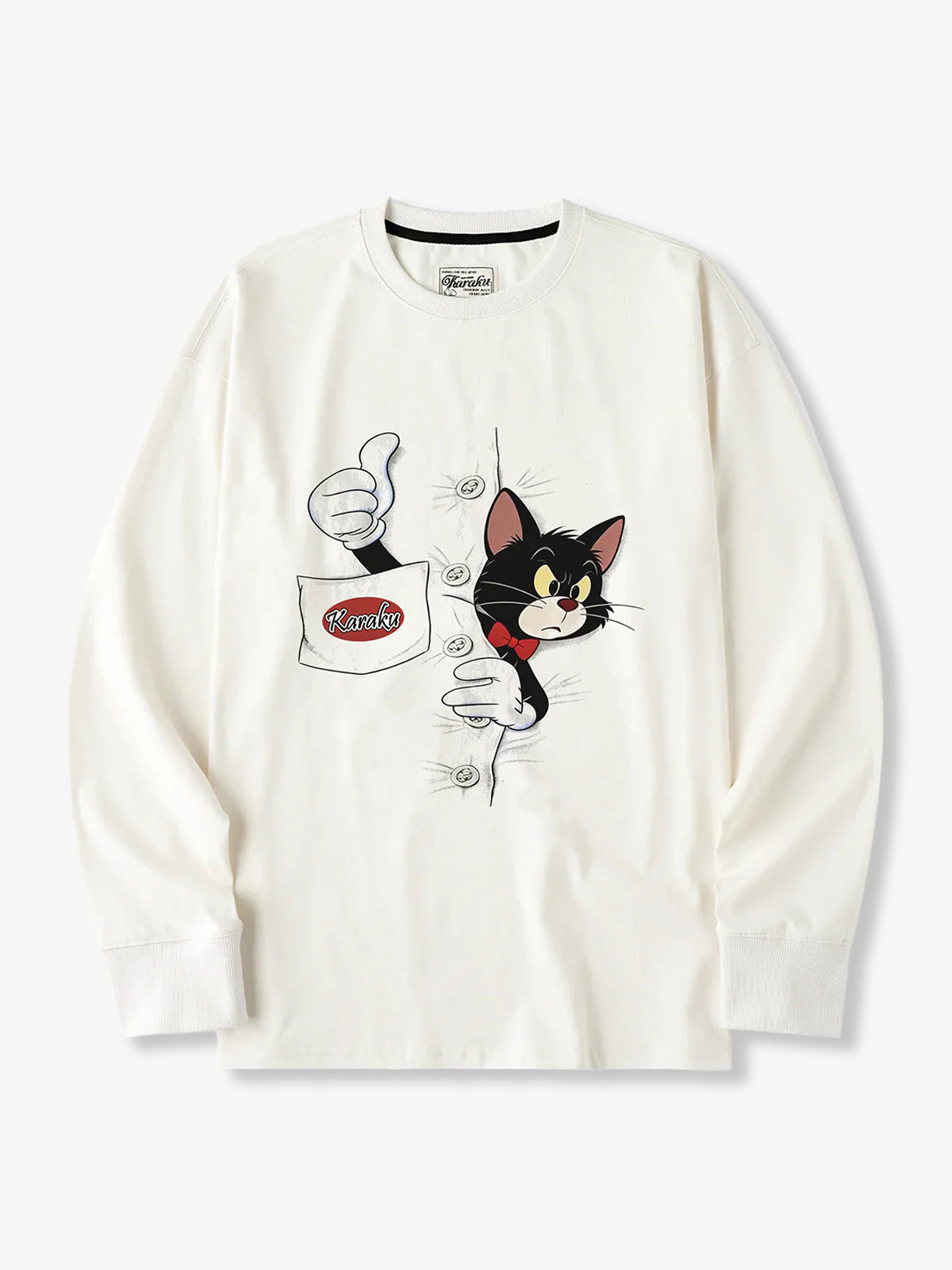 A basic white T-shirt is brought to life with a playful American vintage–style black cat print. The black cat, wearing a red bow tie, peeks out from between the buttons while raising its right thumb from the chest pocket—a humorous and eye-catching design detail. Casual yet full of personality, this long-sleeve T-shirt delivers a strong sense of fun inspired by classic American vintage graphics.
