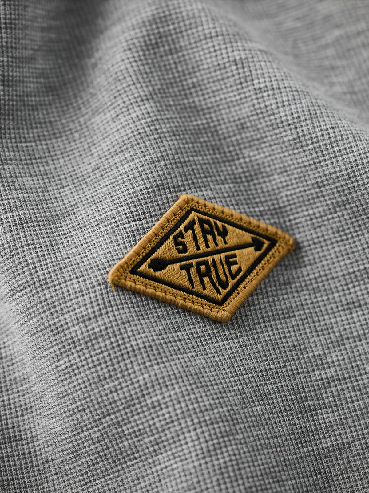 A standout “STAY TRUE” embroidered patch on the left chest adds a unique touch, with its yellow accent popping against the darker fabric. The adjustable drawcord at the hem lets you shape the silhouette for a more compact, sporty look.