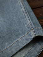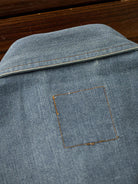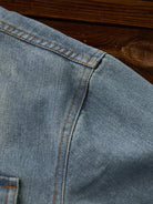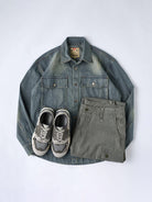 This stonewashed denim work shirt features large flap pockets on both chest areas, combining practicality with style. The snap buttons make it easy to put on and take off, reflecting the functional roots of classic workwear. The rounded hem allows for both tuck-in and untucked styling. Designed with a relaxed workwear fit, it prioritizes ease of movement while maintaining a casual, utilitarian aesthetic. The stonewash finish on the front and back creates natural fade lines around the shoulders, chest, and elbows, adding depth and a lived-in vintage character.