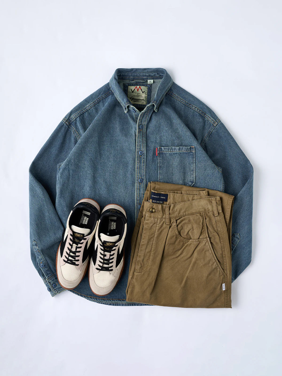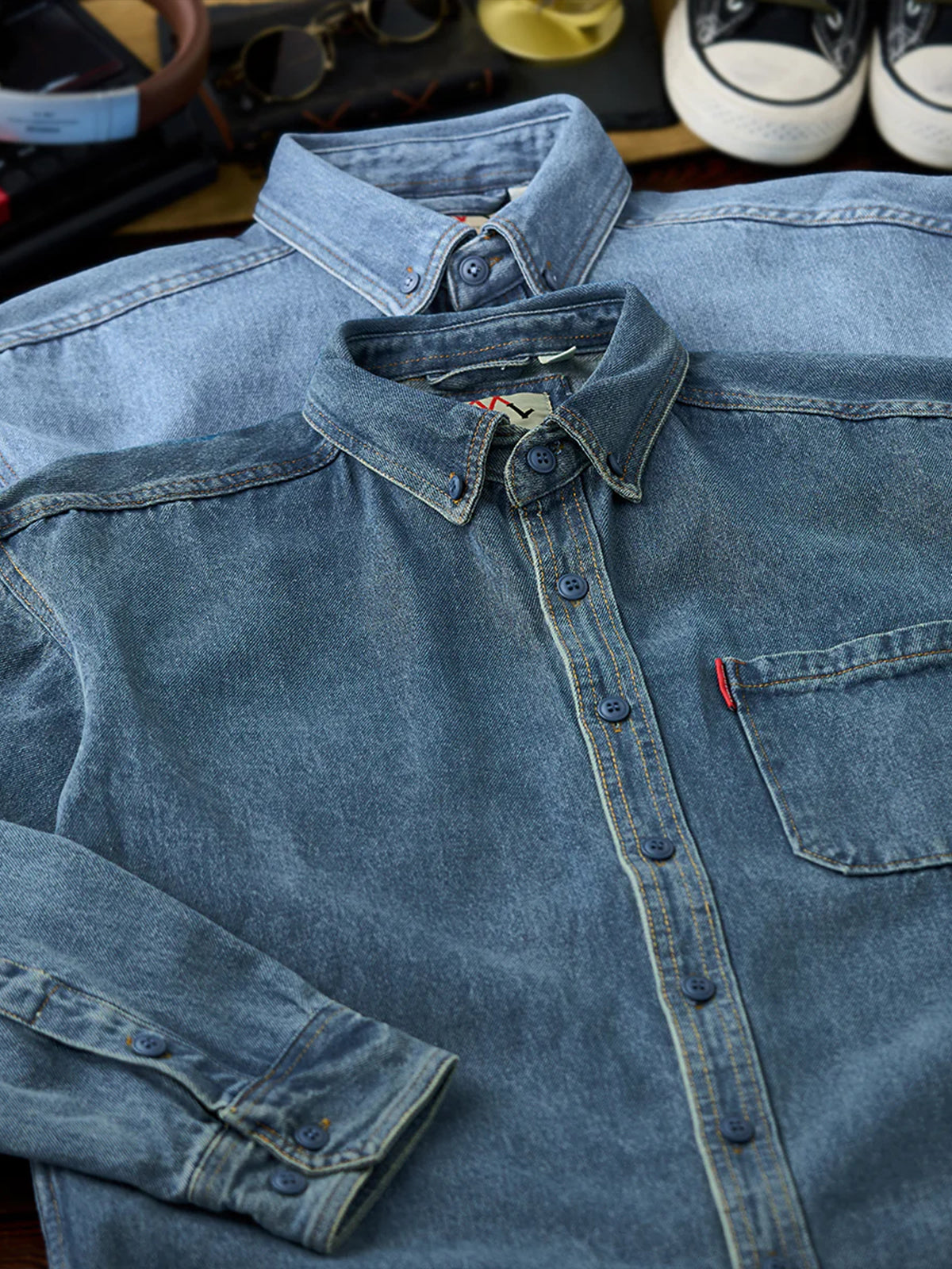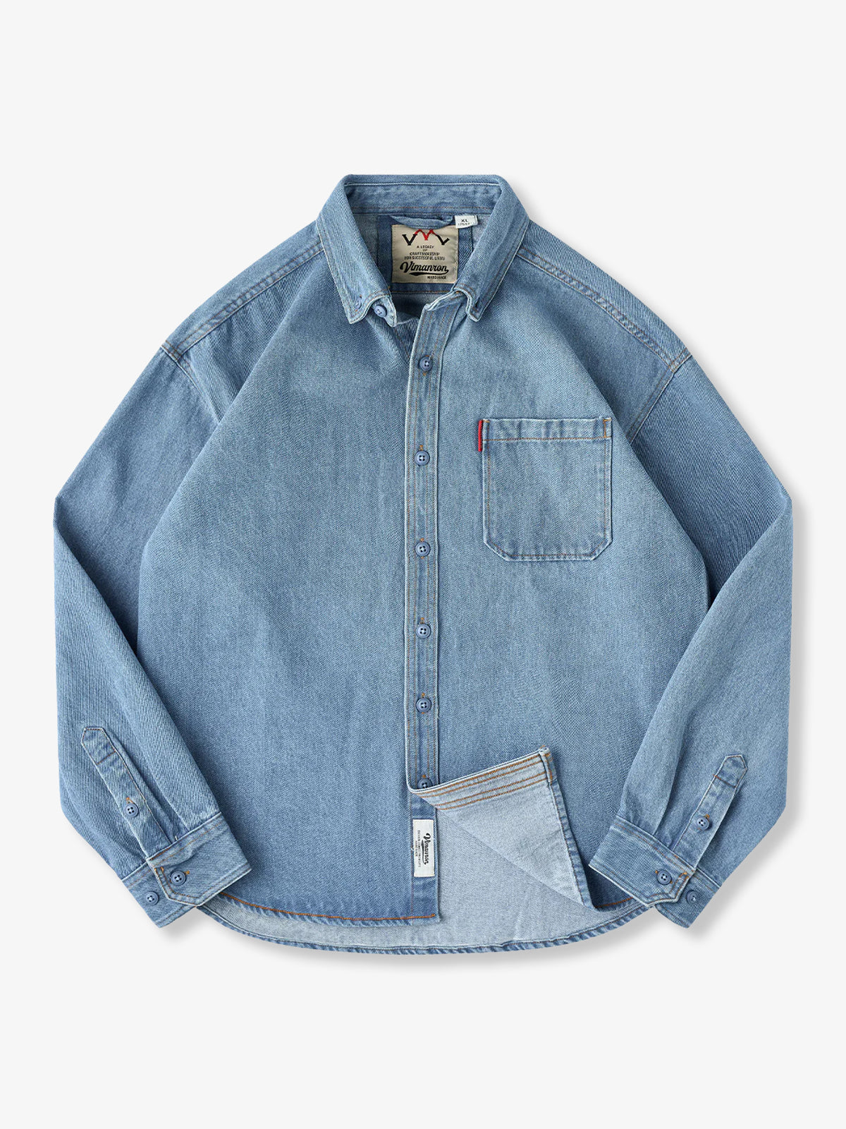 A denim work shirt that combines the ruggedness of traditional workwear with easy-to-wear styling. The washed finish gives a subtly faded, vintage-like look and a soft texture that feels comfortable from the very first wear. The rounded hem makes it easy to balance whether worn untucked, lightly layered, or styled for a layered look. The slightly longer back hem adds movement and a dynamic silhouette. Available in two colors, each offering a distinct vibe.