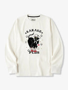 This playful long-sleeve tee features a black cat wearing a cowboy hat and boots, bringing a humorous and friendly vibe to your outfit. The cat’s yellow eyes naturally draw attention to the center of the design. A horseshoe motif symbolizes luck and complements the cowboy theme, while small star details add movement and energy without disturbing the overall balance. The clean white base makes it easy to style with a variety of outfits. Ribbed cuffs enhance comfort, warmth, and casual appeal.