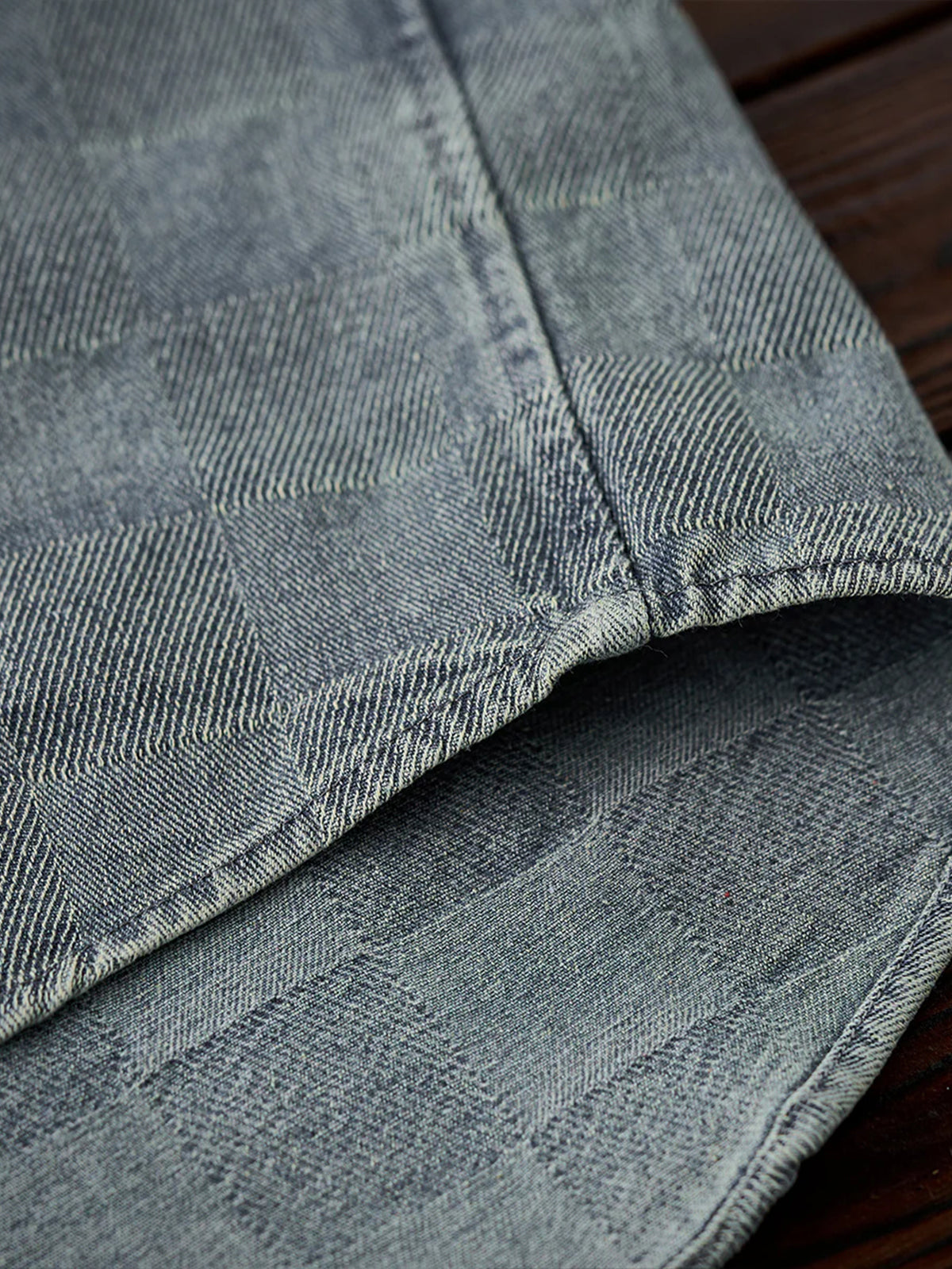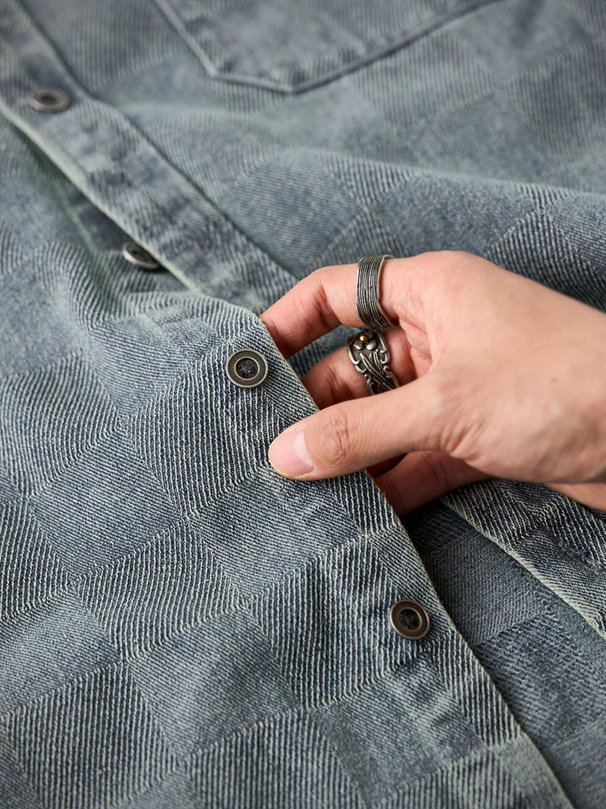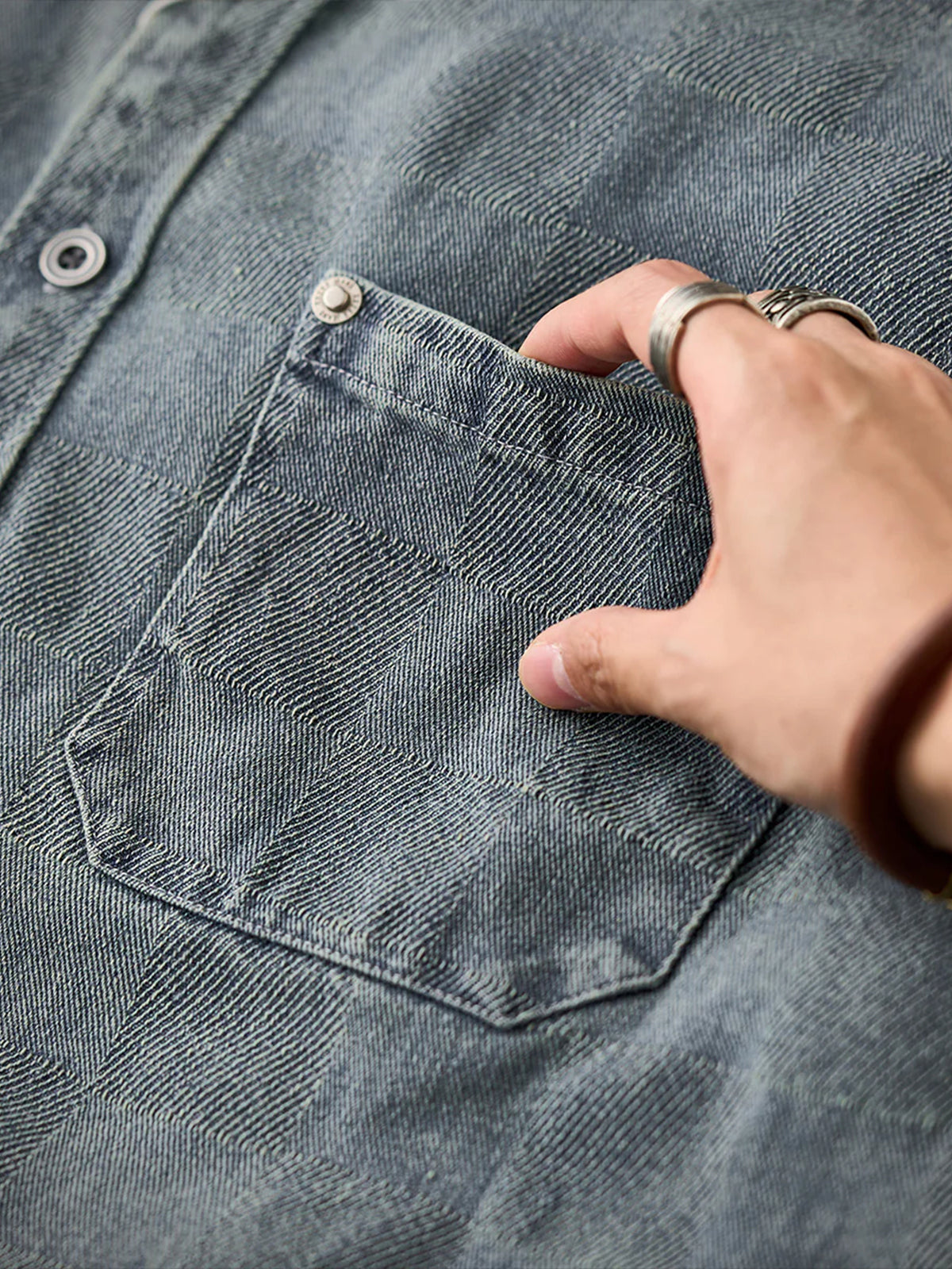 The entire area is designed with a checkered weave, and the pattern created by the weaving creates a casual three-dimensional luxury feel. The design on the front is simple without any additional decoration, giving an elegant impression. A pocket is used to store the typical practical details of a work shirt. The sleeves are slightly longer and have button cuffs that fit the wrist. The hem is designed with a round cut to create a natural style.