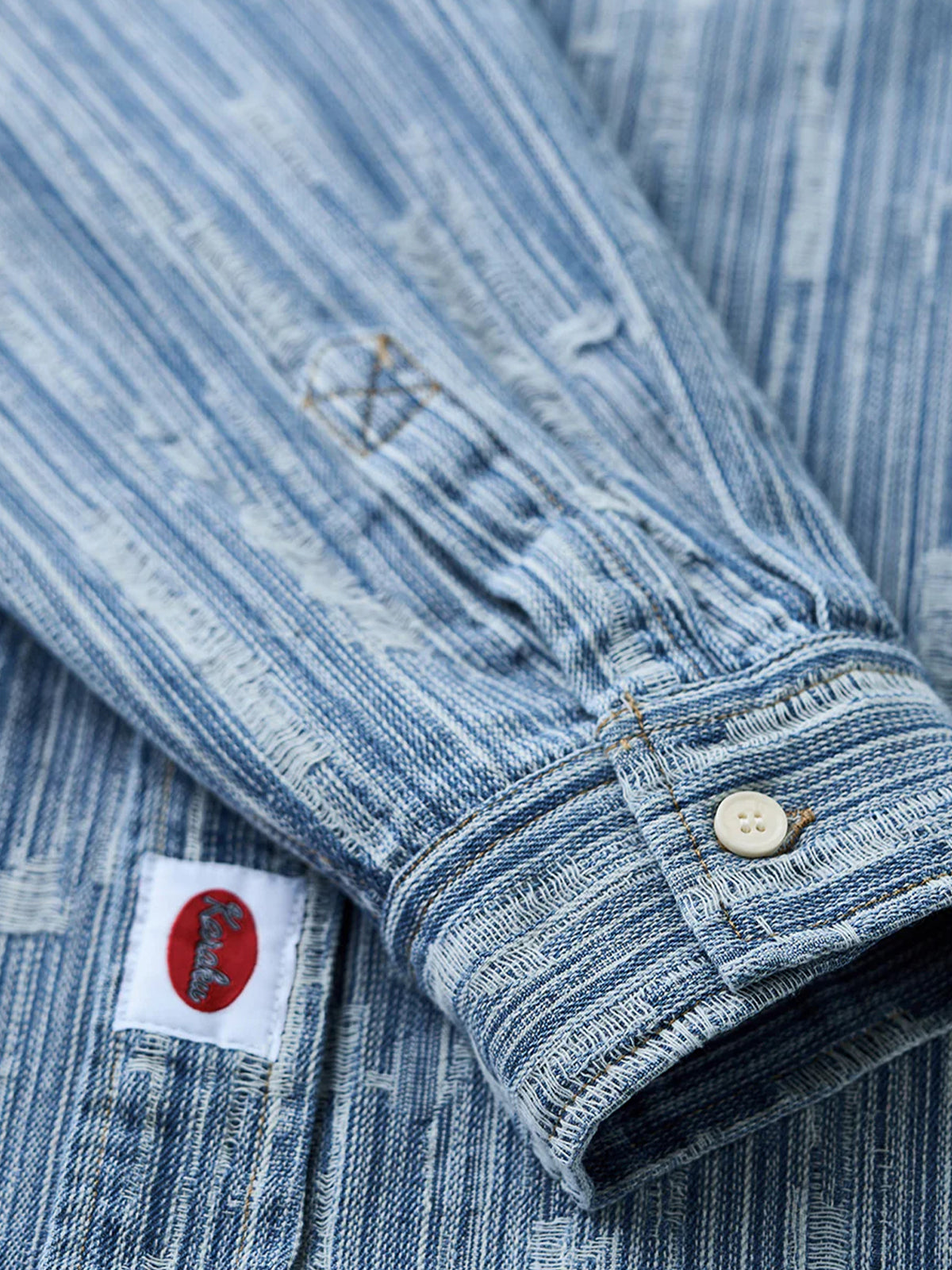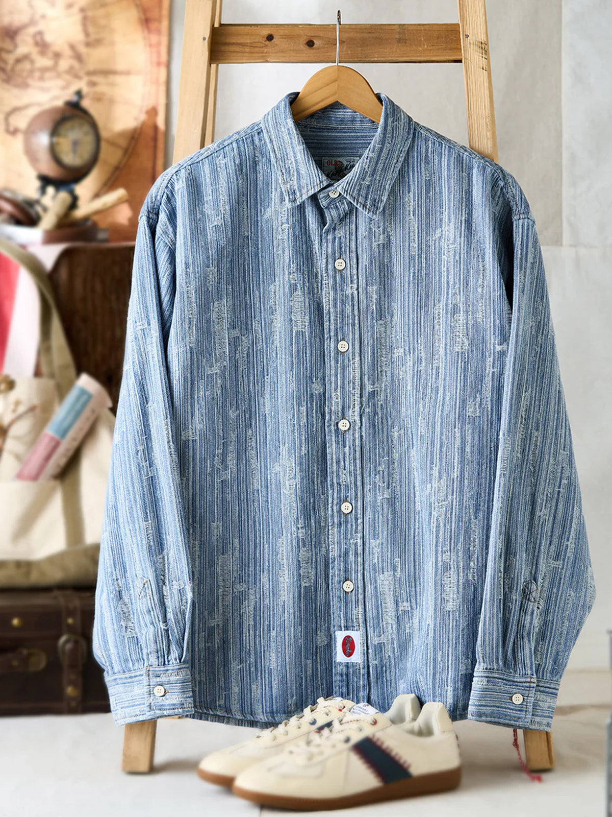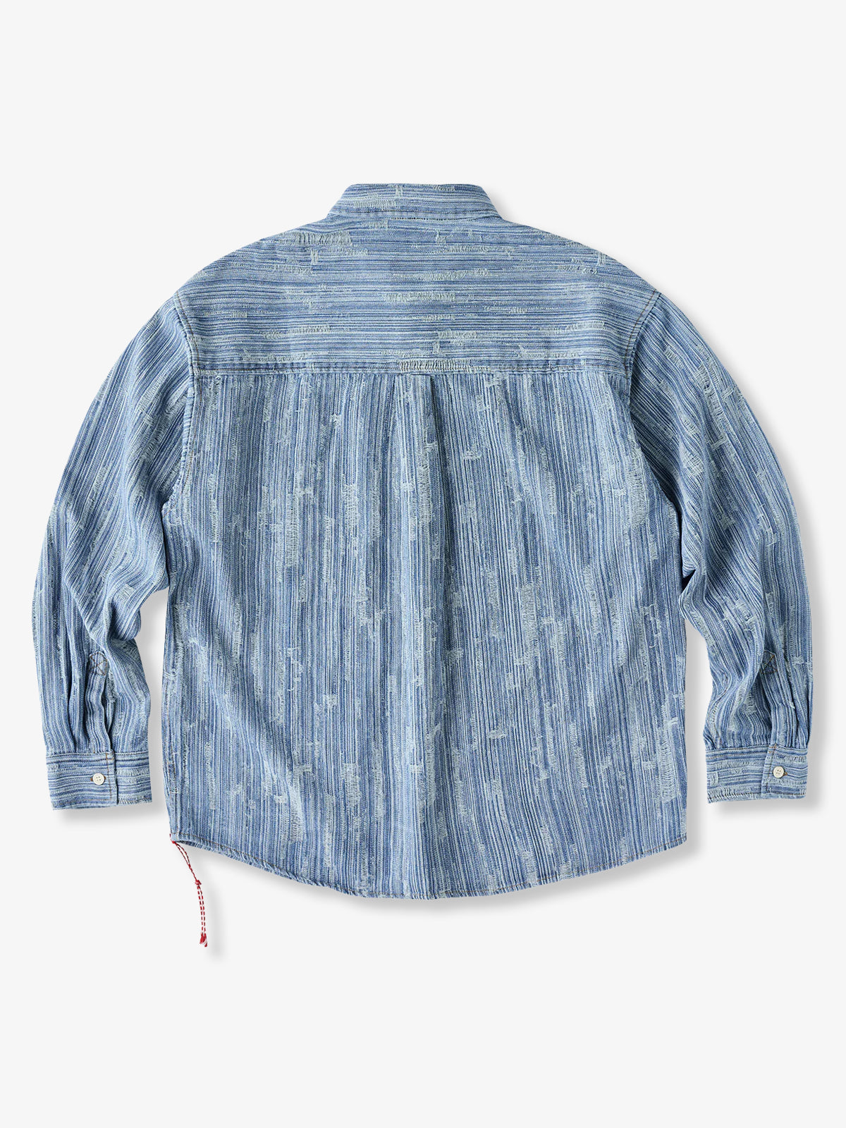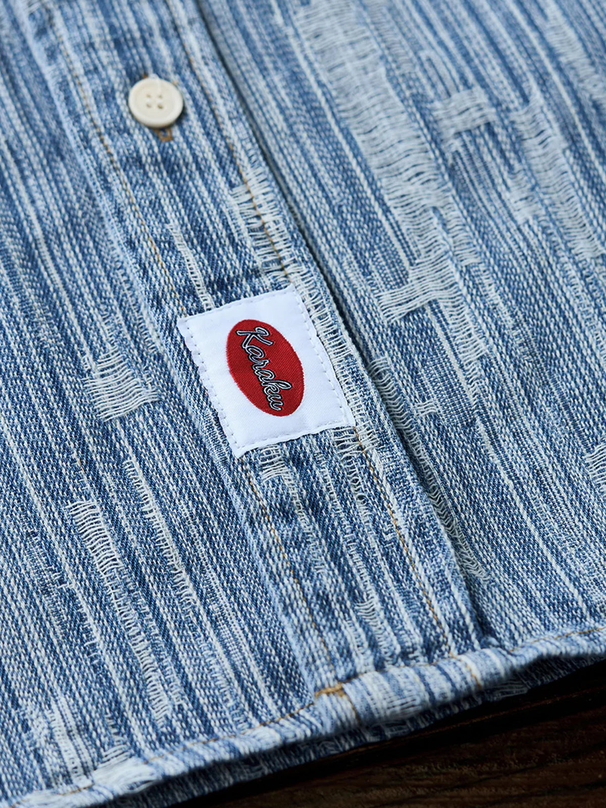 Denim Shirt in Jacquard Weave with Shell Buttons and Red-and-White Drawstring