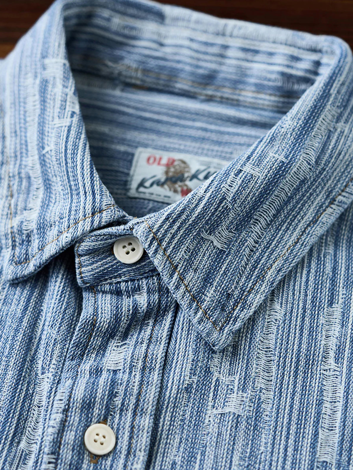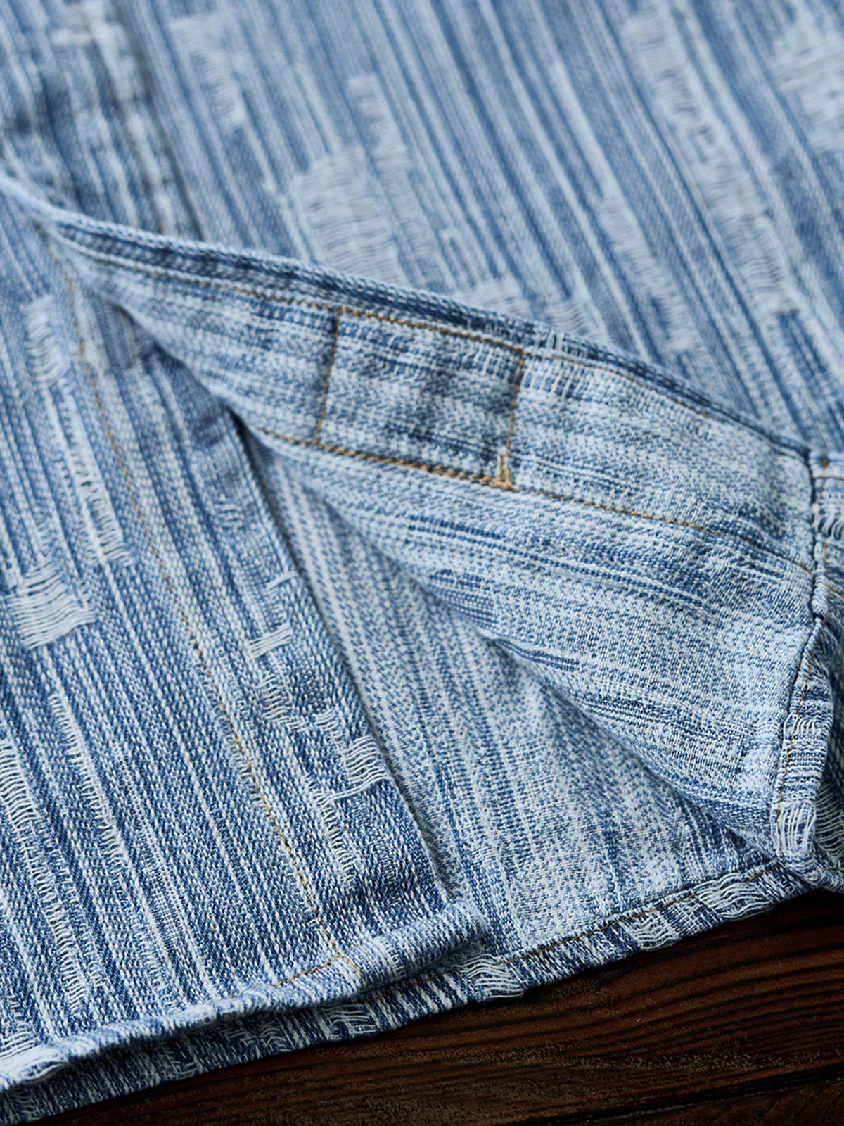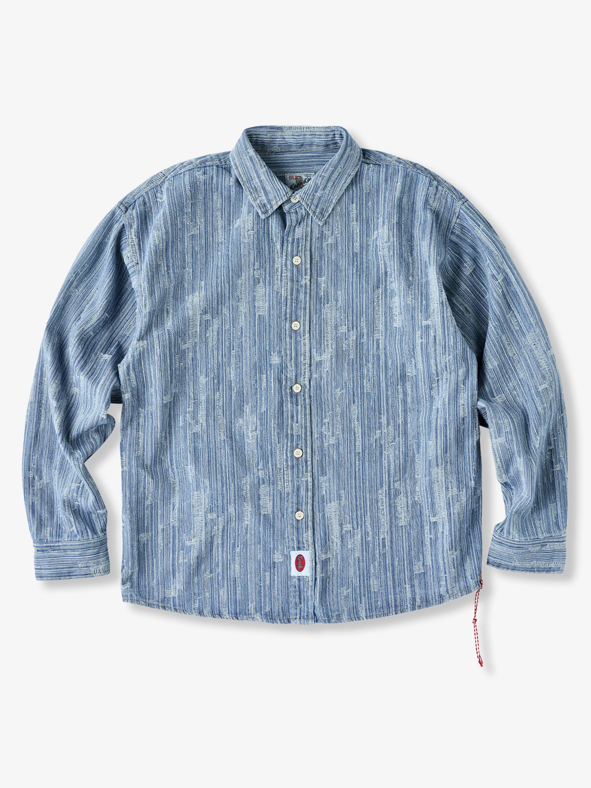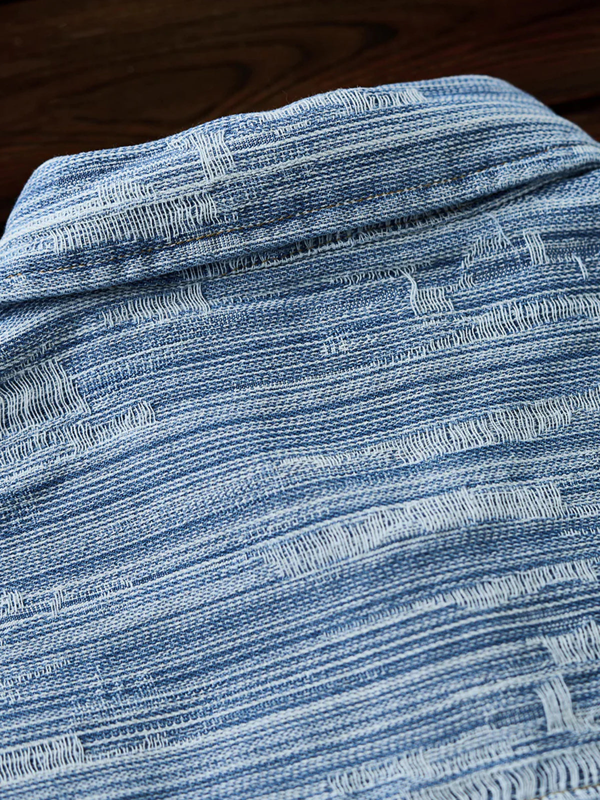 Denim Shirt in Jacquard Weave with Shell Buttons and Red-and-White Drawstring