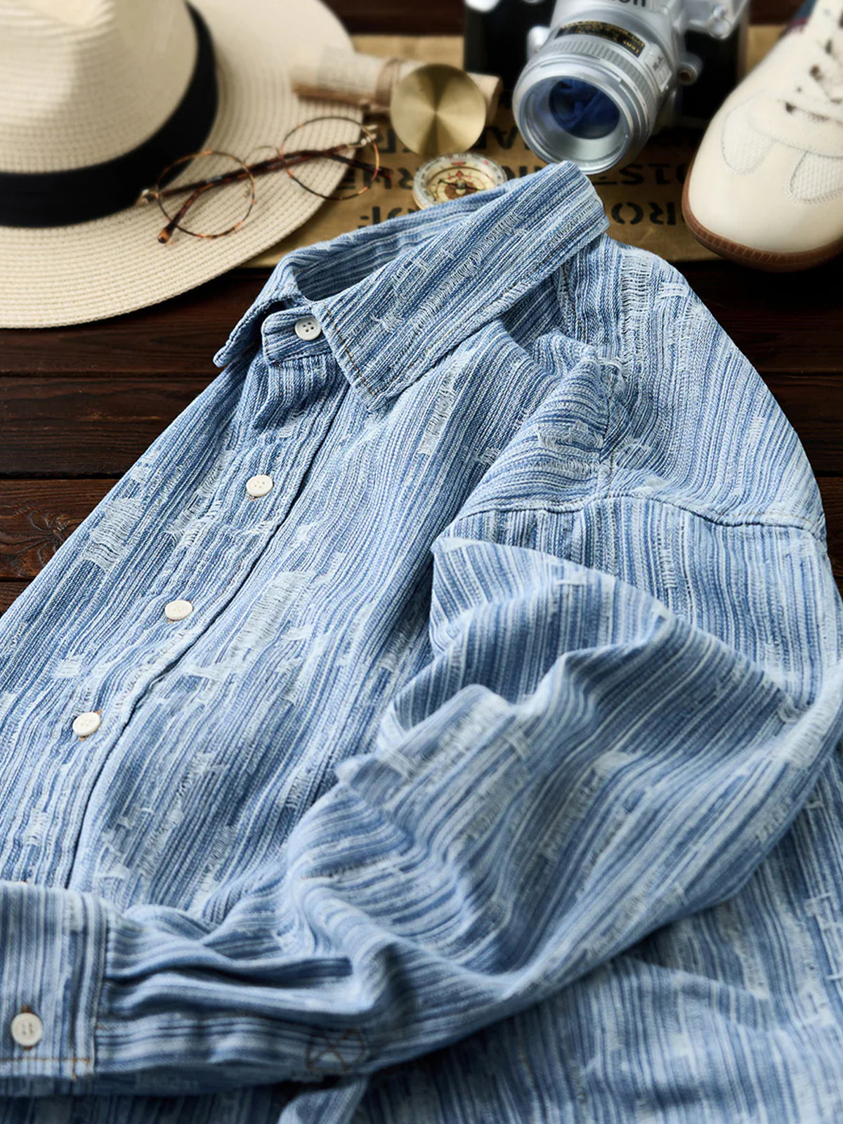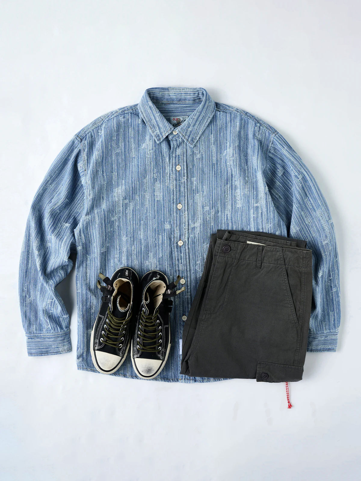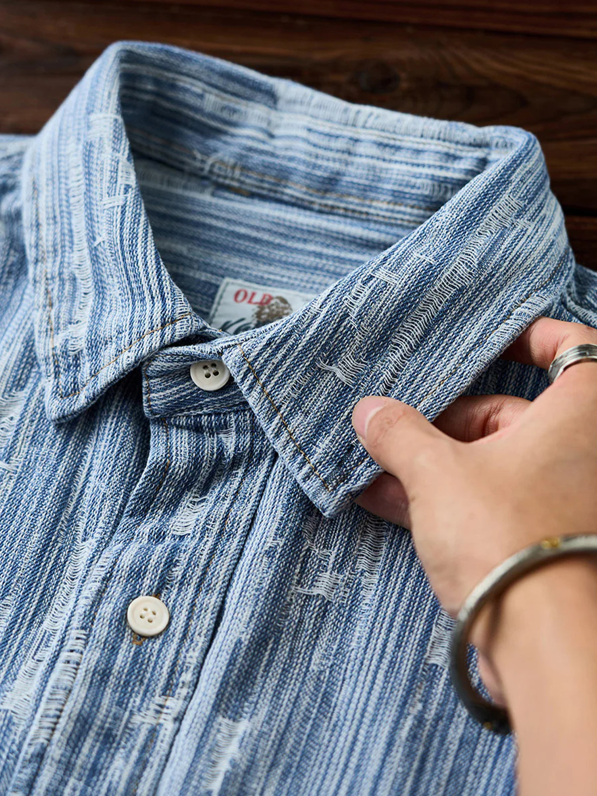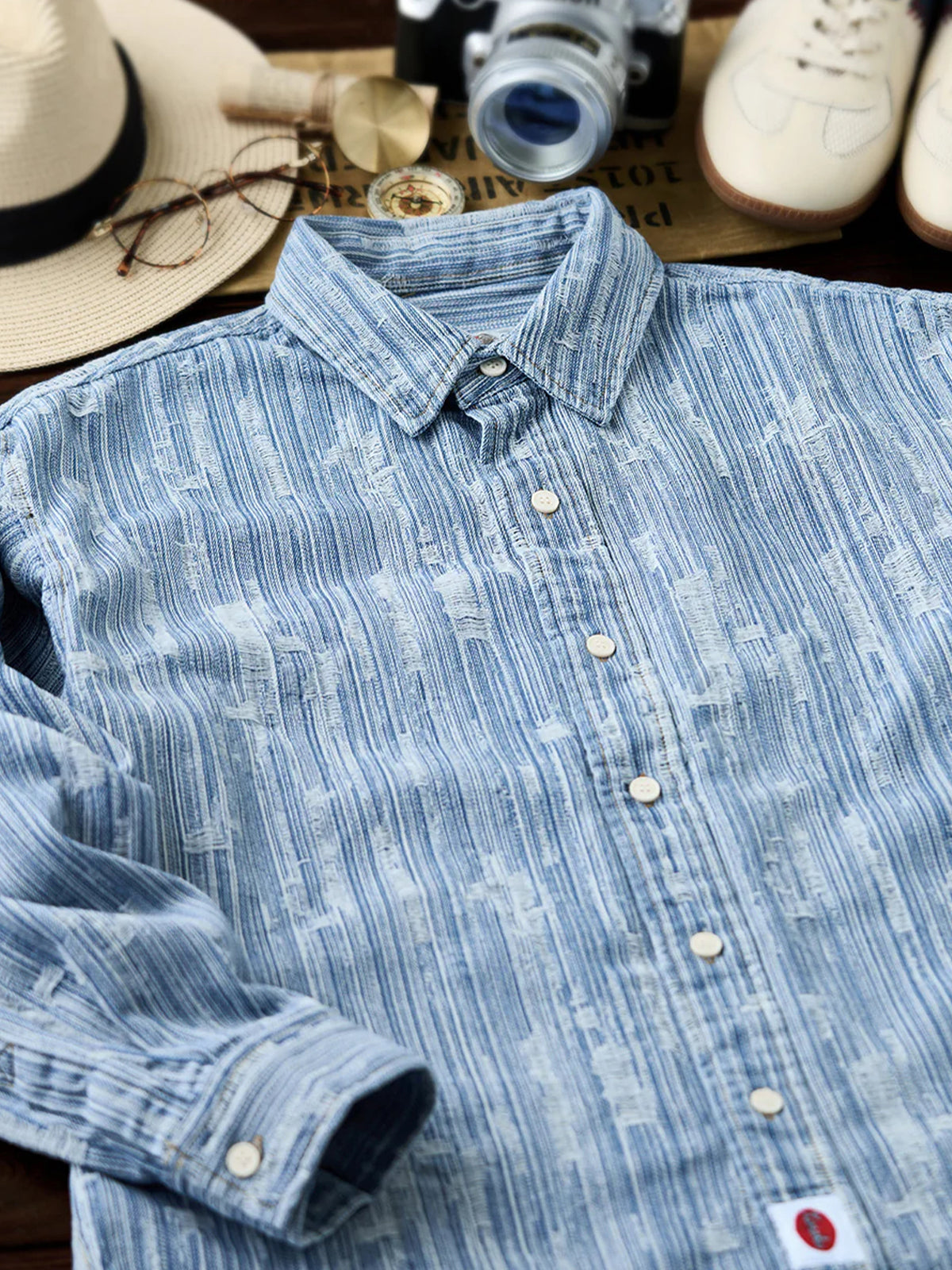 Denim Shirt in Jacquard Weave with Shell Buttons and Red-and-White Drawstring