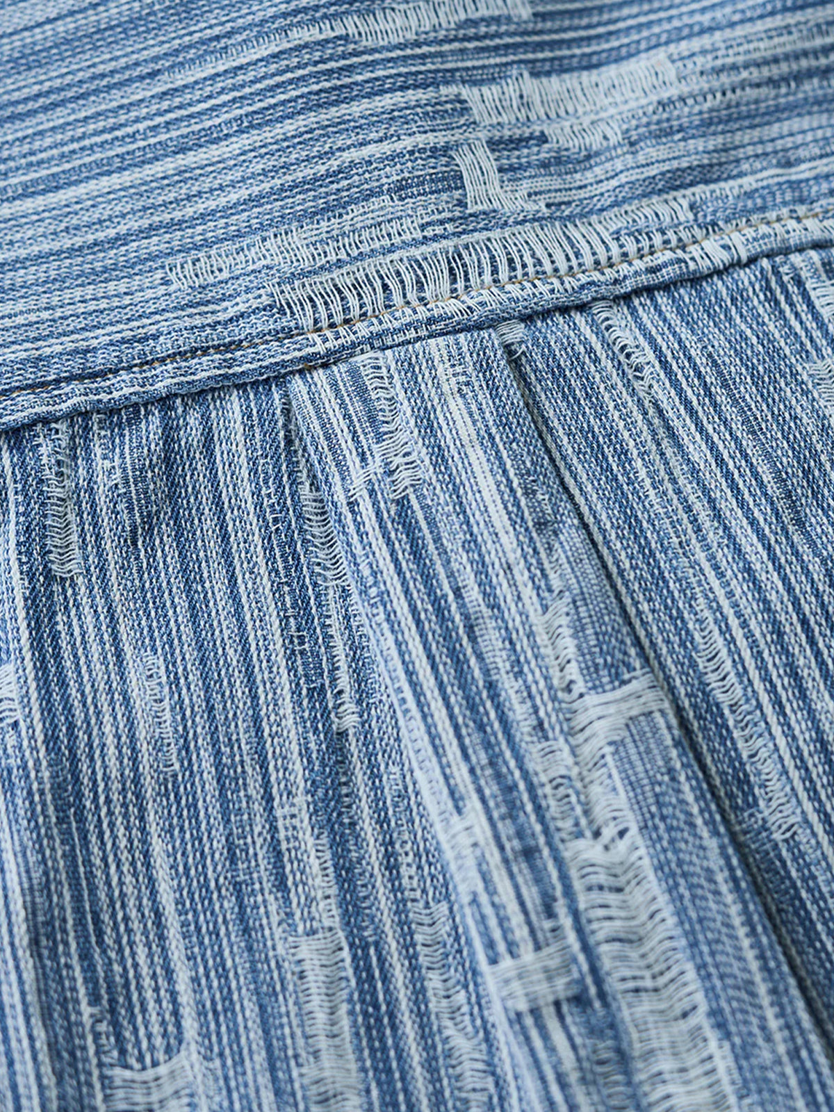 The vertical stripes and random woven patterns give viewers a sense of movement and depth. Thanks to the three-dimensional feel of the jacquard weave and its fine details, the pattern subtly changes depending on how the light hits it, creating a richer and more expressive impression.