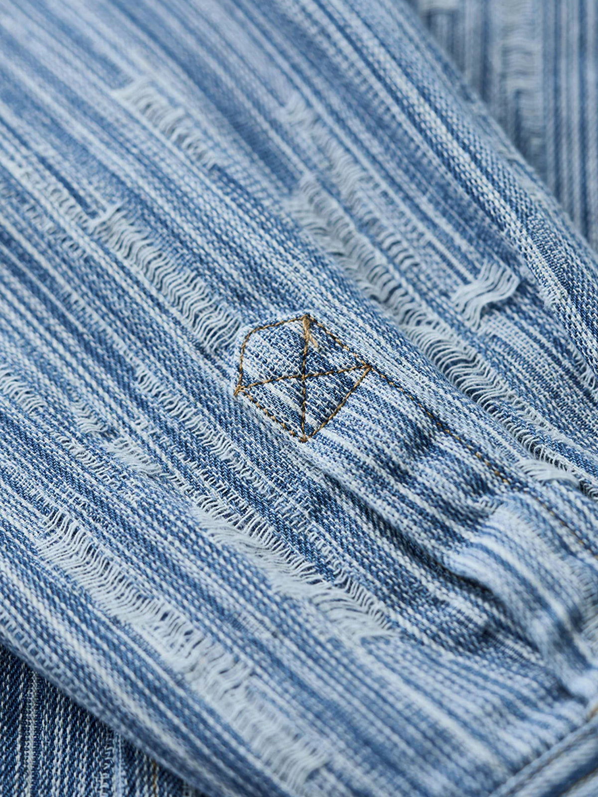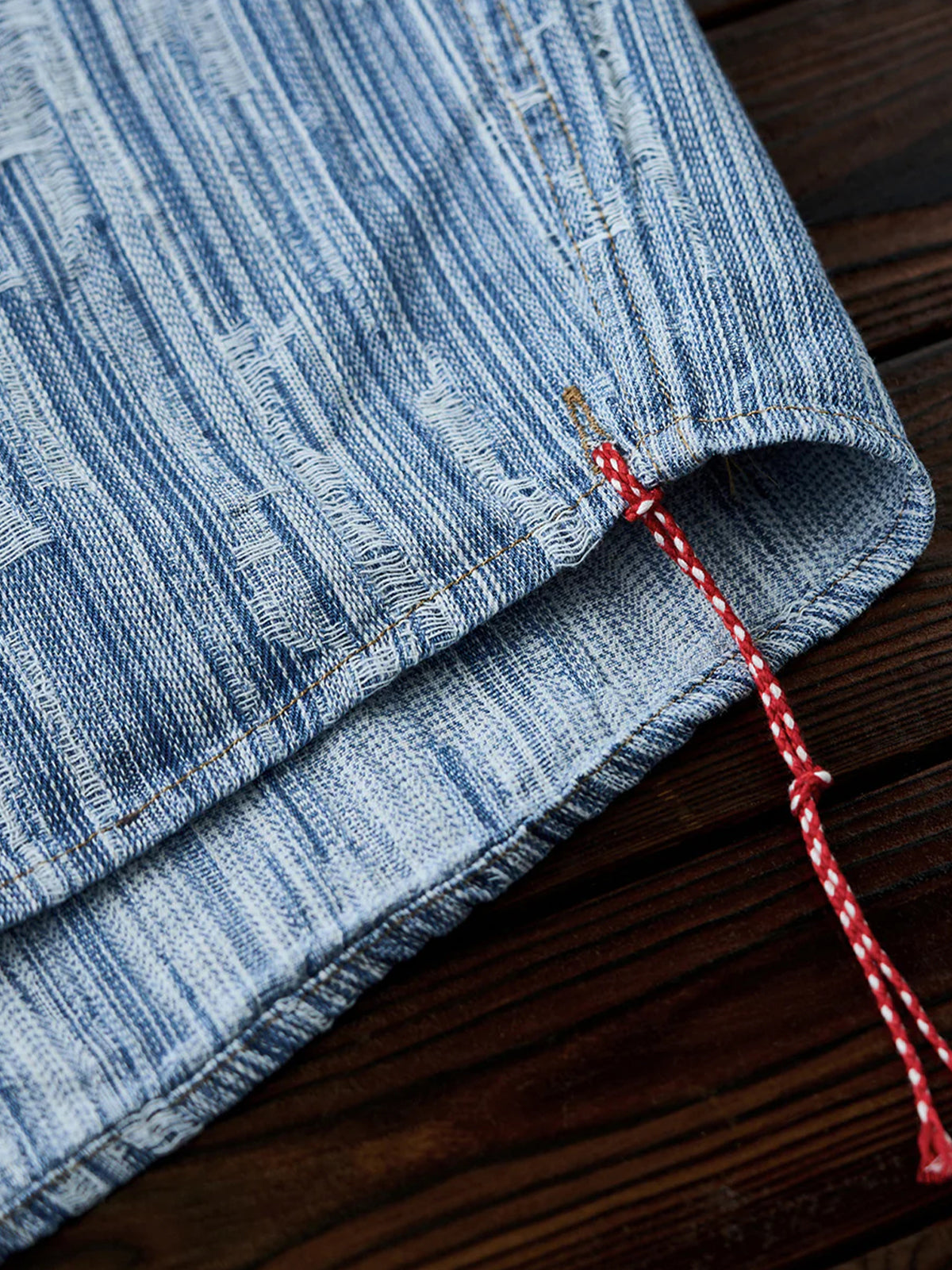 The shell buttons come in a simple white tone, harmonizing with the denim’s color and pattern. The red and white strings attached to the left hem serve as a decorative element.