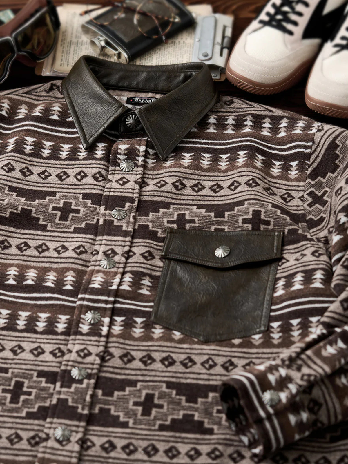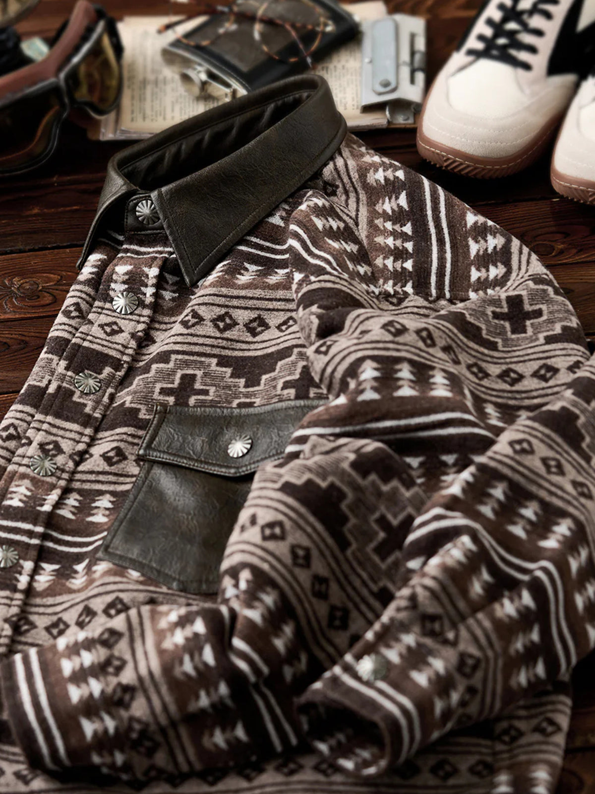 The collar and pocket sections are made of PU leather, giving a sense of luxury and a moderate firmness. The leather texture contrasts with the soft tweed fabric of the shirt, serving as a striking accent. Custom-made buttons are used, harmonizing with the ethnic-style patterns, while the metallic texture adds sophistication to the design. The body features woven geometric patterns and tree-like motifs, evoking both traditional and natural elements. The overall warm brown tones match the seasonal mood of autumn and winter.