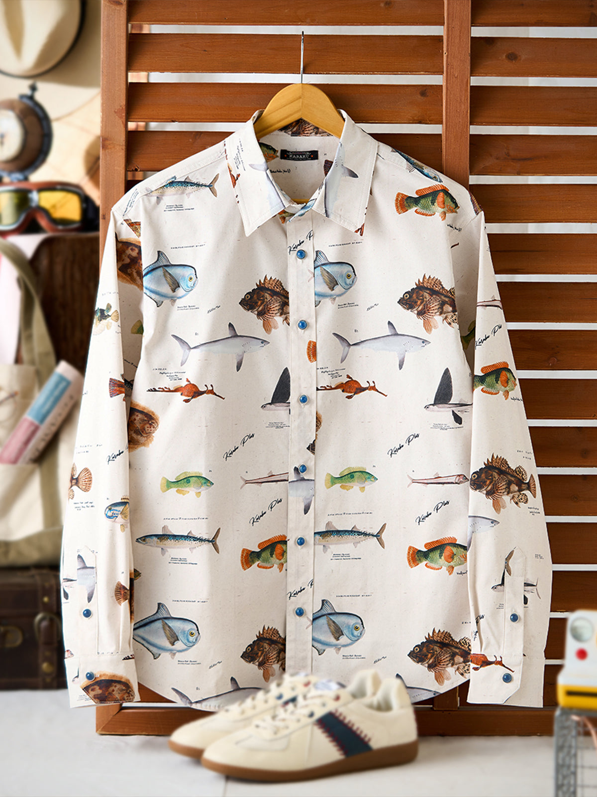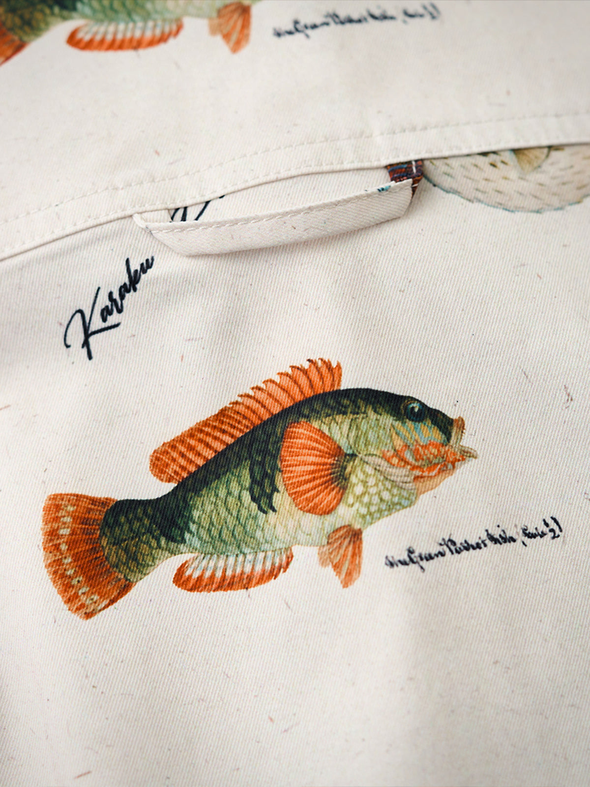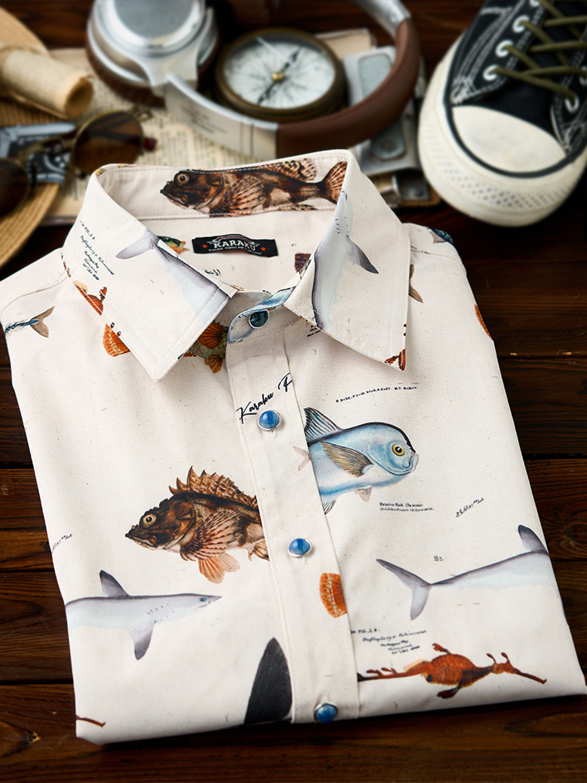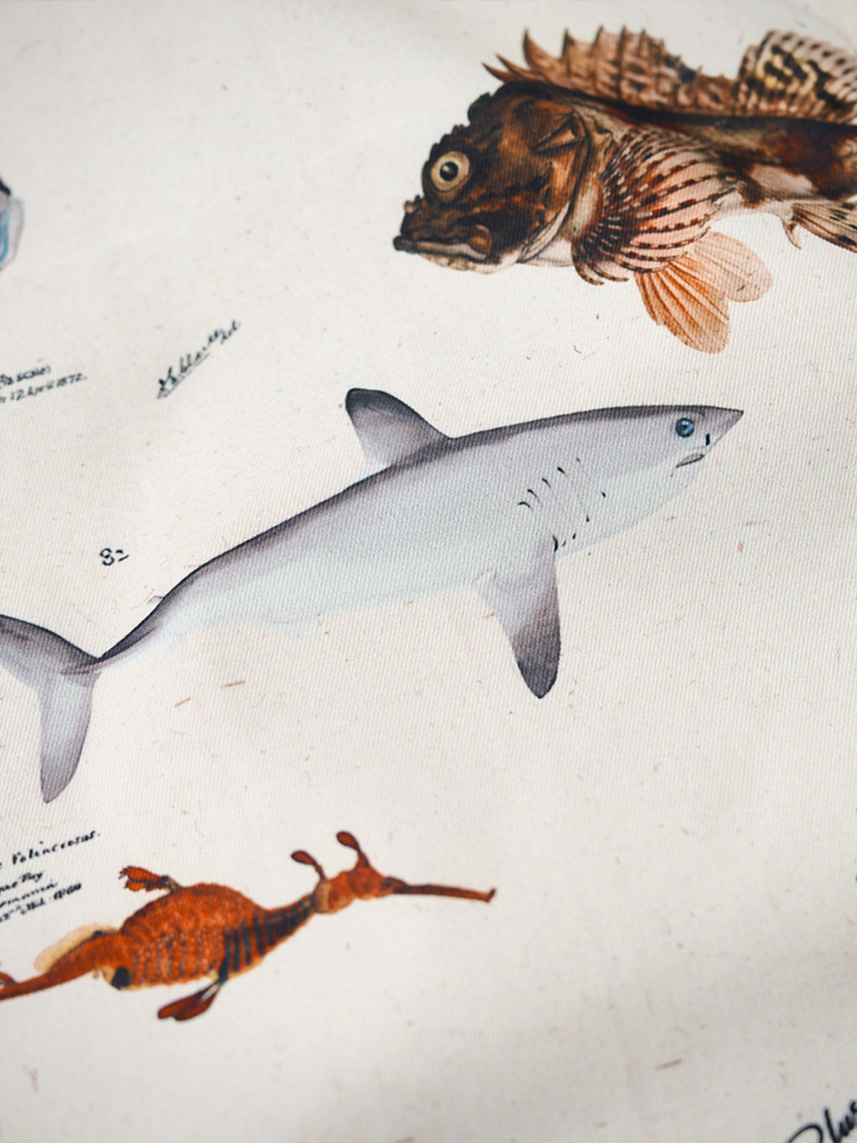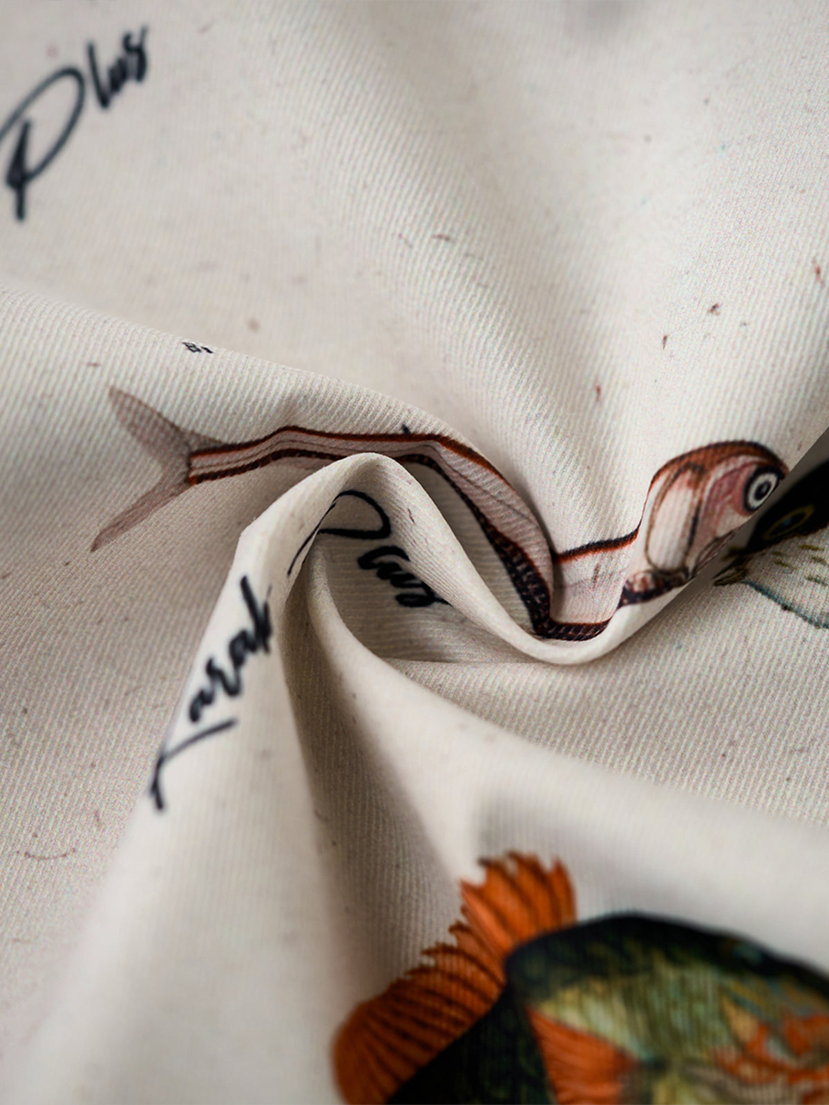 Inspired by vintage natural history illustrations, this shirt features detailed drawings of deep-sea fish accompanied by species names, Latin scientific terms, and occasional English annotations in small fonts—reminiscent of pages from a scientific encyclopedia. Each fish is faithfully rendered, highlighting scales, fins, and unique features without stylization. The ivory base color adds a clean and refined backdrop, allowing the natural red, green, brown, and blue tones of the fish to stand out. Although arranged without symmetry or strict repetition, the balanced mix of size, orientation, and color depth creates a visually captivating composition that never feels overwhelming.