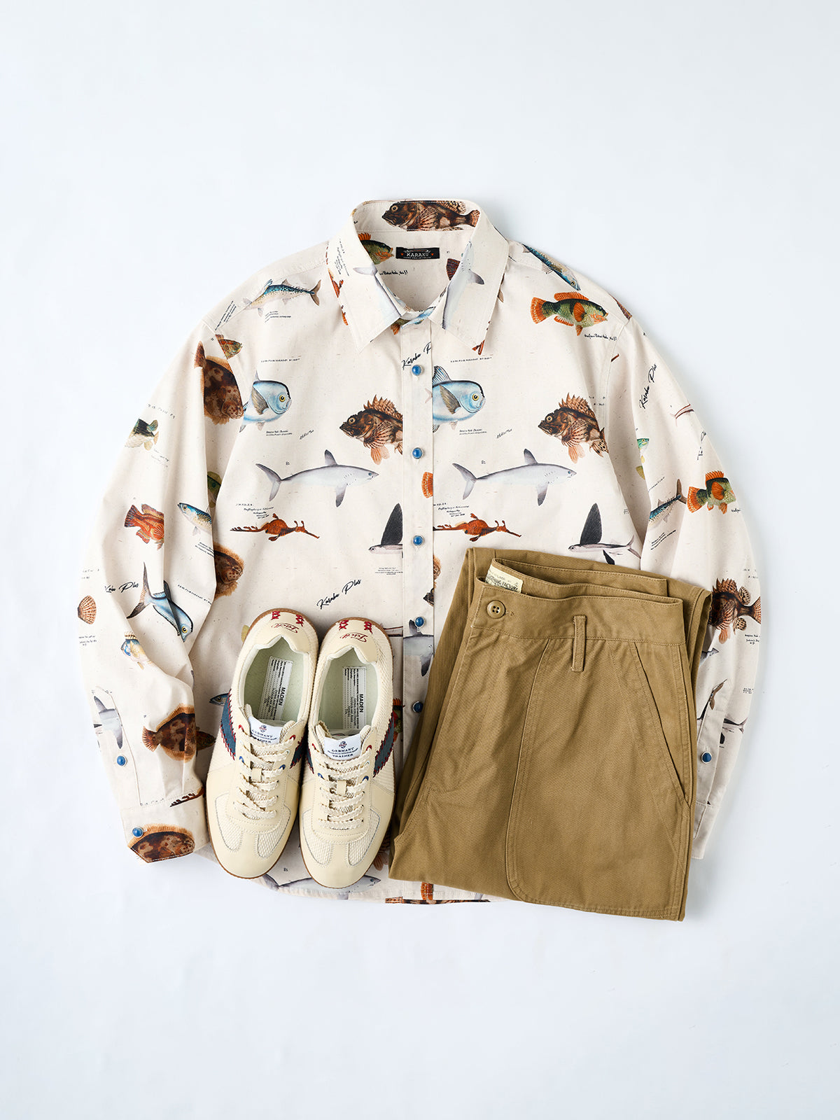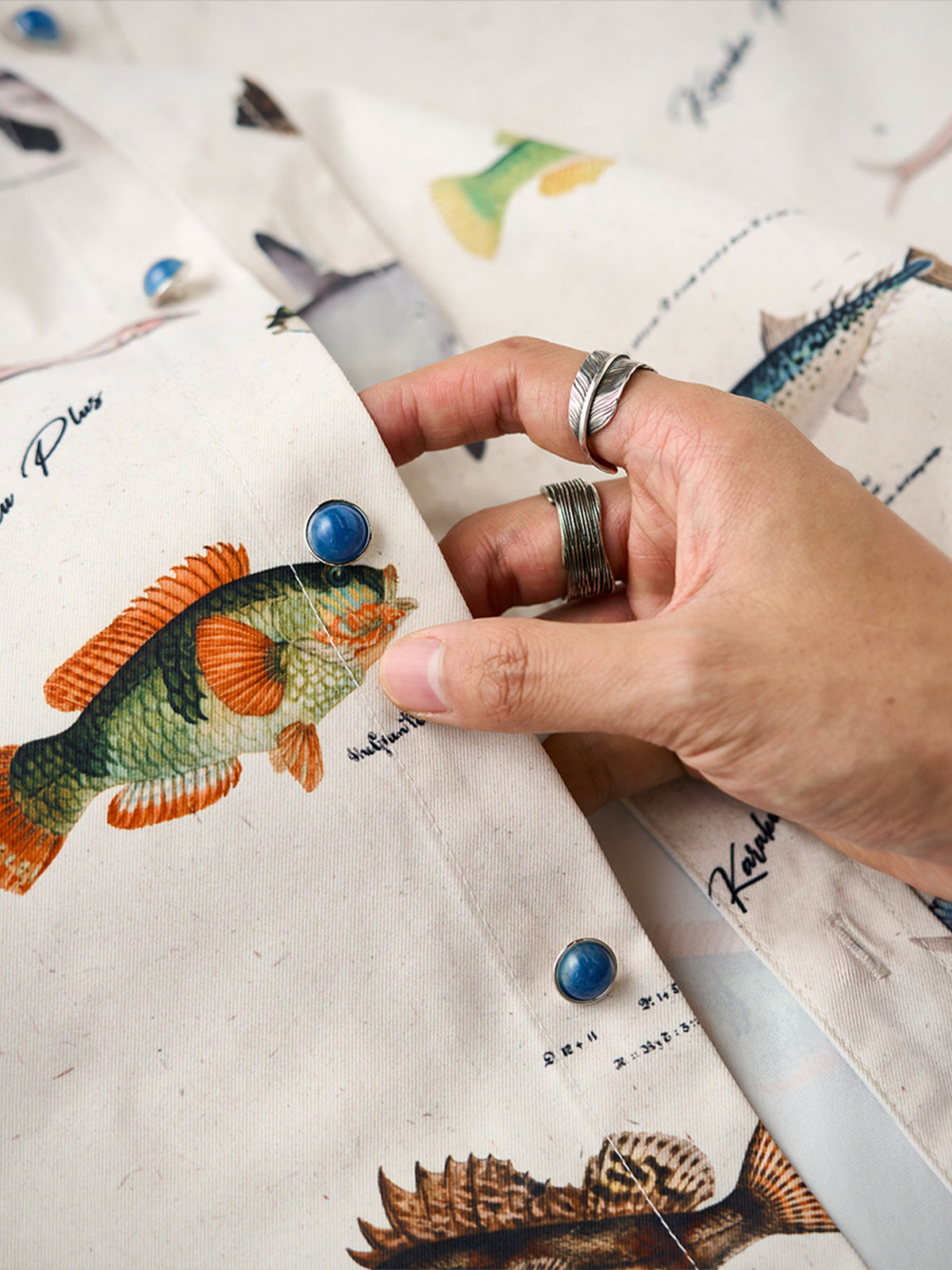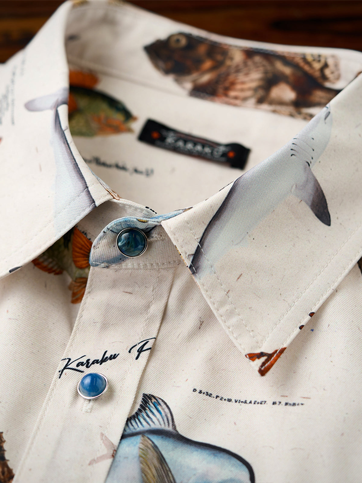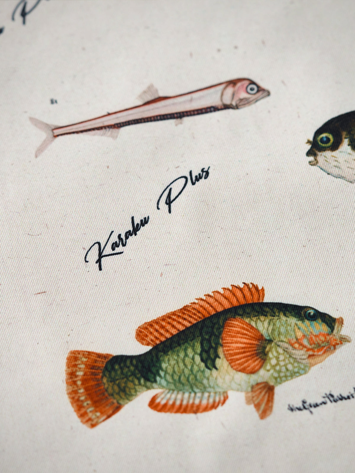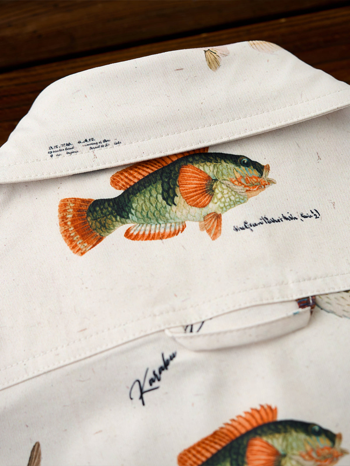 Inspired by vintage natural history illustrations, this shirt features detailed drawings of deep-sea fish accompanied by species names, Latin scientific terms, and occasional English annotations in small fonts—reminiscent of pages from a scientific encyclopedia. Each fish is faithfully rendered, highlighting scales, fins, and unique features without stylization. The ivory base color adds a clean and refined backdrop, allowing the natural red, green, brown, and blue tones of the fish to stand out. Although arranged without symmetry or strict repetition, the balanced mix of size, orientation, and color depth creates a visually captivating composition that never feels overwhelming.