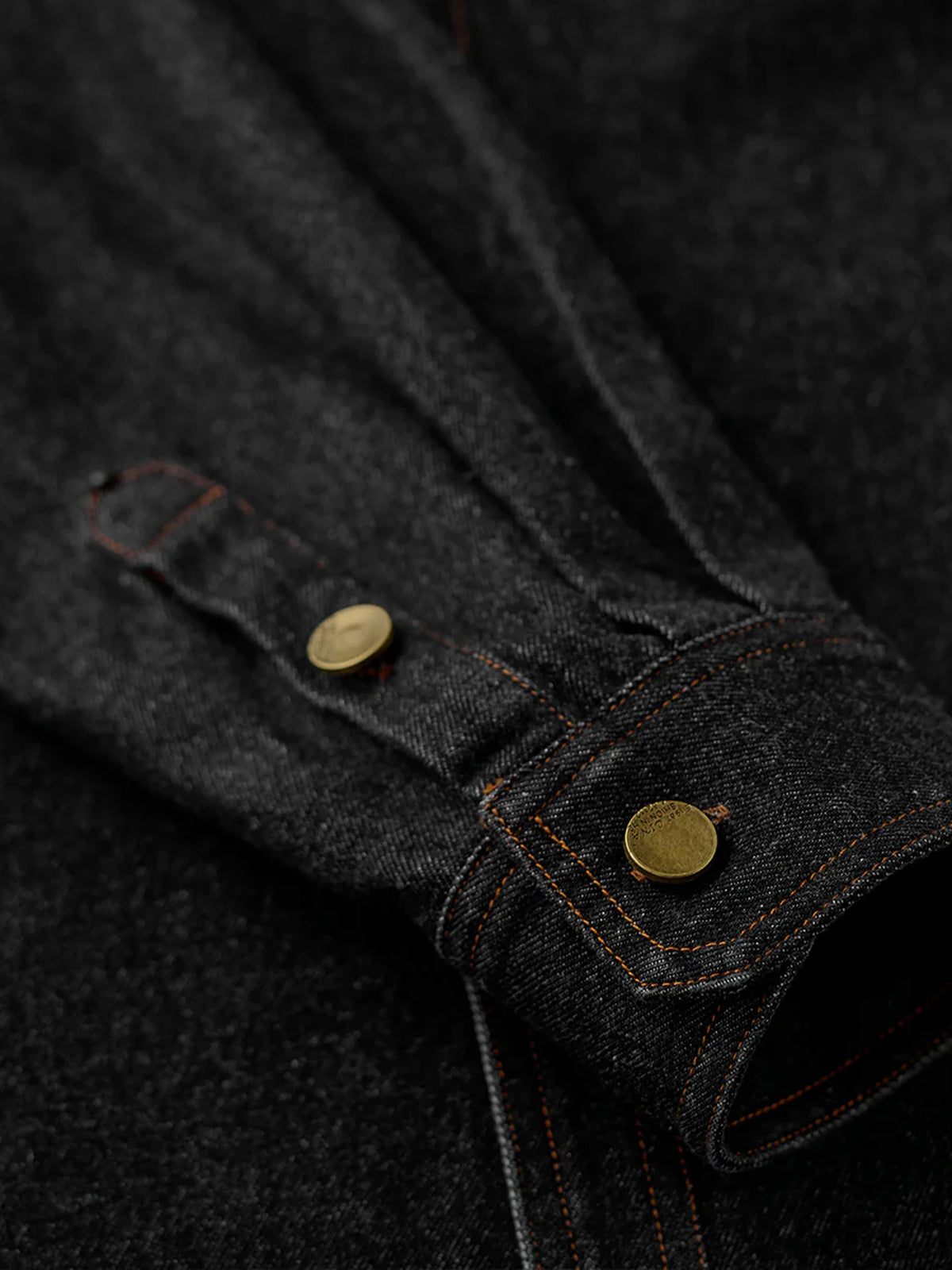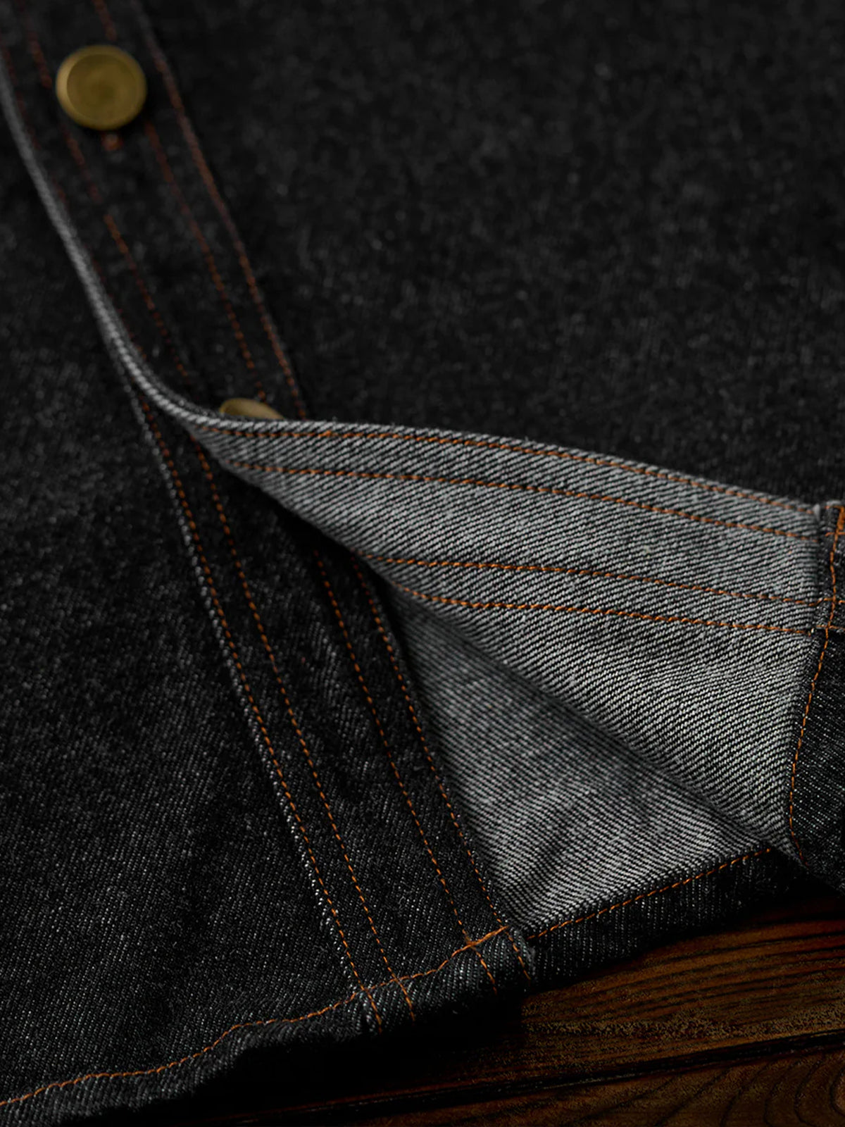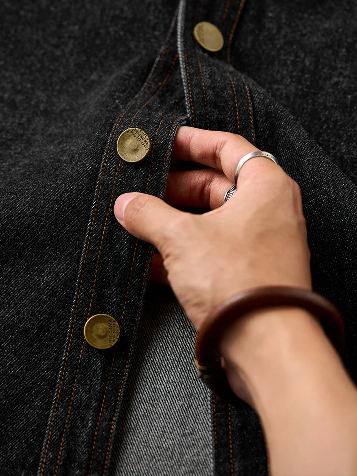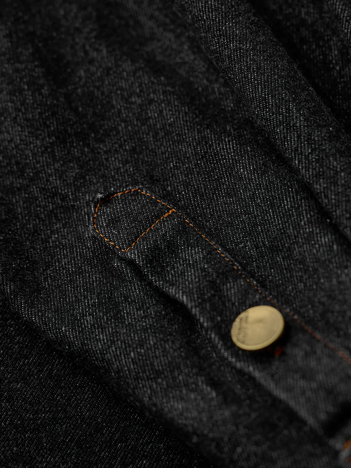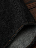 Bright brown stitching contrasts with the black denim, highlighting the details, and metal buttons add a rugged accent.