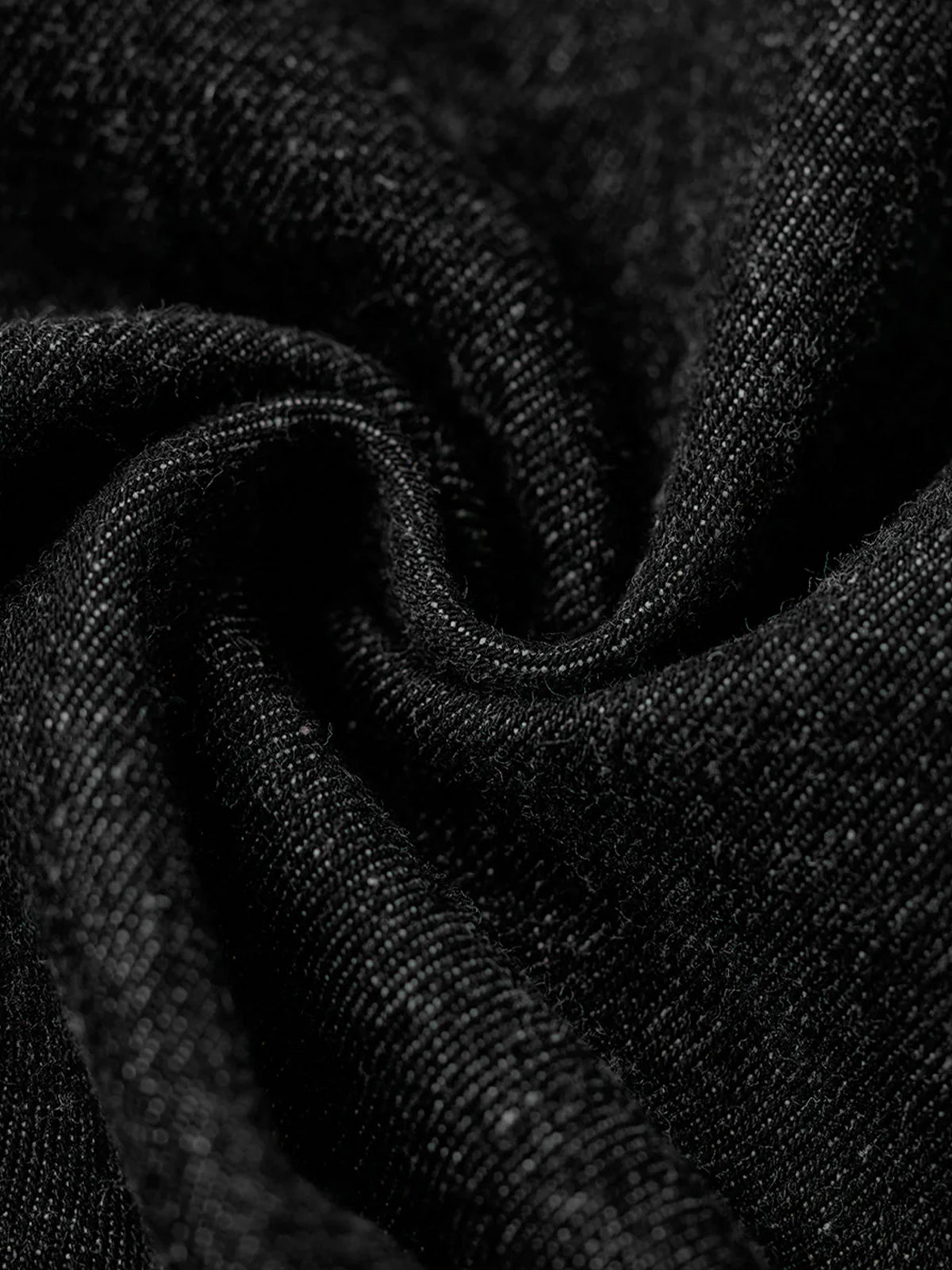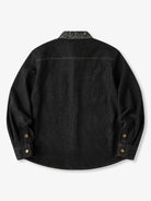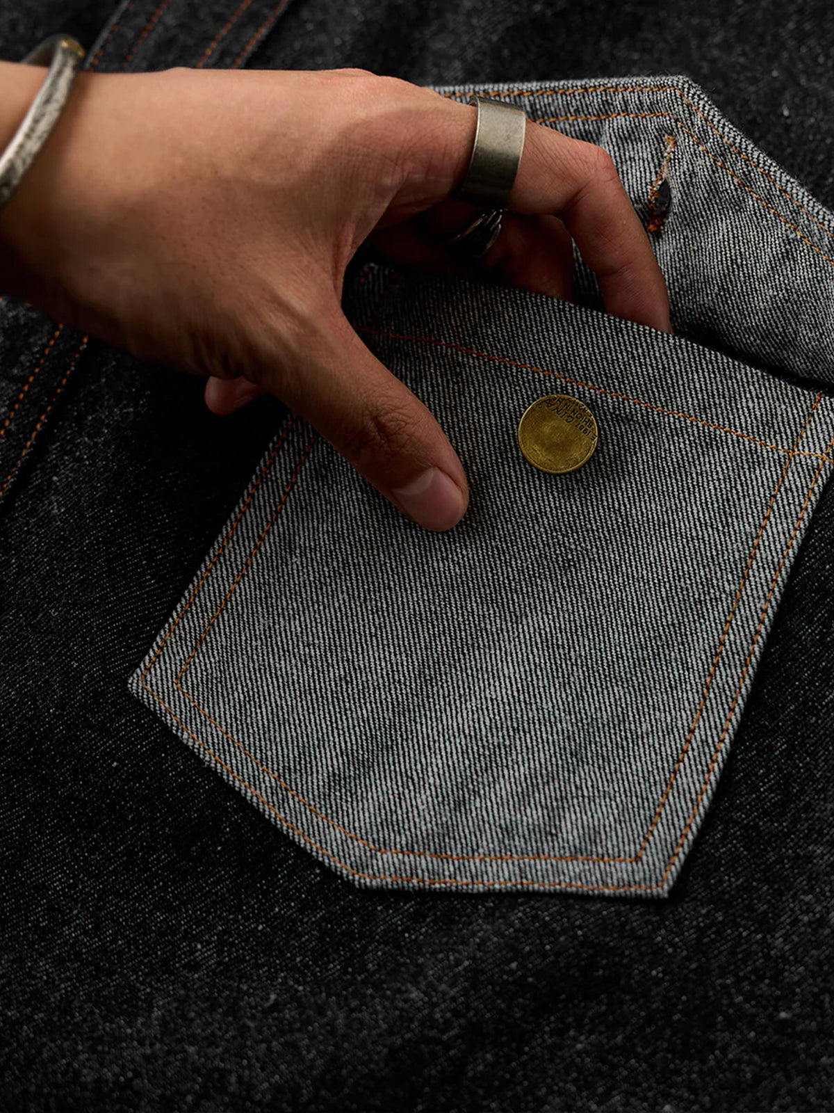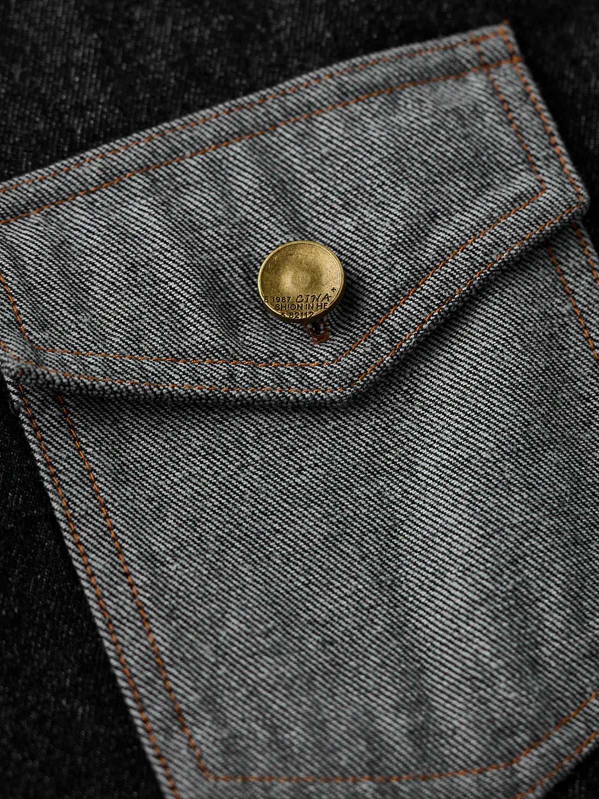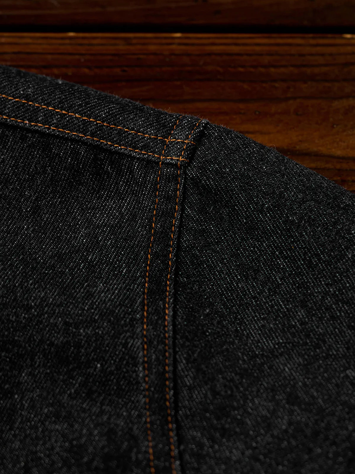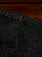 Bright brown stitching contrasts with the black denim, highlighting the details, and metal buttons add a rugged accent.