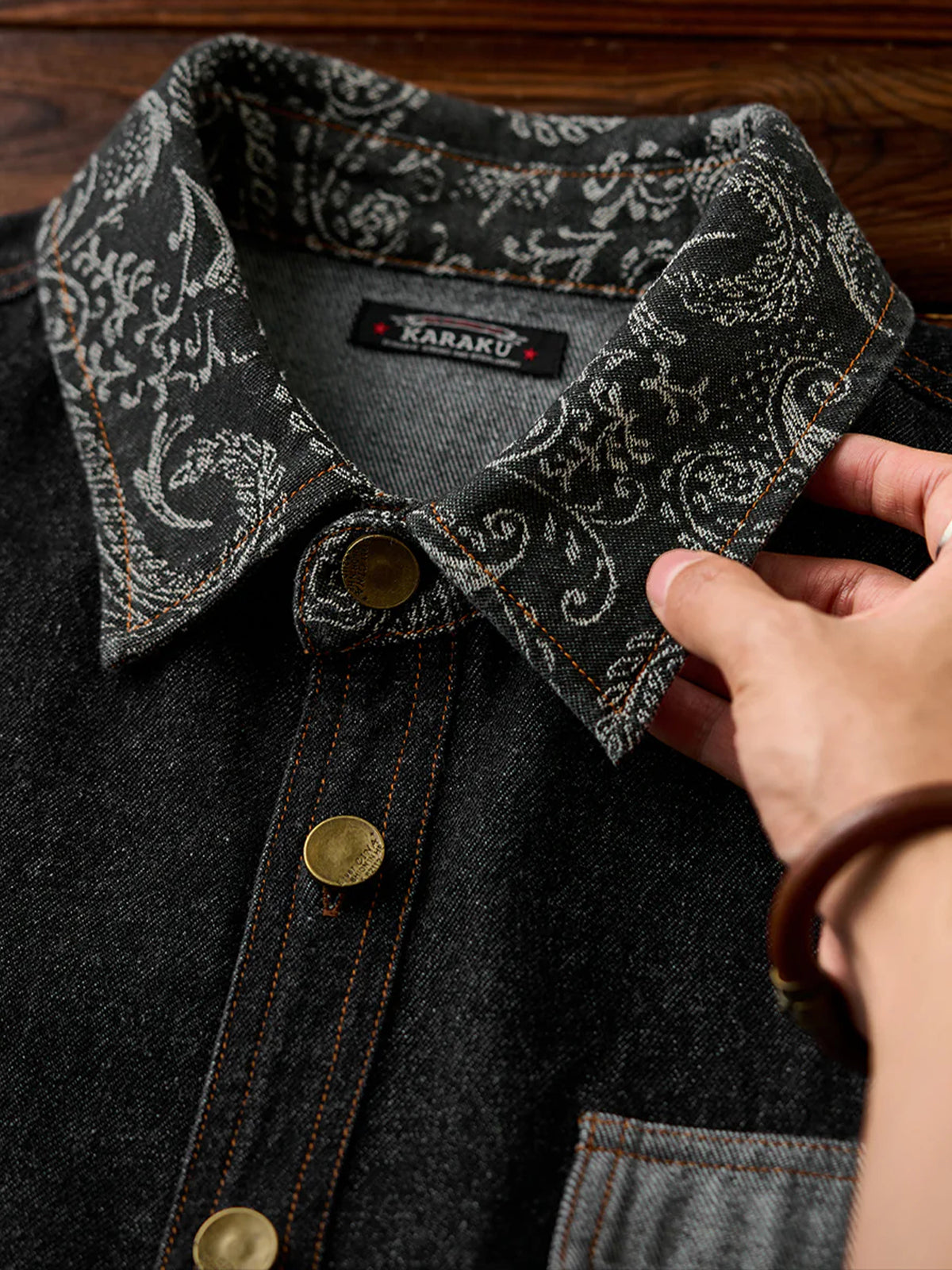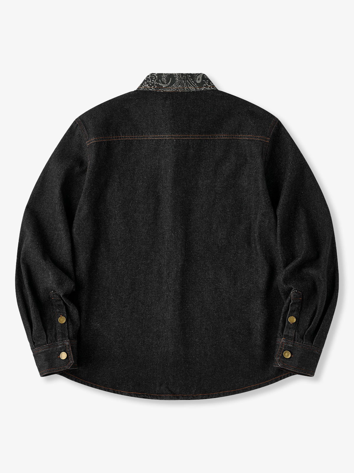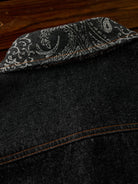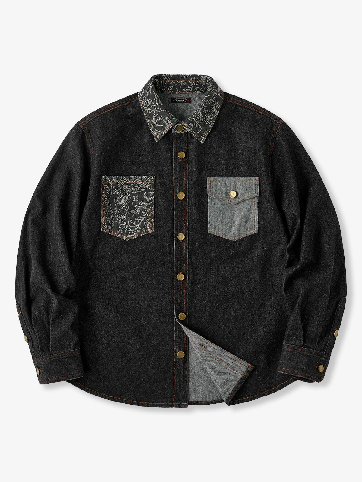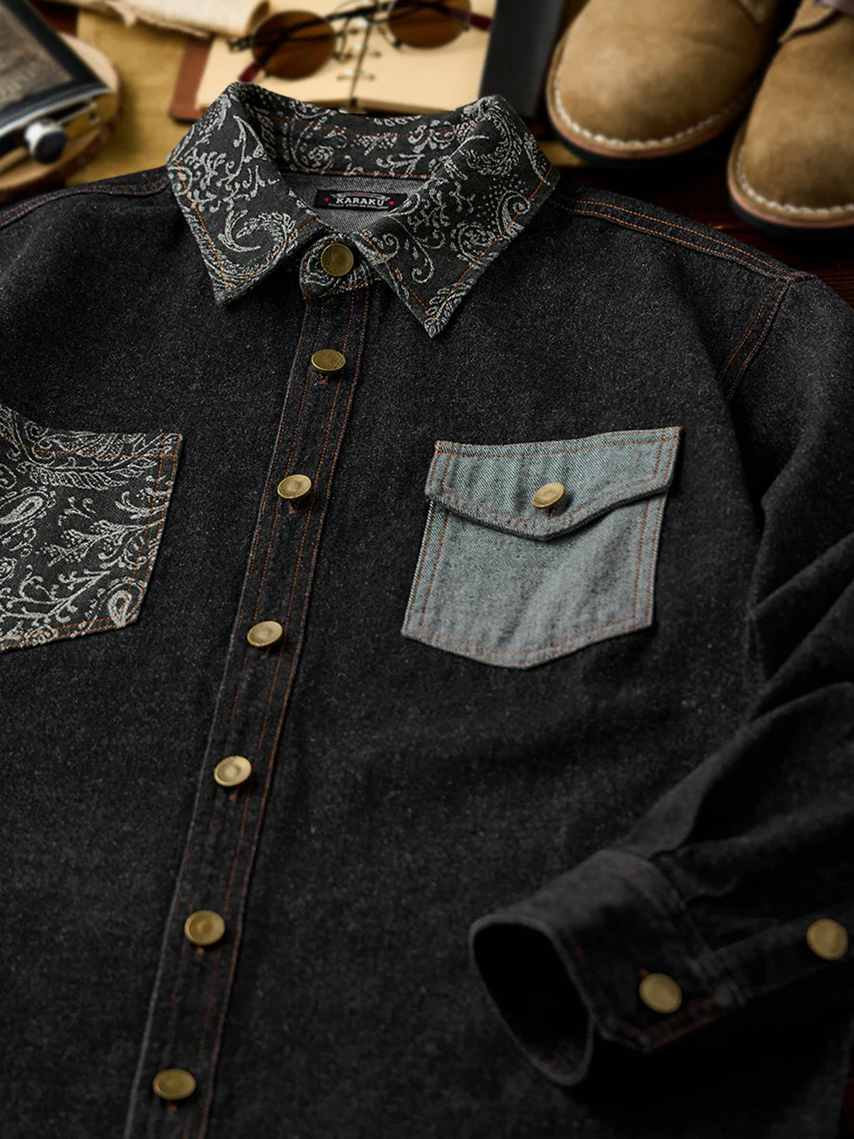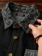 Jacquard-woven paisley patterns on the collar and left chest pocket add a touch of elegance to the shirt. The left chest pocket features the paisley pattern, while the right chest pocket is plain denim, creating an asymmetric design. The pockets also differ in shape, emphasizing the shirt’s unique design.