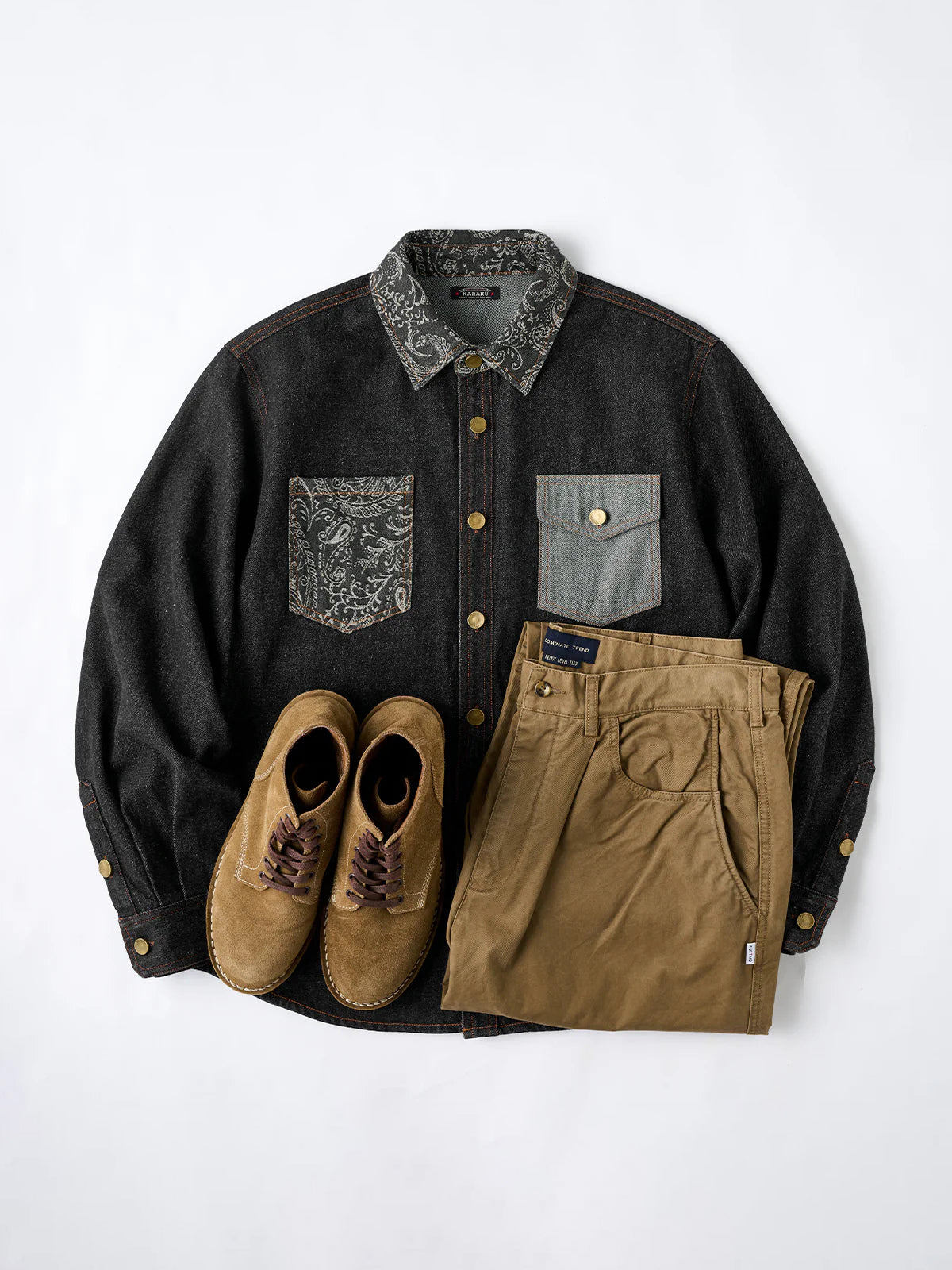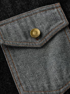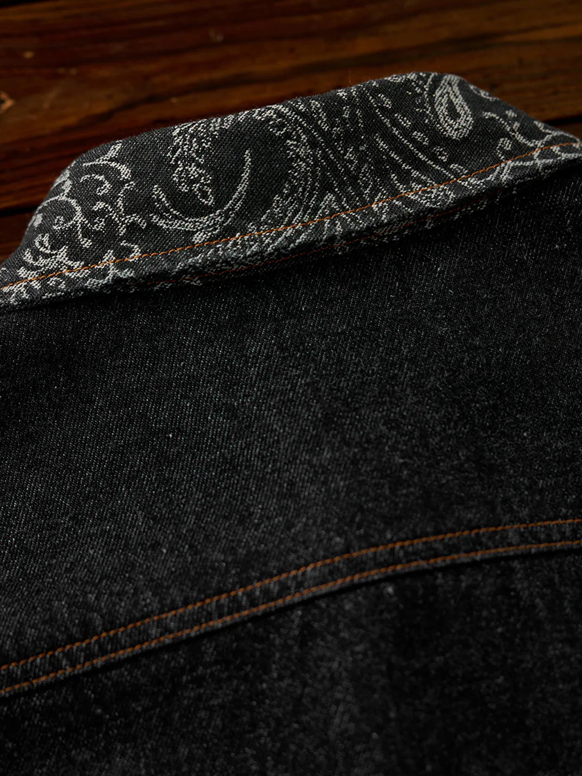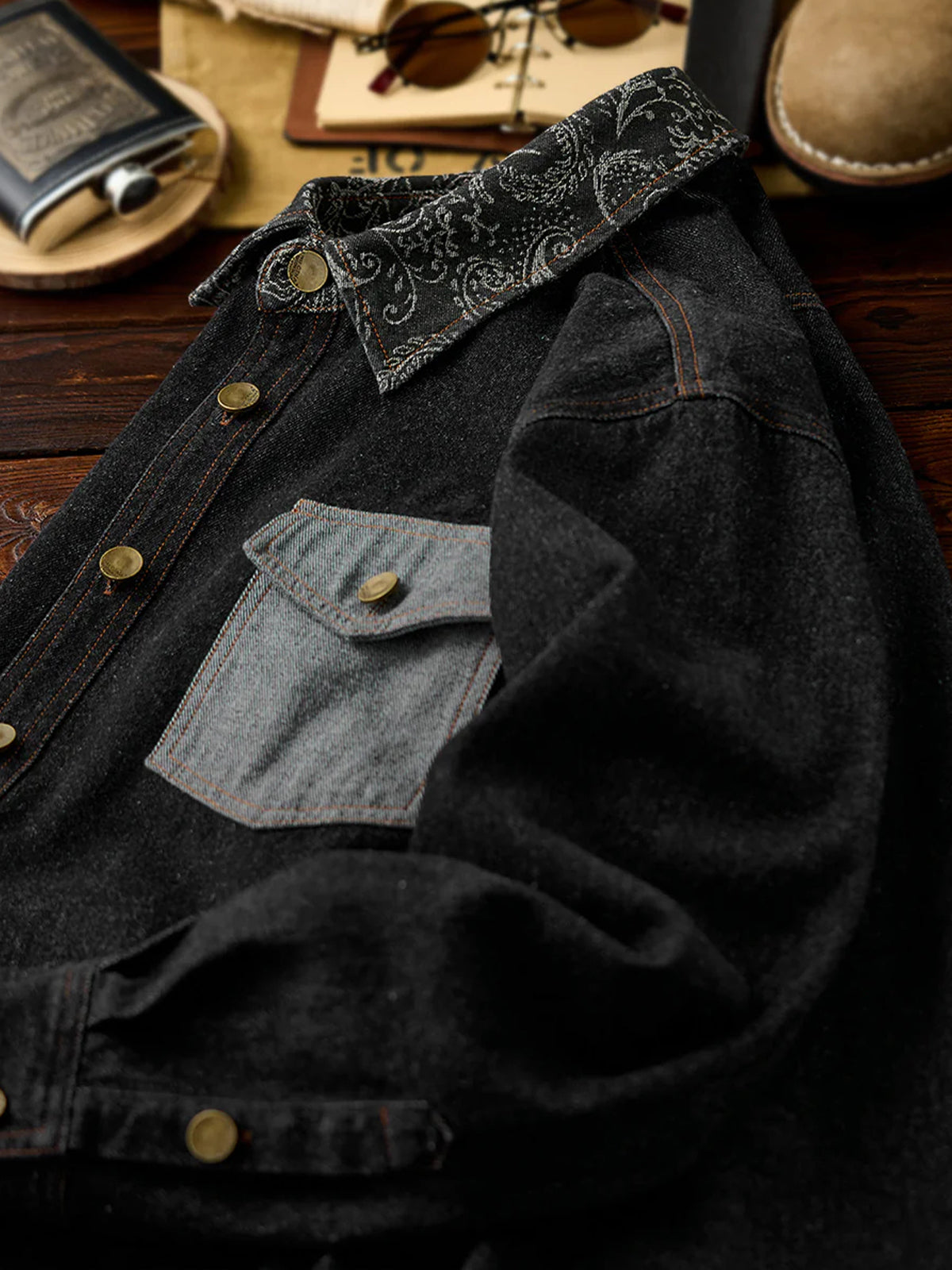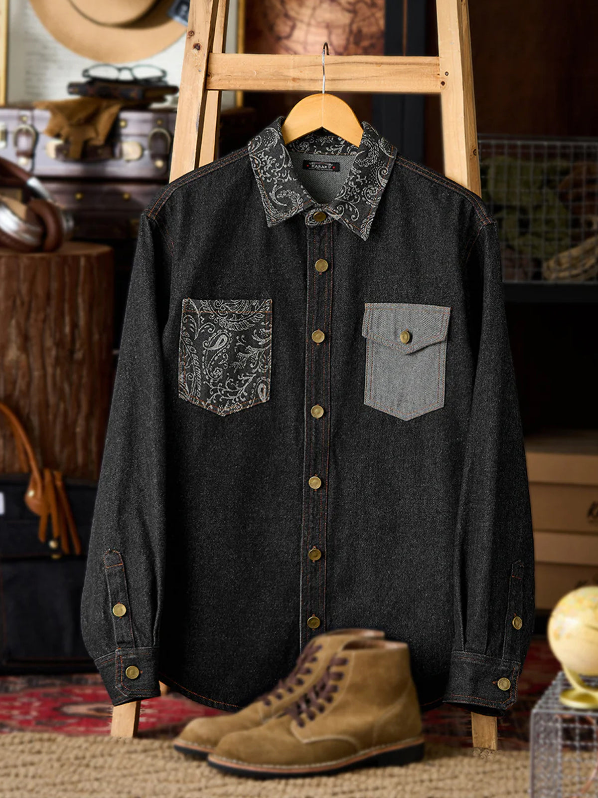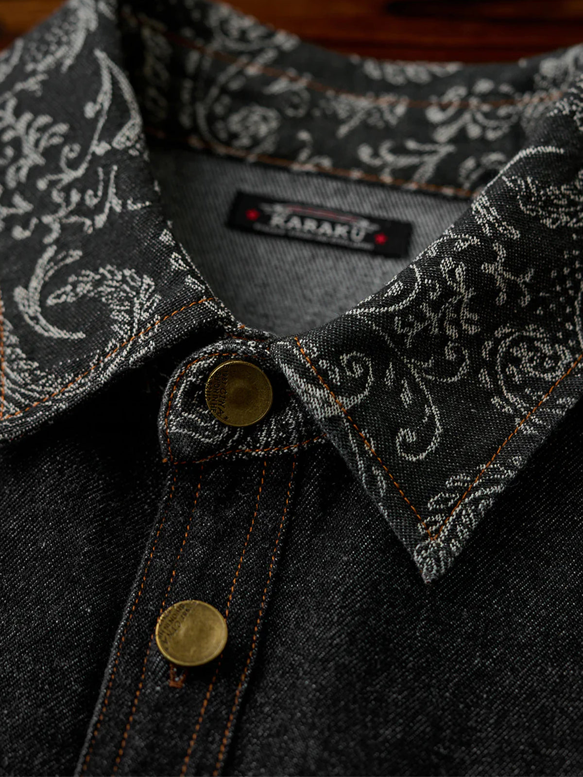 Jacquard-woven paisley patterns on the collar and left chest pocket add a touch of elegance to the shirt. The left chest pocket features the paisley pattern, while the right chest pocket is plain denim, creating an asymmetric design. The pockets also differ in shape, emphasizing the shirt’s unique design.