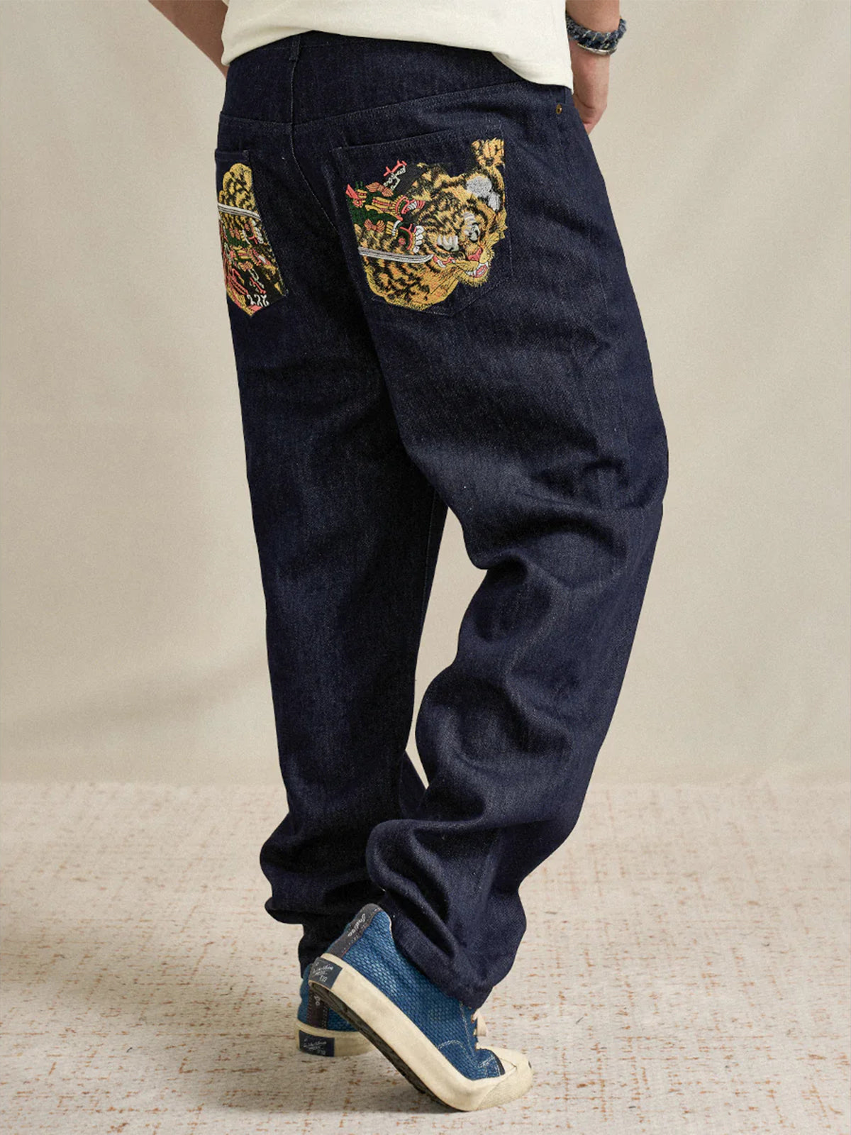 "Roaring Tiger & Skull Riders" Embroidered Cotton Long T-shirt